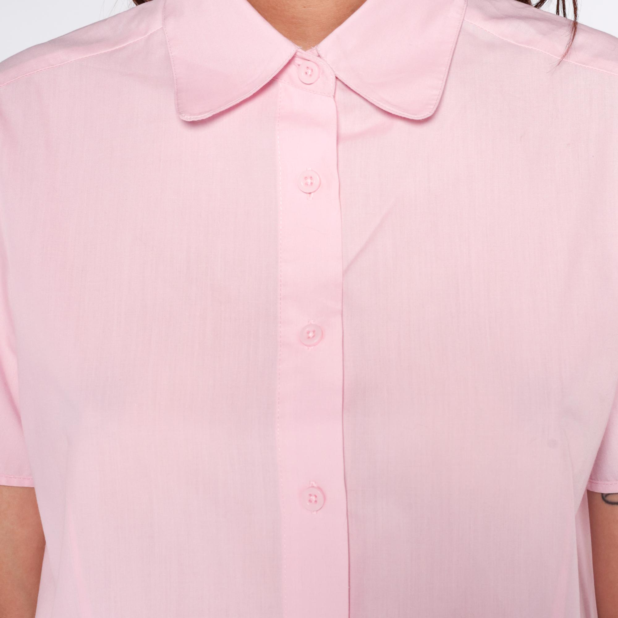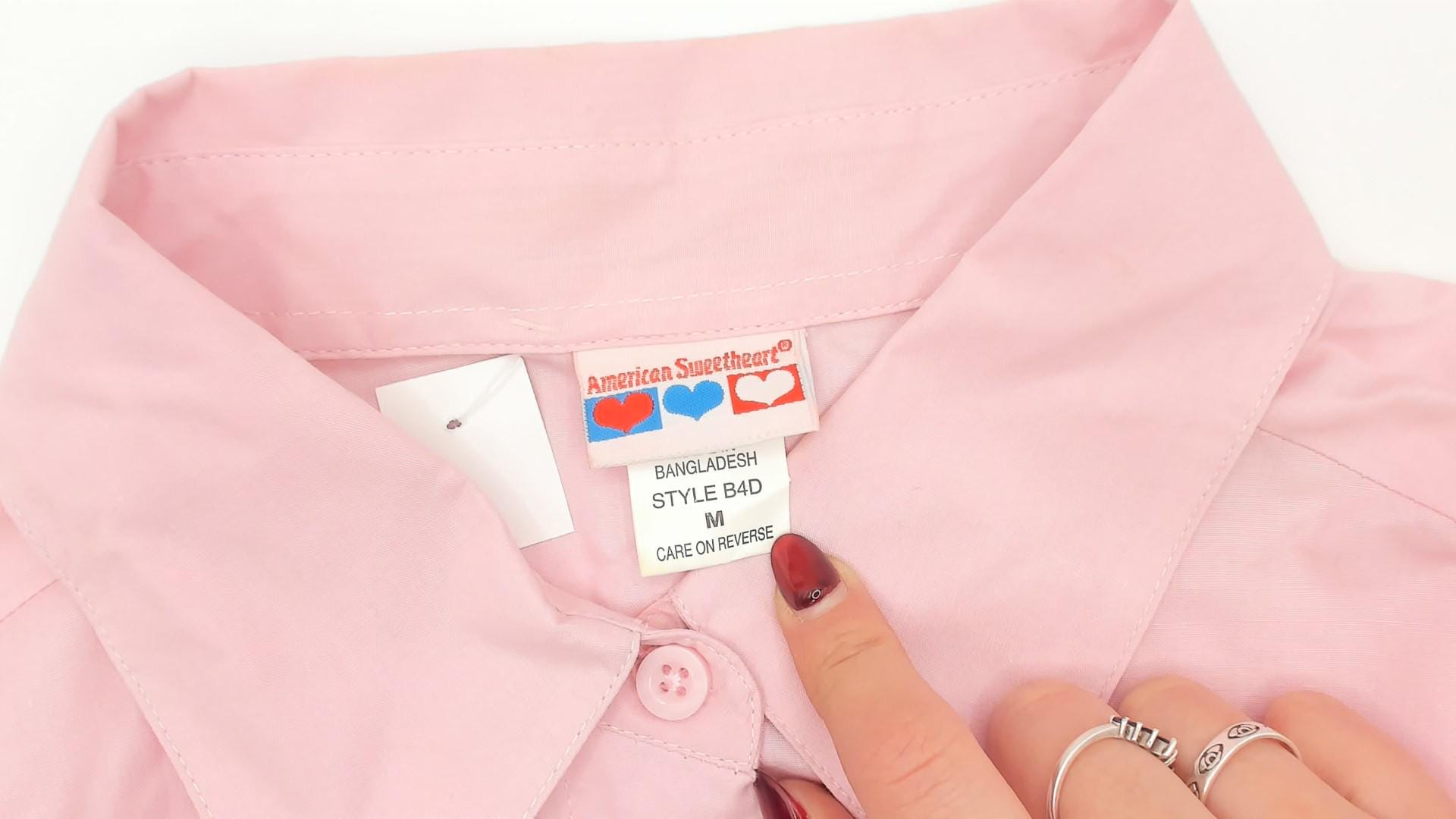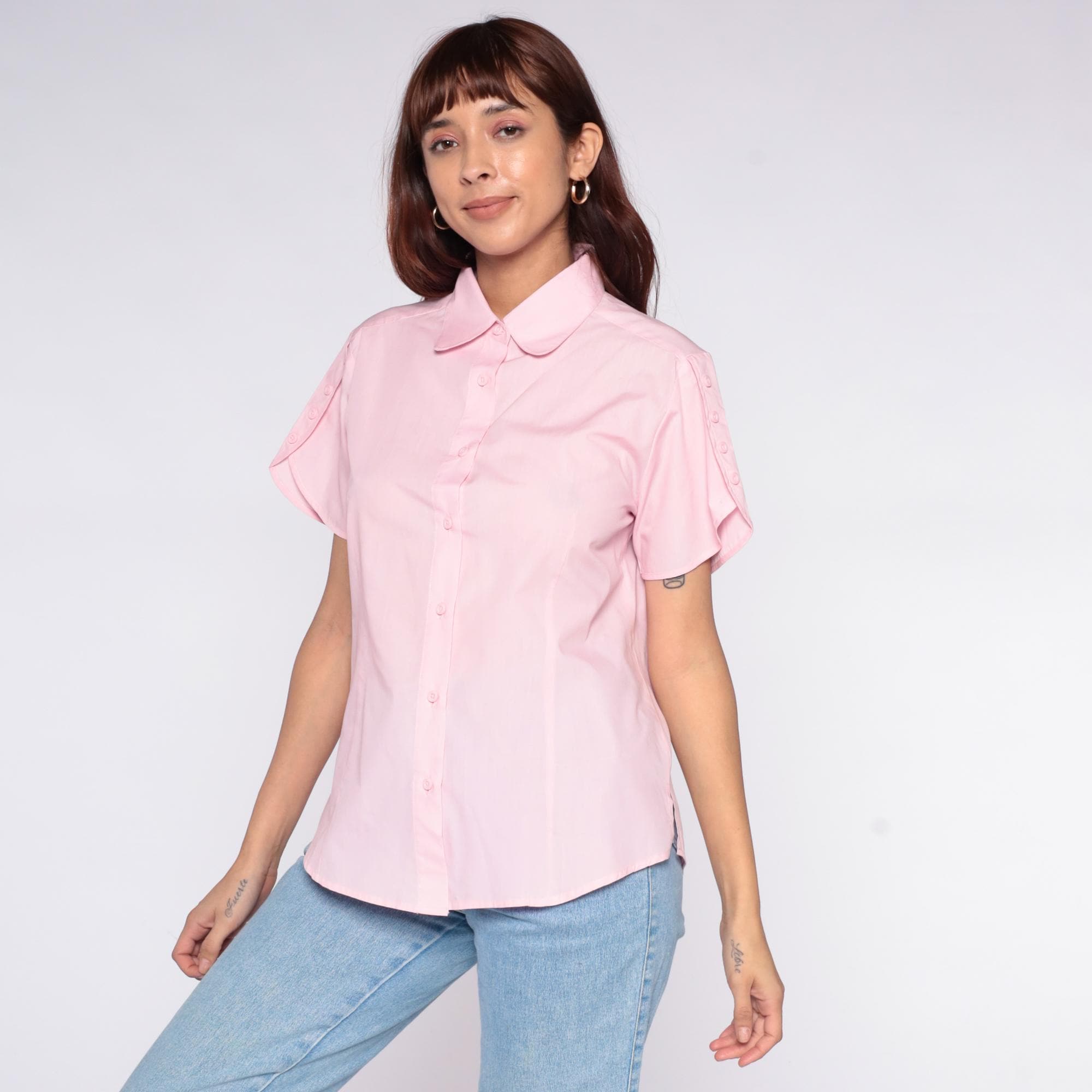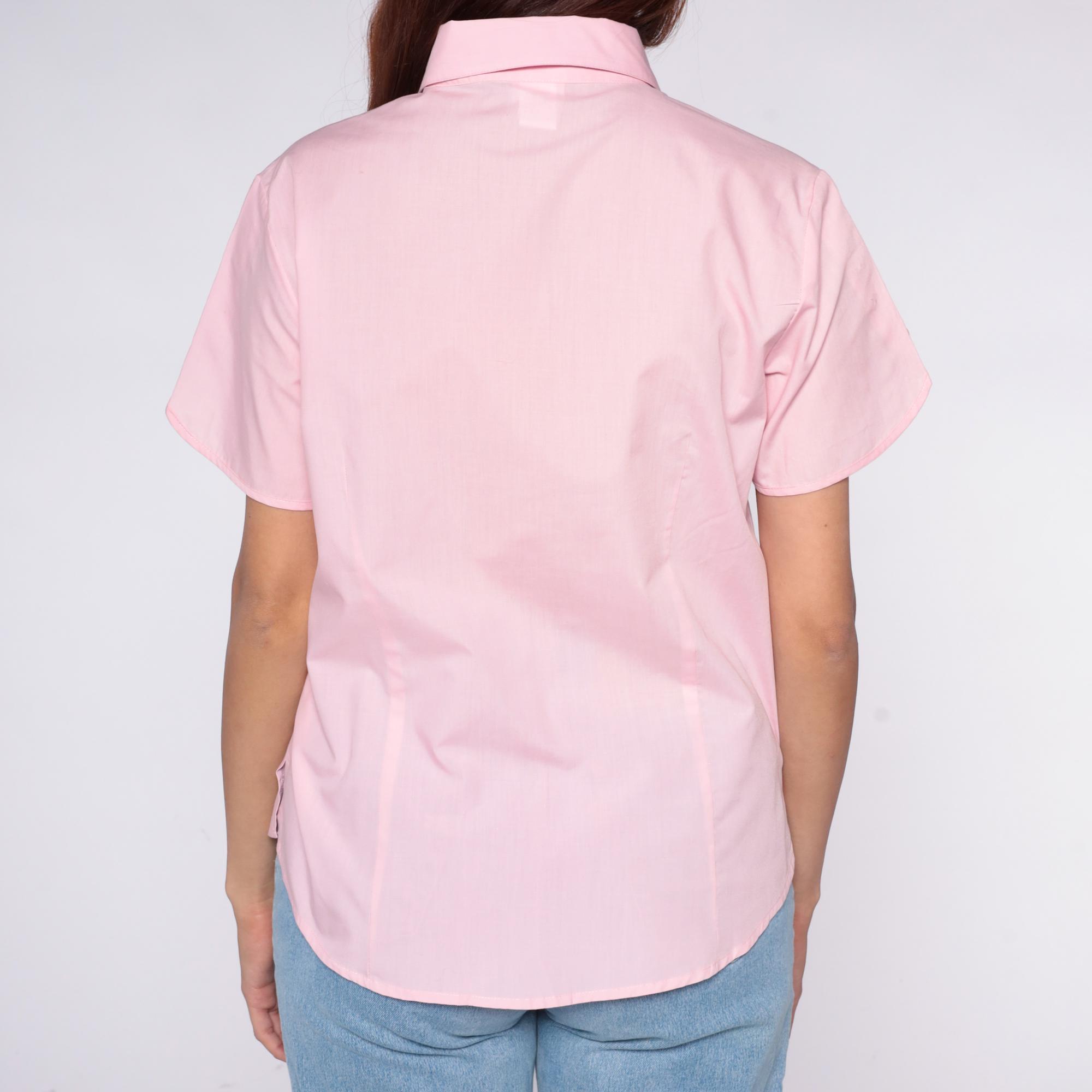 80s pale pink button-up shirt from American Sweetheart with rounded peter pan collar and left chest pocket. Short sleeves with straight hem, full button front closure with matching pink buttons.