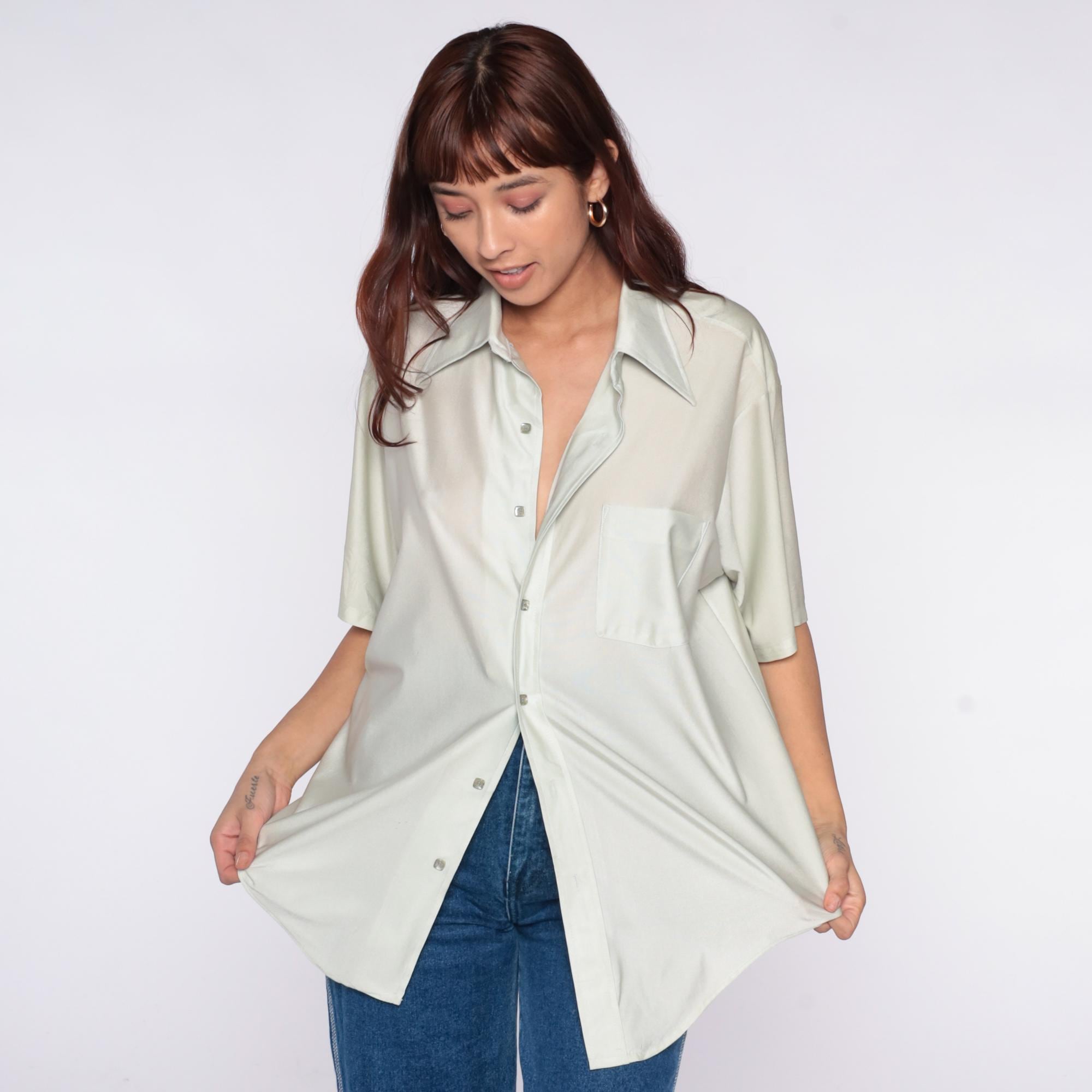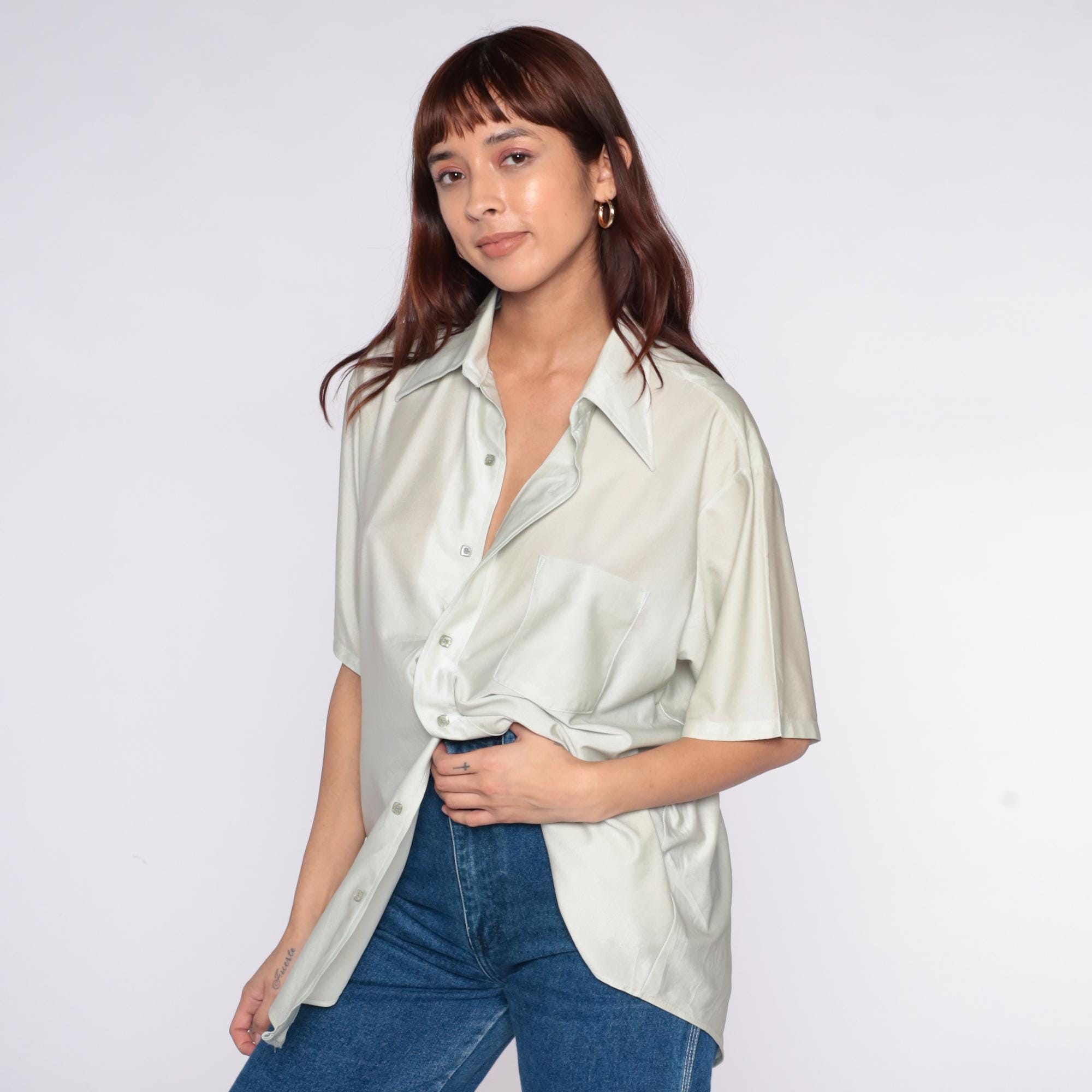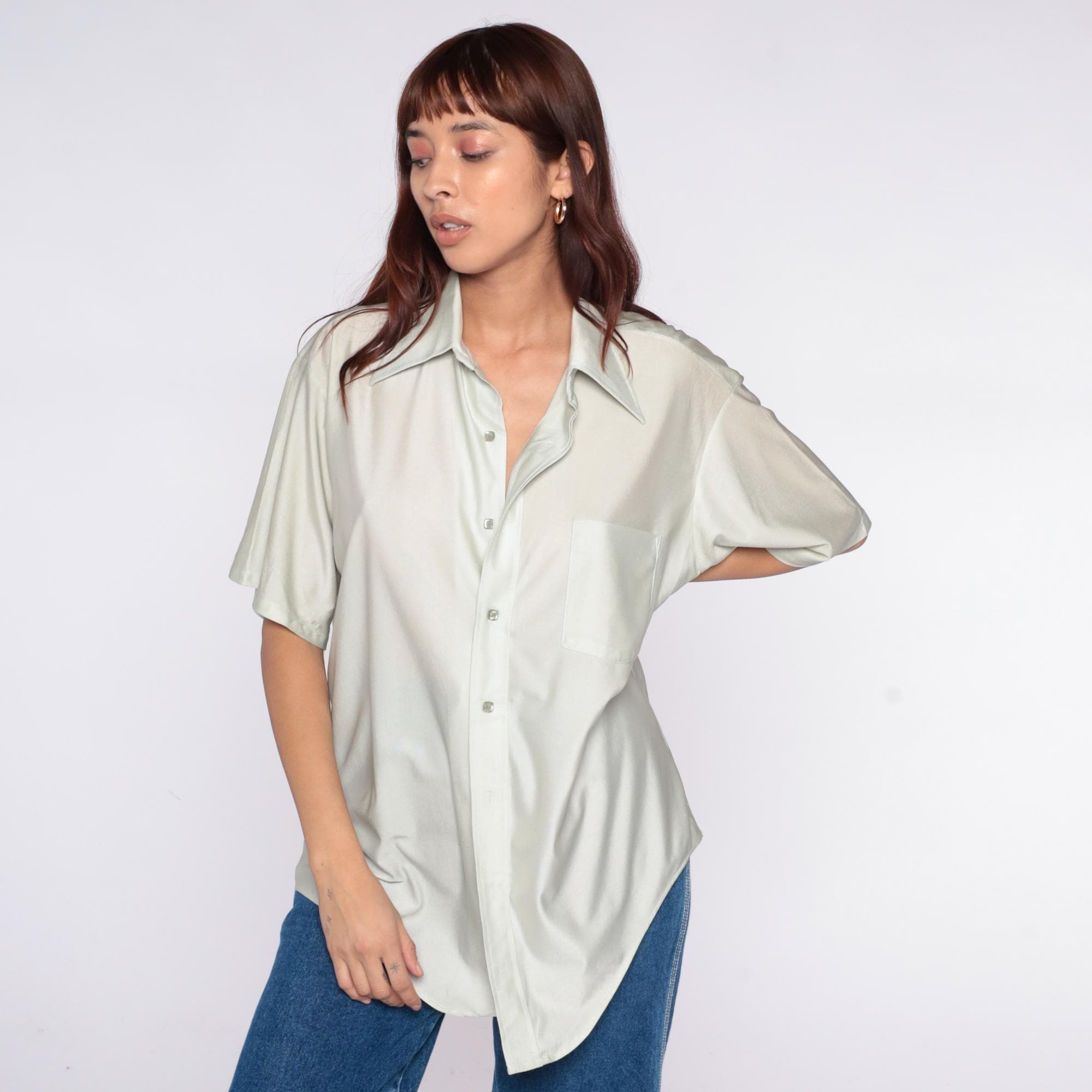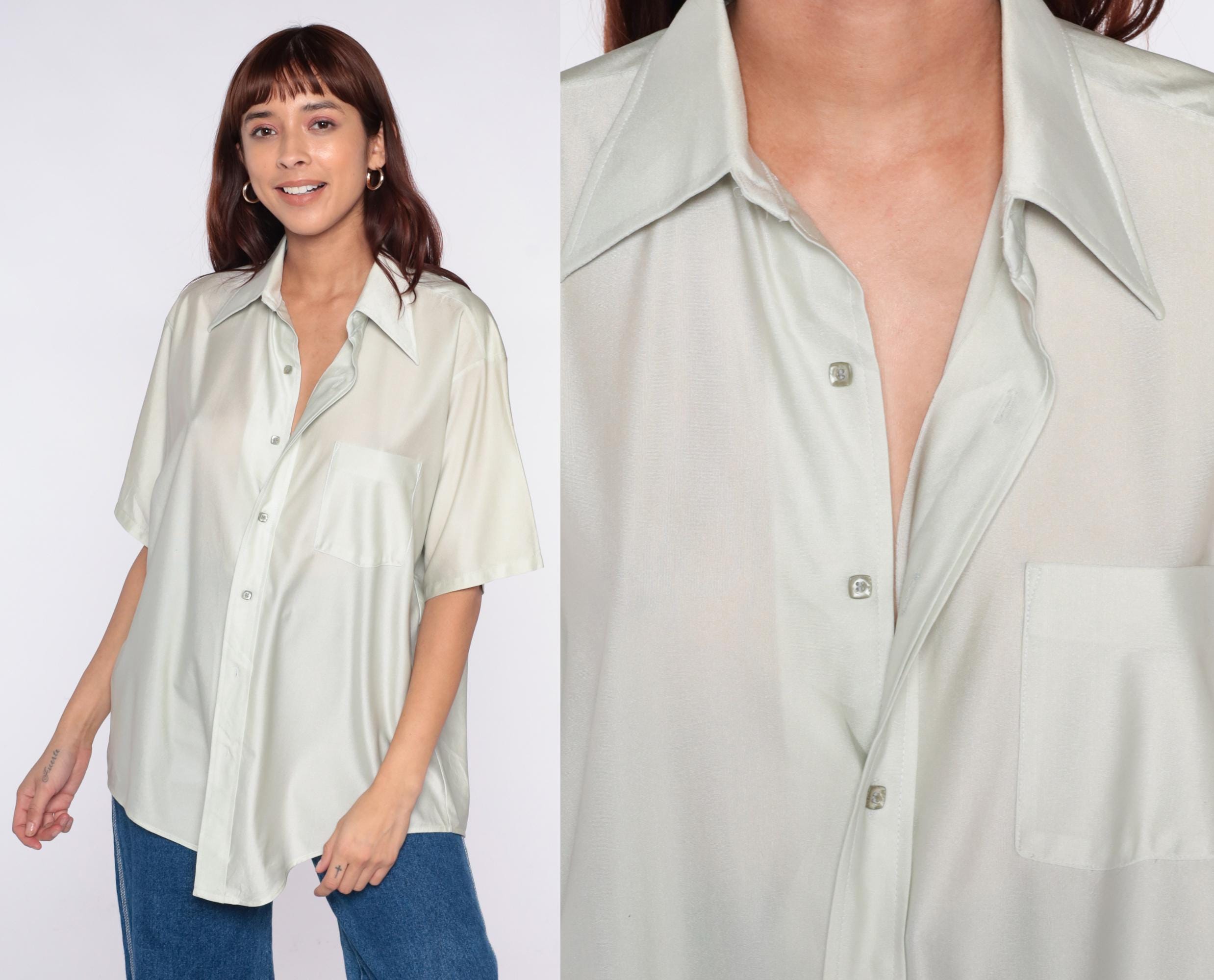 70s pale sage green short sleeve button-up shirt from van huesen with pointed collar and chest pocket. Wide fit through the body with straight hem.
