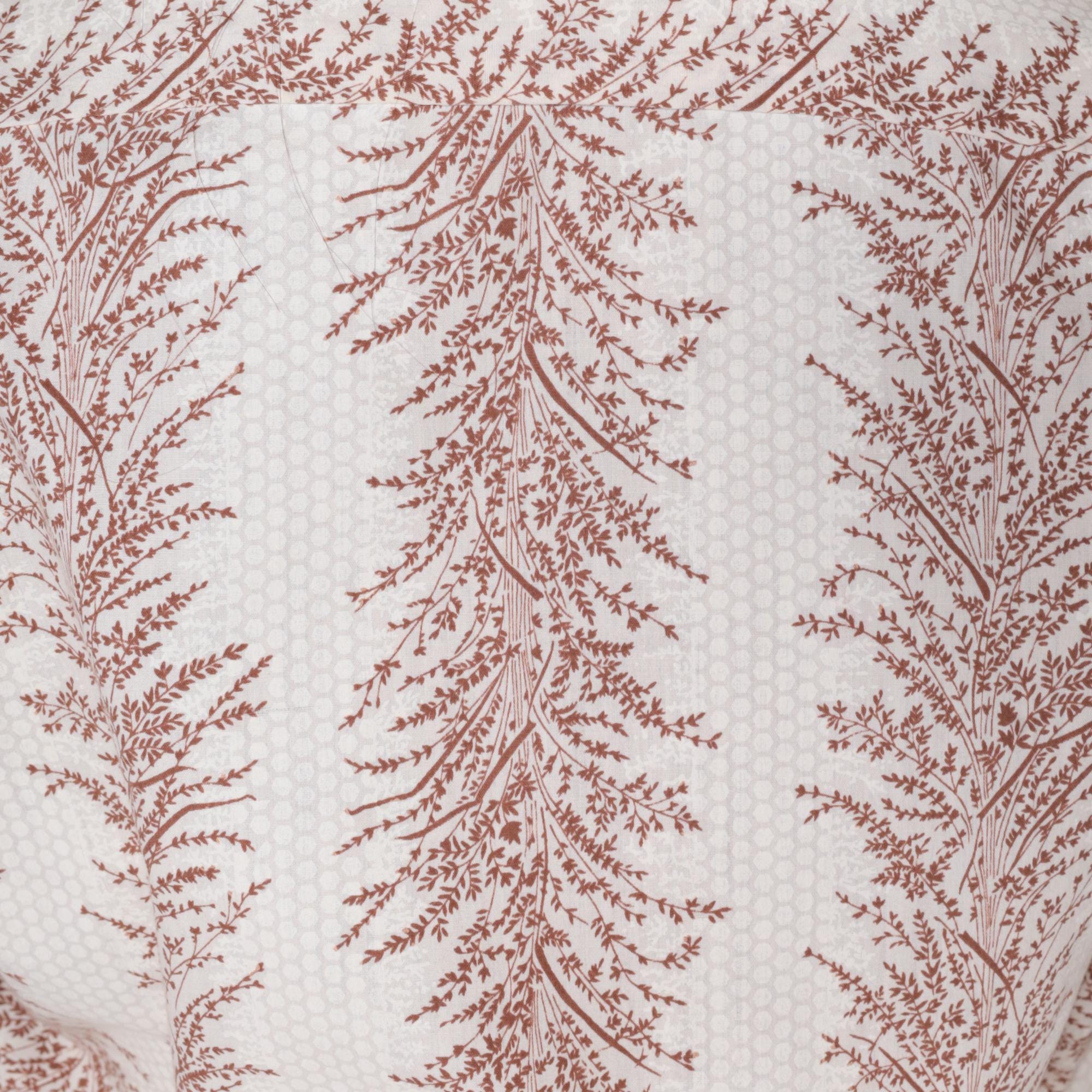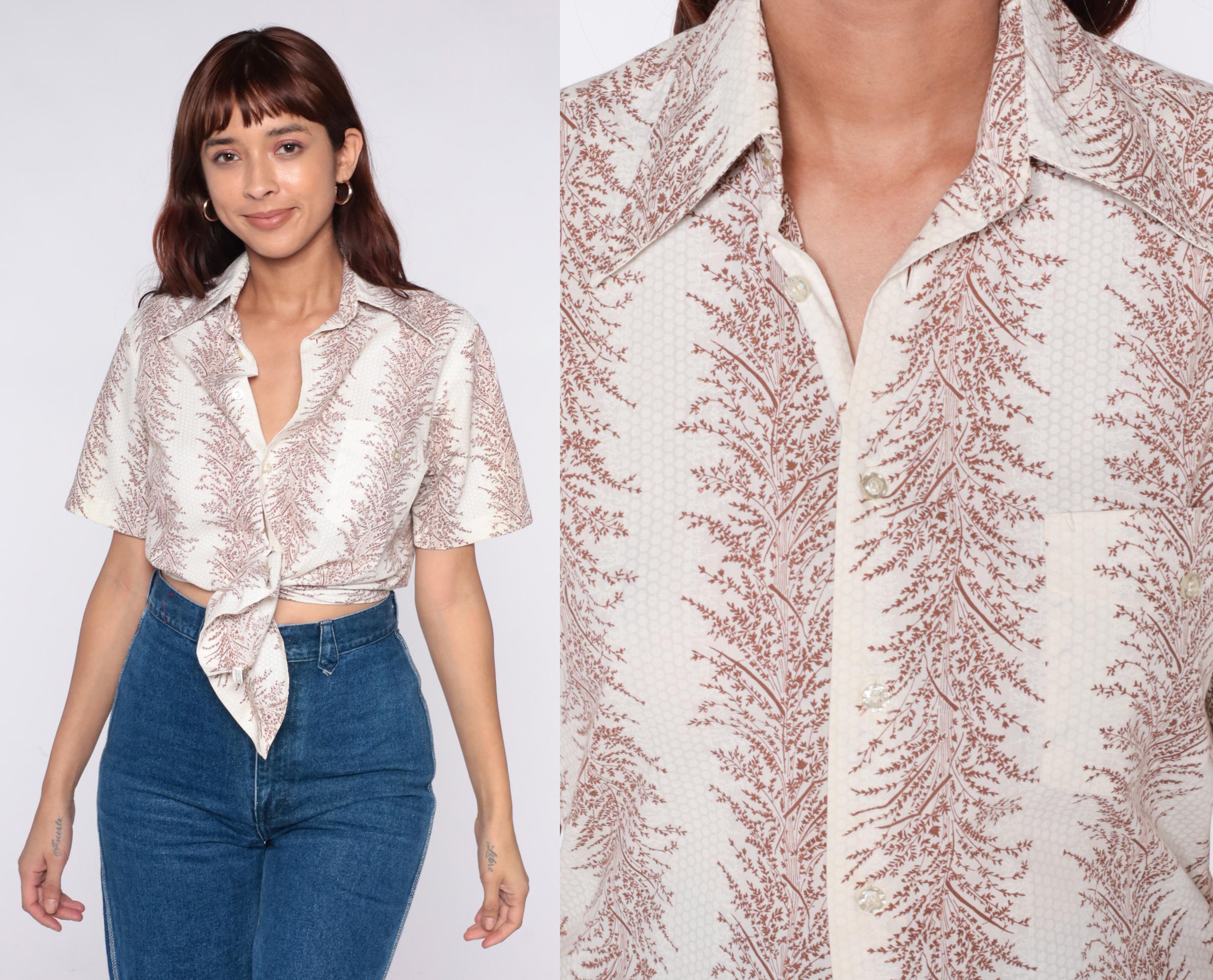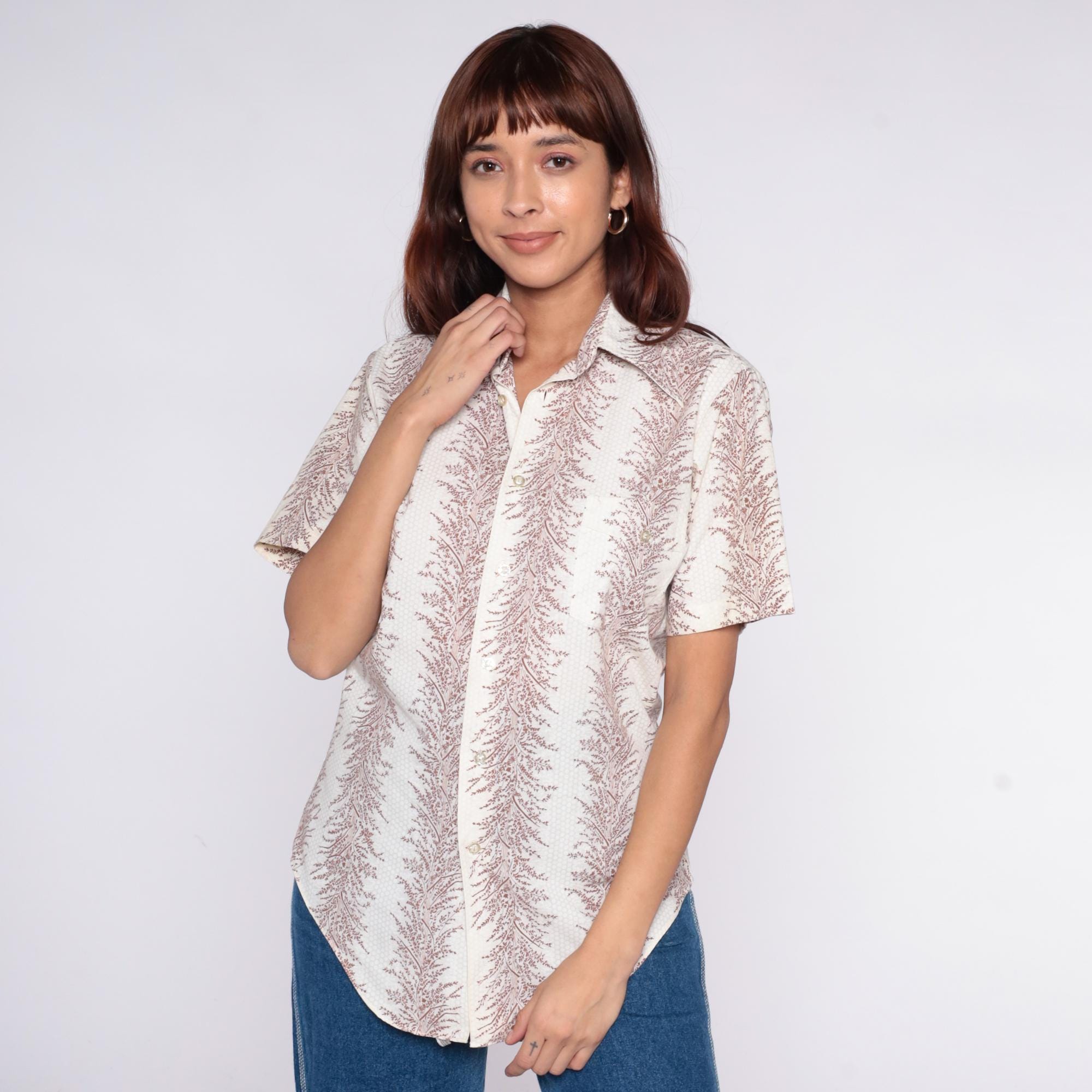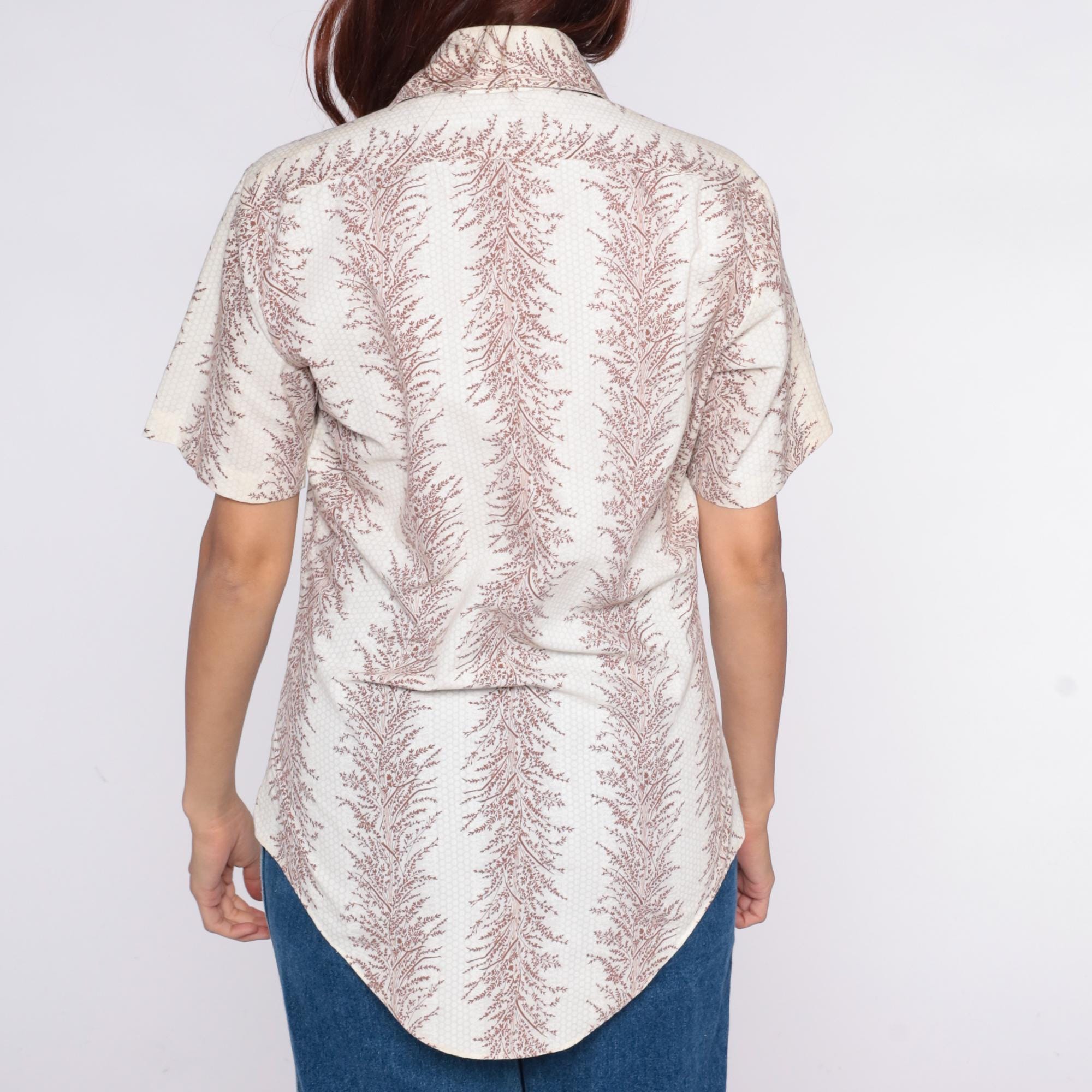 70s cream button-up shirt from Jandy Place with brown fern print pattern across the fabric. Pointed collar, short sleeves, curved hem longer in back.