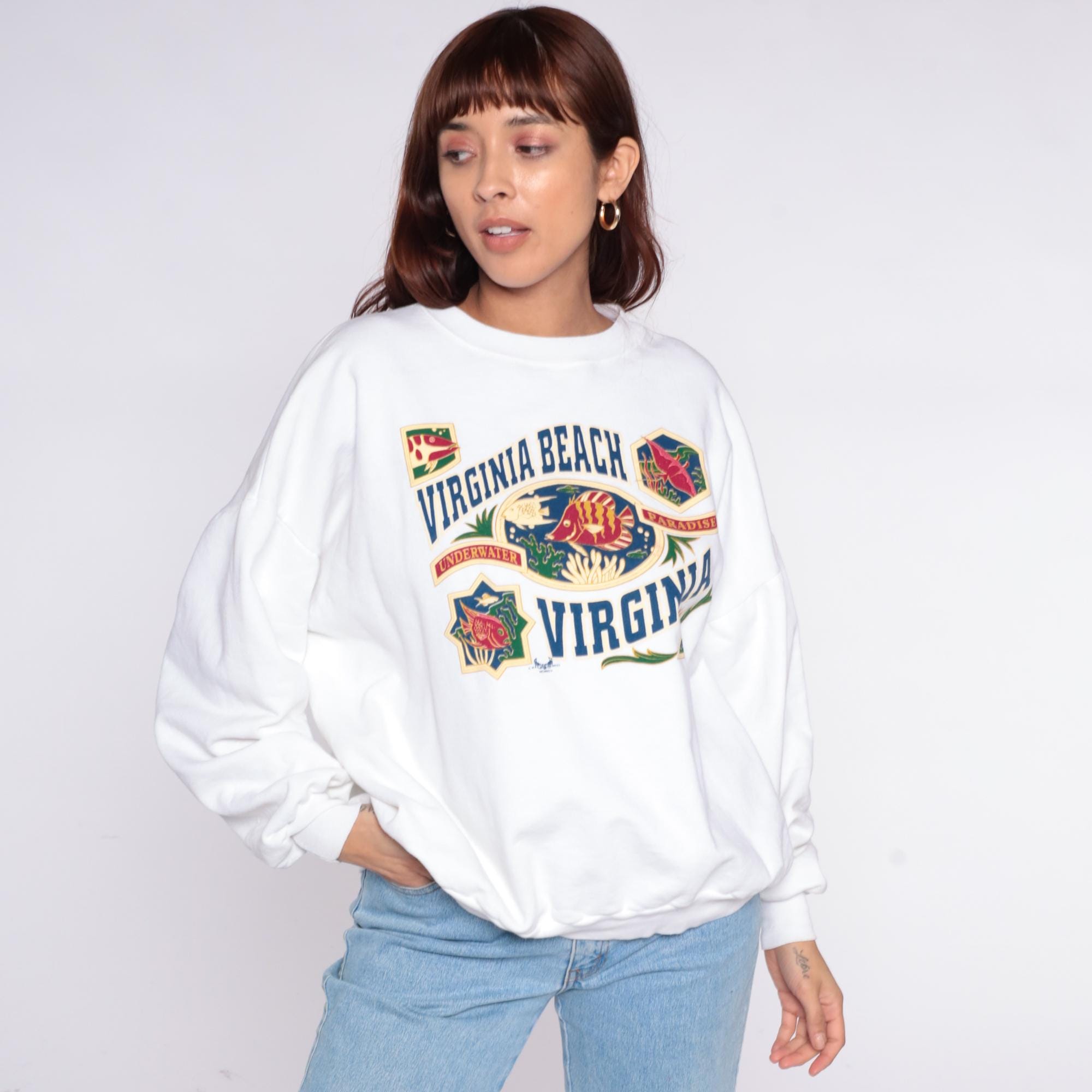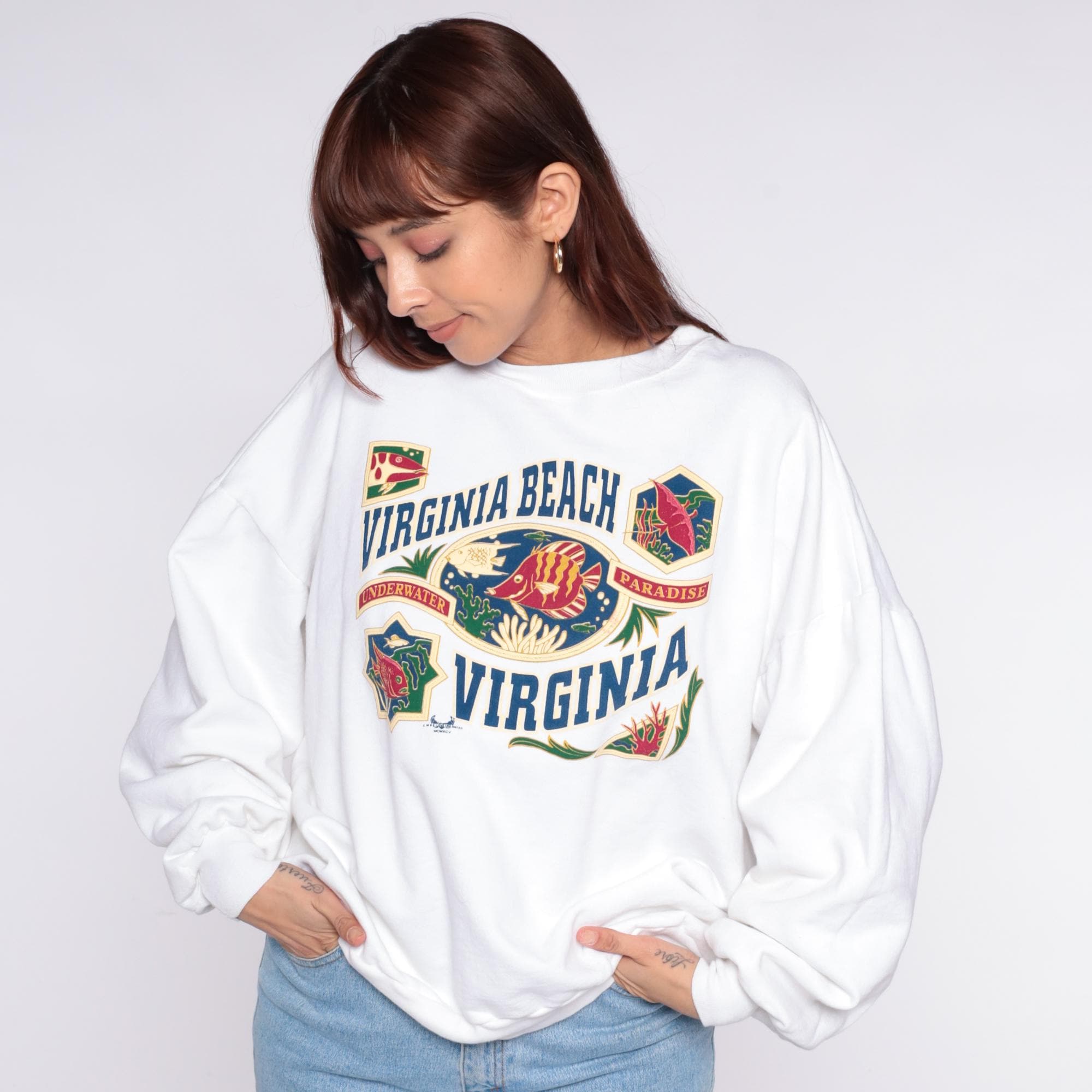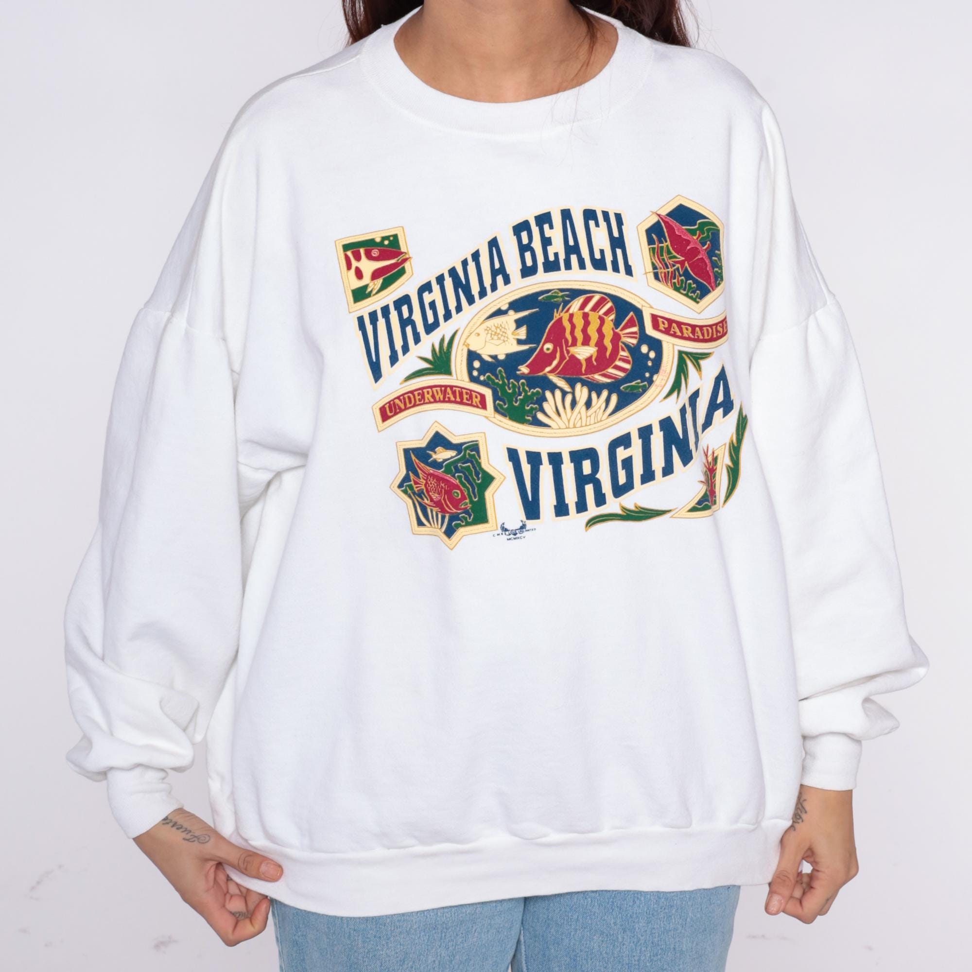 90s white sweatshirt from Fun Peddlers with Virginia Beach graphic print featuring navy blue text, multi-colored tropical fish designs, and decorative patches including underwater scenes and "PARADISE" text.