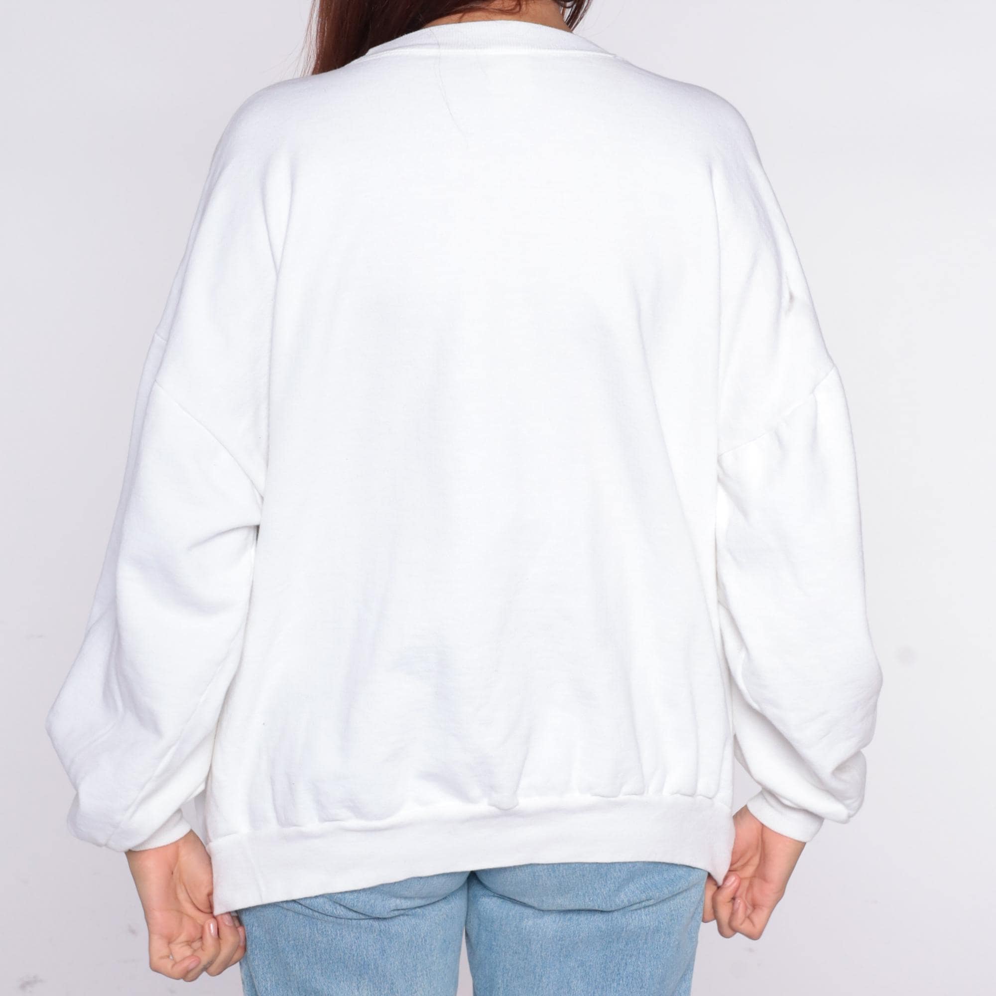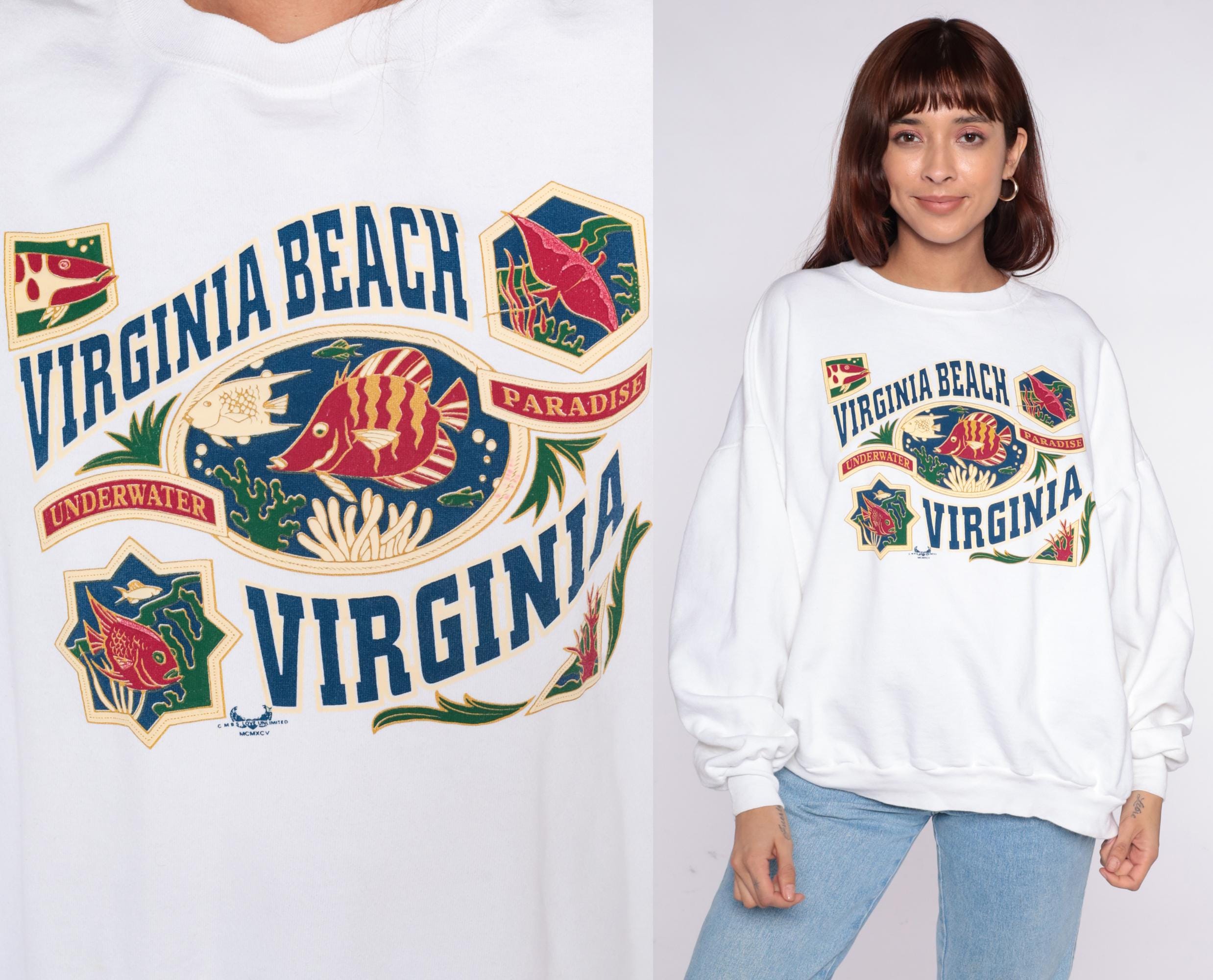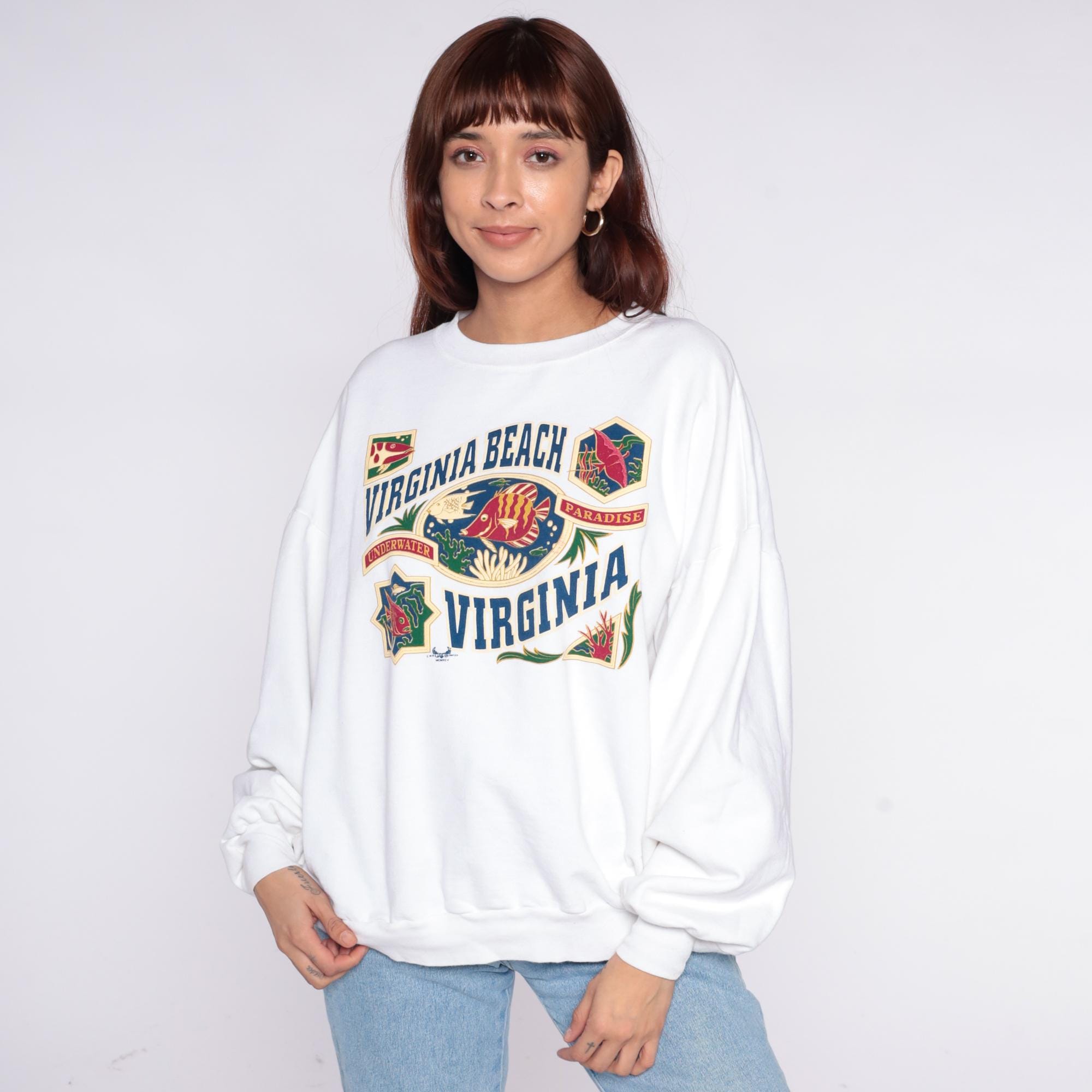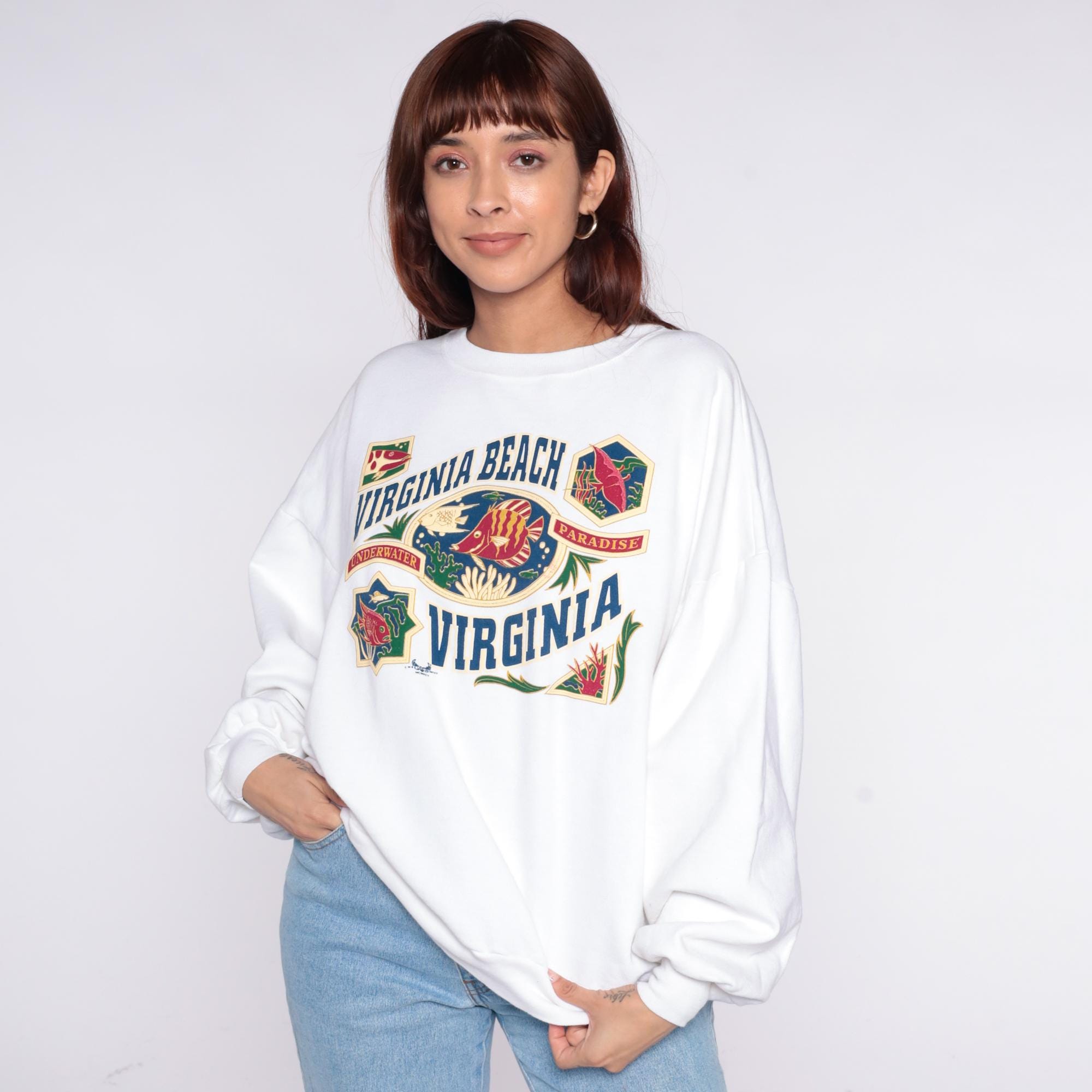 90s white sweatshirt from Fun Peddlers with Virginia Beach graphic print featuring navy blue text, multi-colored tropical fish designs, and decorative patches including underwater scenes and "PARADISE" text.