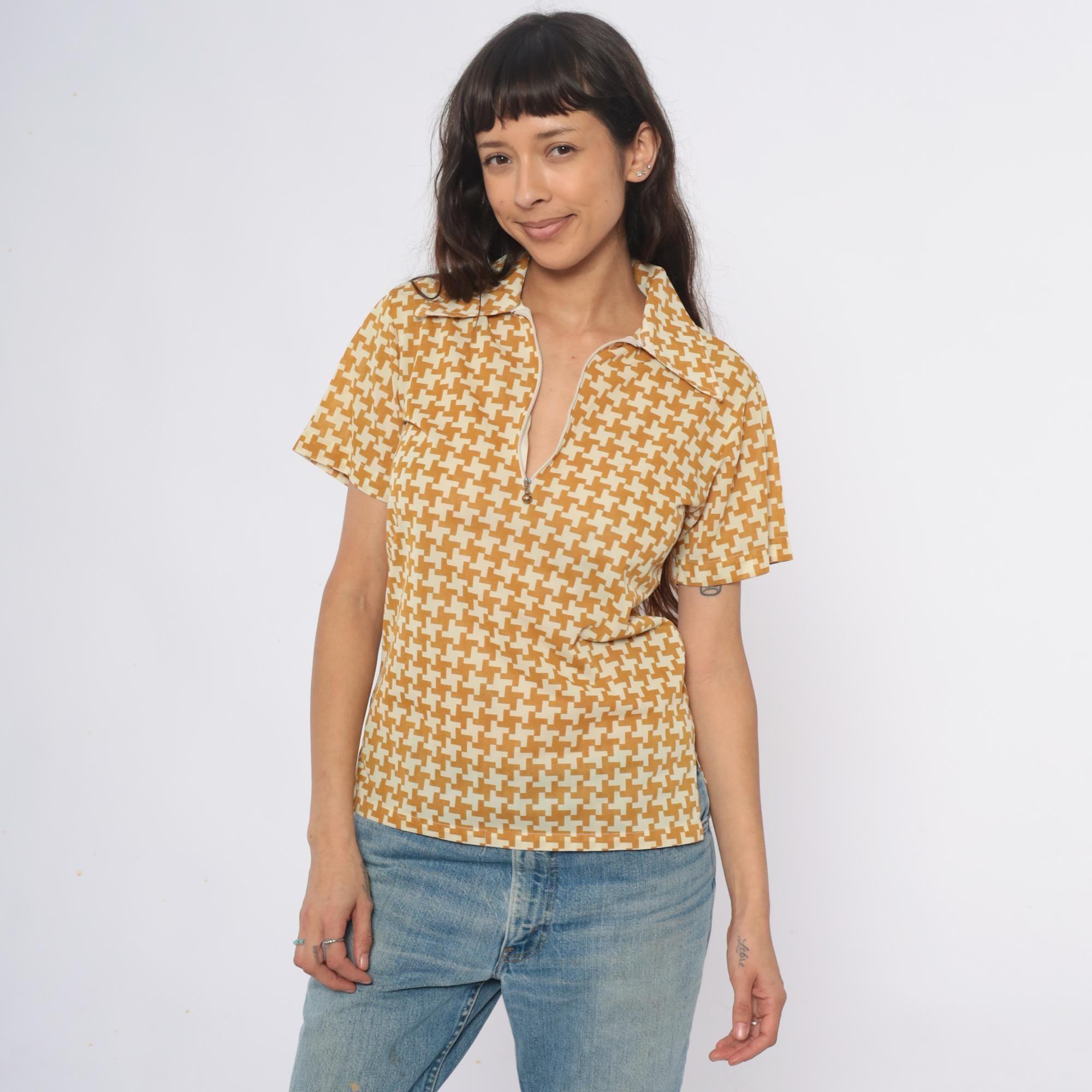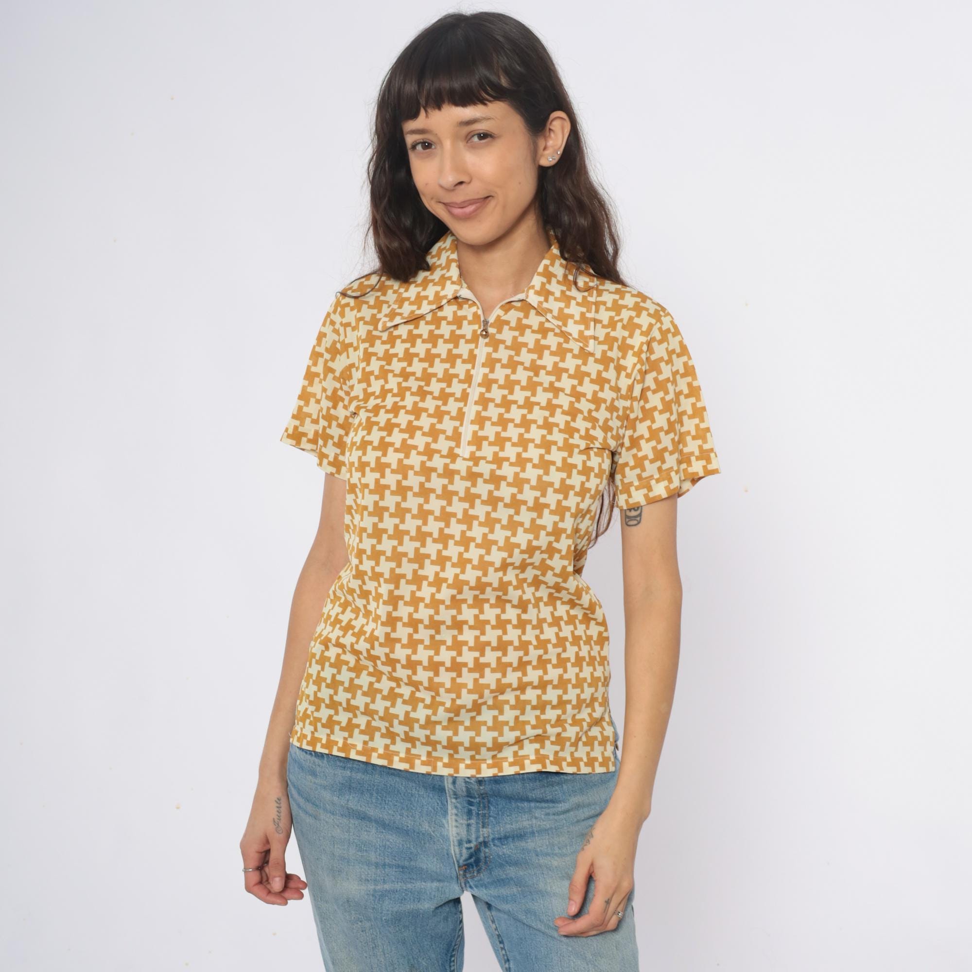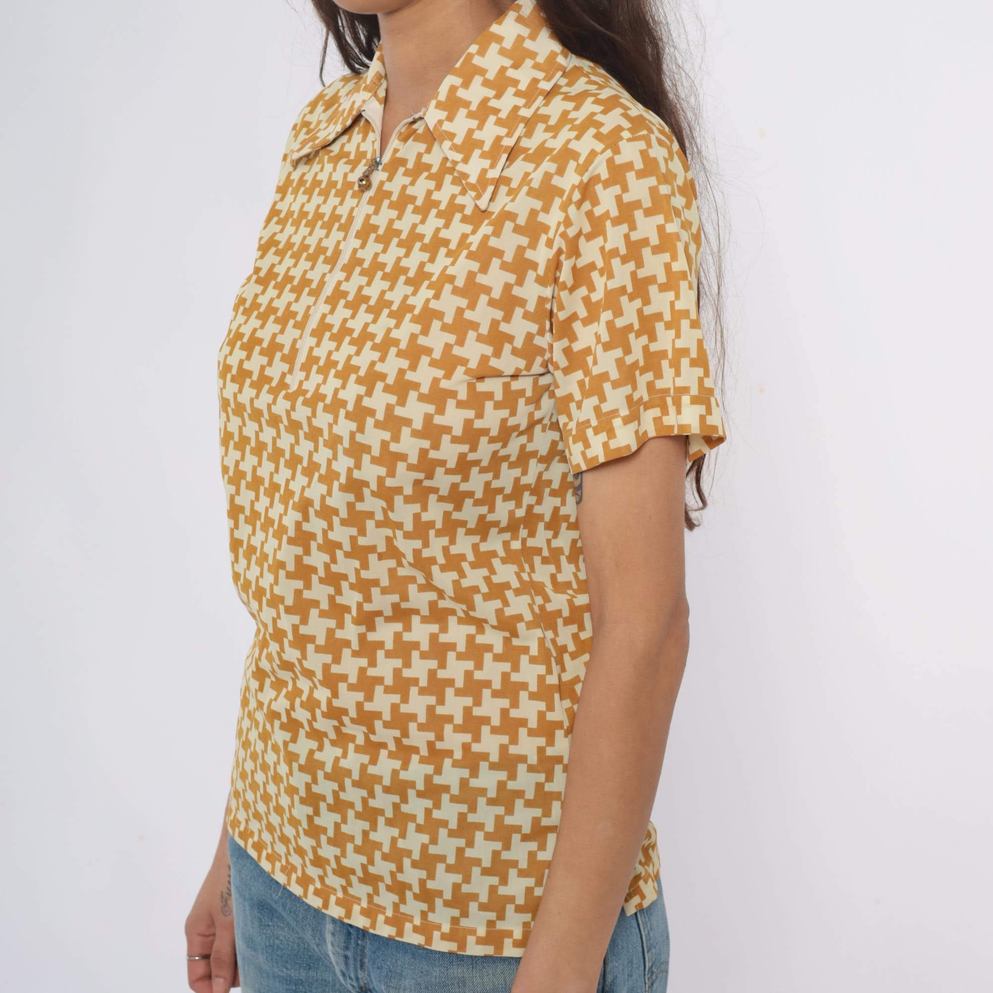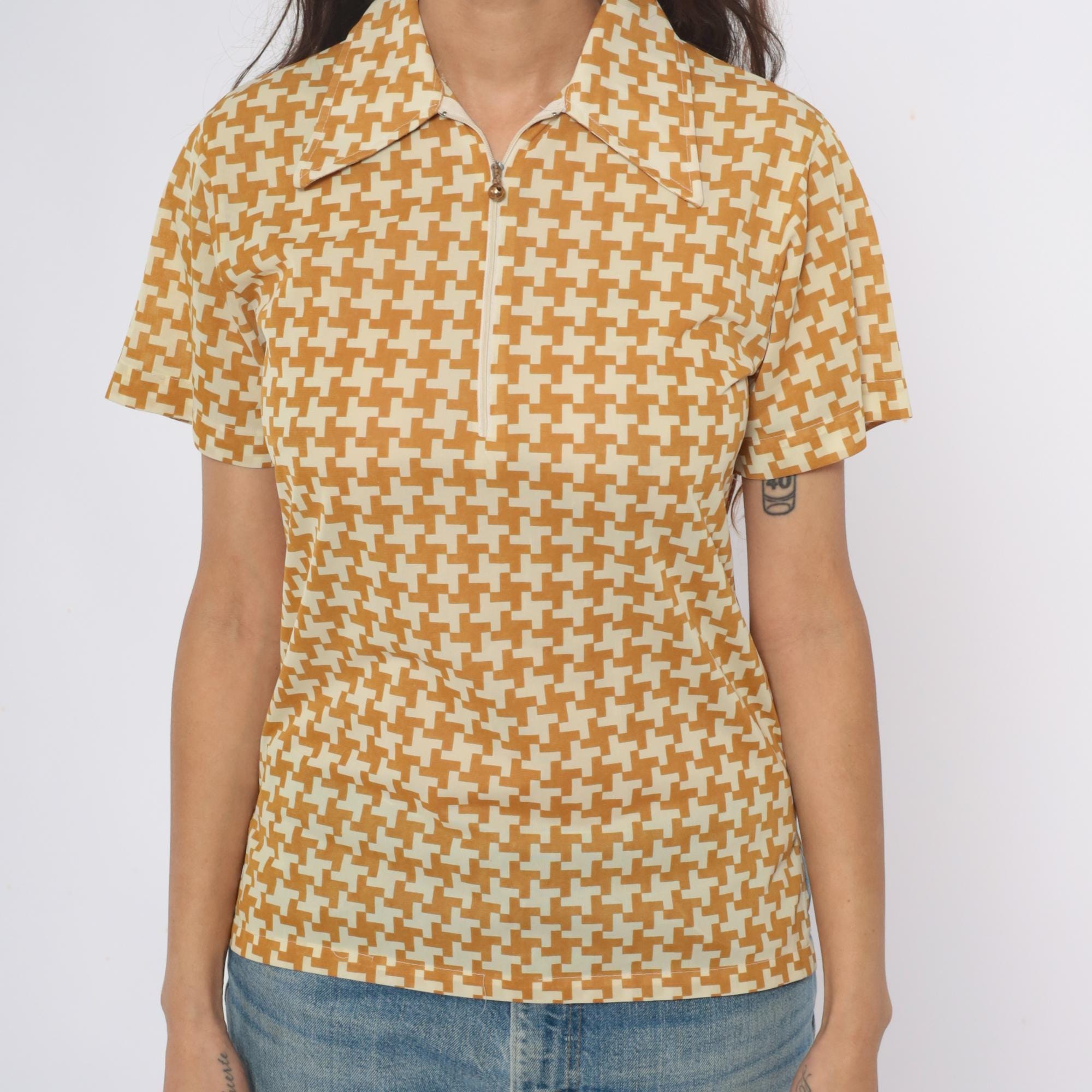 70s yellow and cream houndstooth polo shirt with partial front zipper closure and pointed collar. Short sleeves with geometric pattern throughout the fabric.