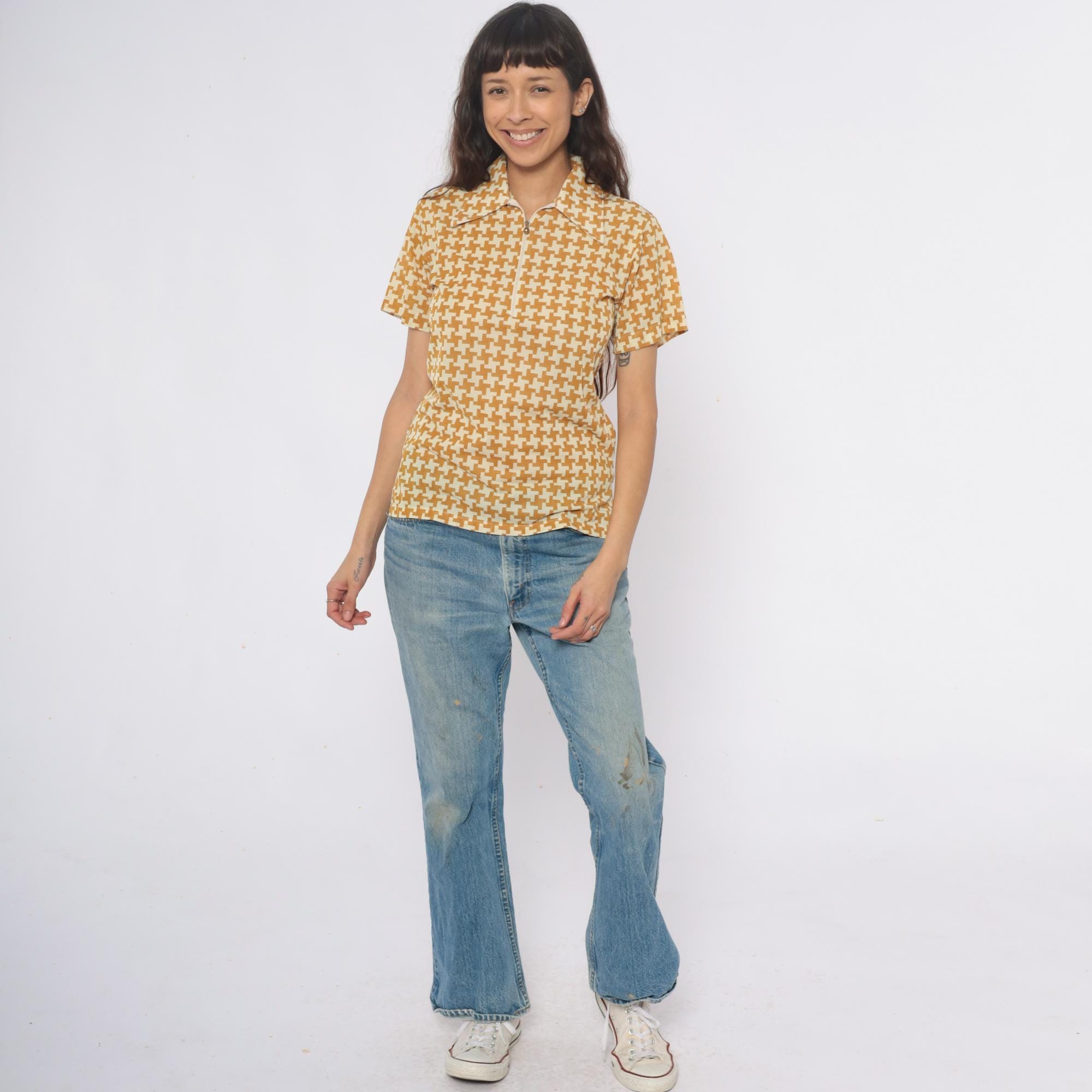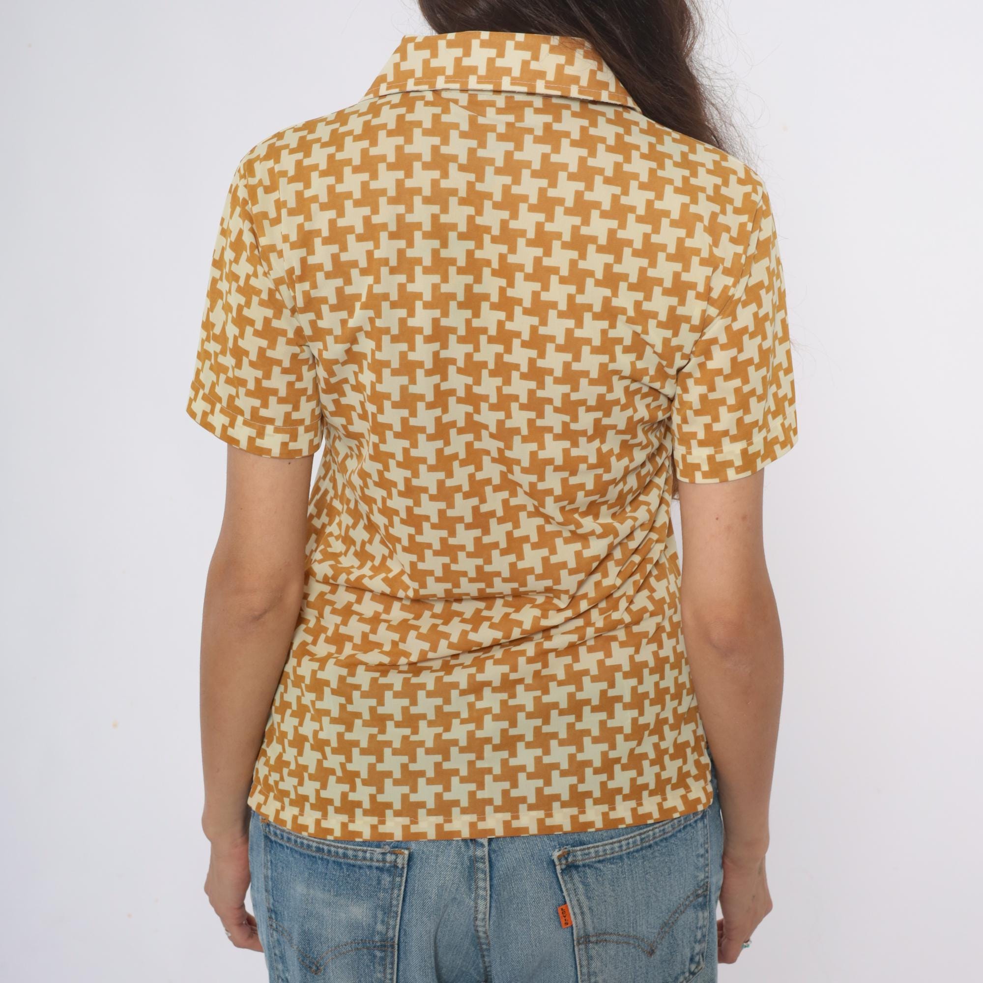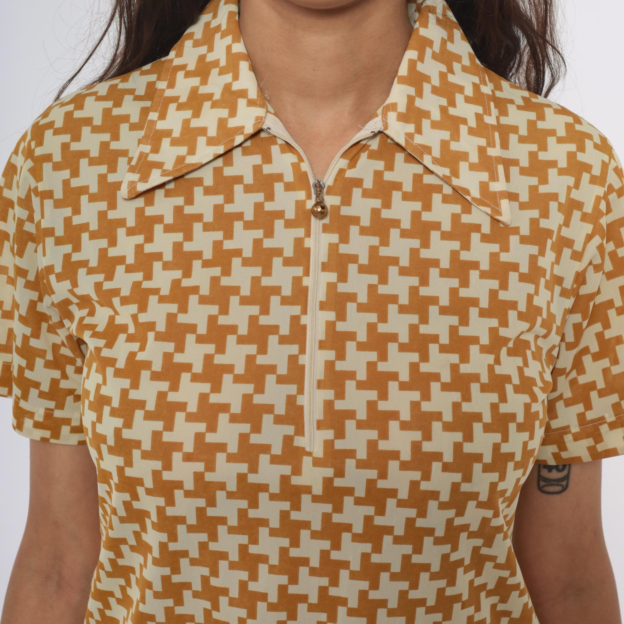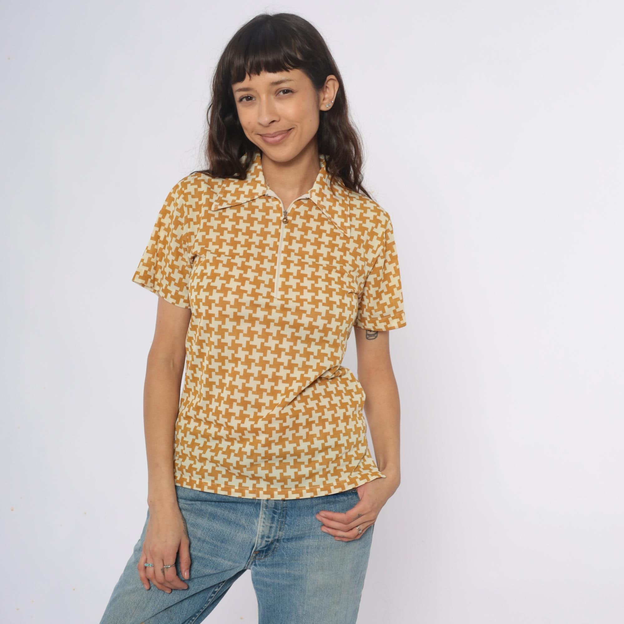 70s yellow and cream houndstooth polo shirt with partial front zipper closure and pointed collar. Short sleeves with geometric pattern throughout the fabric.