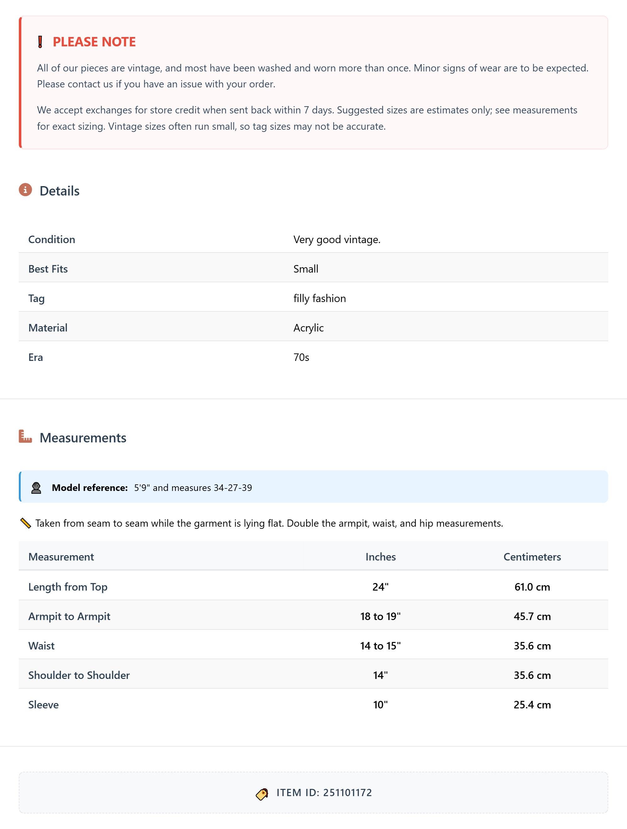 Measurements are taken laying flat and should be doubled where applicable. The "best fits" size is just an estimate, and vintage sizing can vary from modern sizing. Please use measurements to ensure proper fit. The best thing to do is measure a similar item of your own, and compare. When an item has stretch, we will list the unstretched dimensions with the stretched measurement afterwards.
