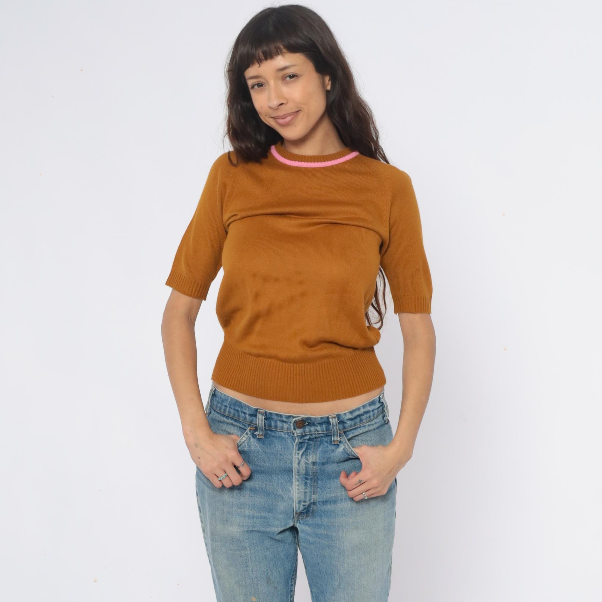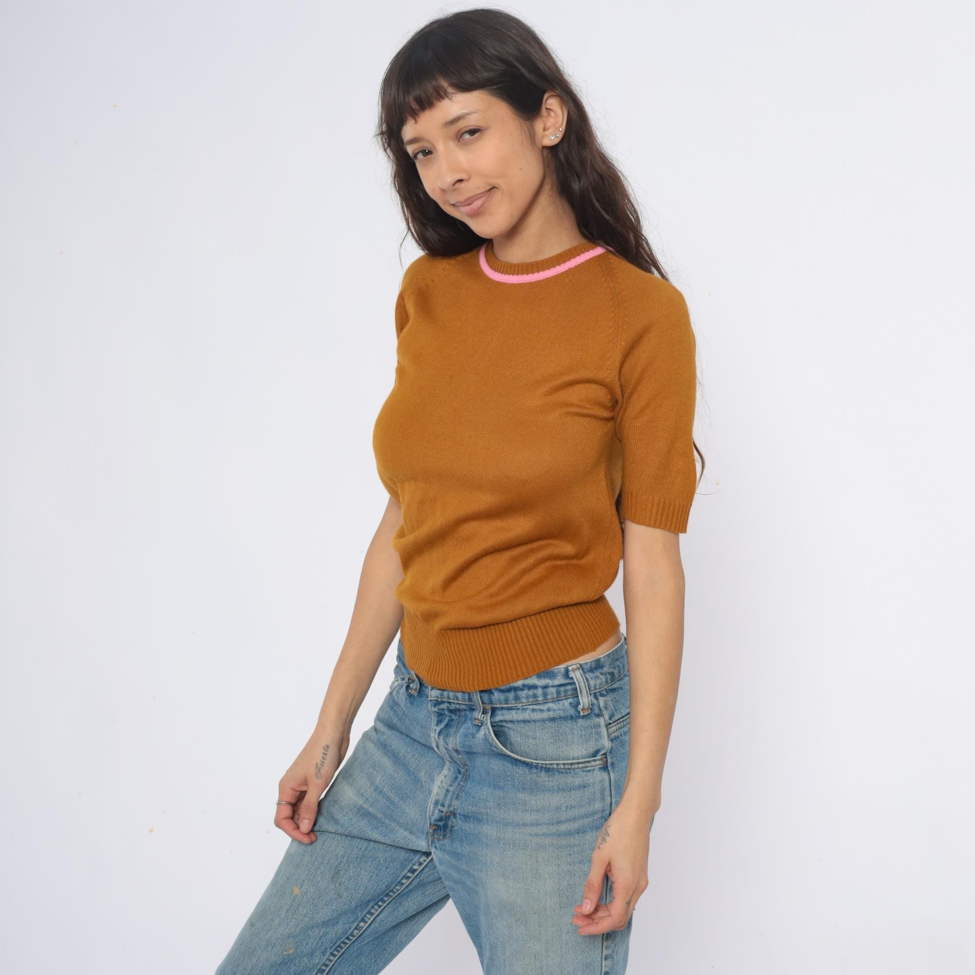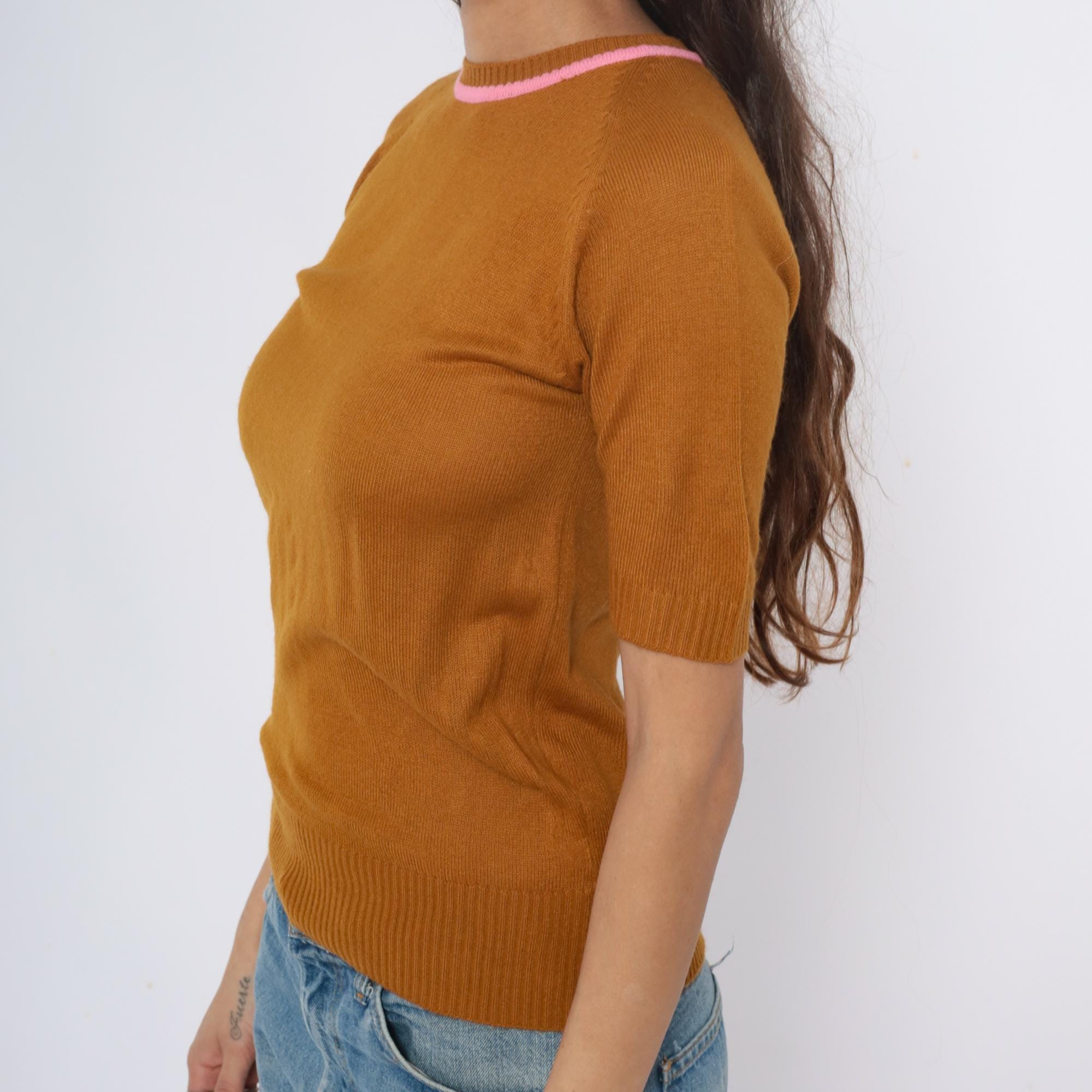 70s mustard ribbed knit short sleeve sweater from filly fashion with pink contrast trim at the crew neckline. Fitted silhouette with ribbed construction throughout, back zipper closure.