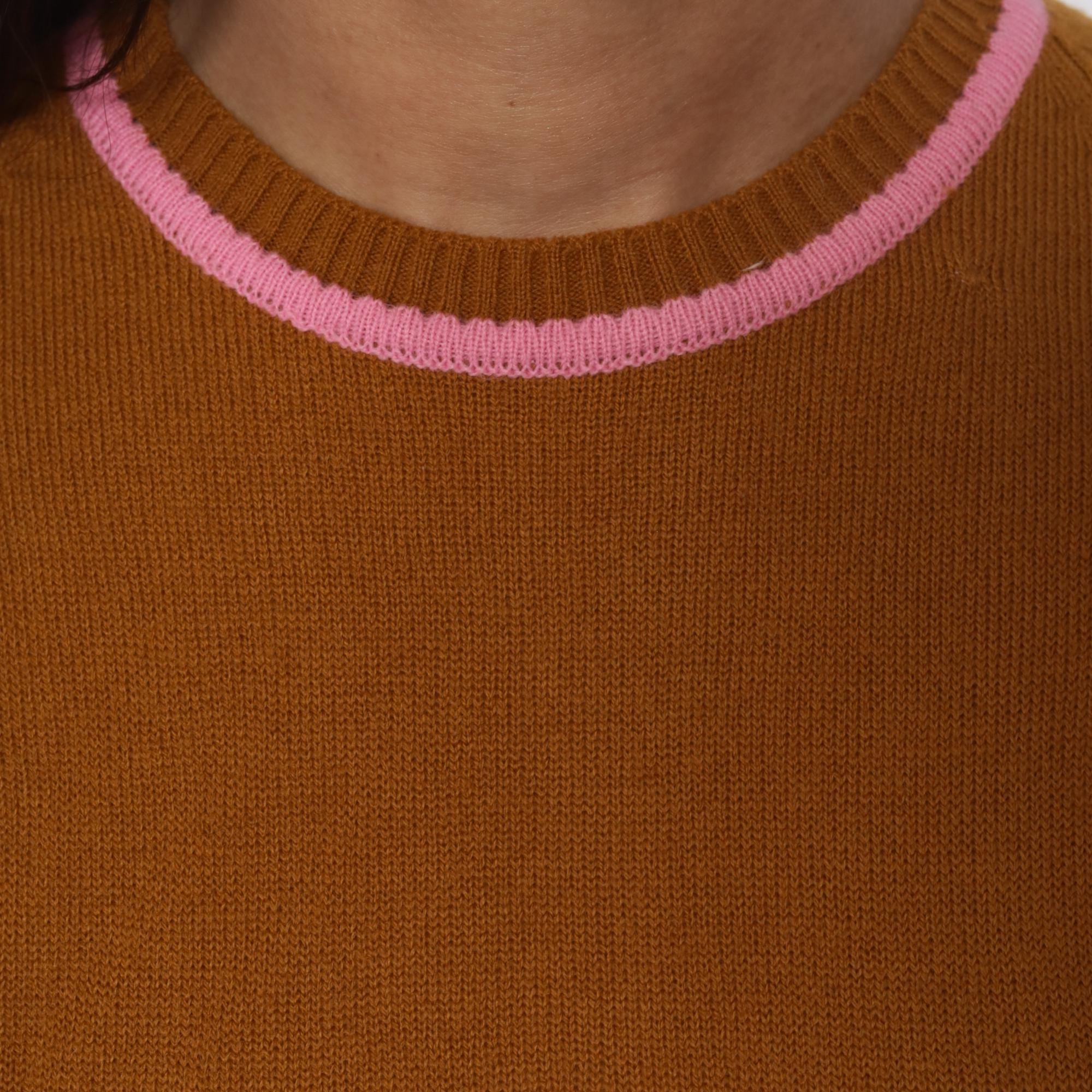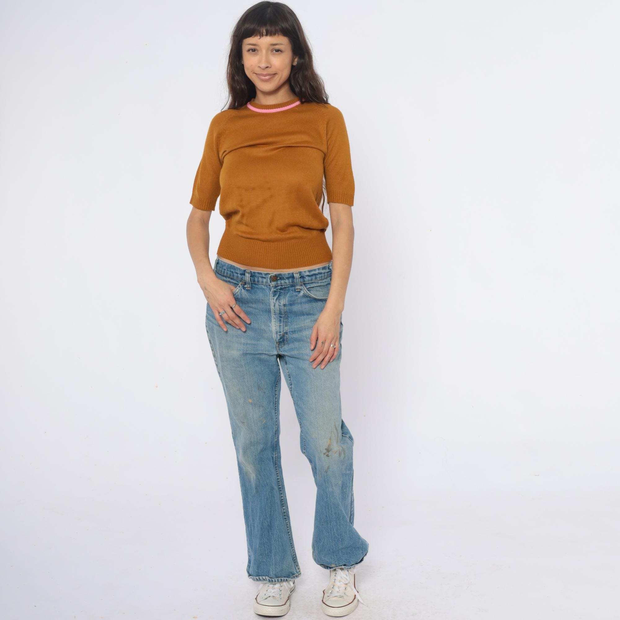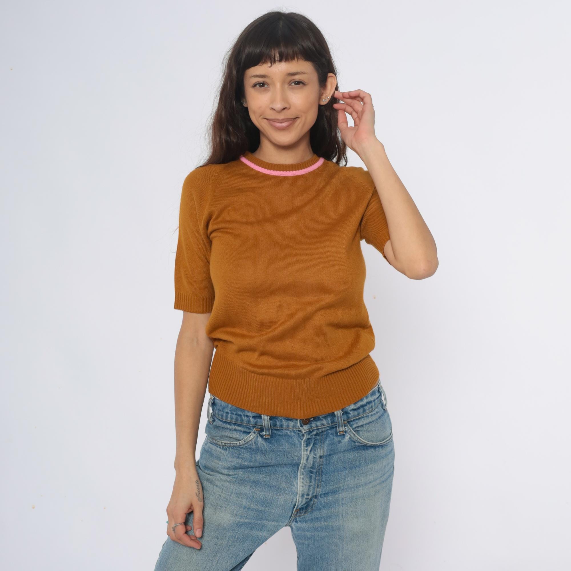70s mustard ribbed knit short sleeve sweater from filly fashion with pink contrast trim at the crew neckline. Fitted silhouette with ribbed construction throughout, back zipper closure.