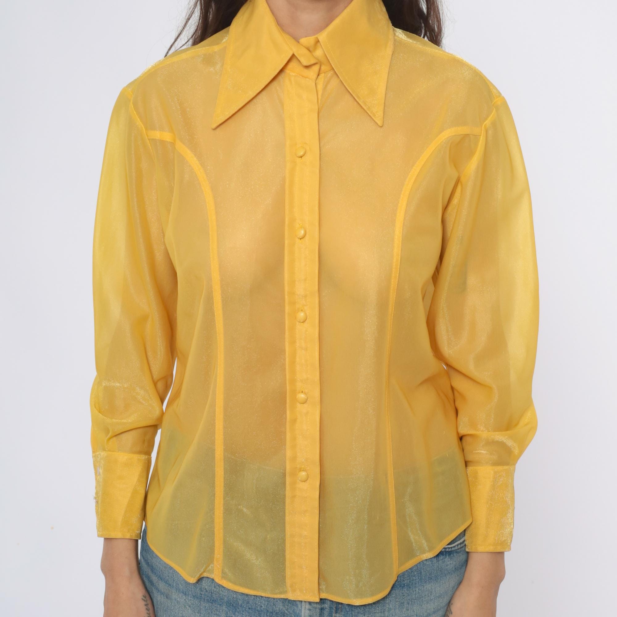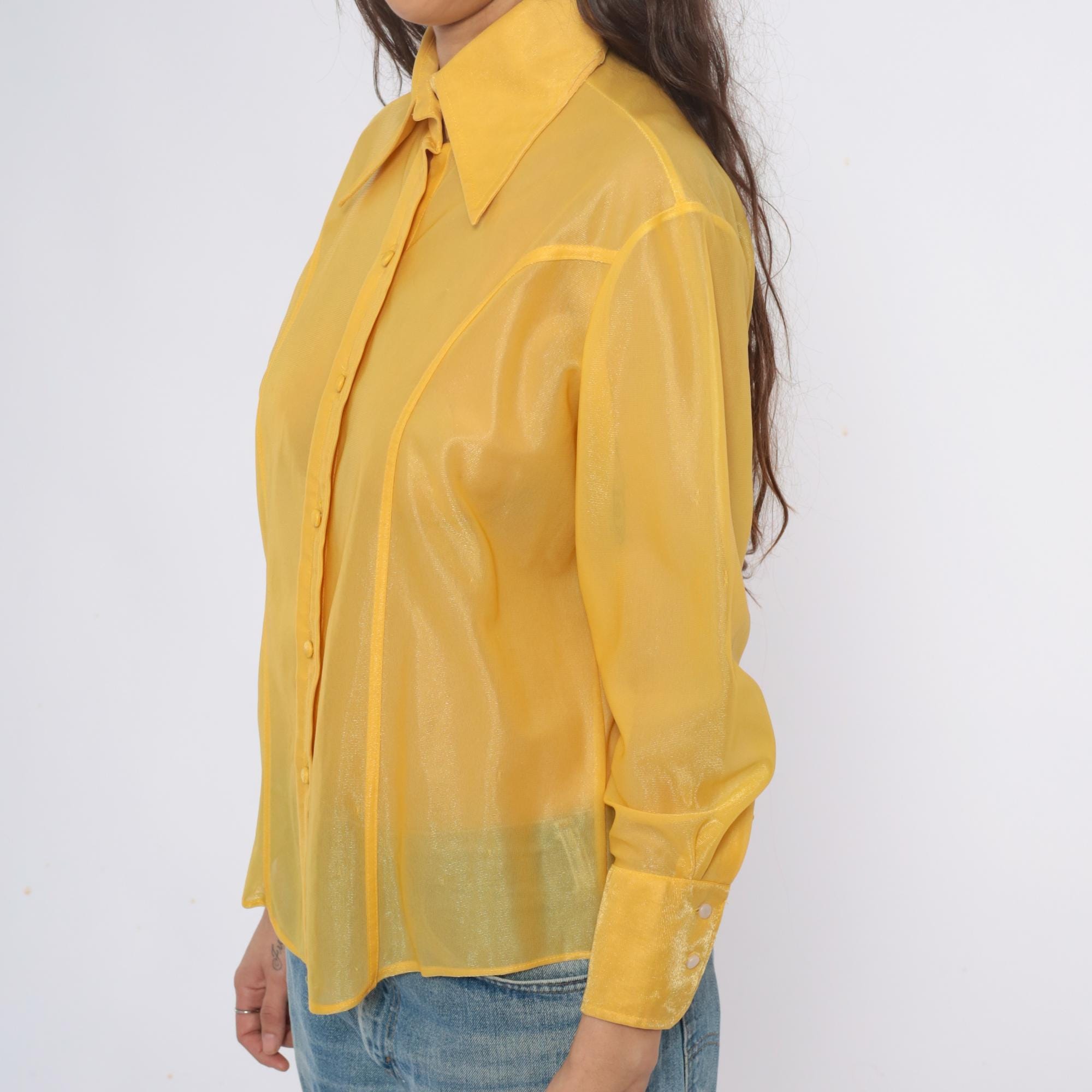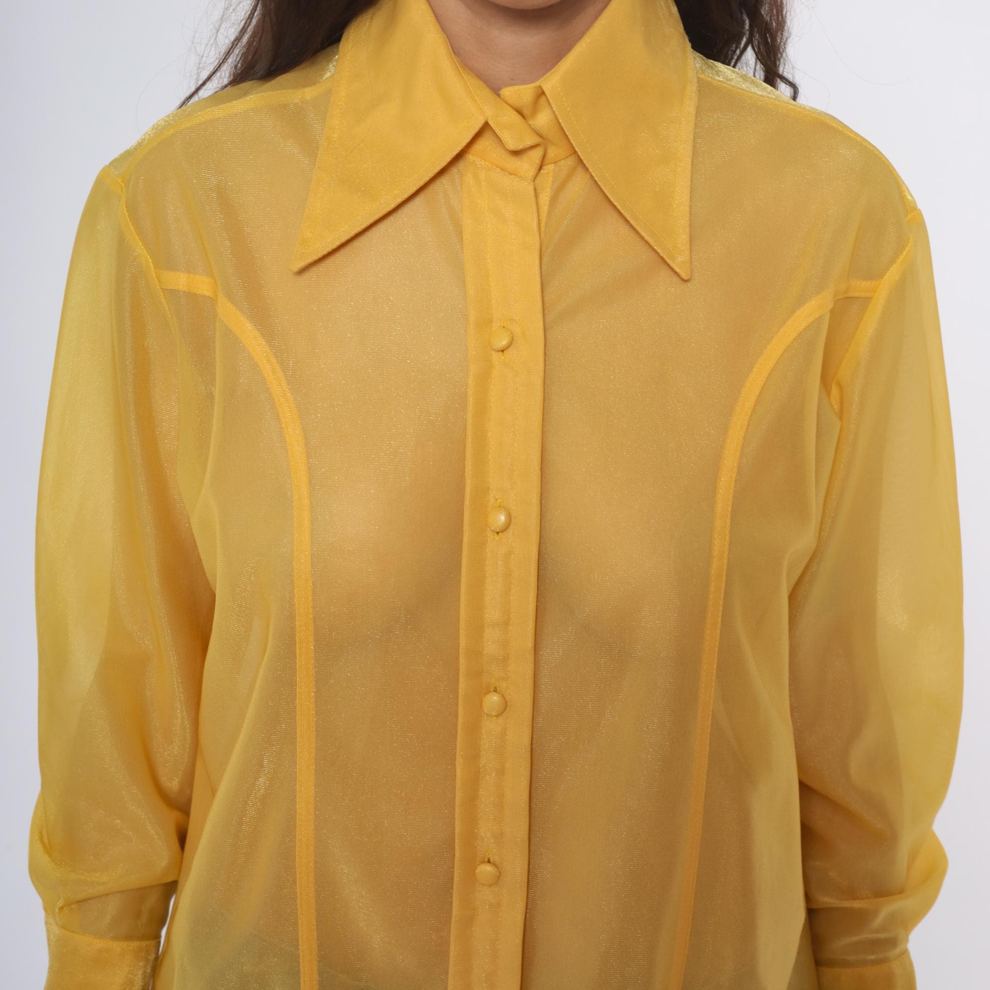 80s yellow sheer nylon shirt from lady marlboro with point collar and button front closure. Long sleeves with button cuffs, vertical panel detailing down the front. Semi-transparent golden yellow fabric.