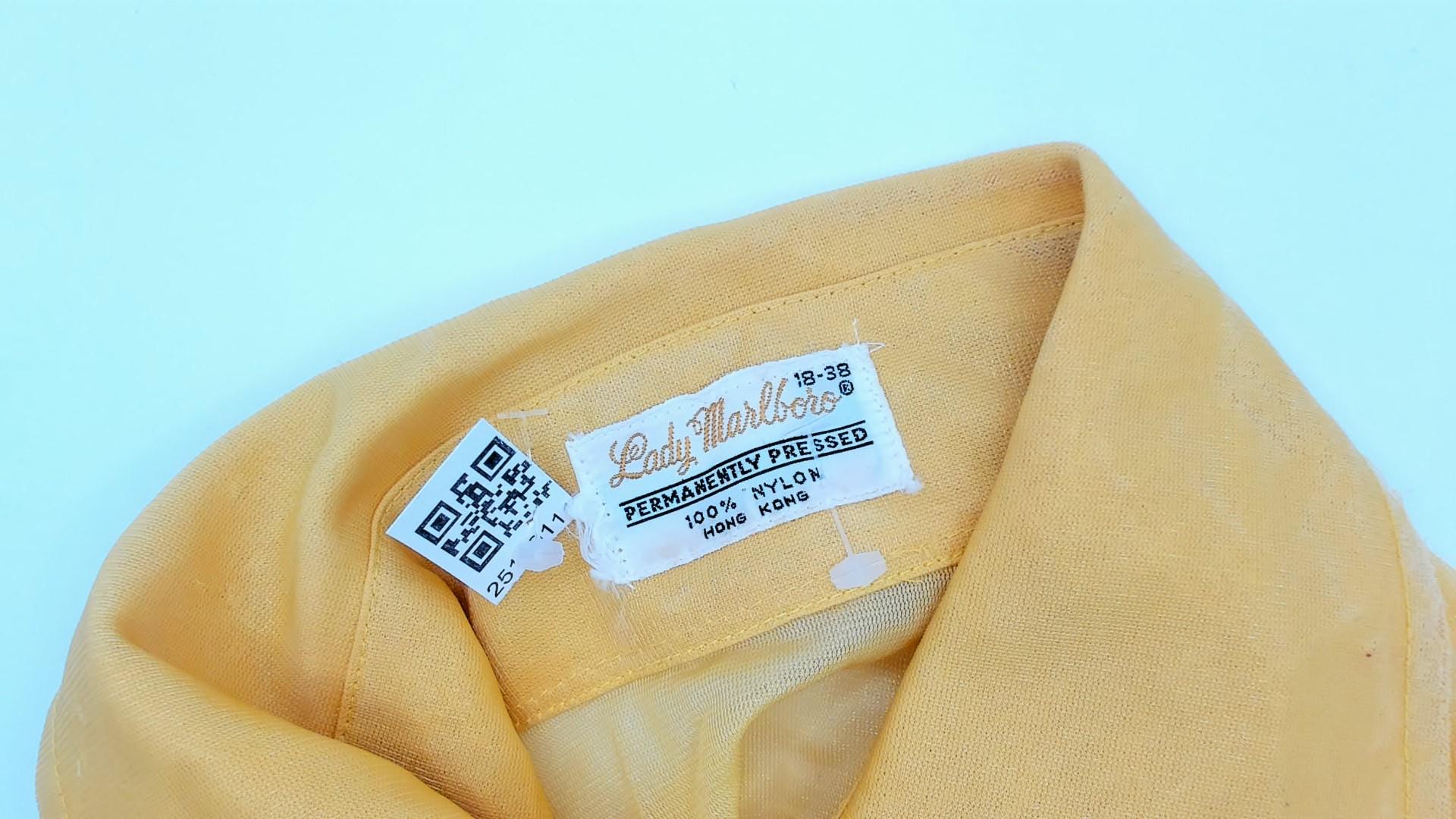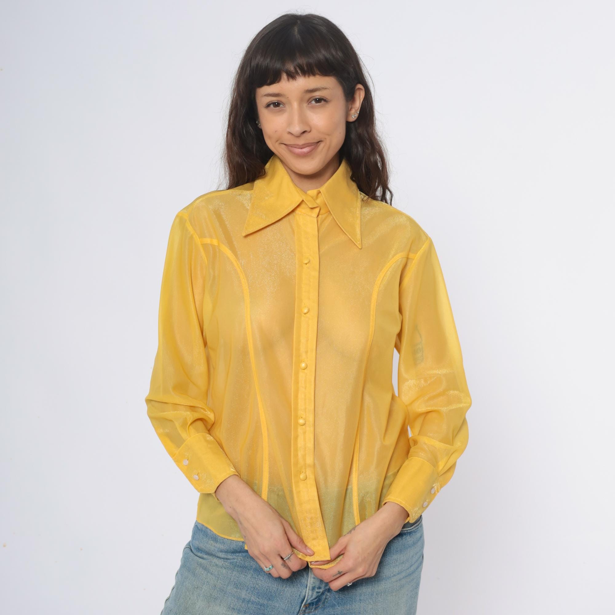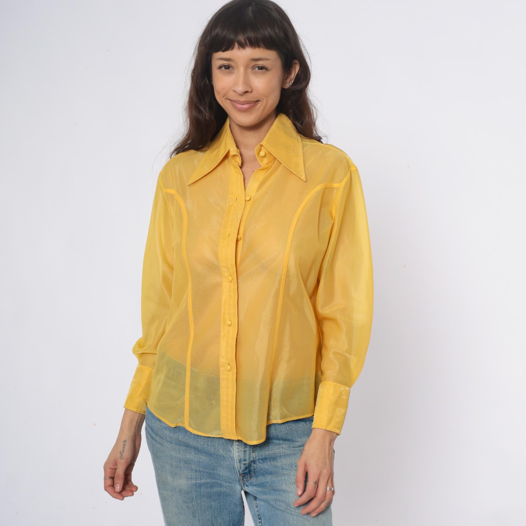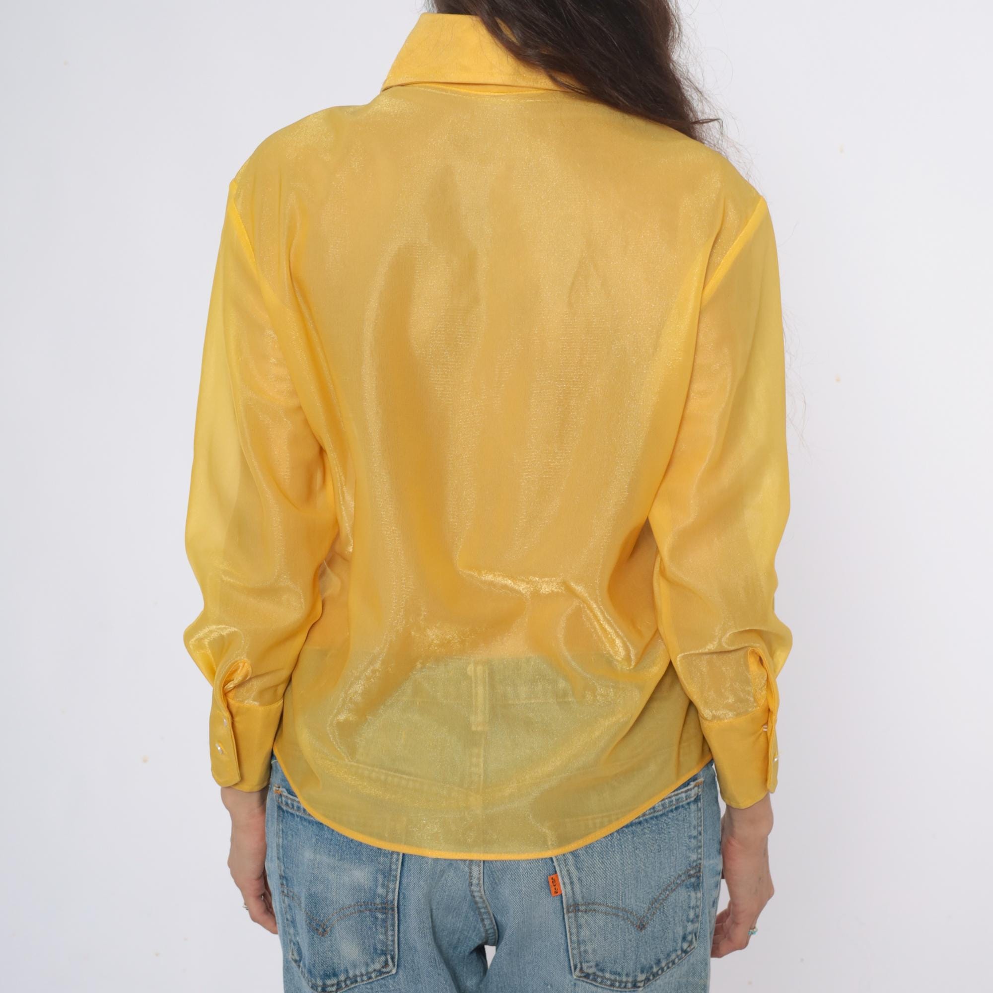 80s yellow sheer nylon shirt from lady marlboro with point collar and button front closure. Long sleeves with button cuffs, vertical panel detailing down the front. Semi-transparent golden yellow fabric.