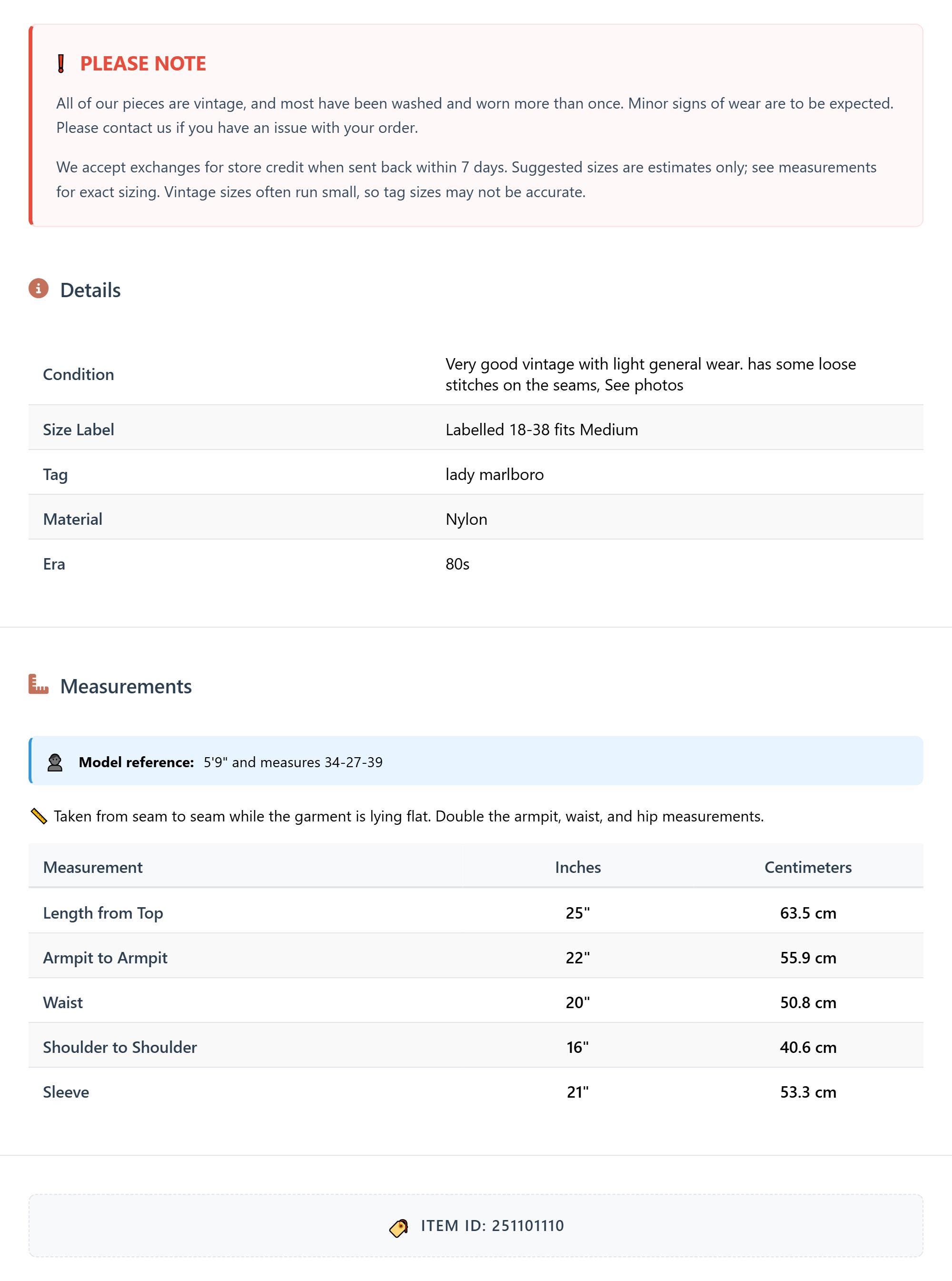 All of our pieces are vintage, and most have been washed and worn more than once. Minor signs of wear are to be expected. Please contact us if you have an issue with your order. We accept exchanges for store credit when sent back within 7 days.