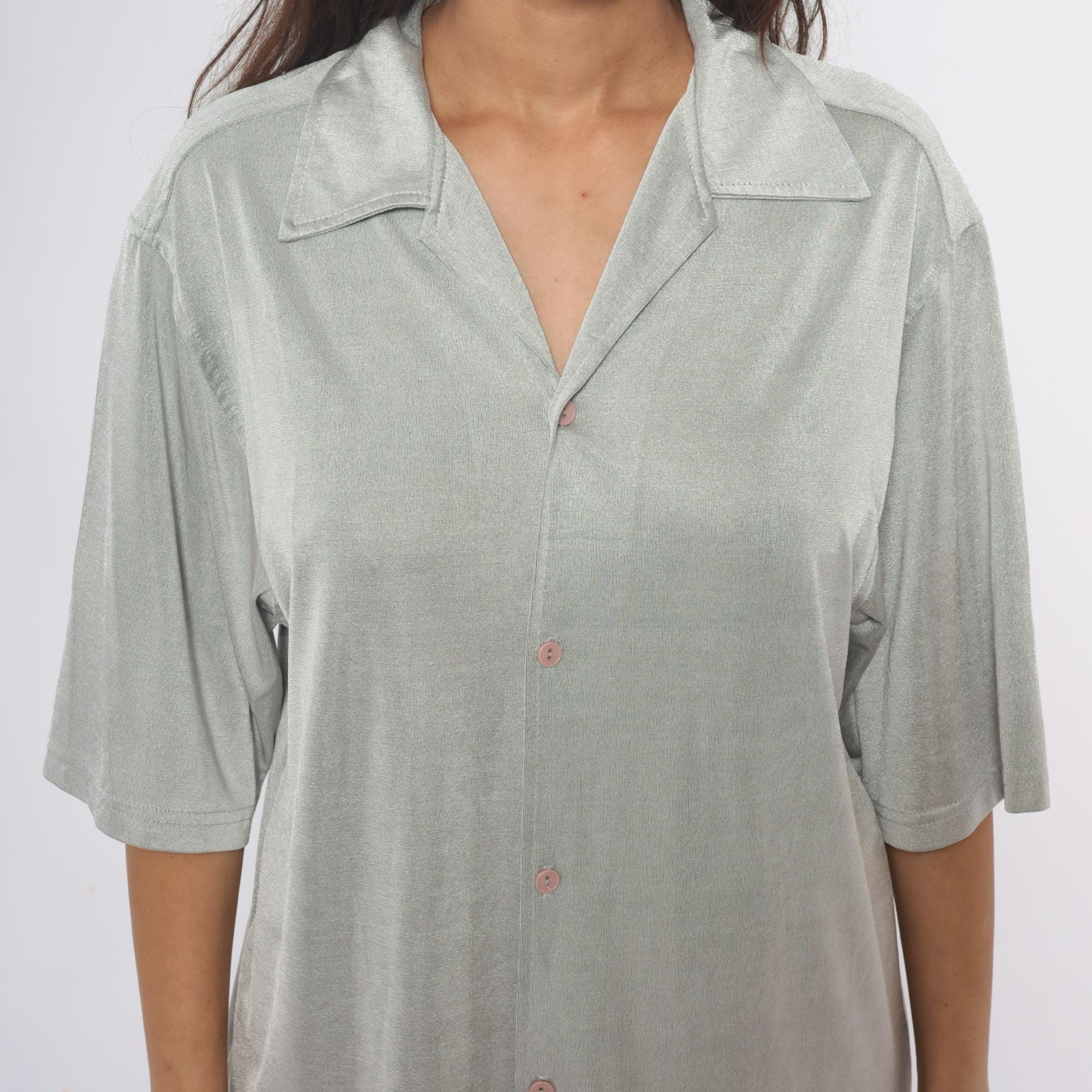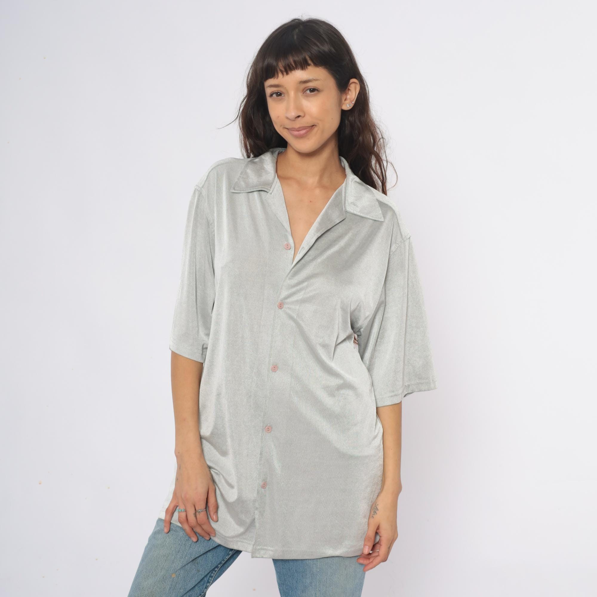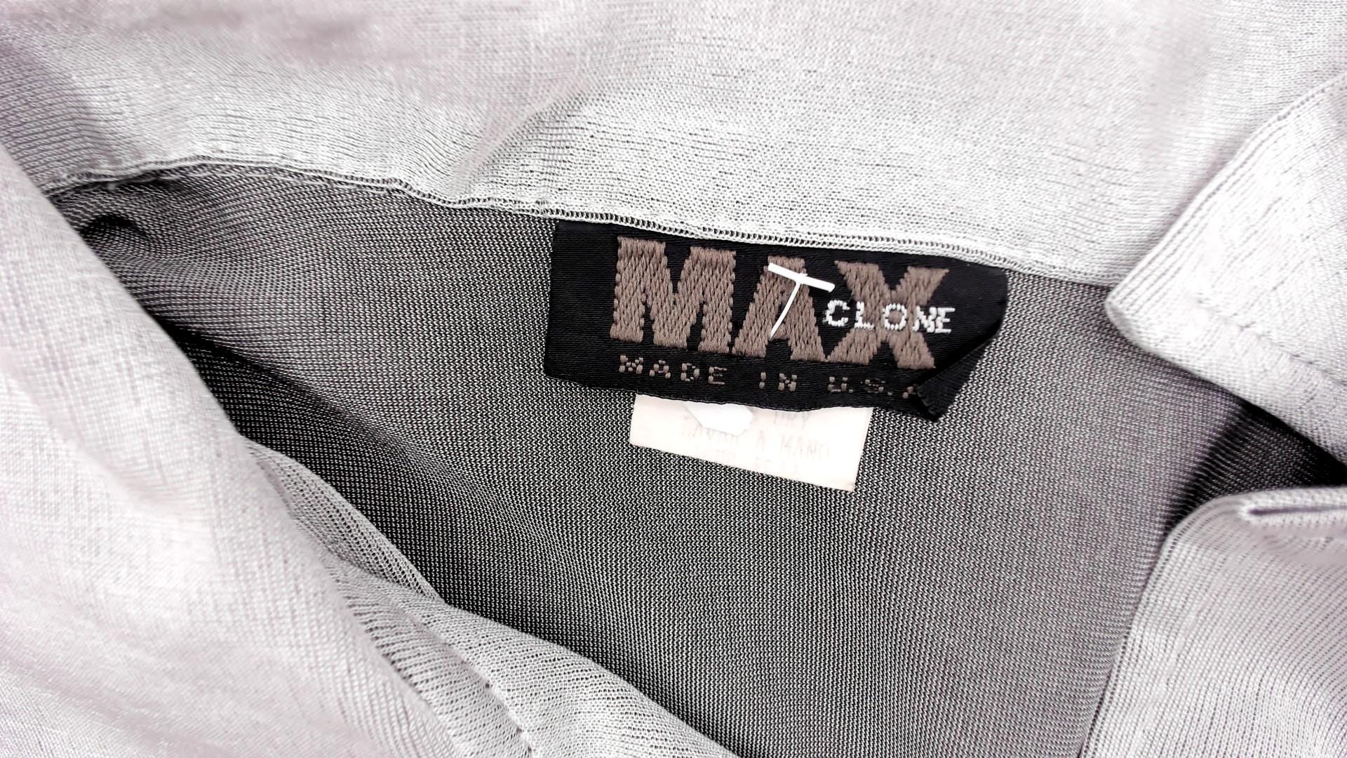90s silver button-front shirt from max clone in a relaxed tunic length. Notched collar, three-quarter sleeves with rolled cuffs, subtle shimmer throughout the fabric. Straight silhouette with side vents at hem.