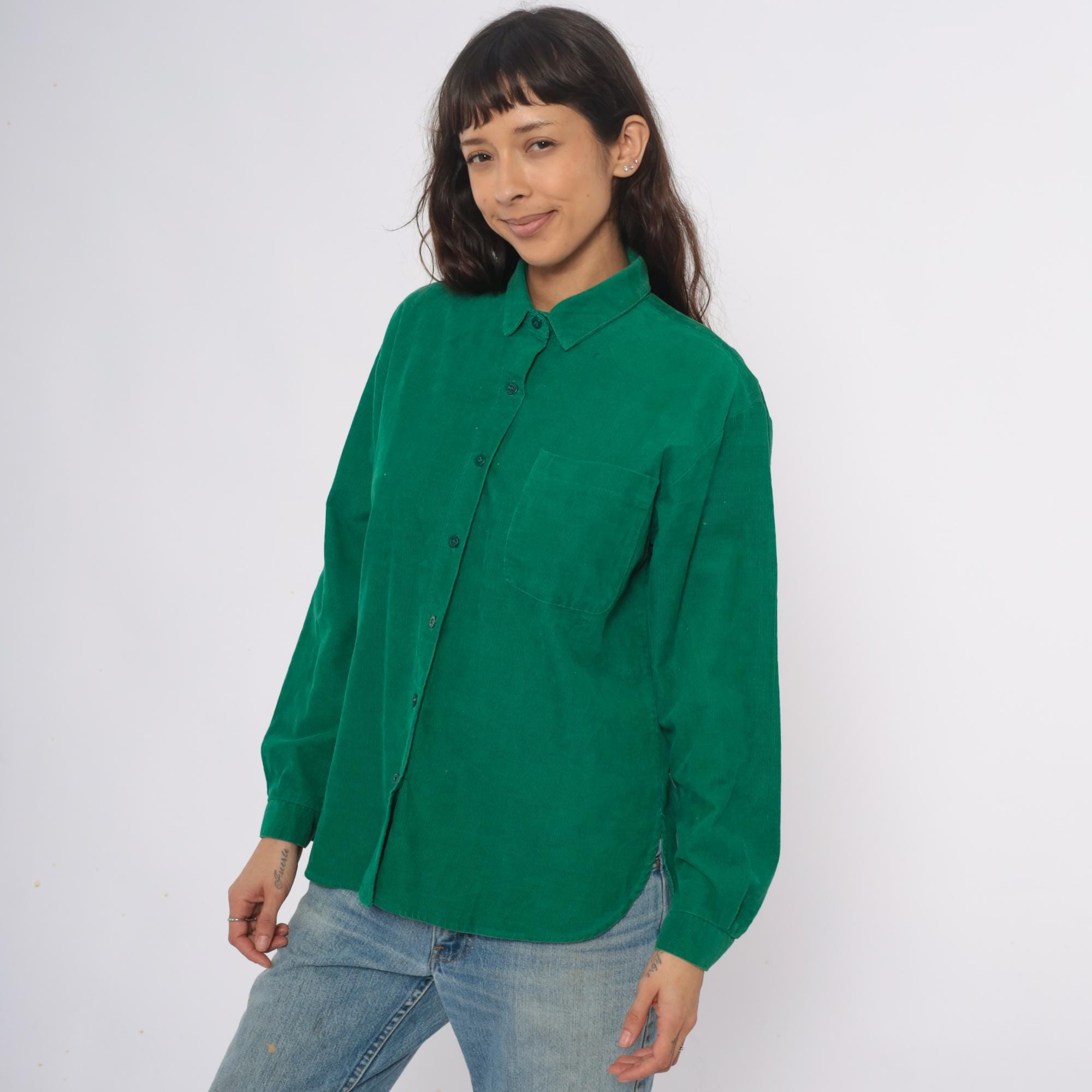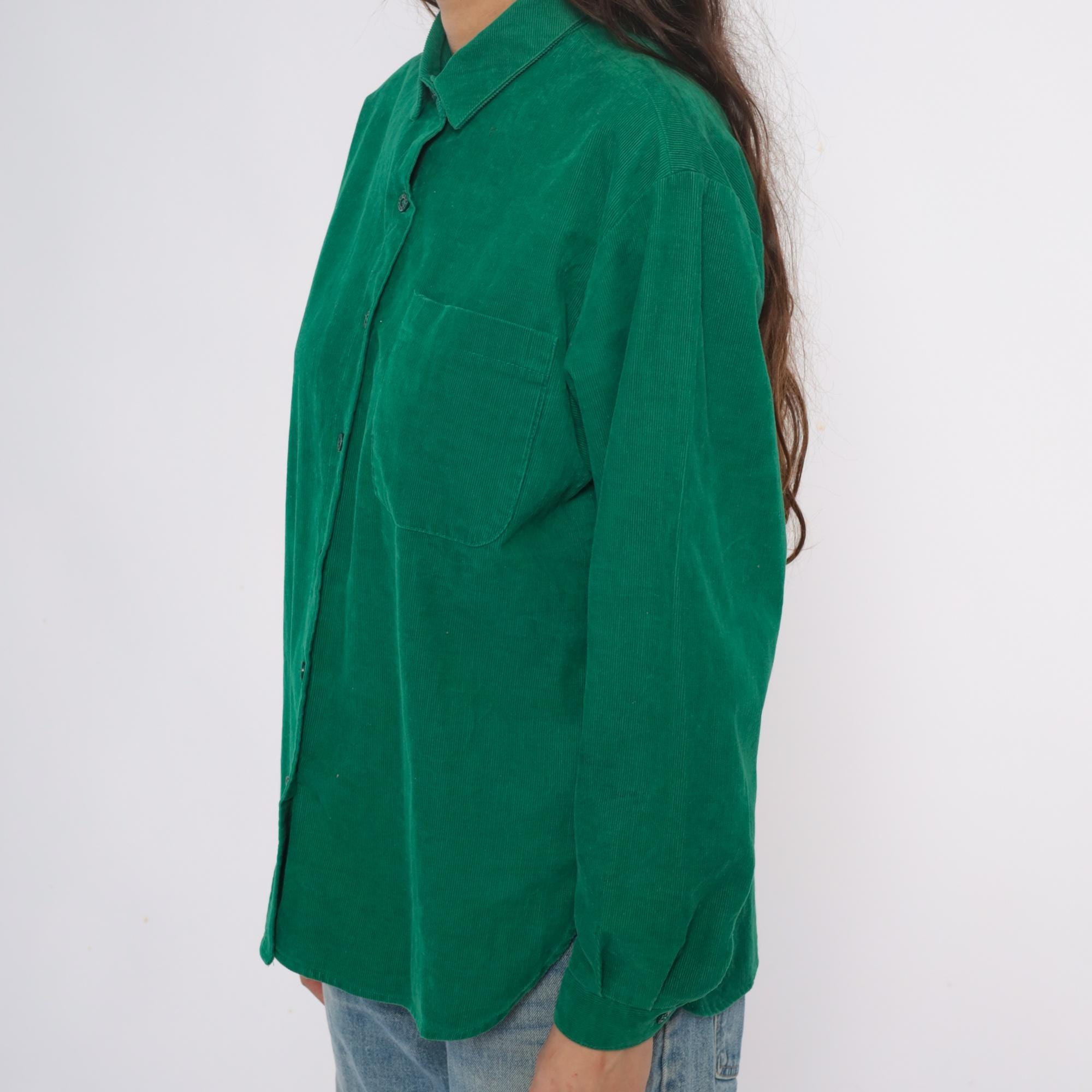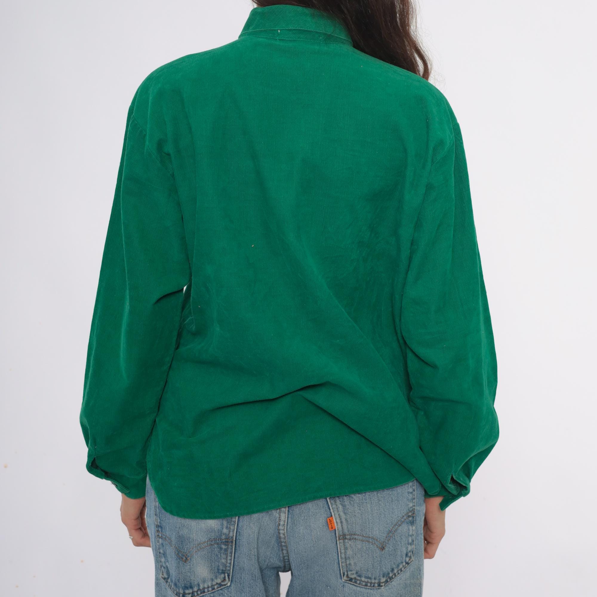 80s emerald green corduroy shirt with button front closure and pointed collar. Long sleeves, single chest pocket on left side.