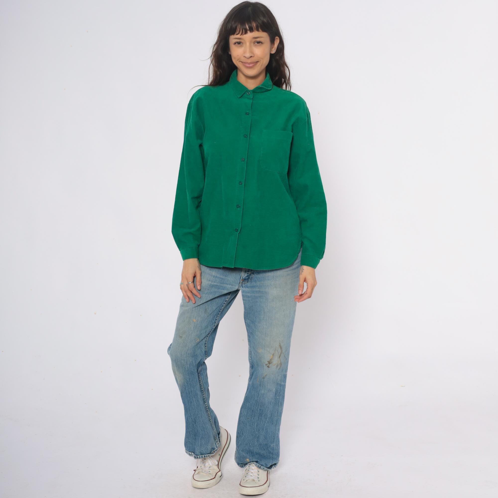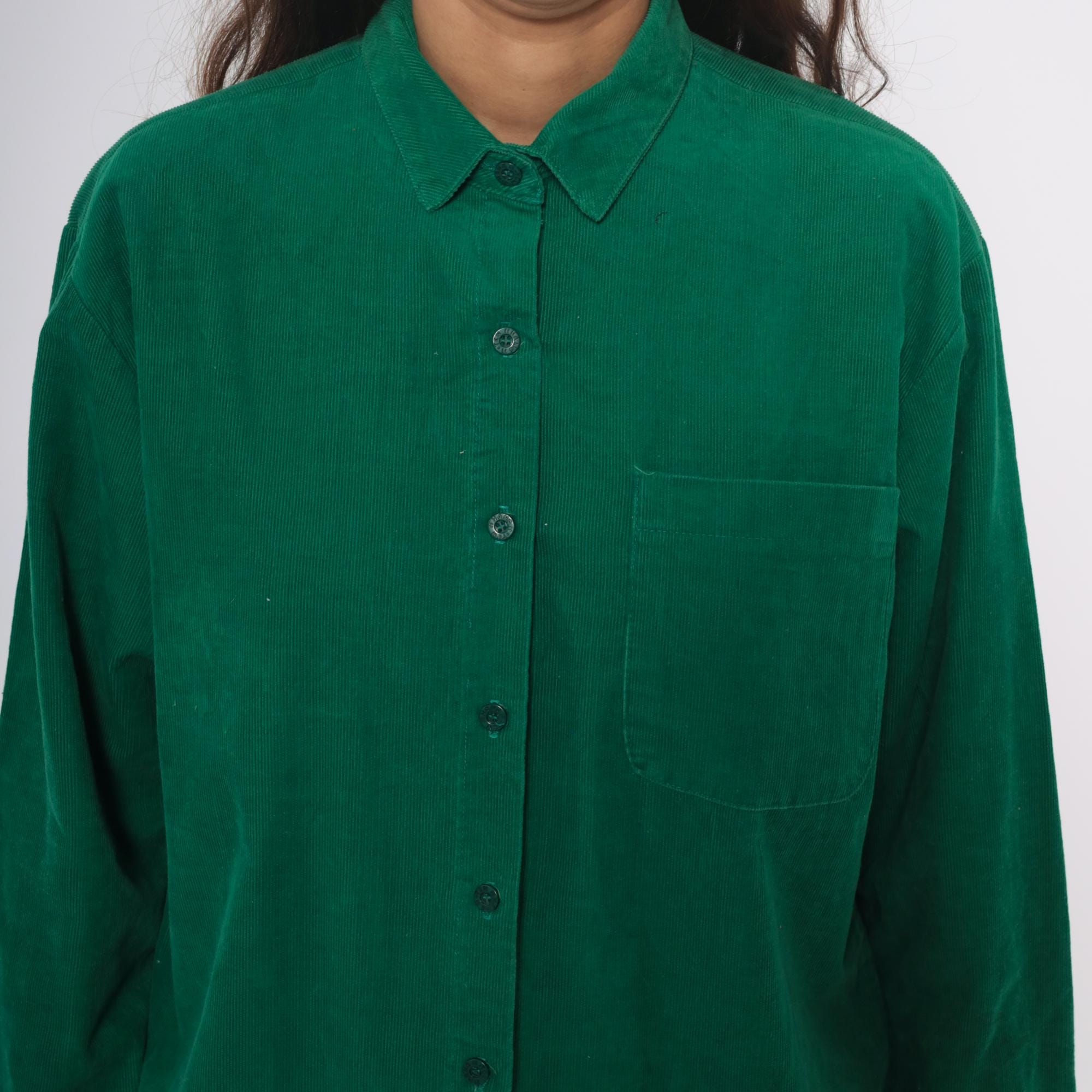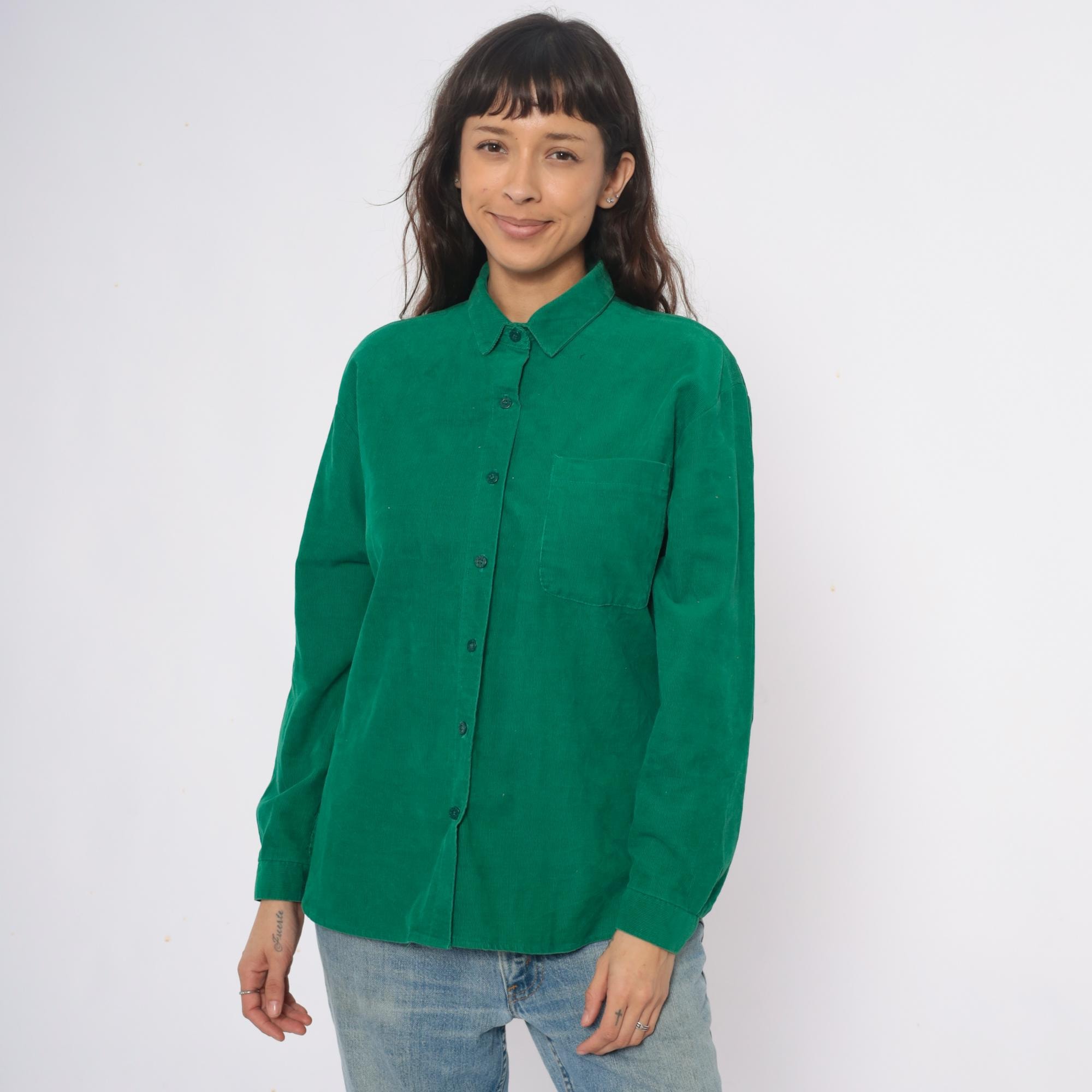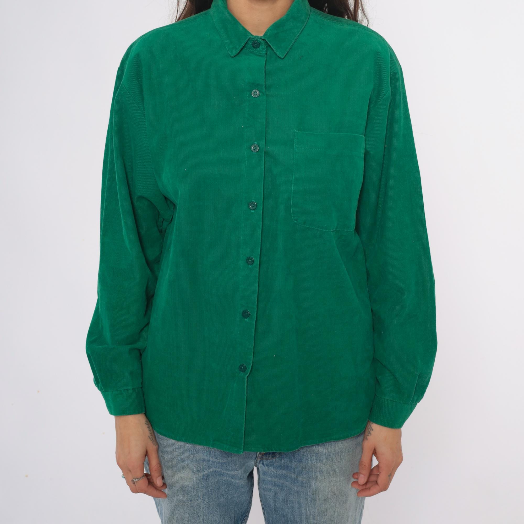 80s emerald green corduroy shirt with button front closure and pointed collar. Long sleeves, single chest pocket on left side.