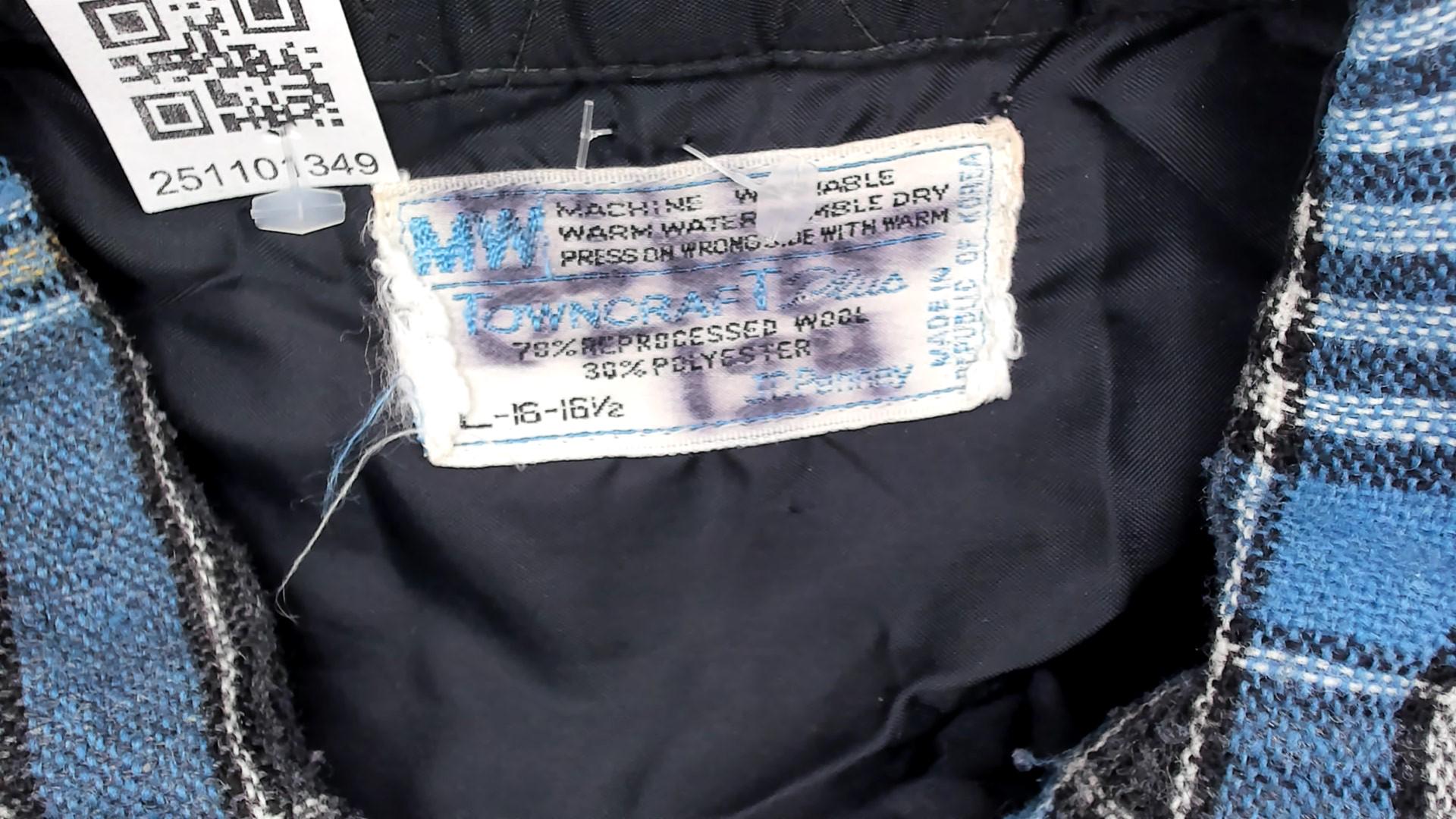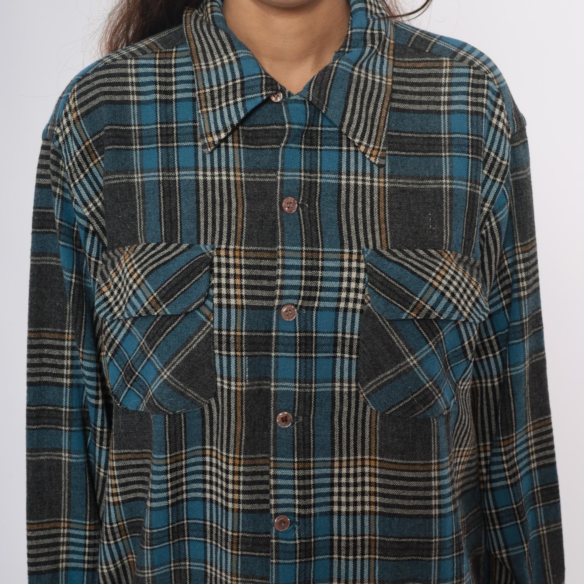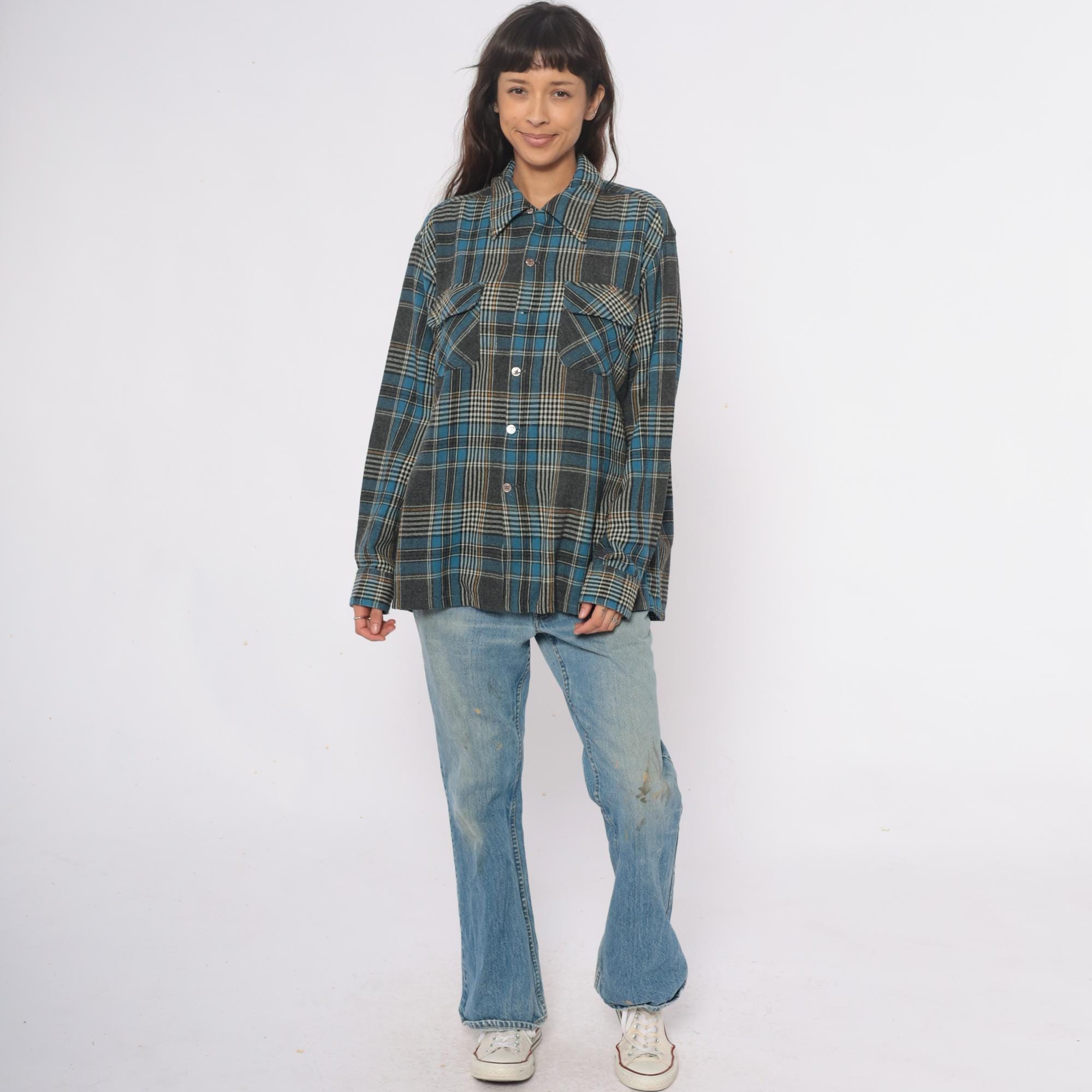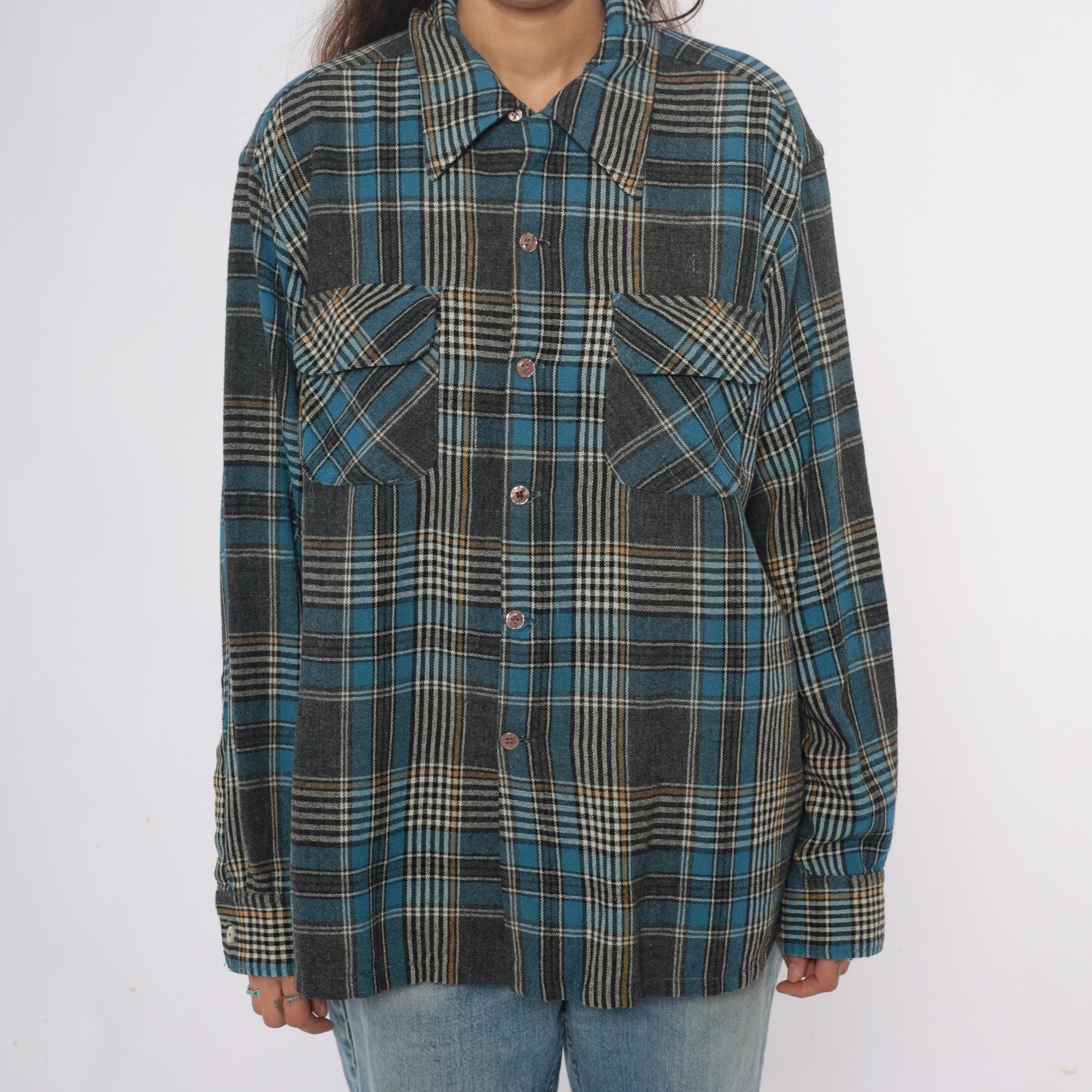 70s plaid shirt from jc penney towncraft in blue, gray, and yellow tones. Pointed collar, long sleeves with button cuffs, two chest pockets with button-down flaps.