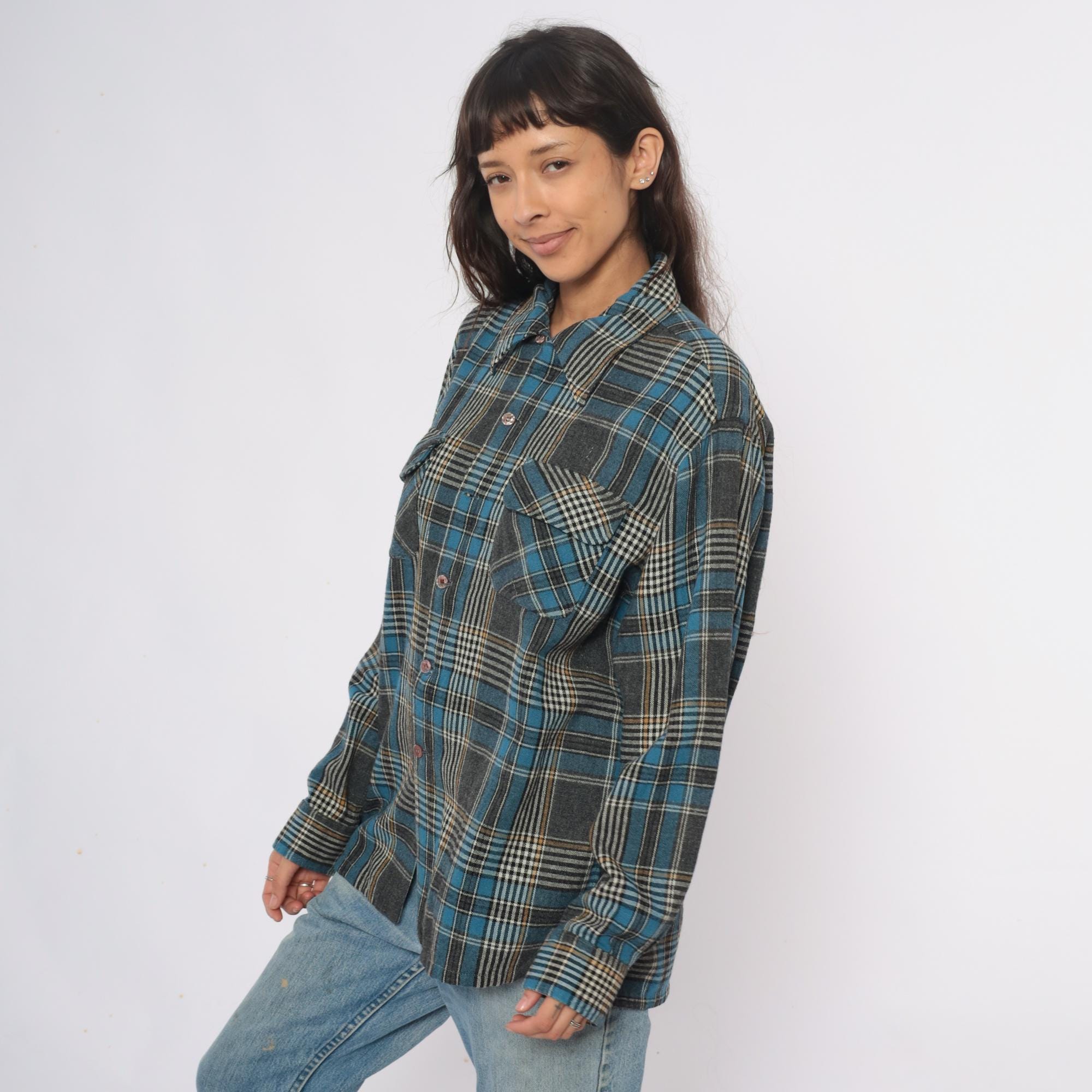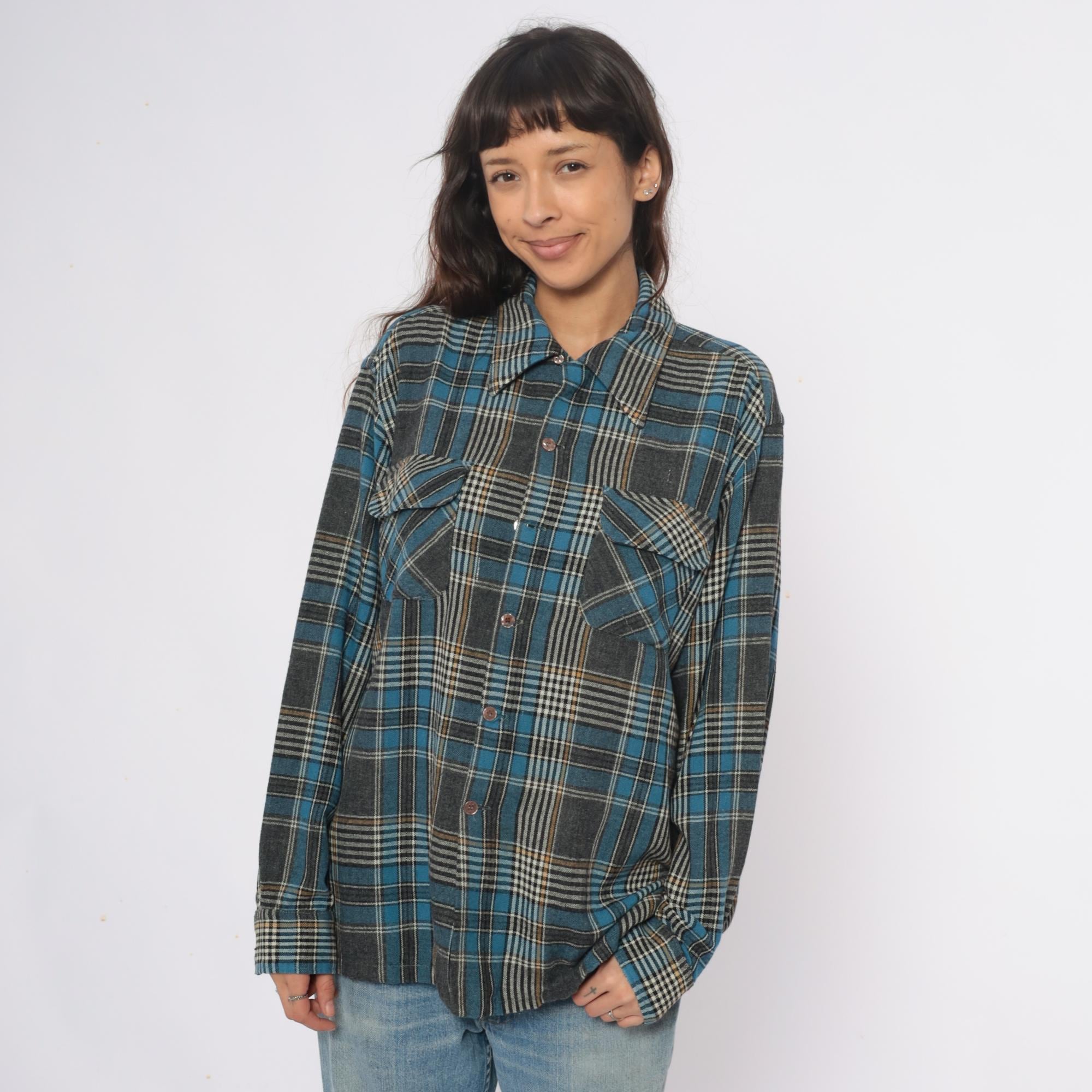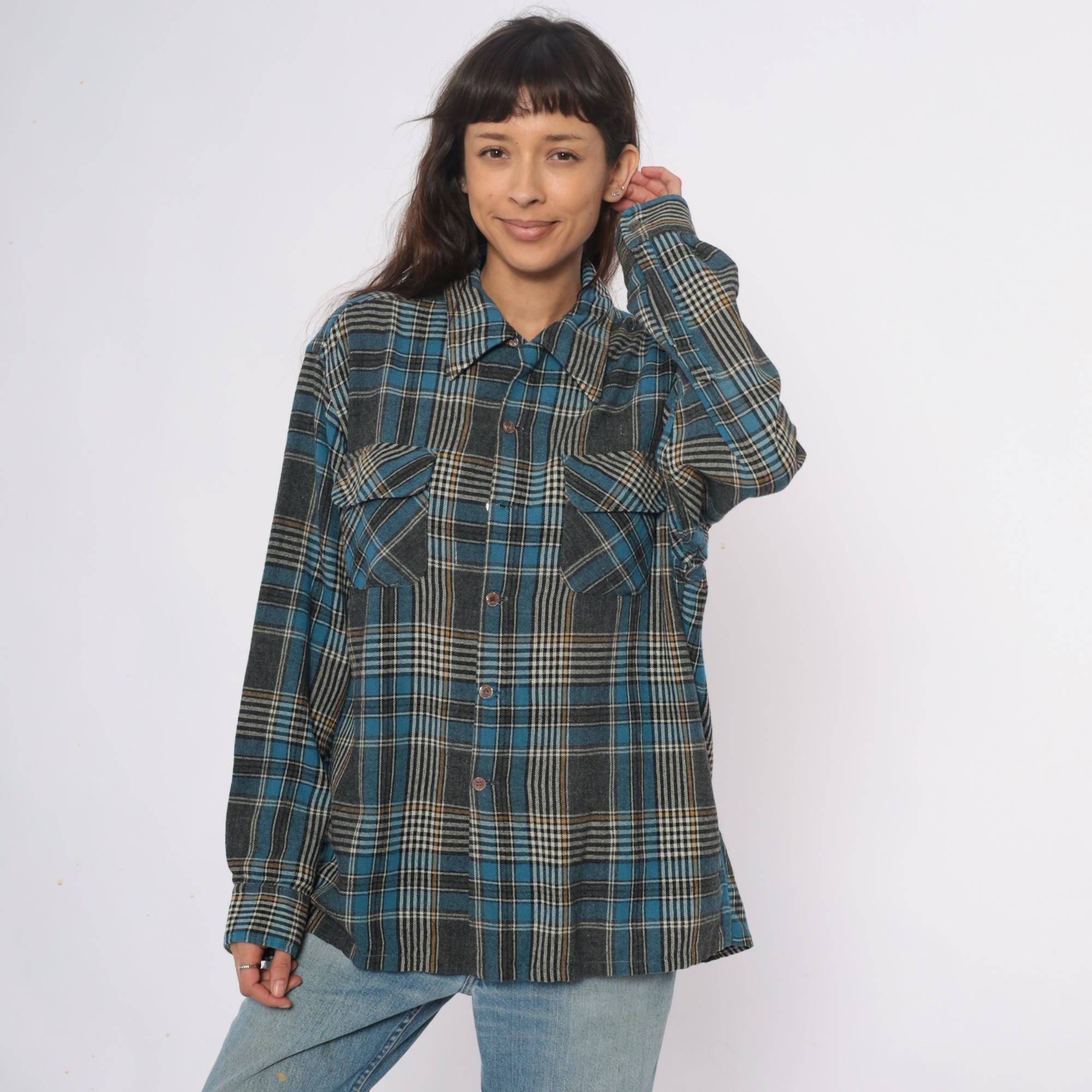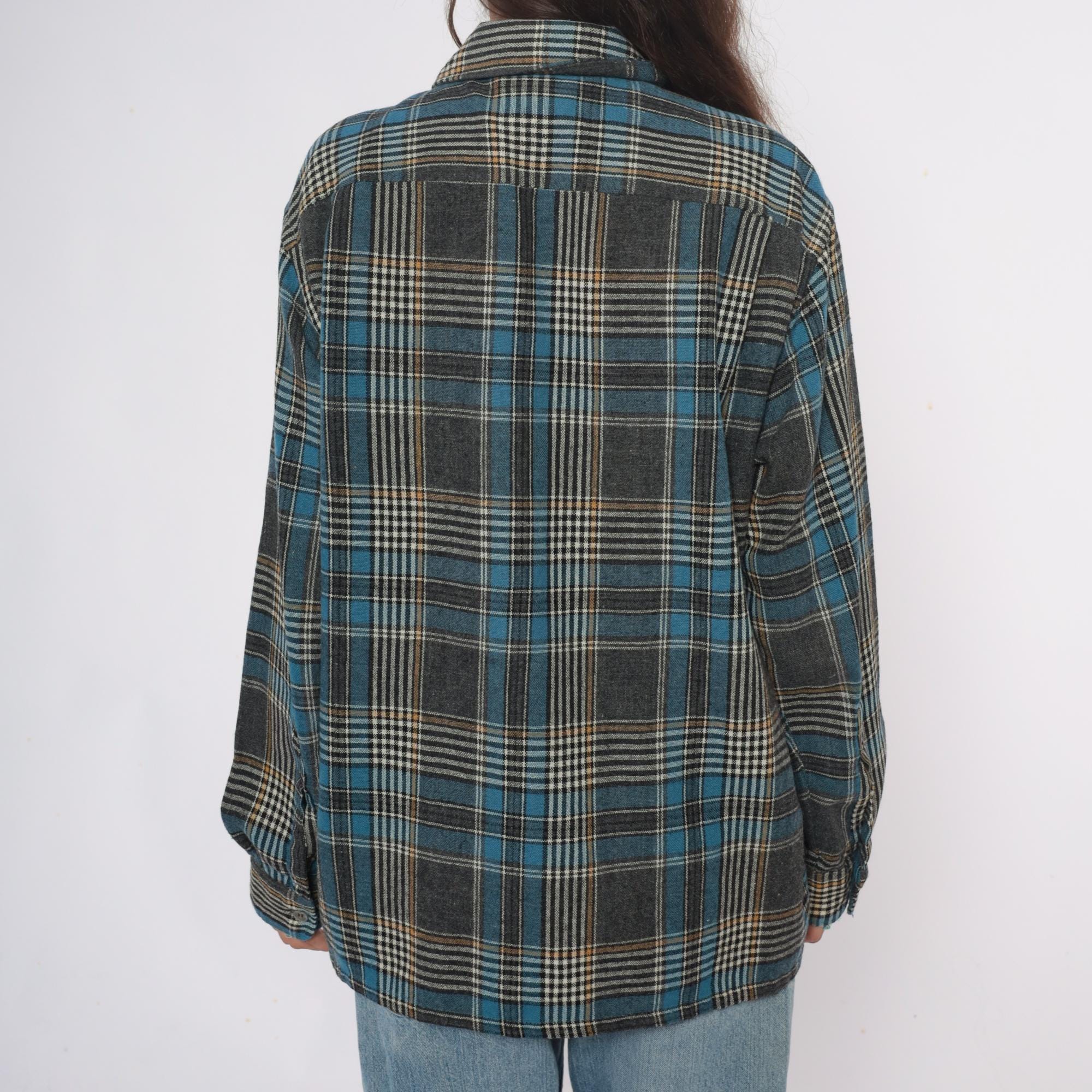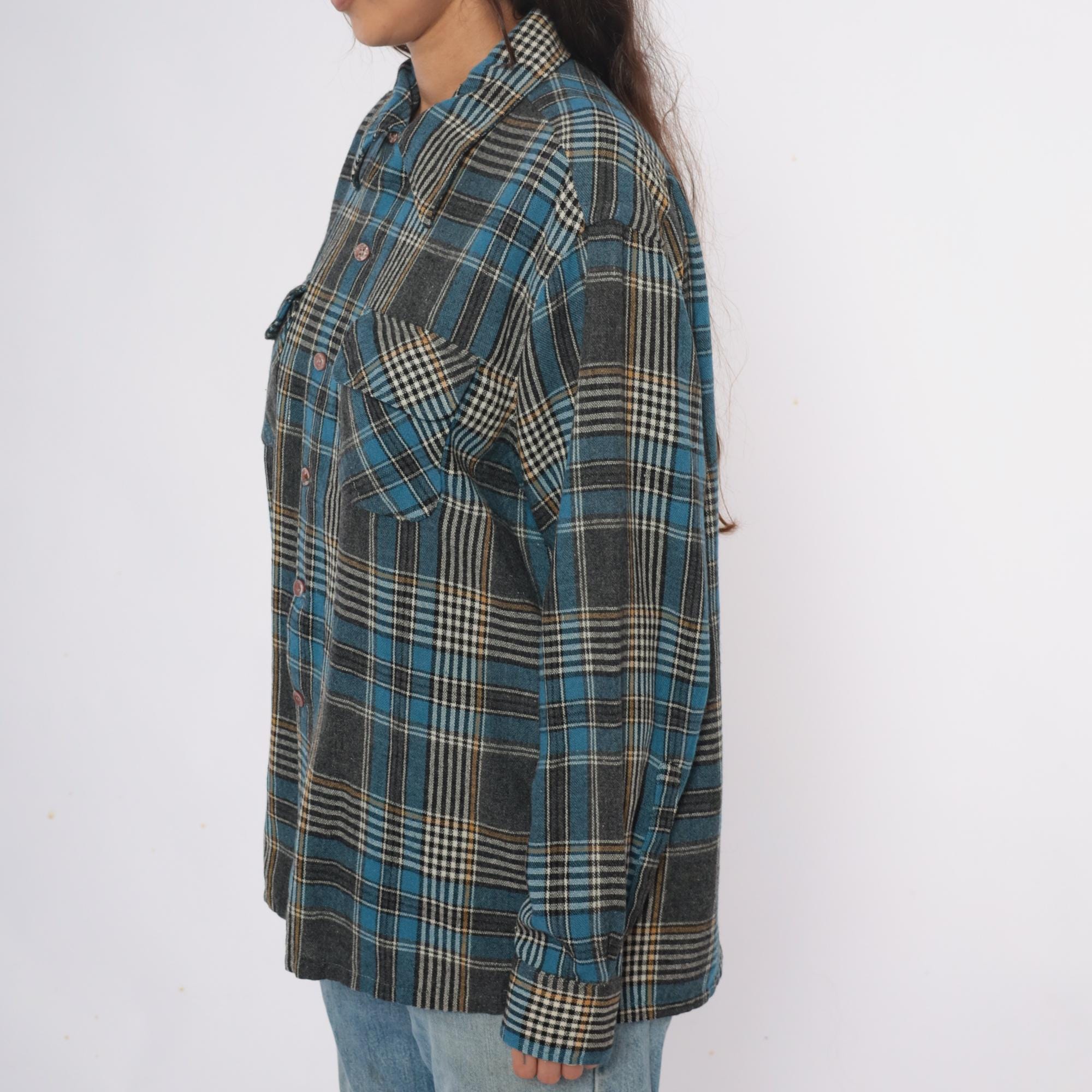 70s plaid shirt from jc penney towncraft in blue, gray, and yellow tones. Pointed collar, long sleeves with button cuffs, two chest pockets with button-down flaps.
