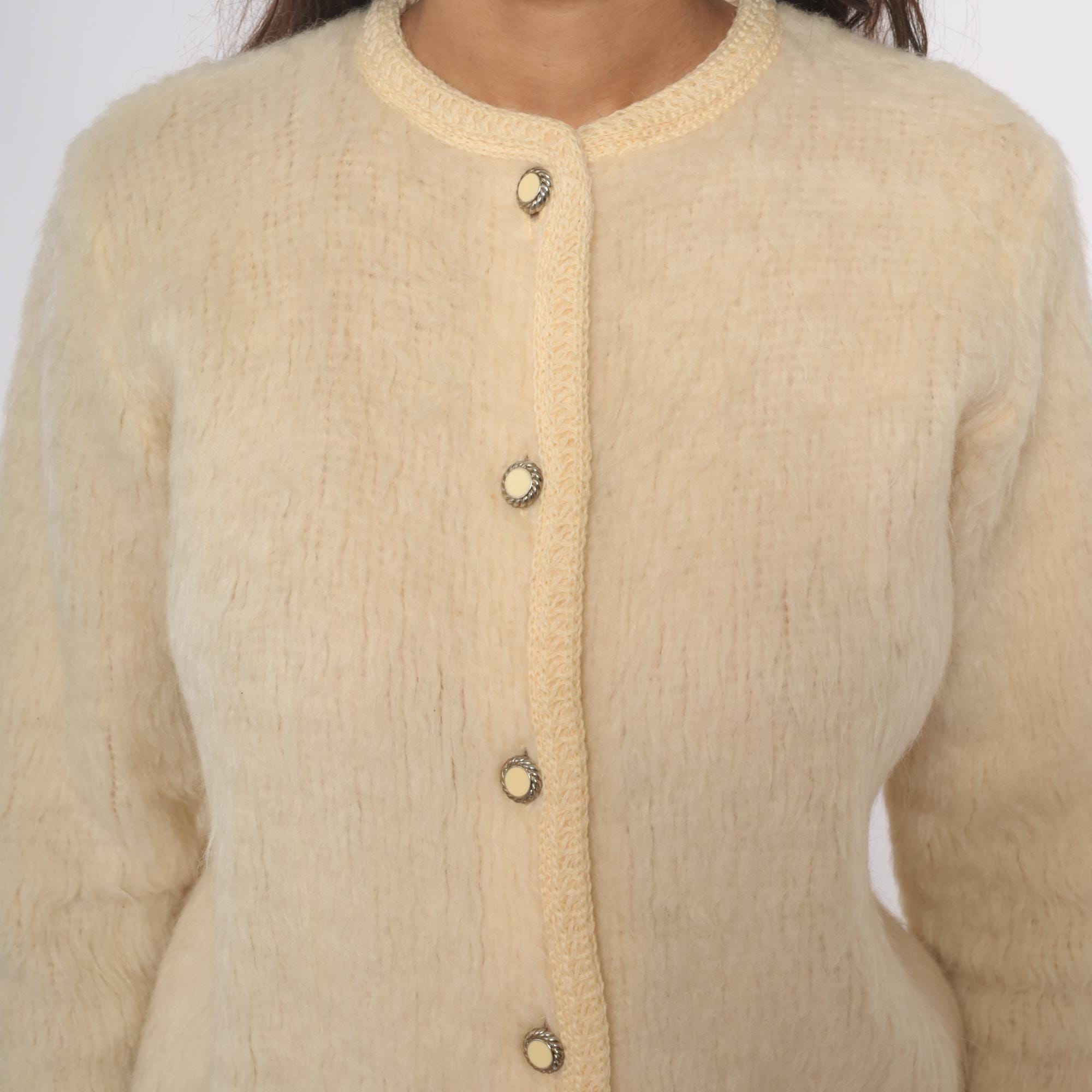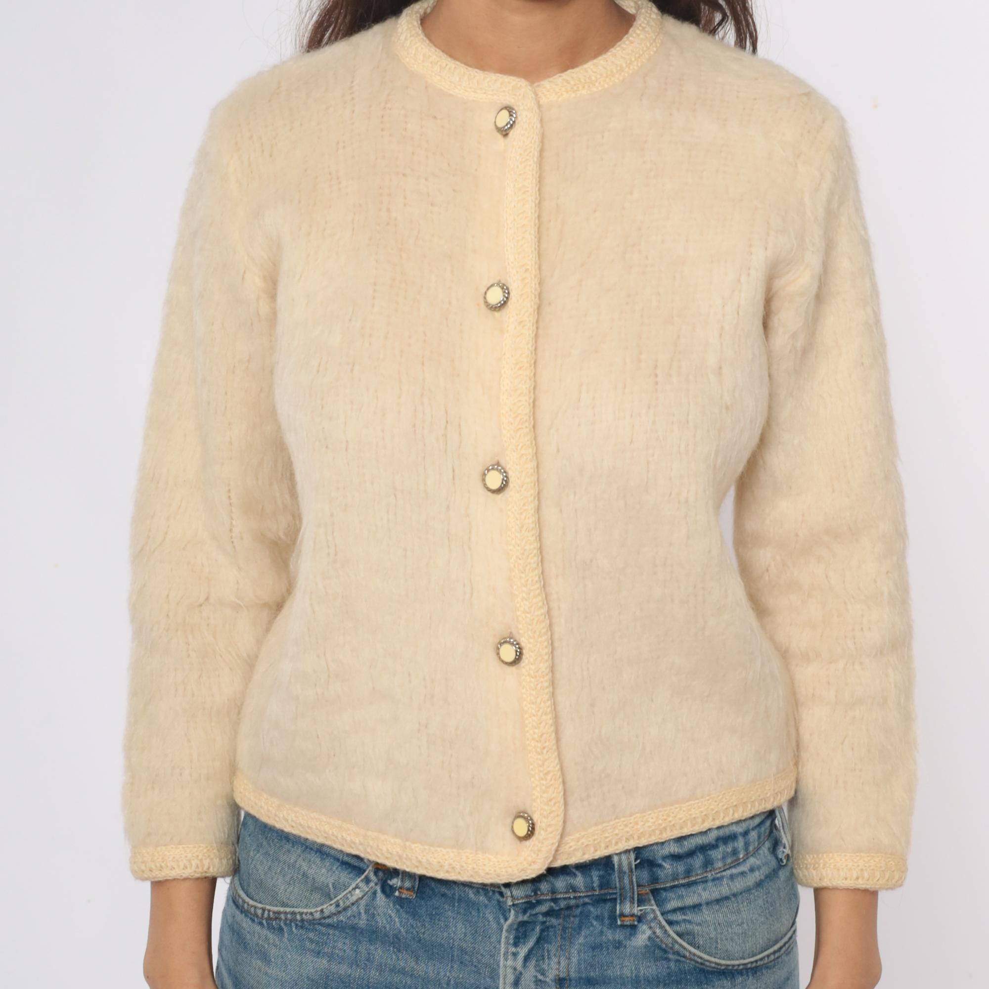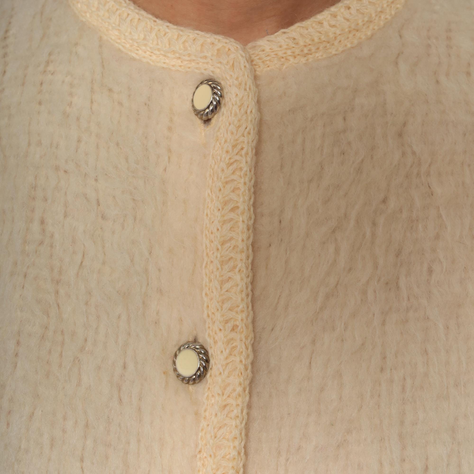 70s cream cardigan in textured wool blend with rounded Peter Pan collar and decorative engraved gold-toned buttons down the front. Long sleeves with ribbed cuffs, ribbed trim at collar, placket, and hem. Fuzzy mohair-like texture throughout.