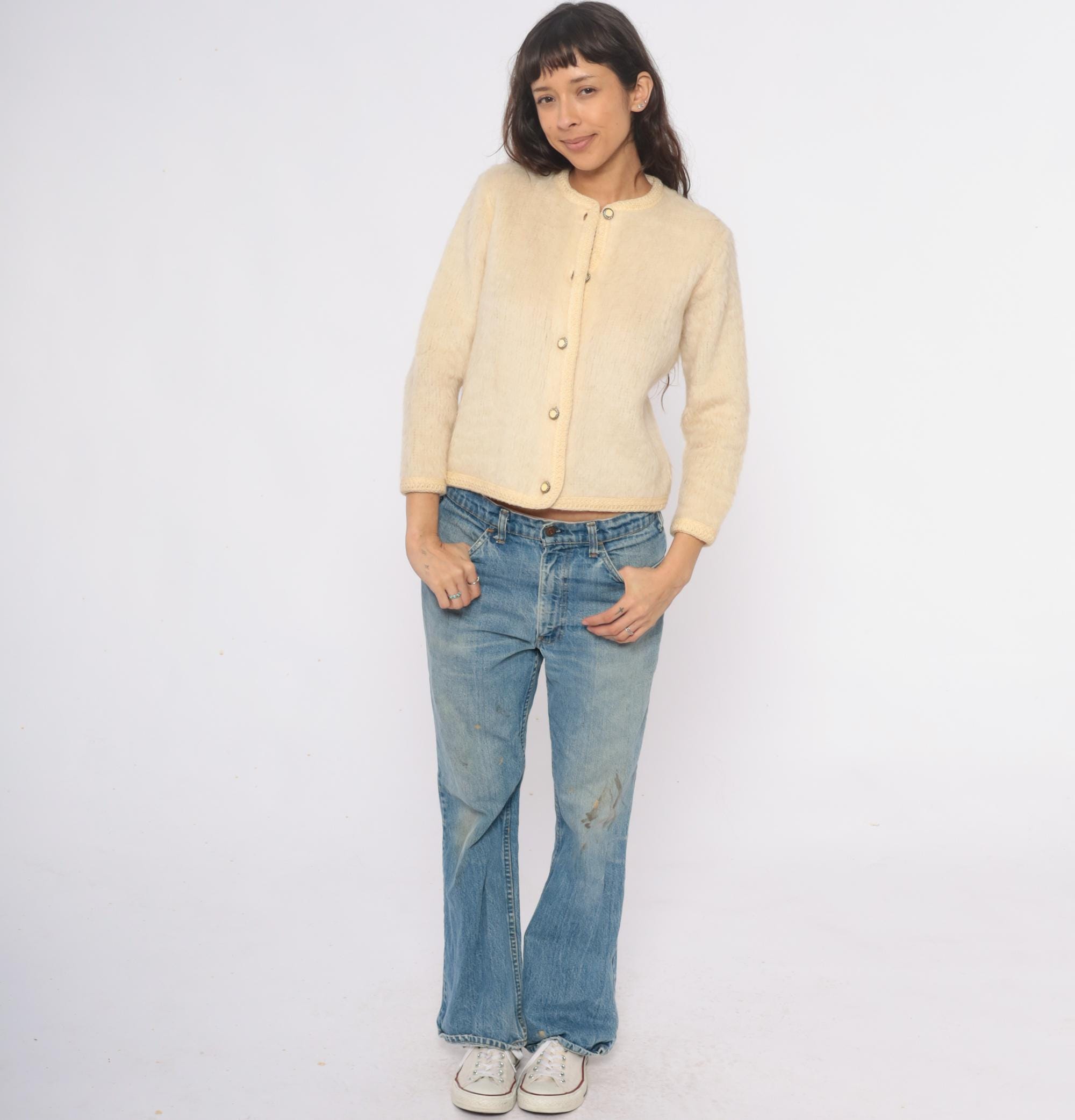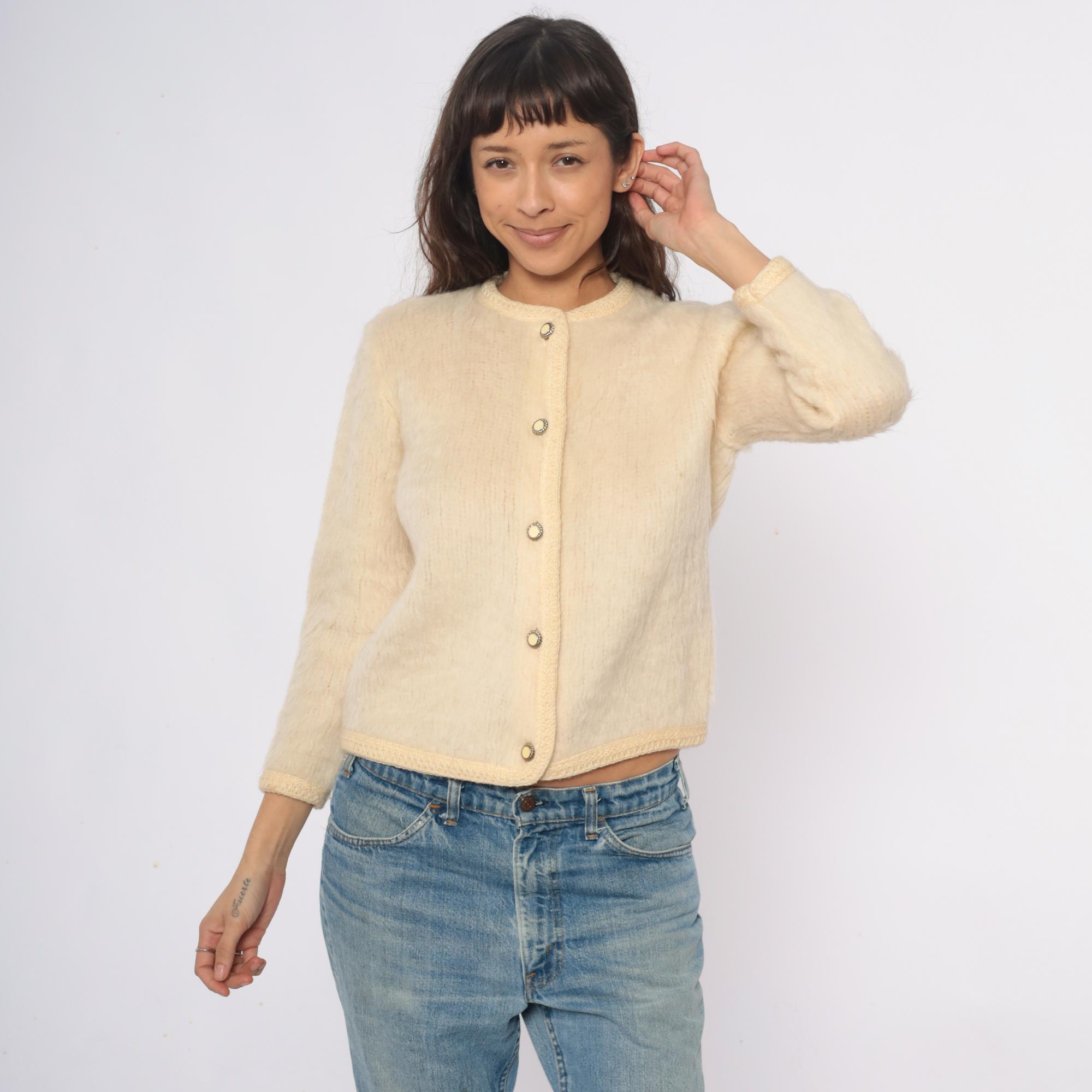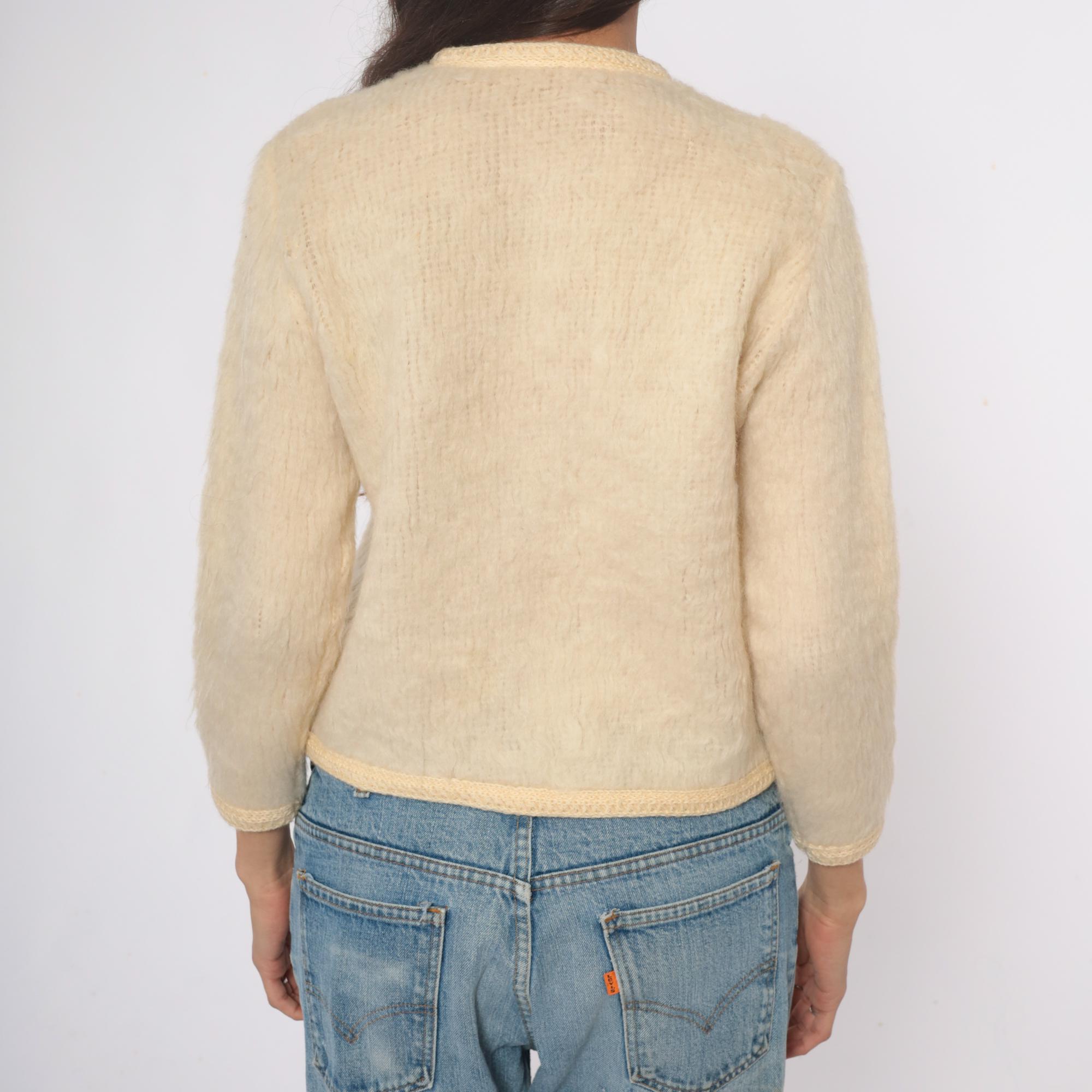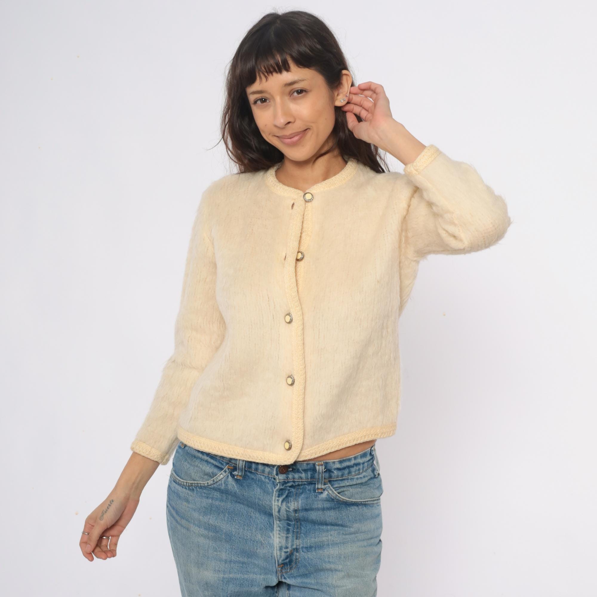 70s cream cardigan in textured wool blend with rounded Peter Pan collar and decorative engraved gold-toned buttons down the front. Long sleeves with ribbed cuffs, ribbed trim at collar, placket, and hem. Fuzzy mohair-like texture throughout.