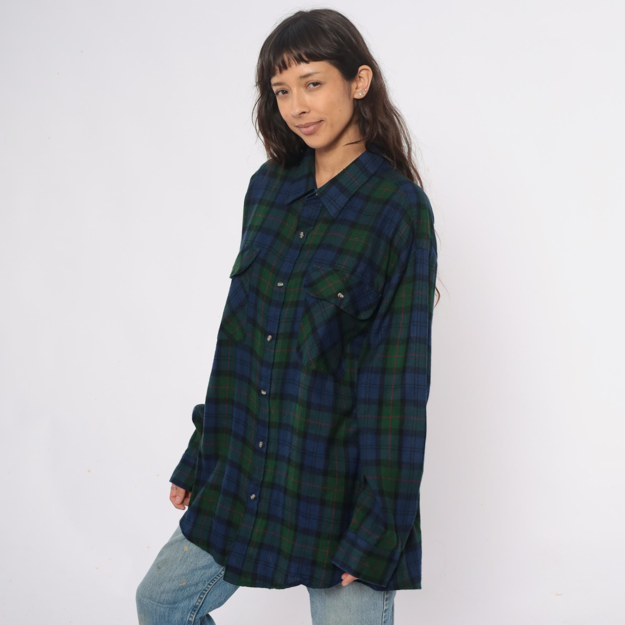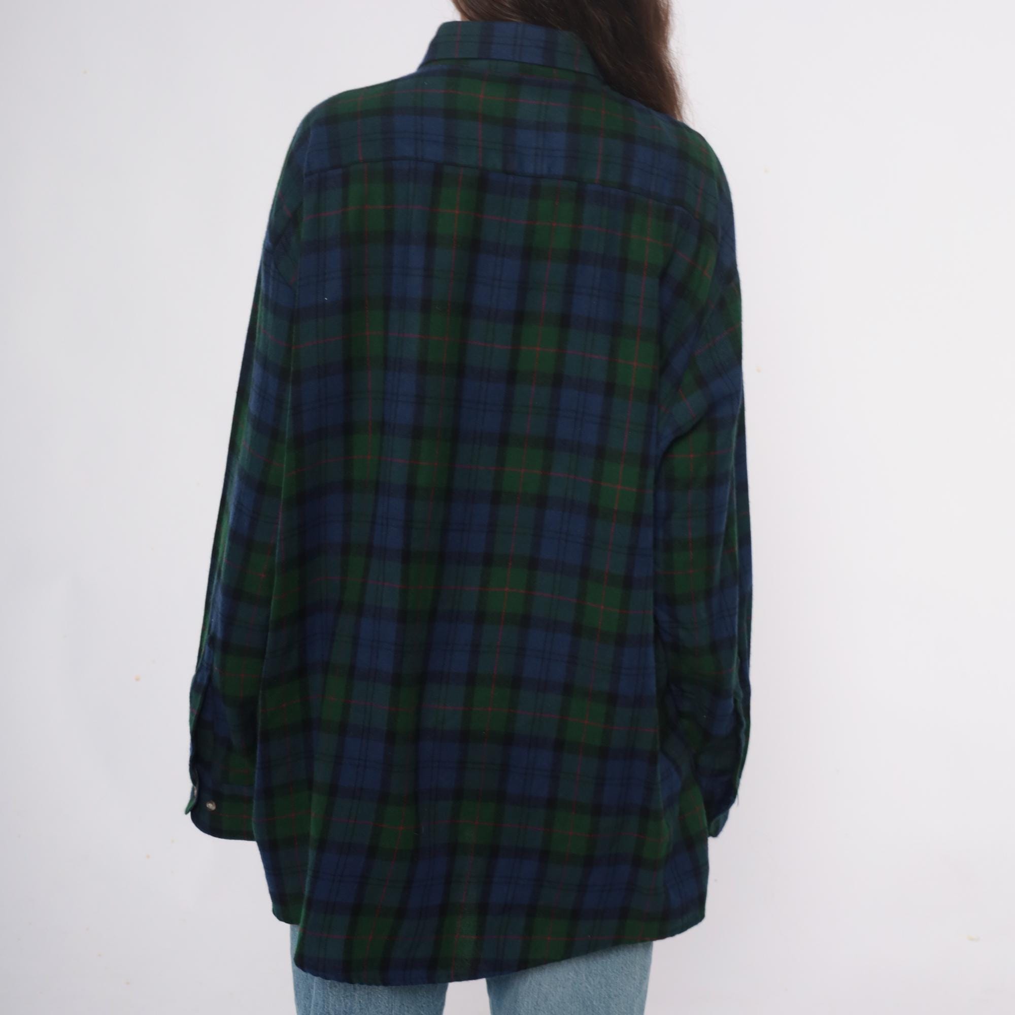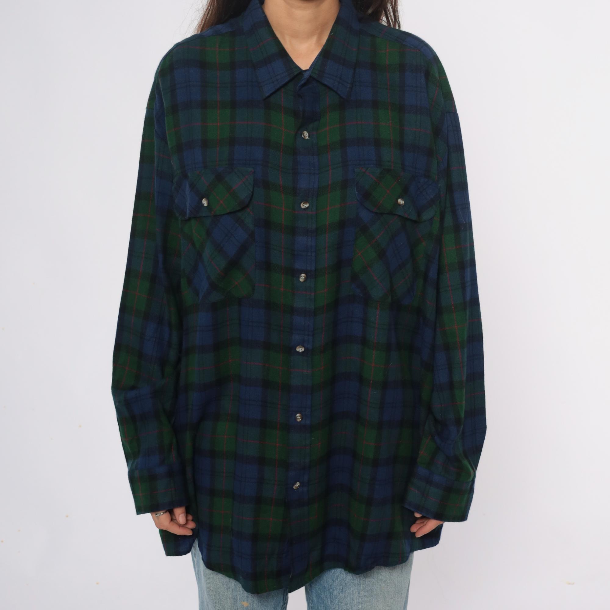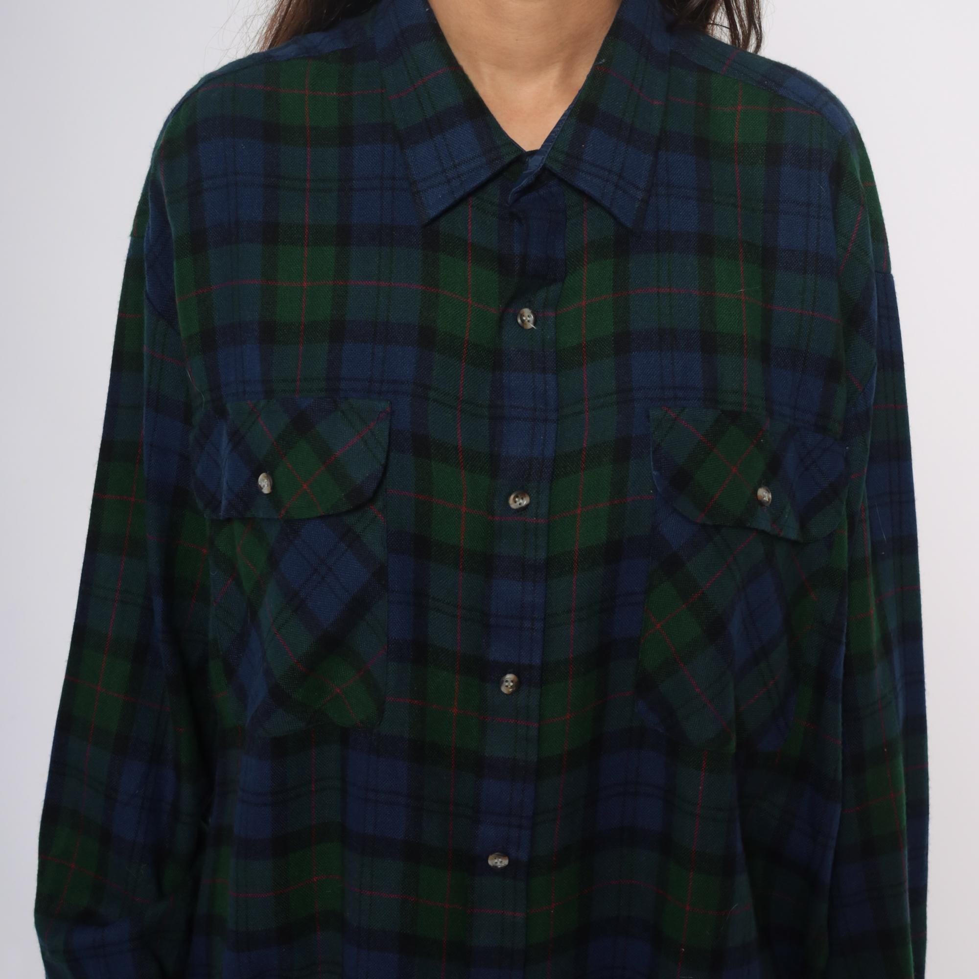 90s blue and green tartan plaid shirt from northwest territory with navy, dark green, black, and red accent lines throughout. Pointed collar, button front closure, long sleeves, two chest pockets with button flaps.