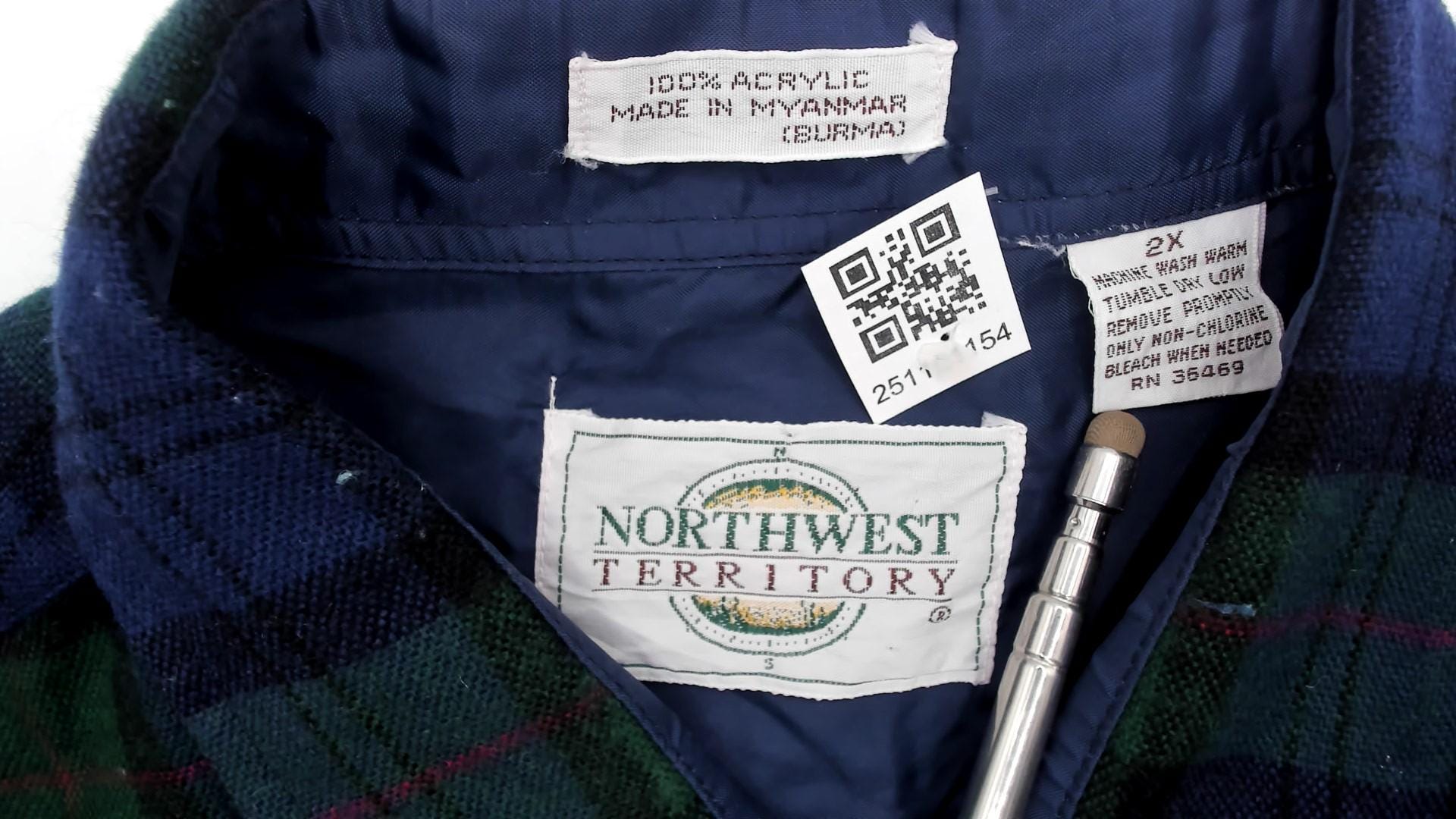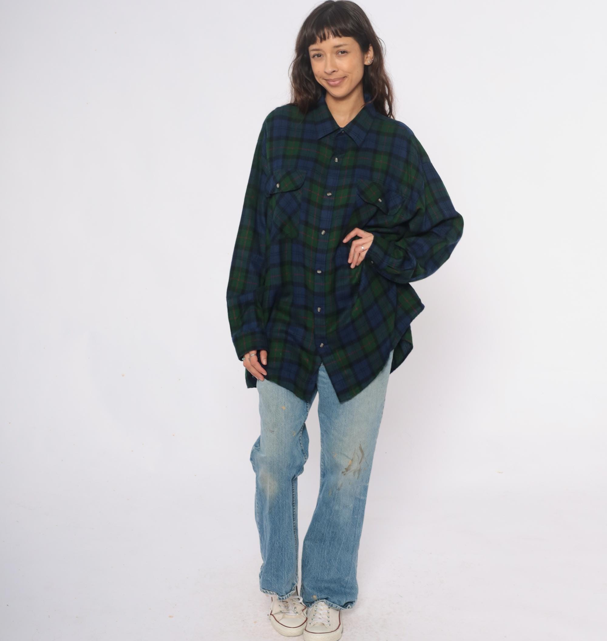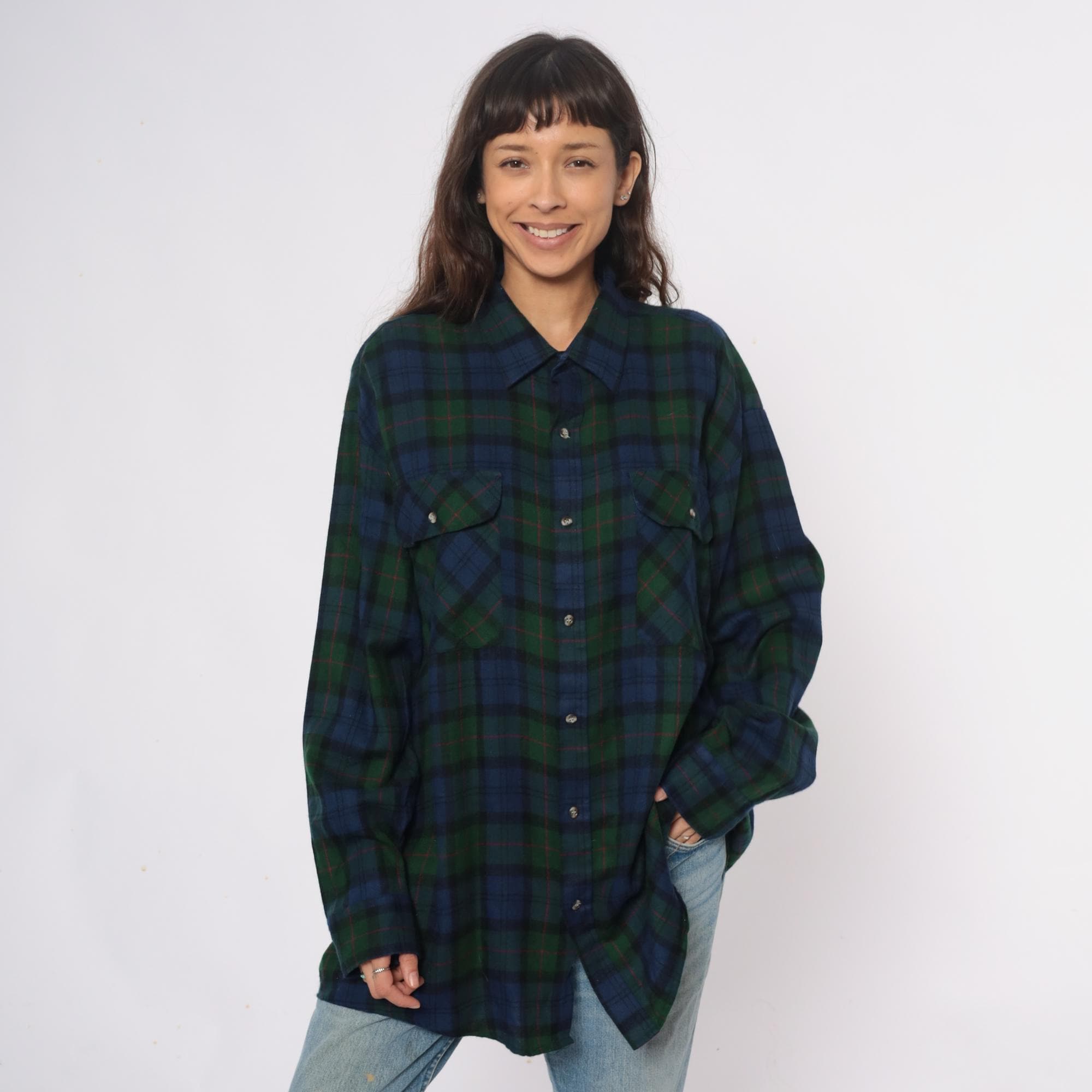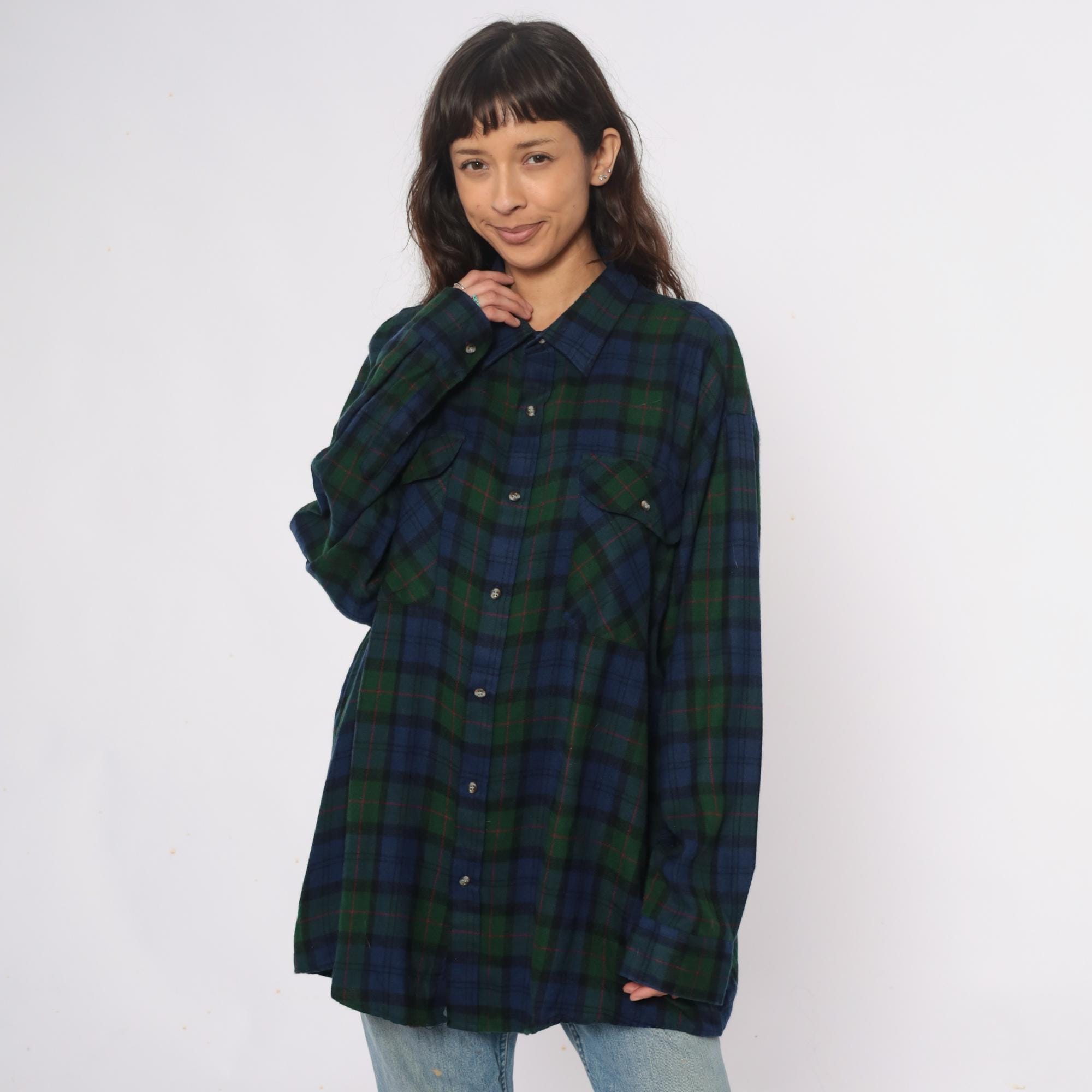 90s blue and green tartan plaid shirt from northwest territory with navy, dark green, black, and red accent lines throughout. Pointed collar, button front closure, long sleeves, two chest pockets with button flaps.
