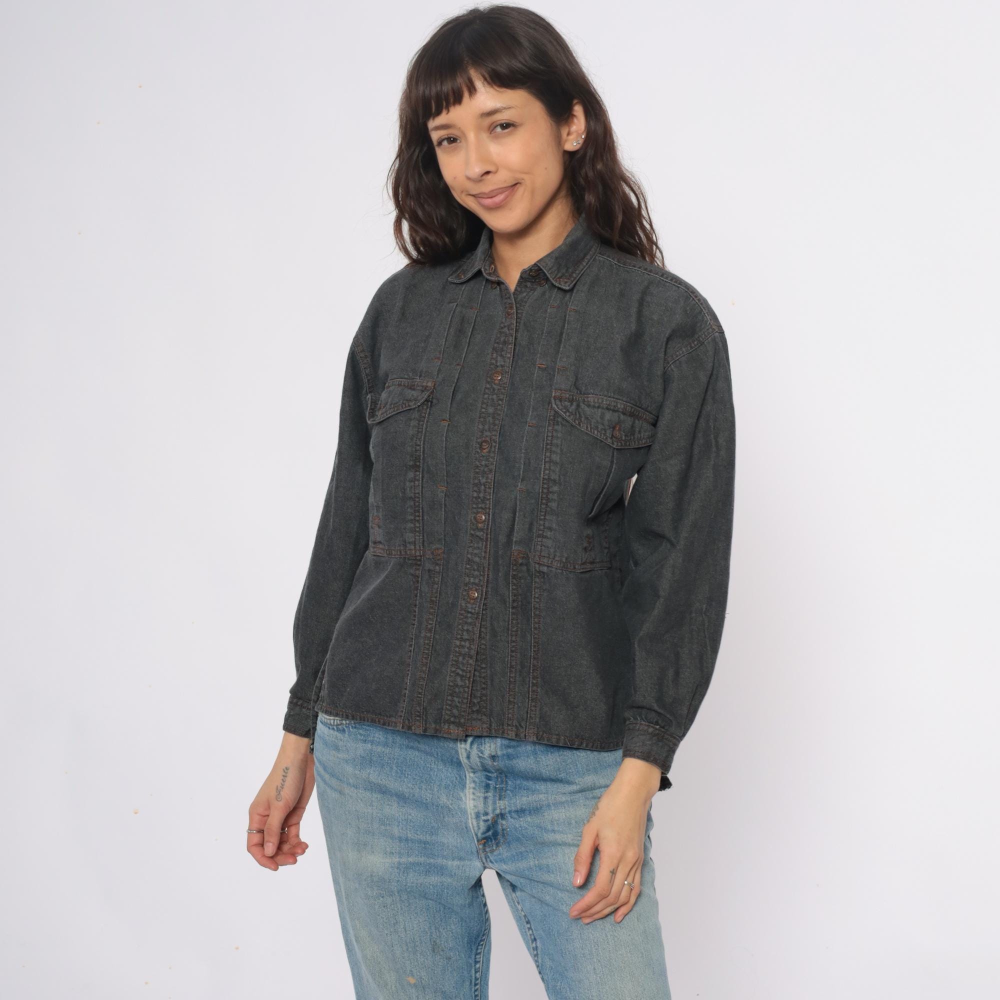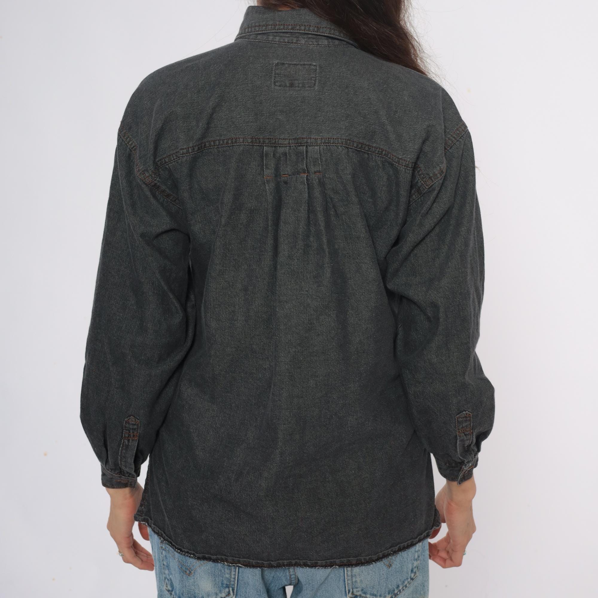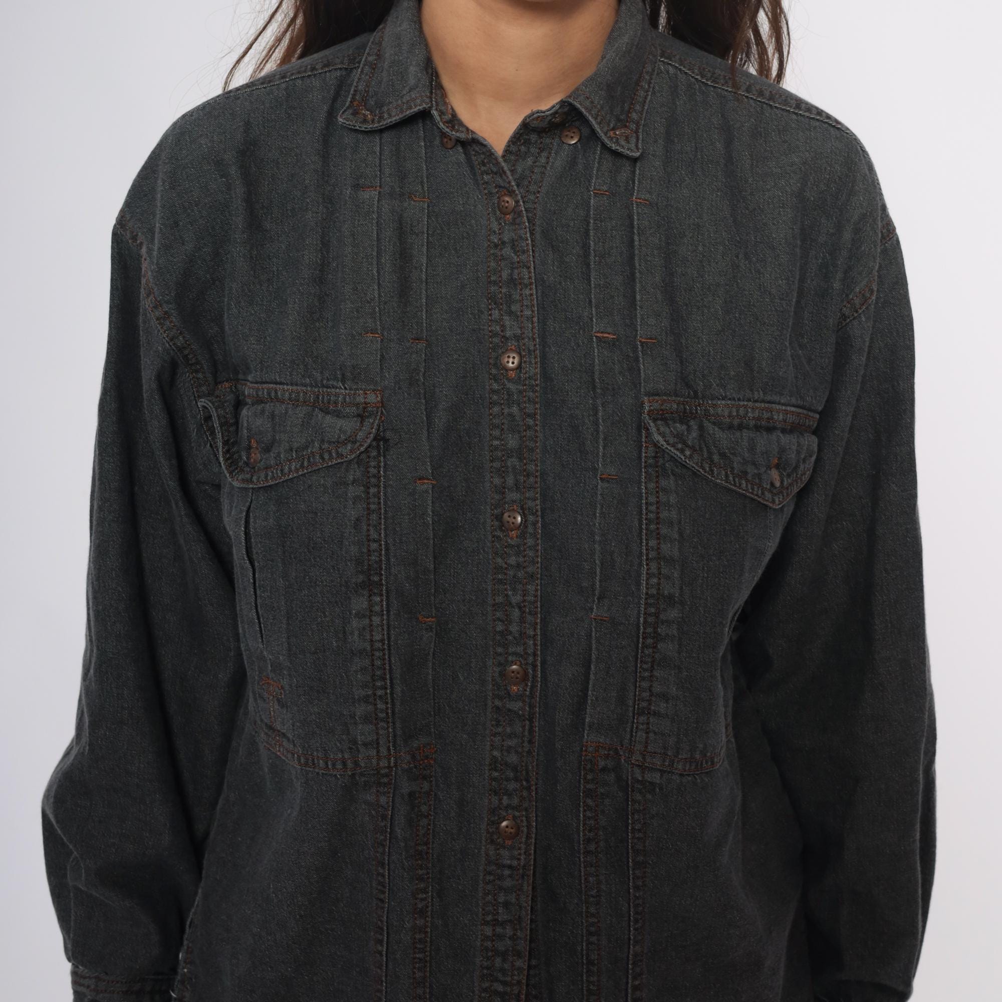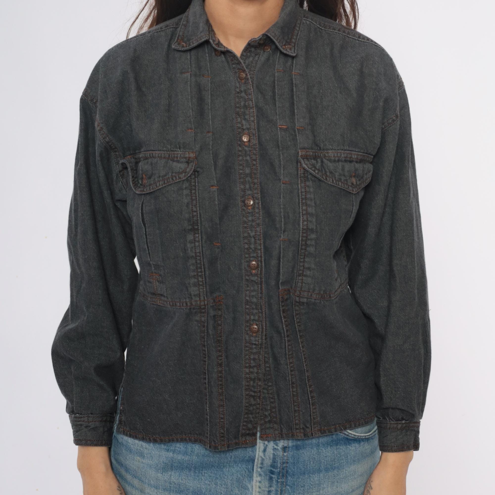 90s dark grey denim shirt with long sleeves, point collar, and button front closure with brown buttons. Two chest pockets with button flap closures, decorative pintuck-style stitching down the front, and topstitched back yoke detail.