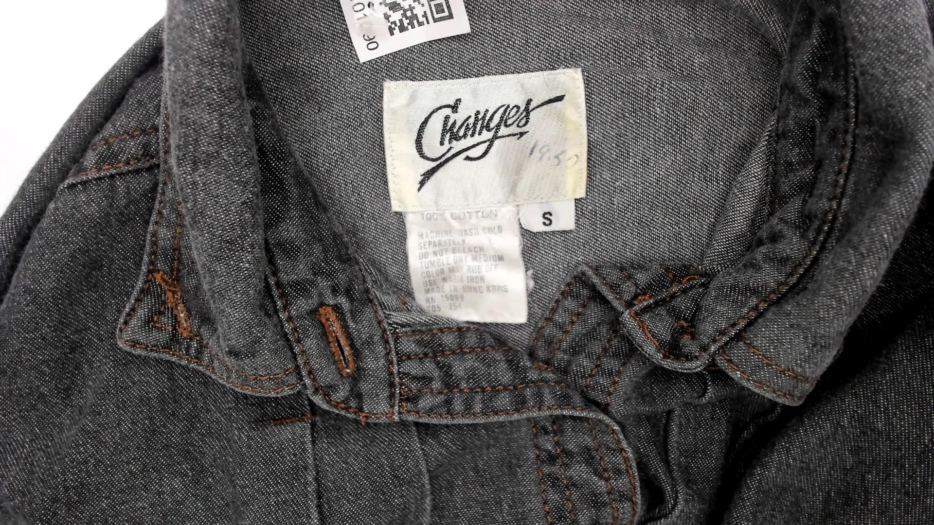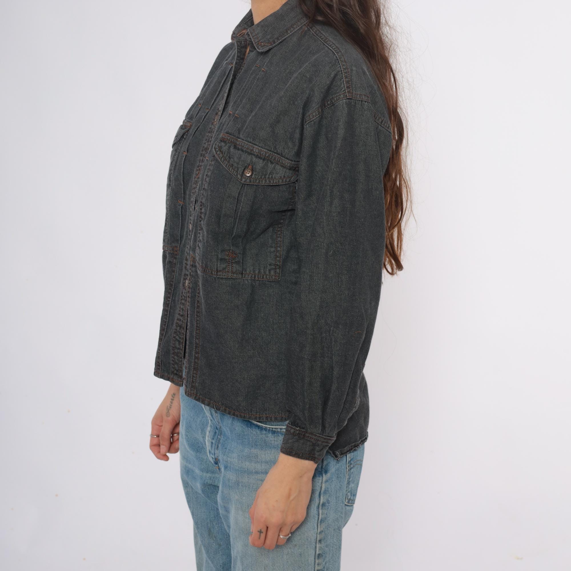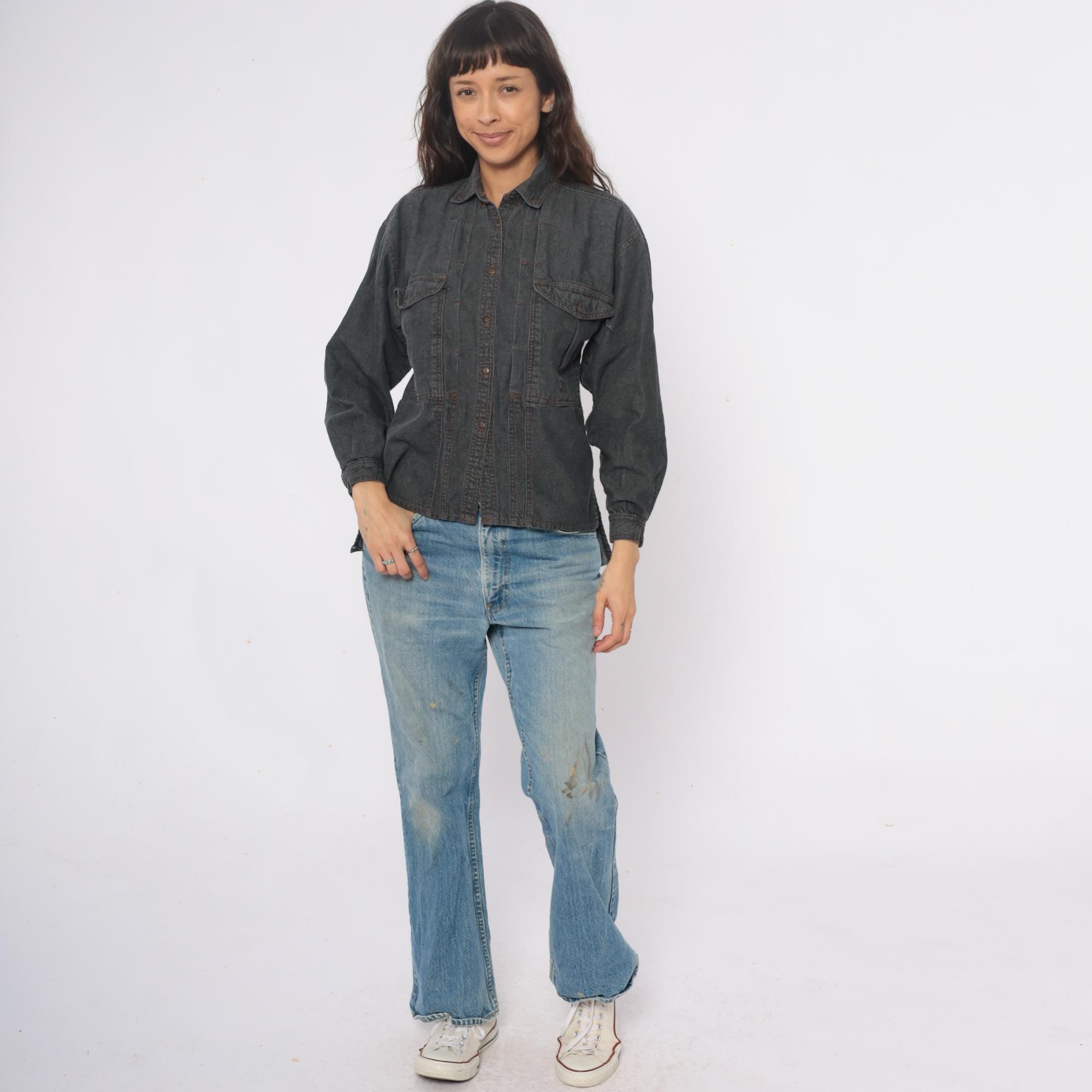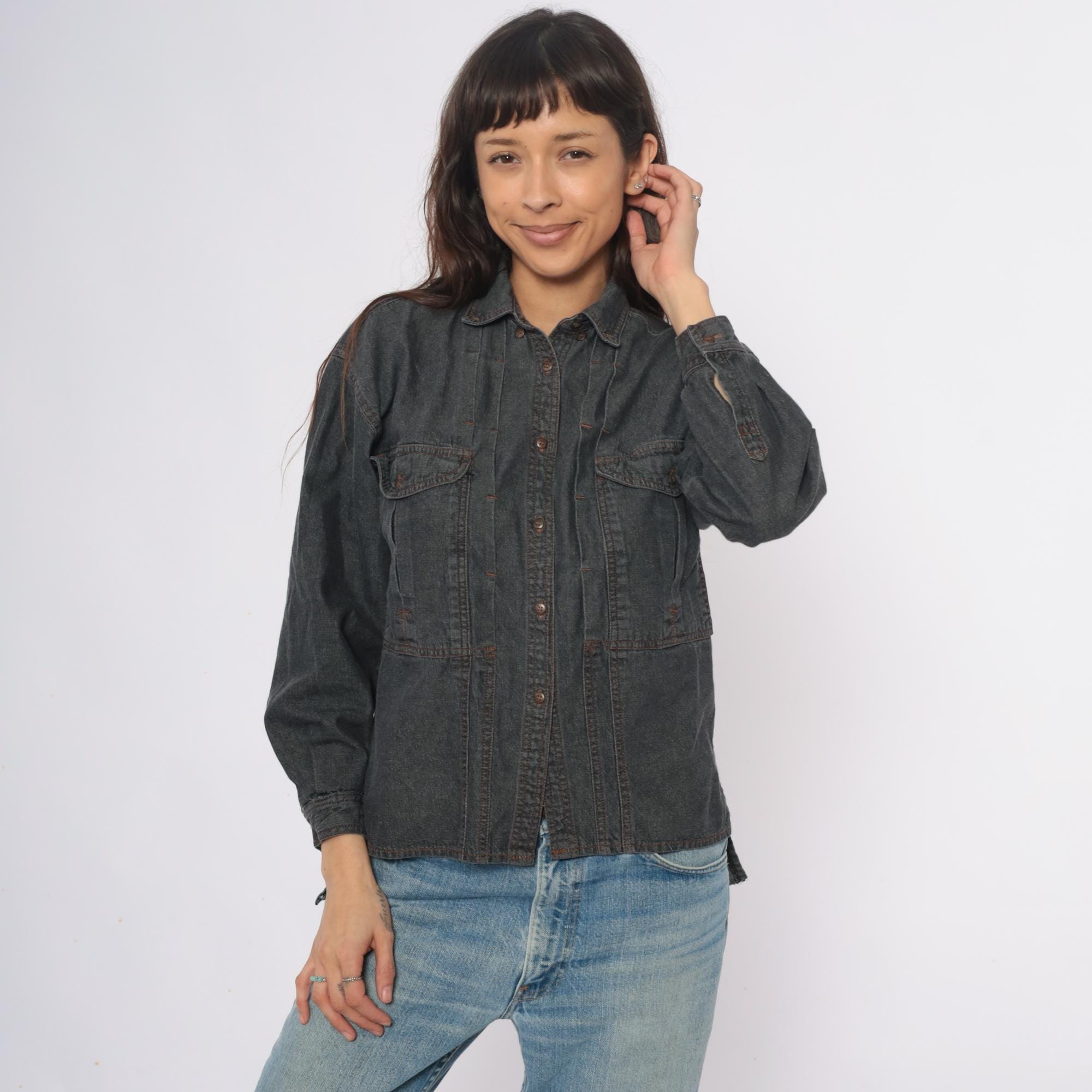 90s dark grey denim shirt with long sleeves, point collar, and button front closure with brown buttons. Two chest pockets with button flap closures, decorative pintuck-style stitching down the front, and topstitched back yoke detail.