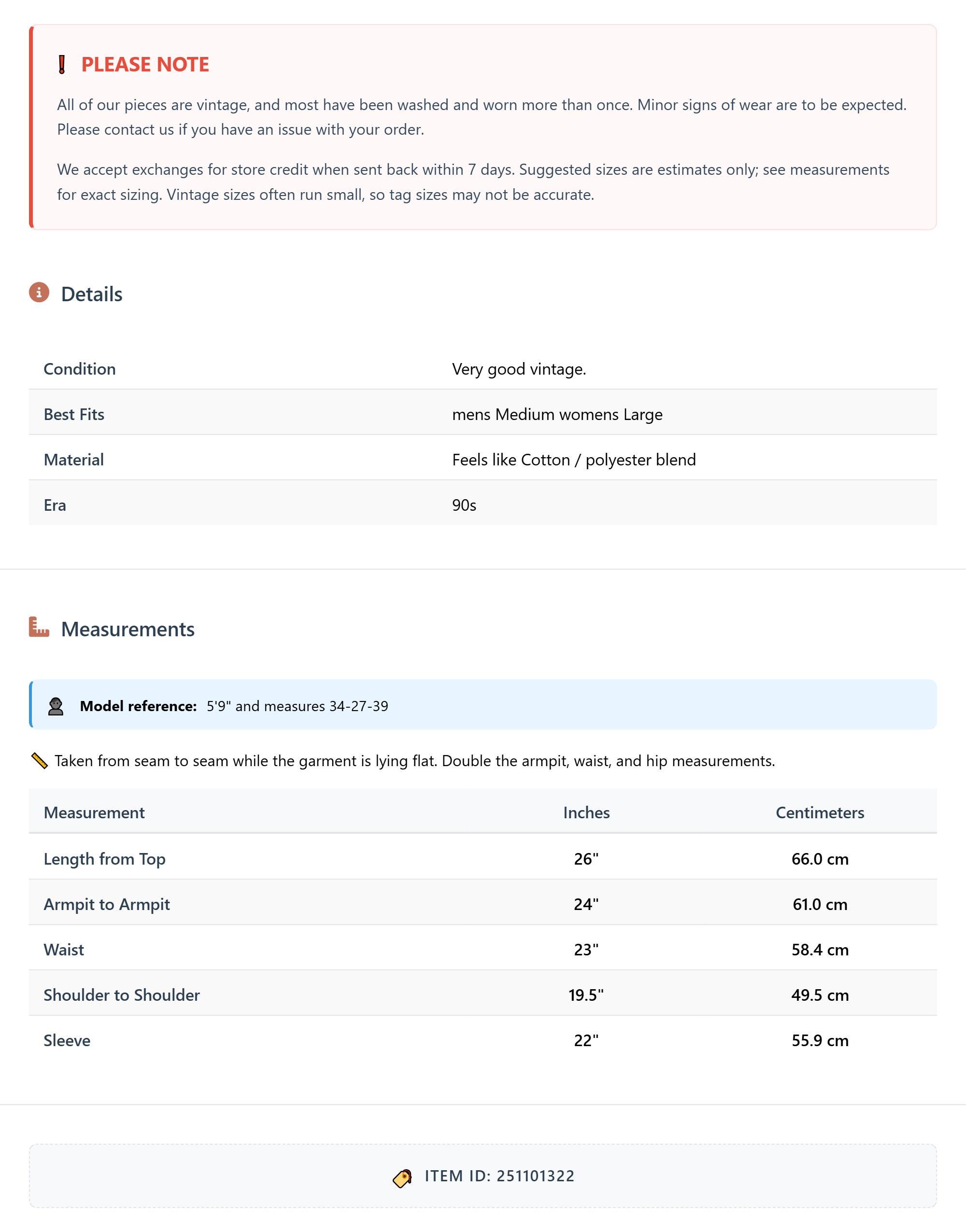 Suggested sizes are estimates only; see measurements for exact sizing. Vintage sizes often run small, so tag sizes may not be accurate.