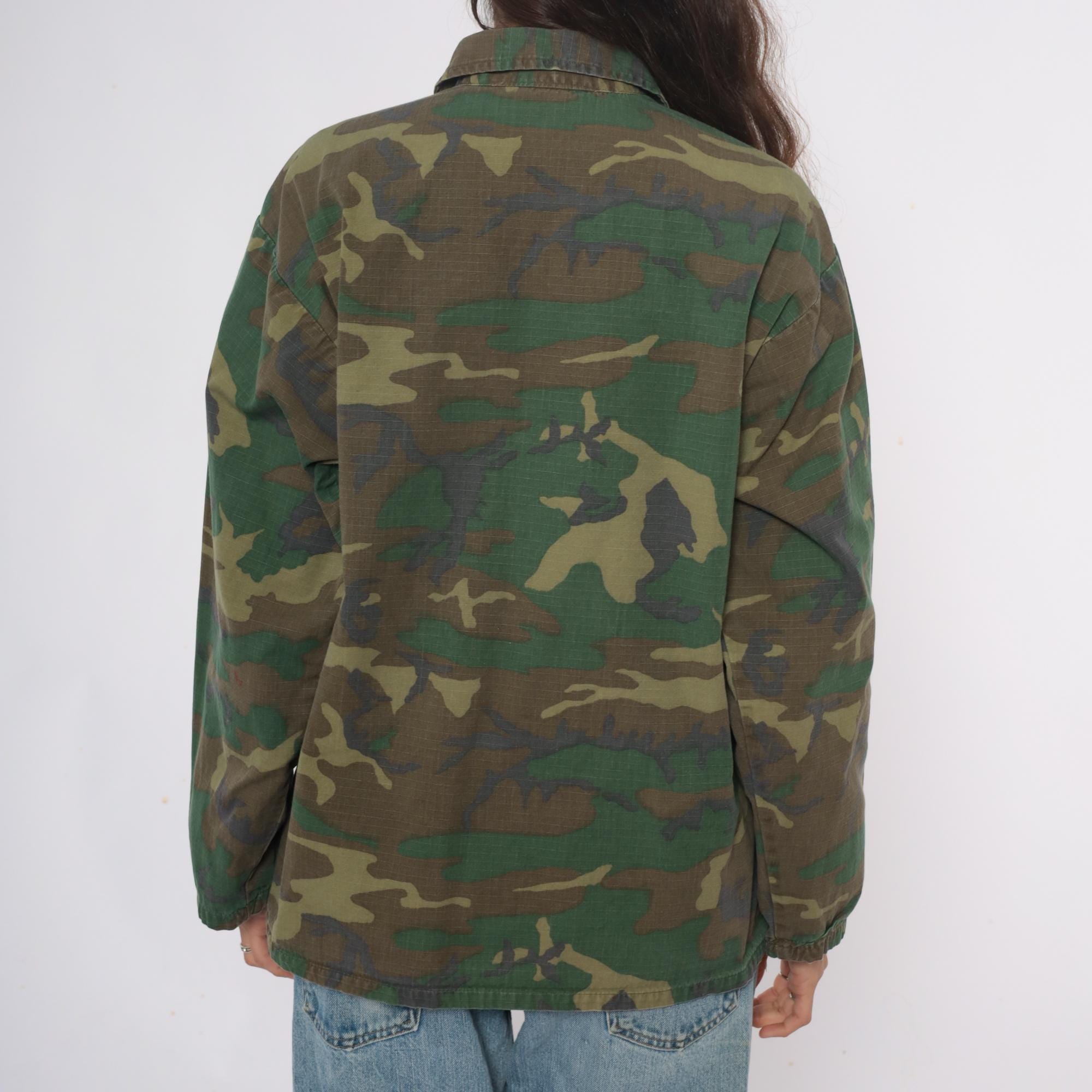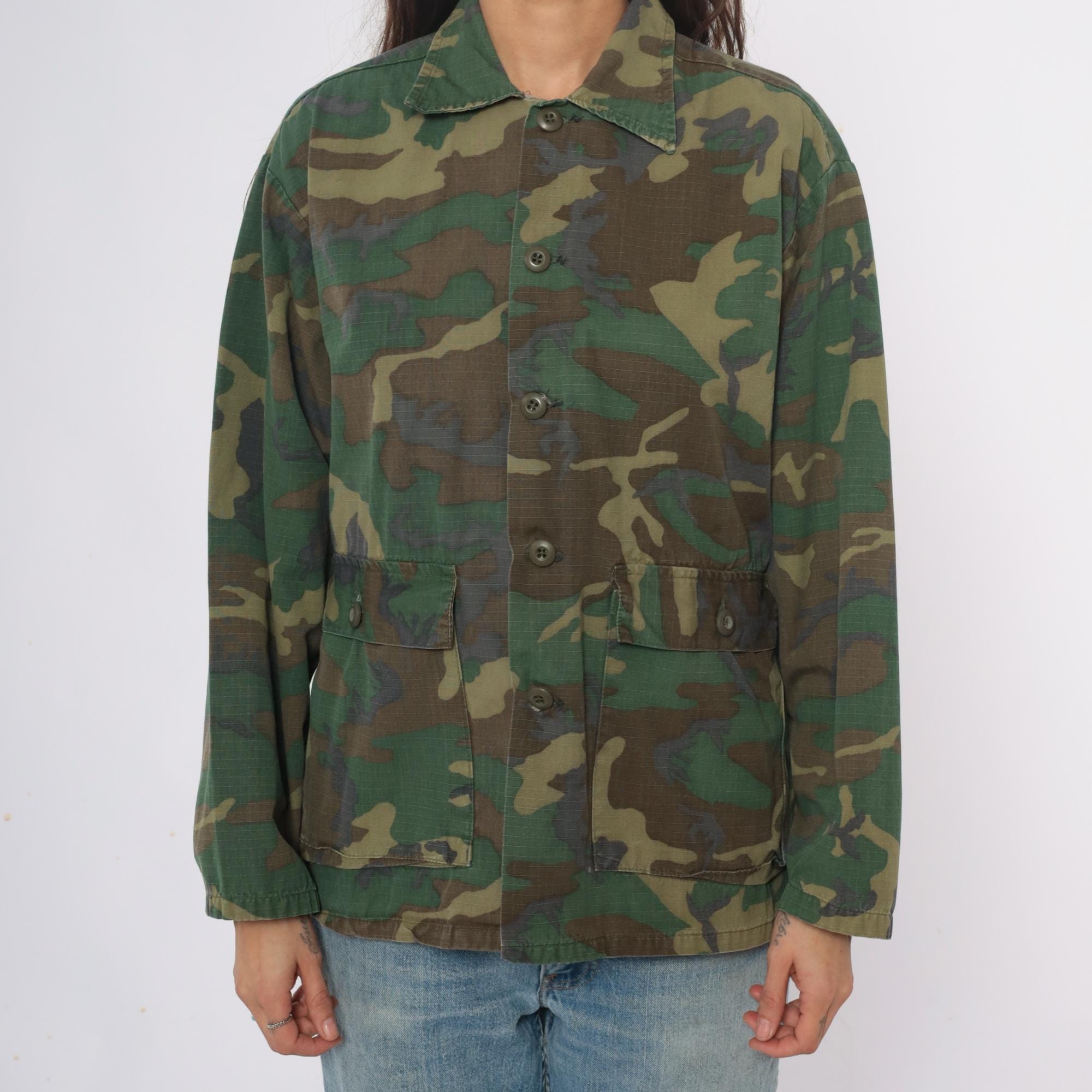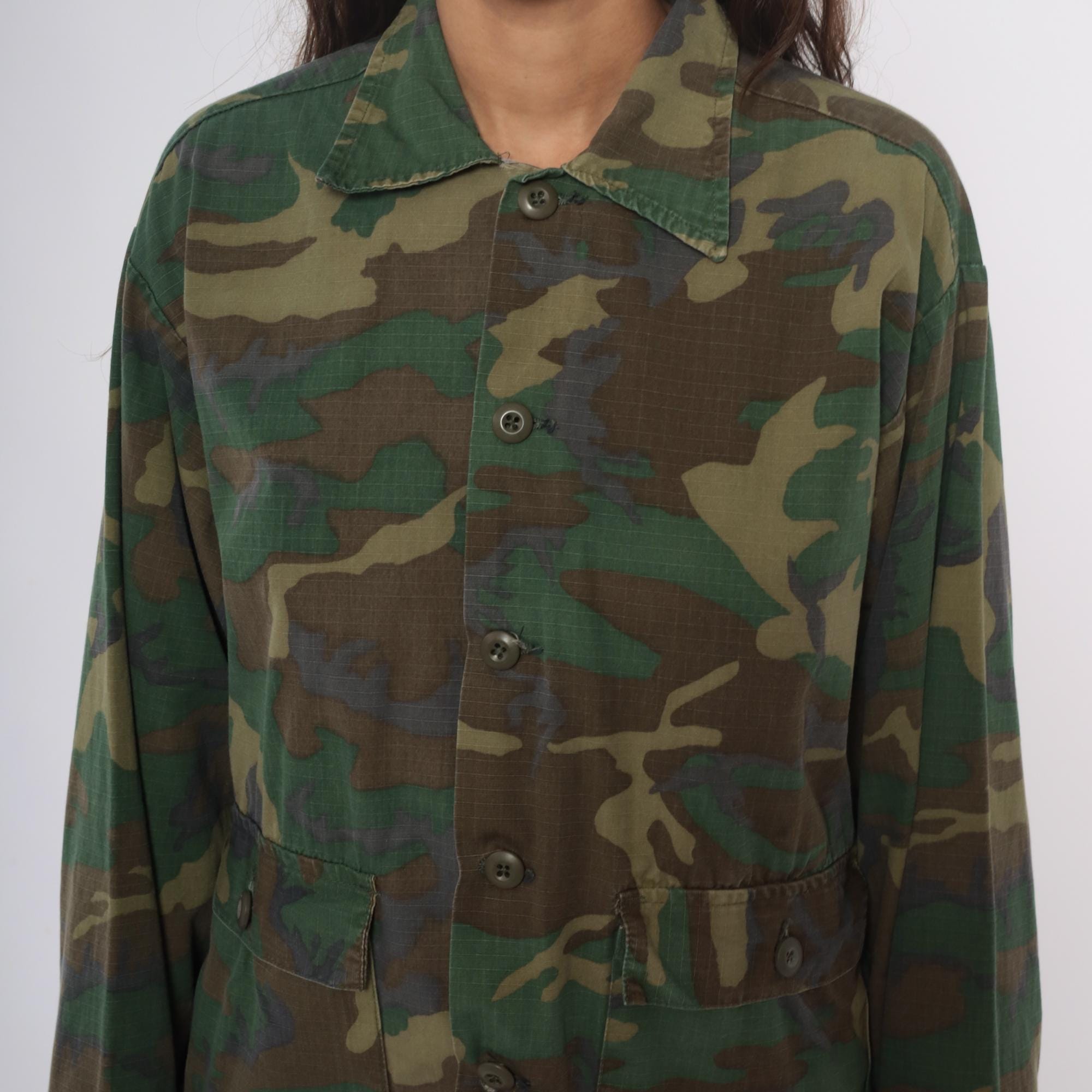 90s woodland camouflage jacket in green, brown, tan, and black print. Button front closure with pointed collar, long sleeves, two chest pockets with button flaps, and two lower hip pockets. Elastic gathering at waist and cuffs.