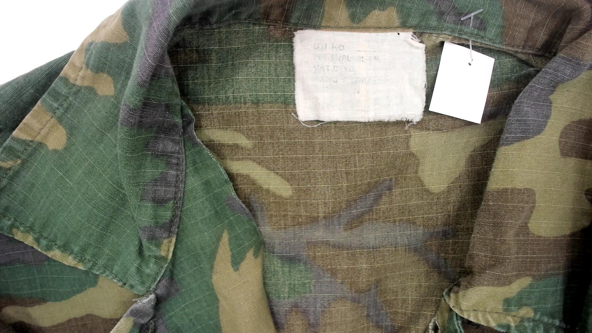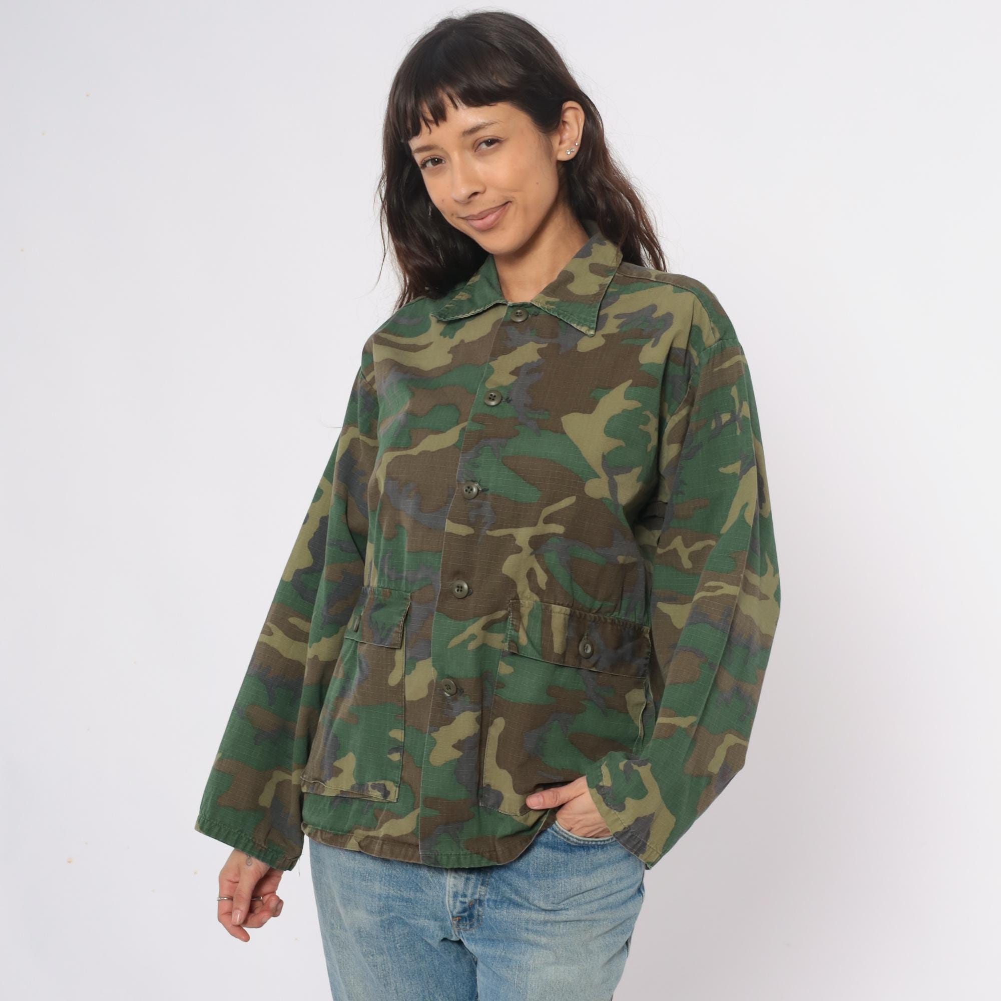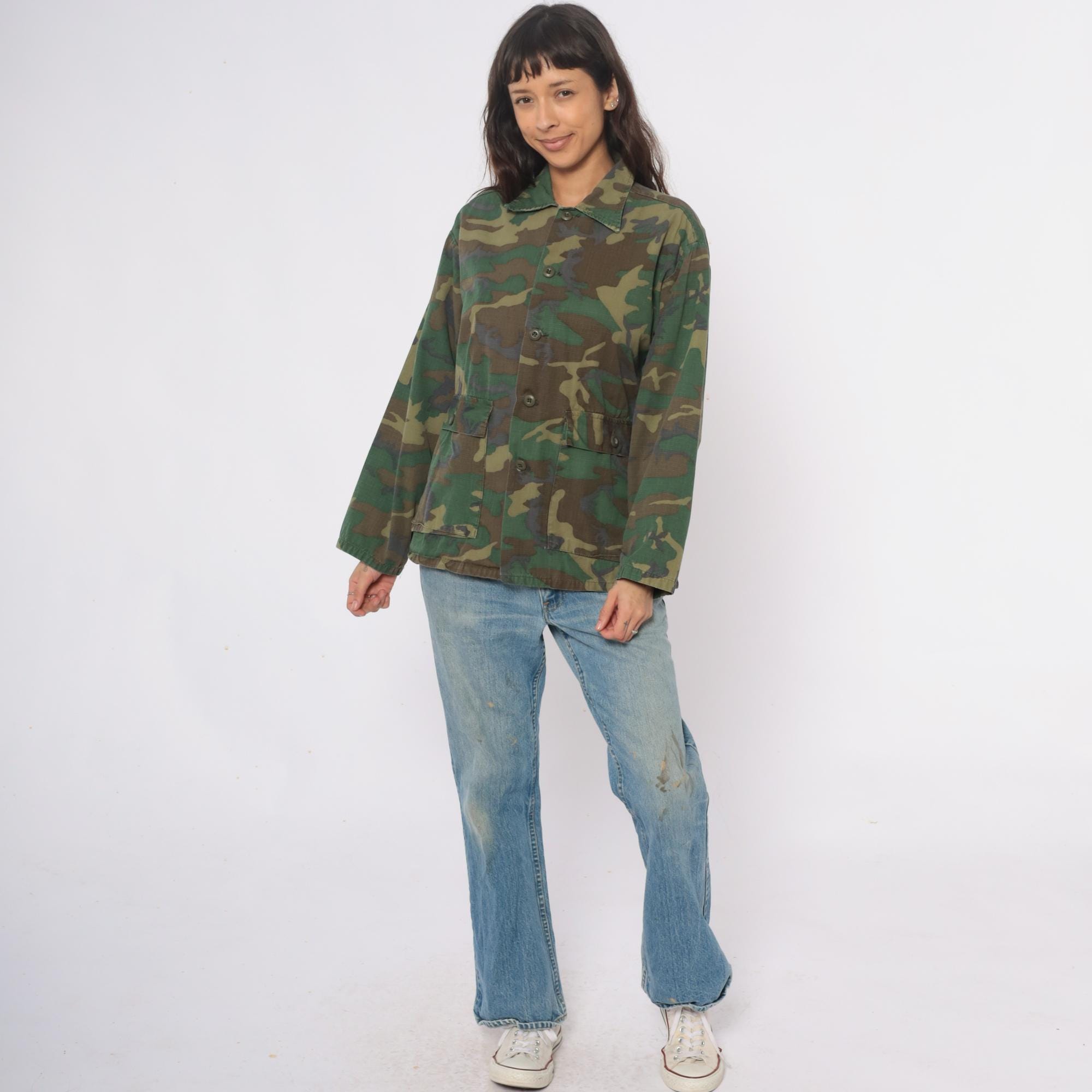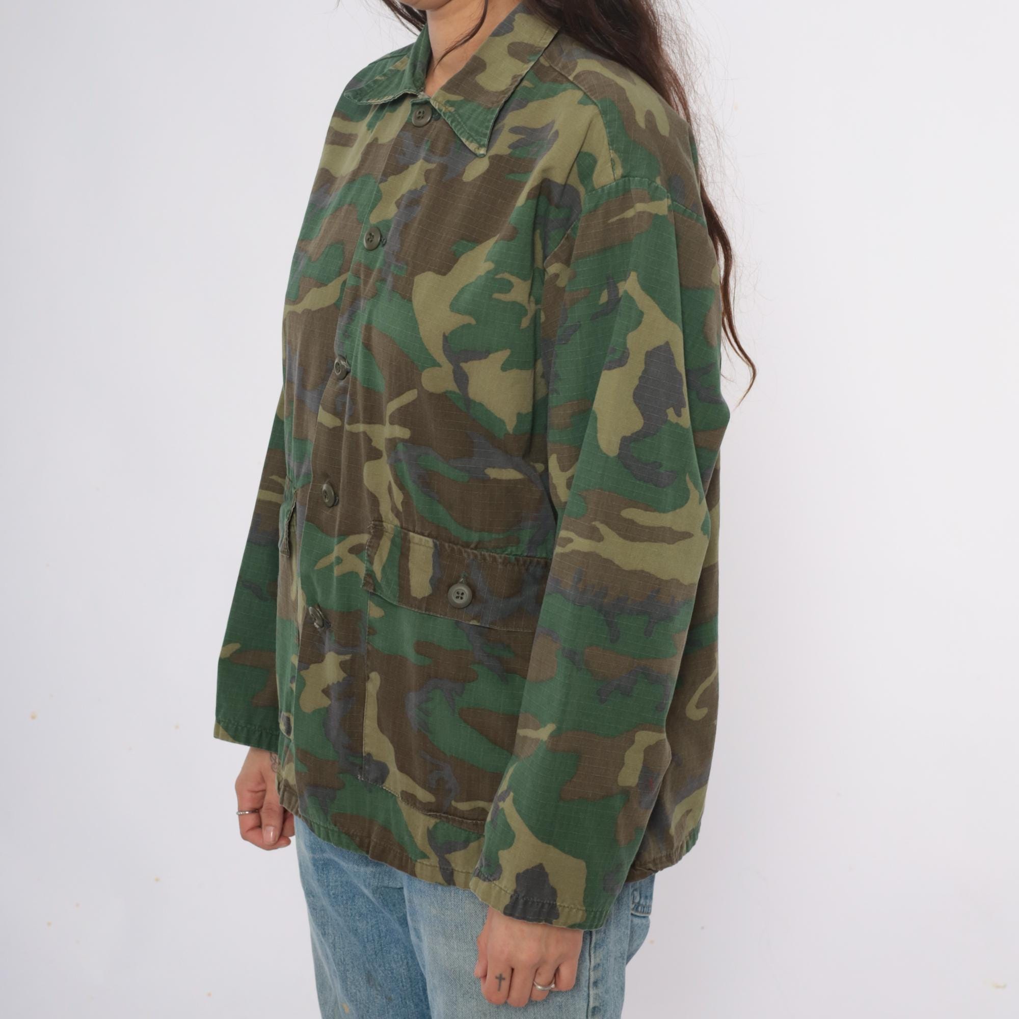 90s woodland camouflage jacket in green, brown, tan, and black print. Button front closure with pointed collar, long sleeves, two chest pockets with button flaps, and two lower hip pockets. Elastic gathering at waist and cuffs.