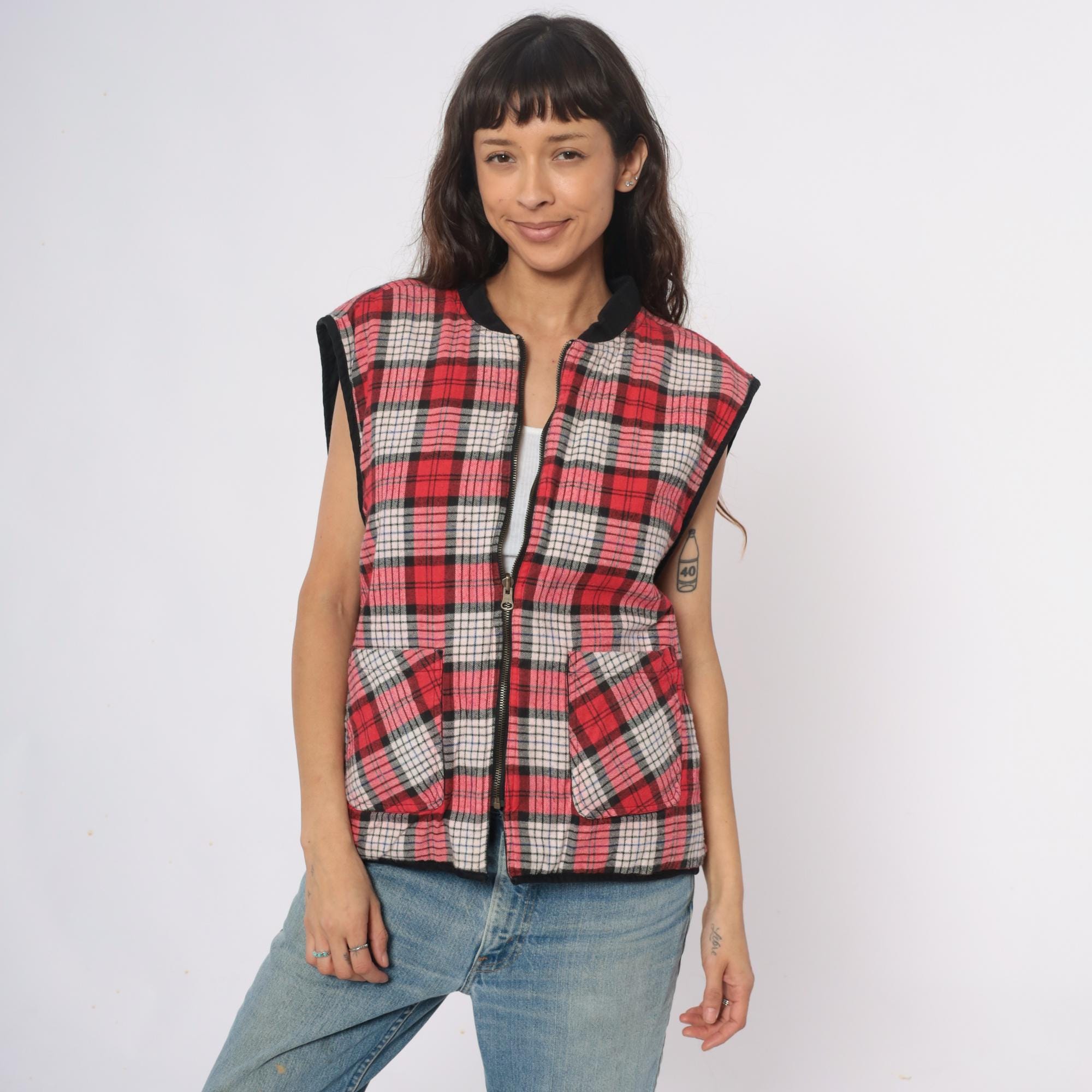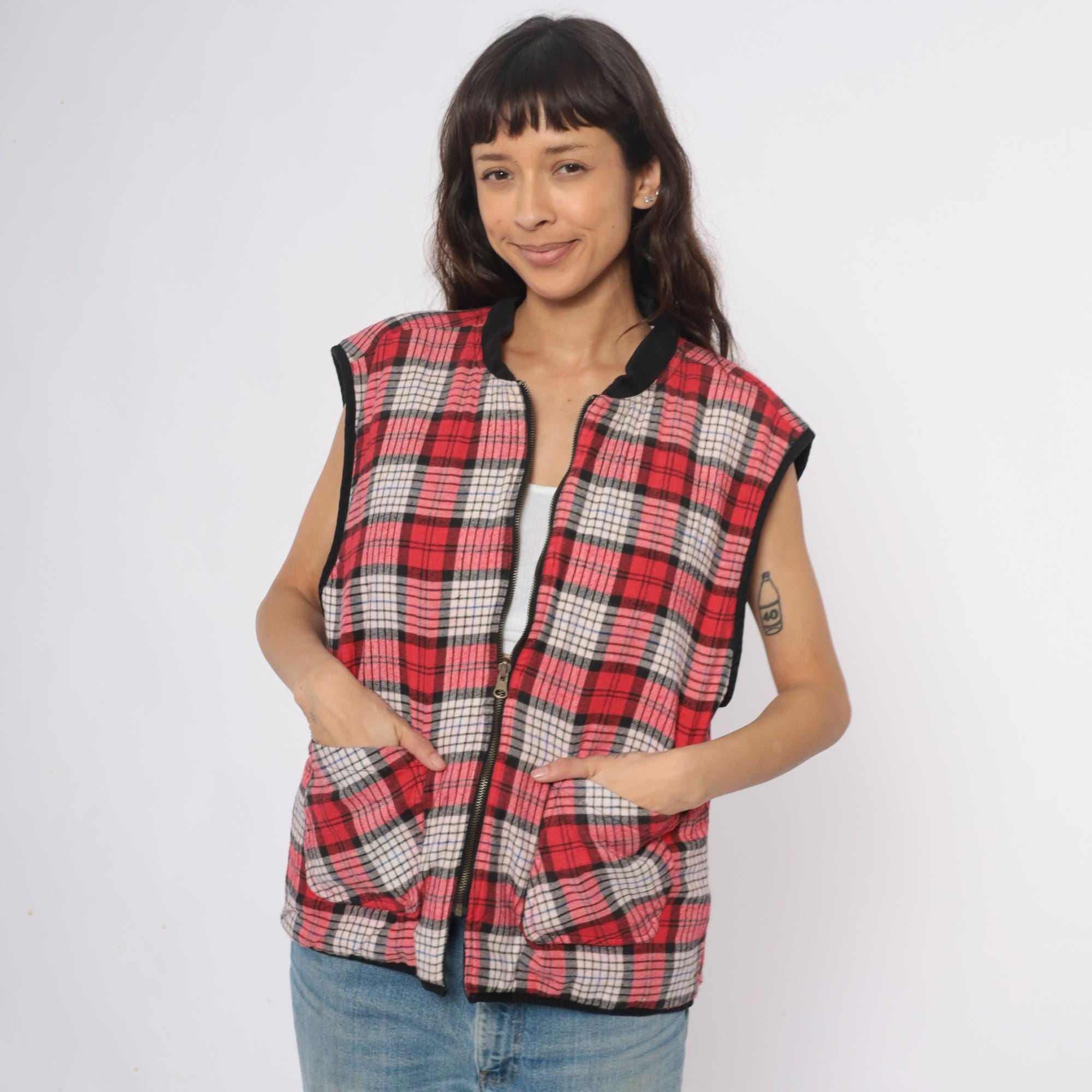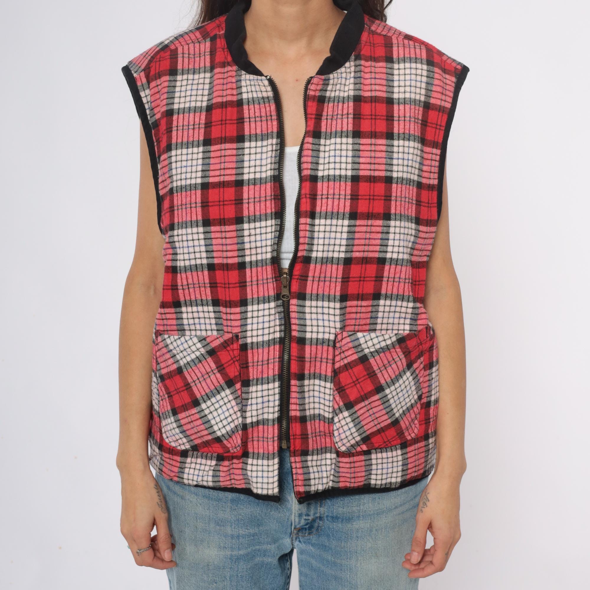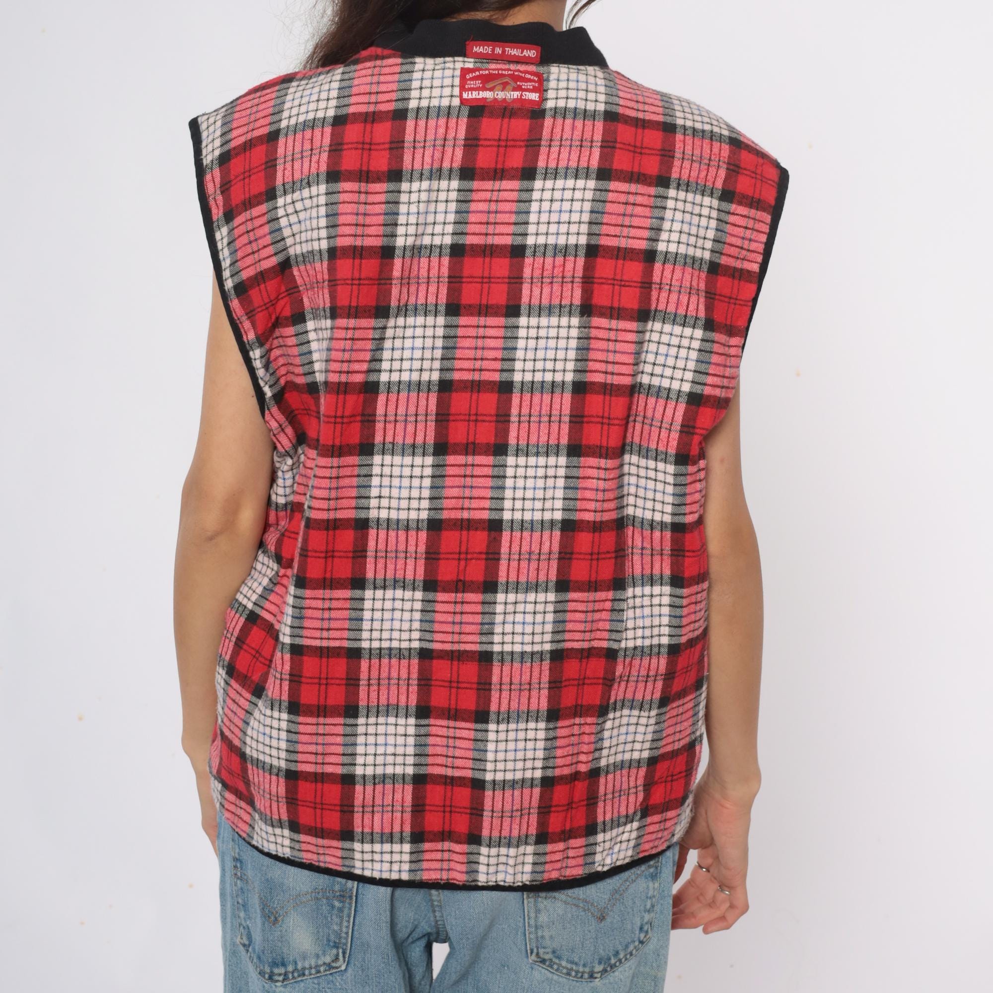 90s reversible zip-front vest from Marlboro Country Store with black side and red, pink, white, and black plaid side. Stand collar, full front zipper closure, and two front pockets on each side.
