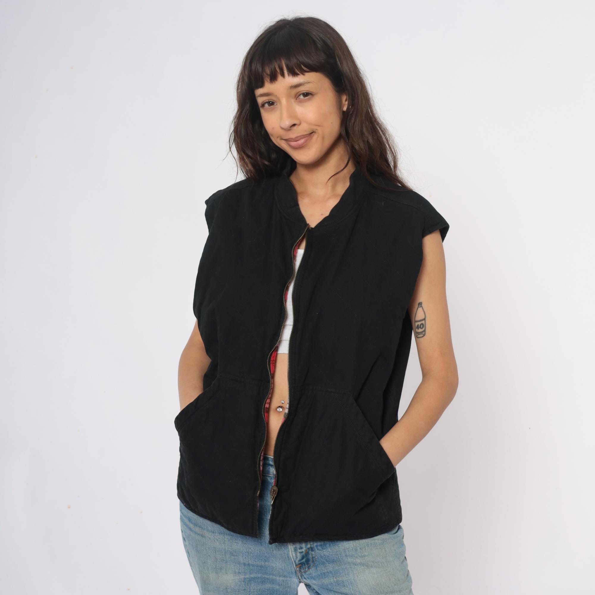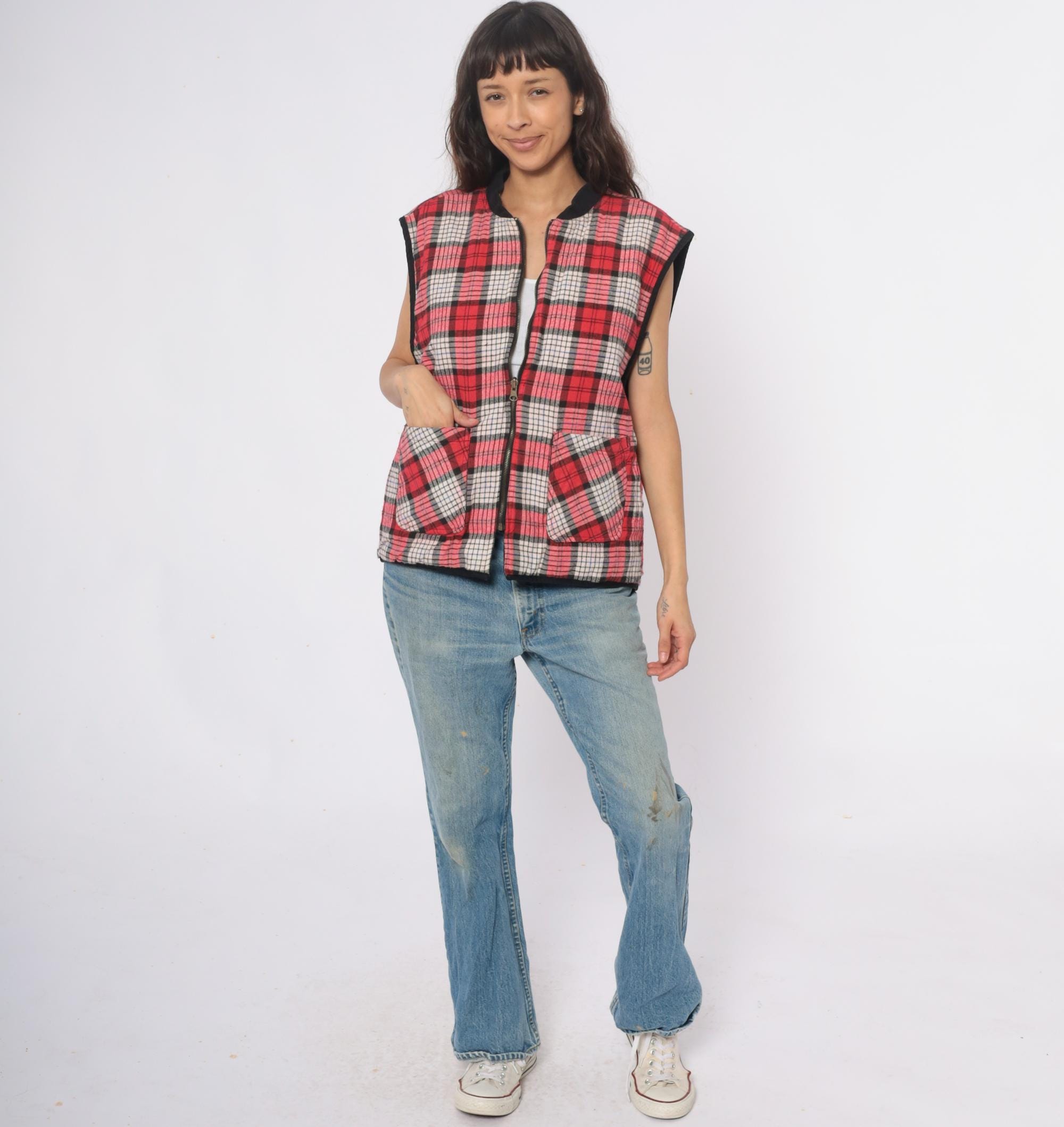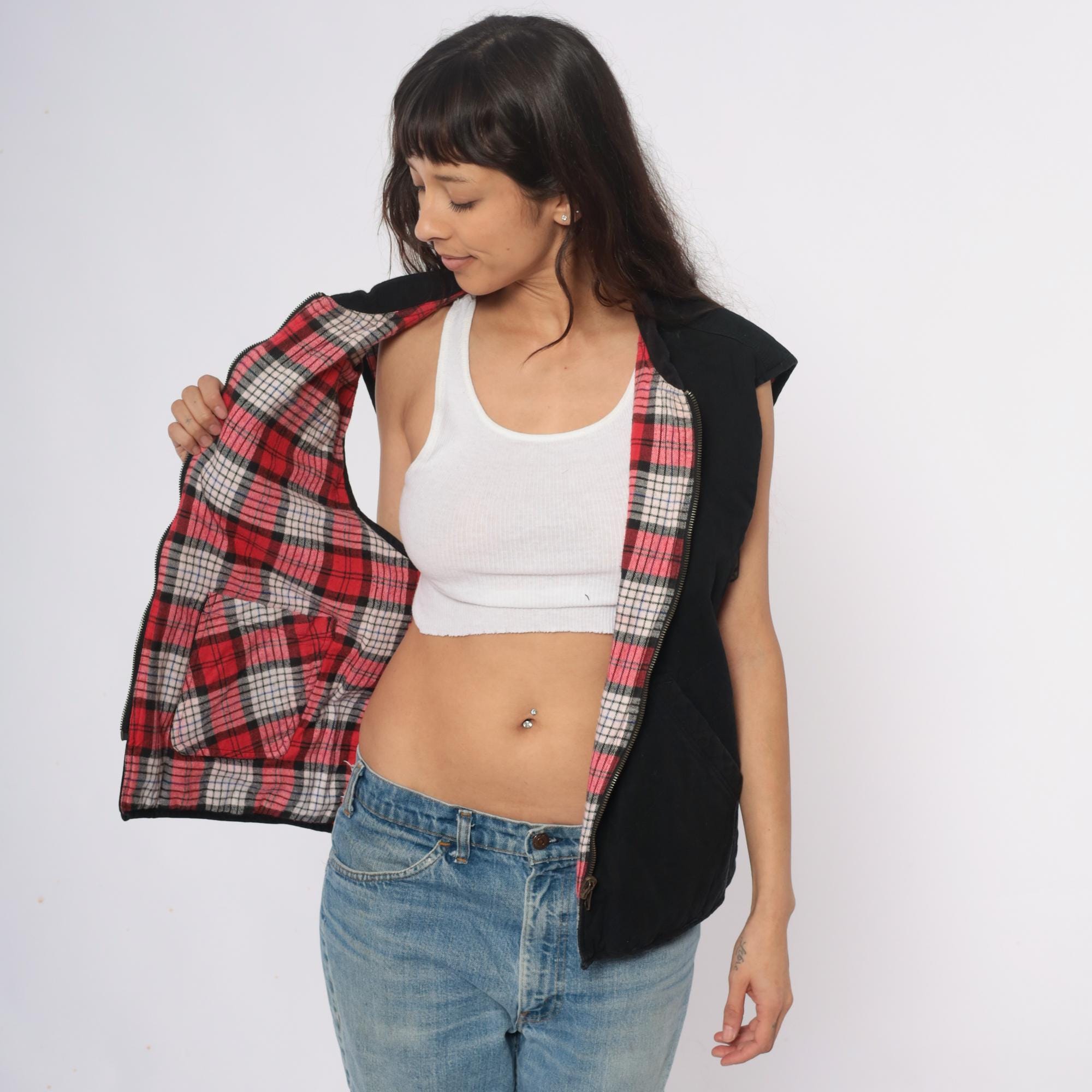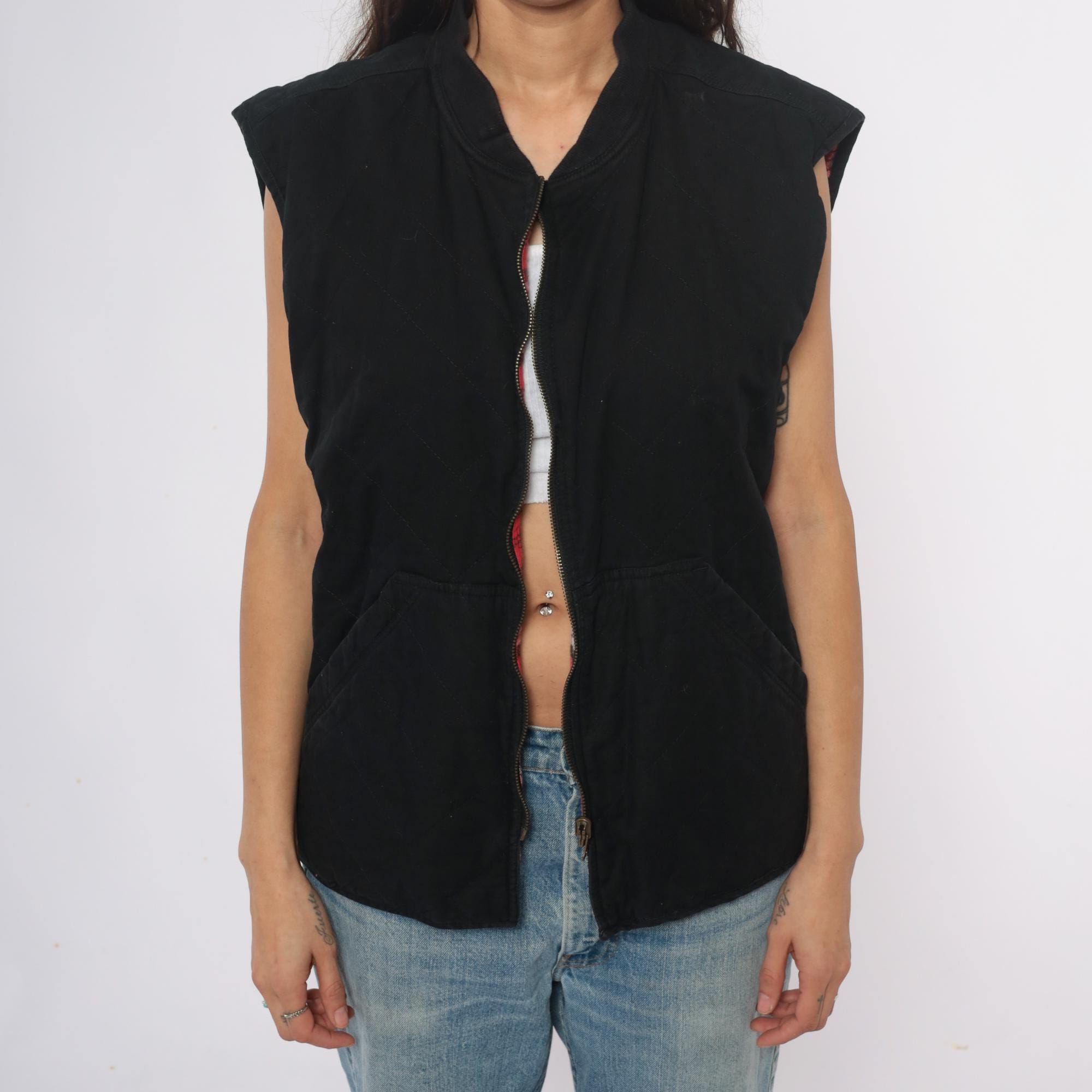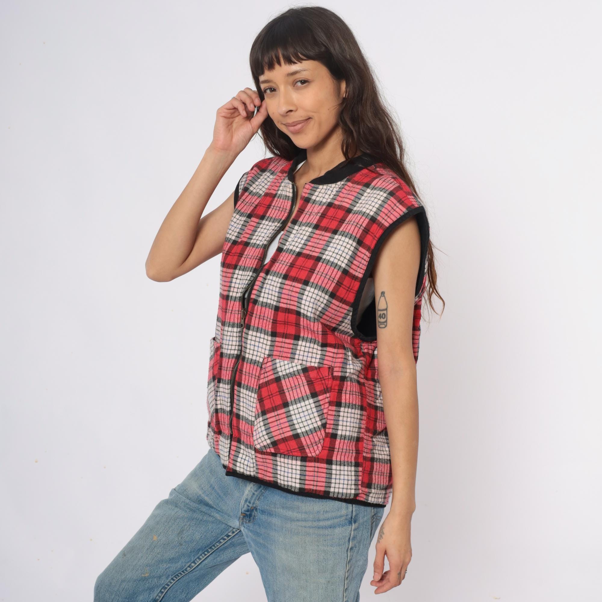 90s reversible zip-front vest from Marlboro Country Store with black side and red, pink, white, and black plaid side. Stand collar, full front zipper closure, and two front pockets on each side.