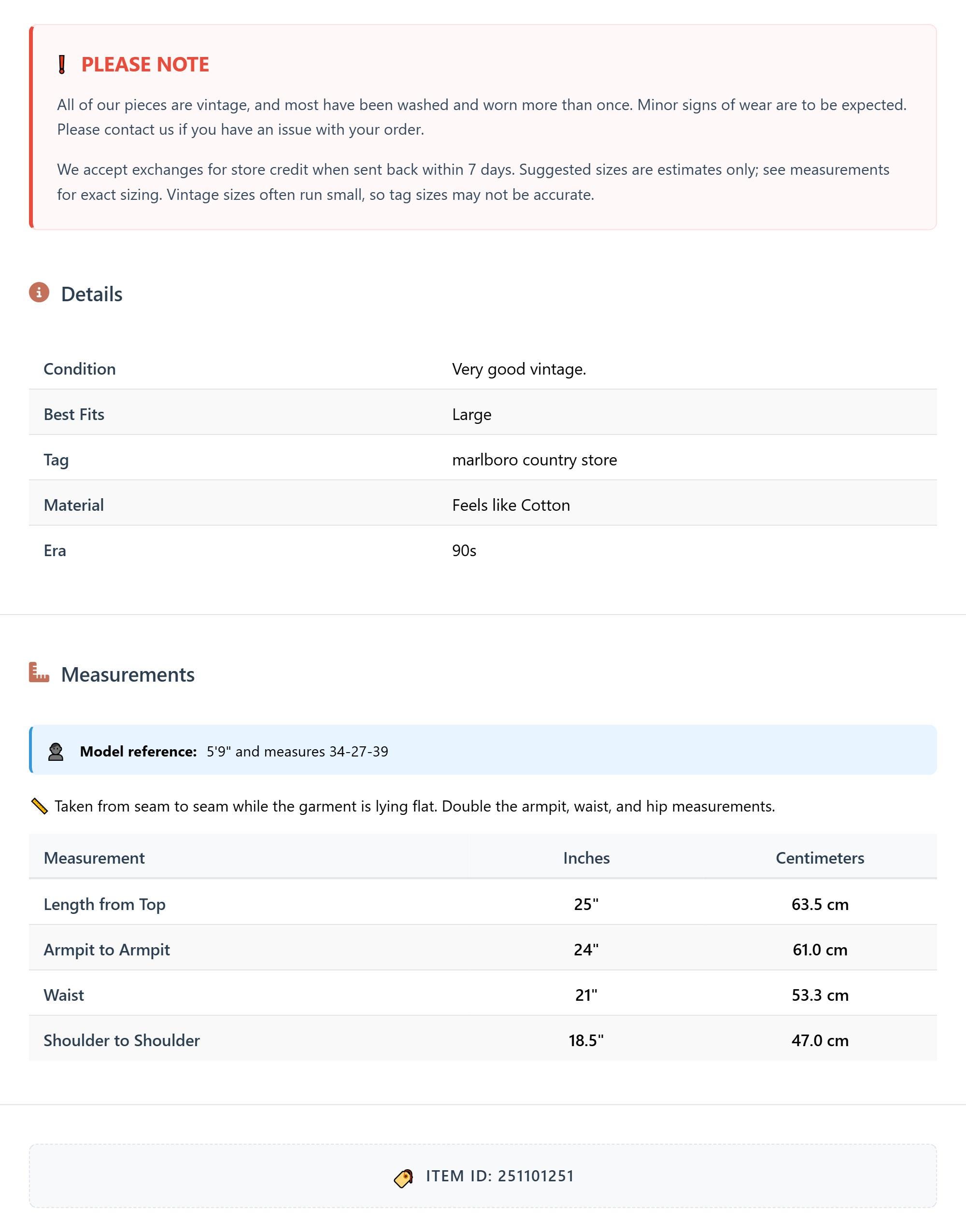 All of our pieces are vintage, and most have been washed and worn more than once. Minor signs of wear are to be expected. Please contact us if you have an issue with your order. We accept exchanges for store credit when sent back within 7 days.