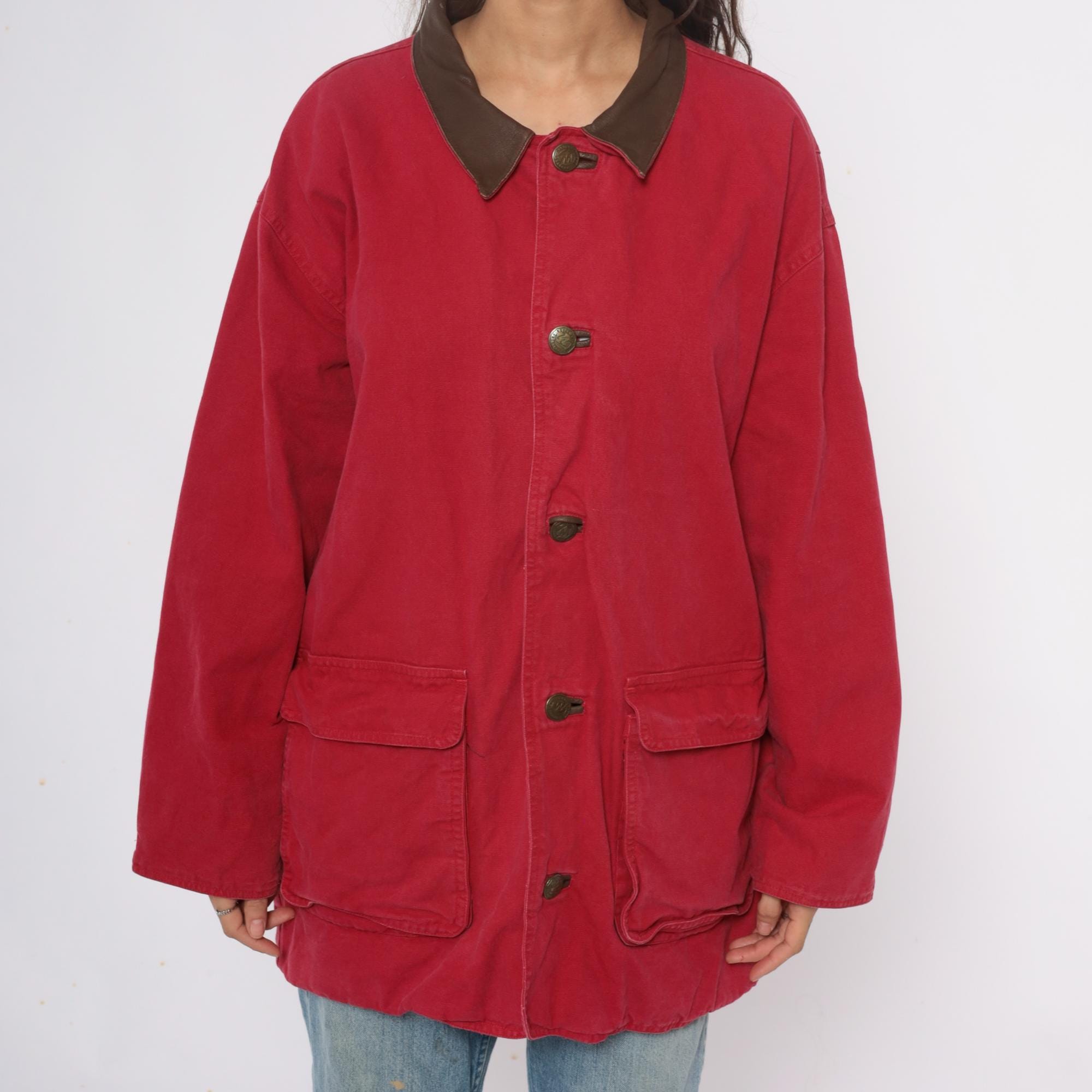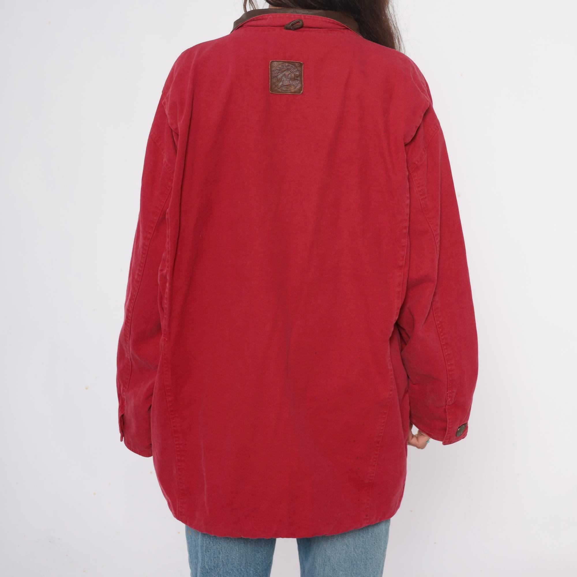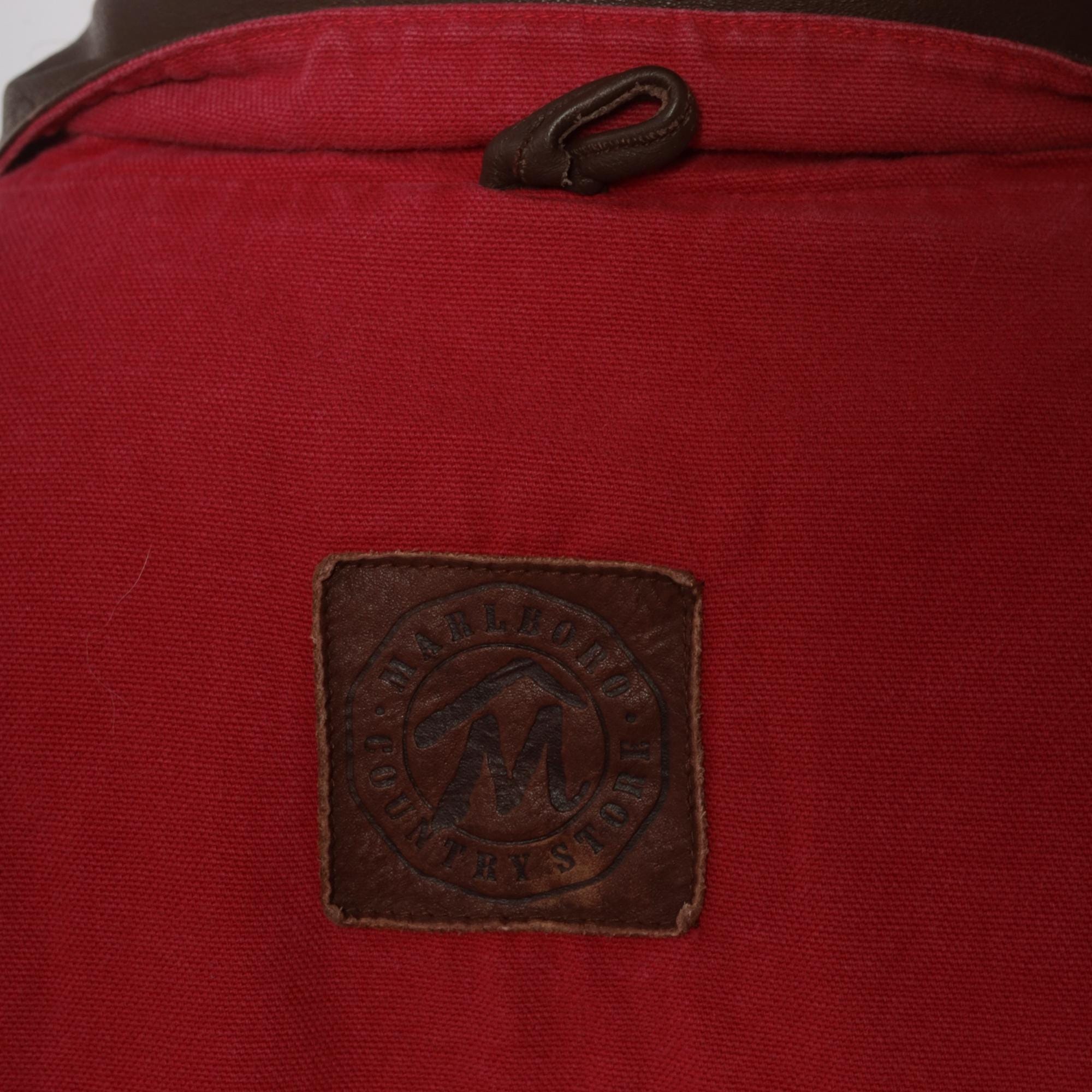 90s red barn jacket from Marlboro with brown leather collar and trim. Button front closure with two large patch pockets at hips, long sleeves with button cuffs, leather logo patch at center back.