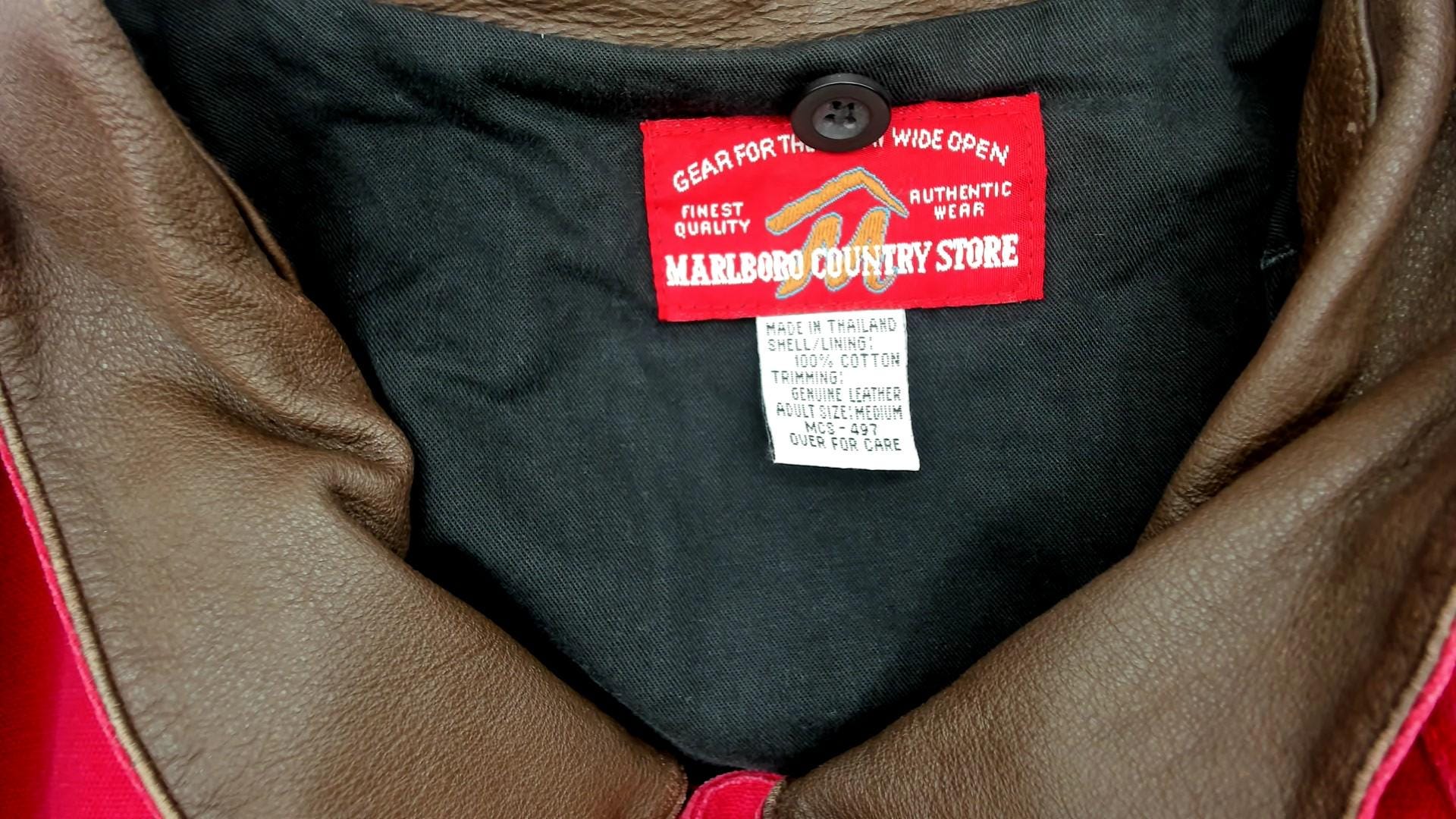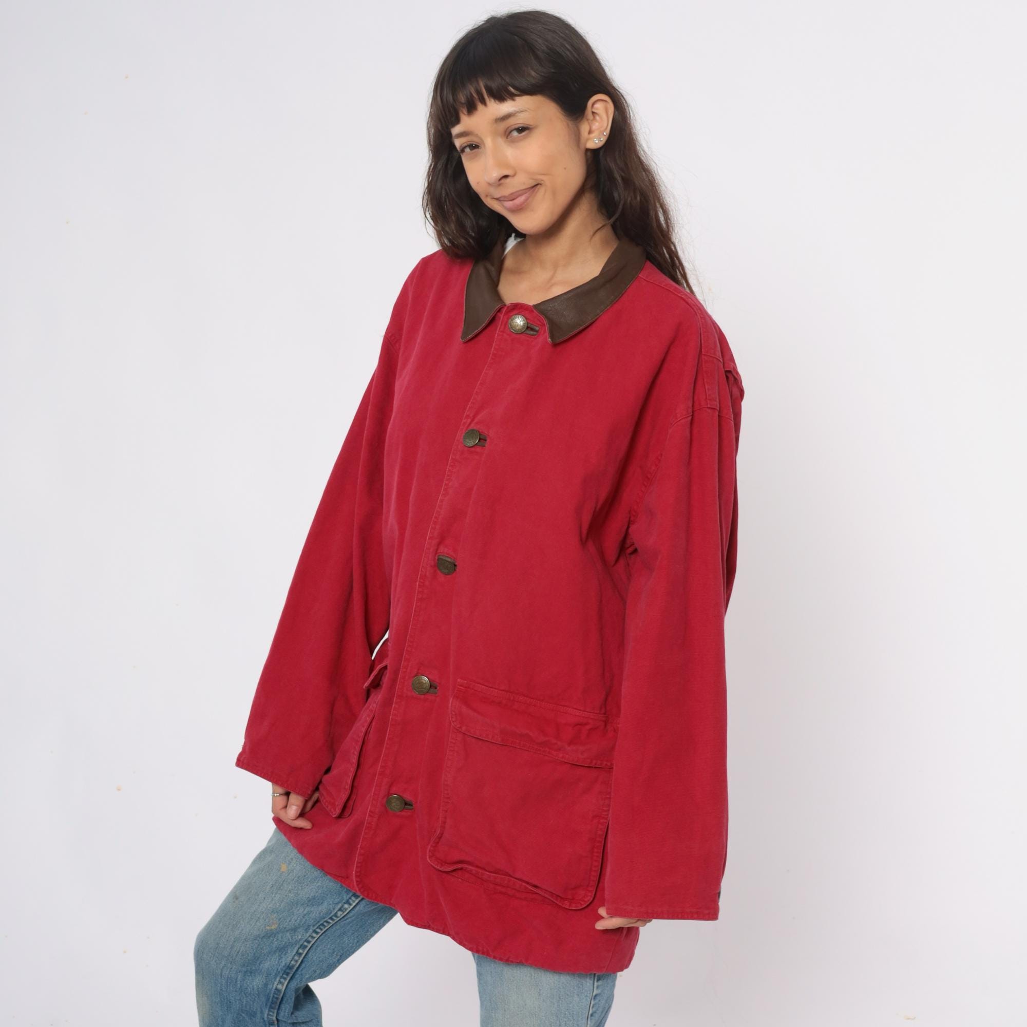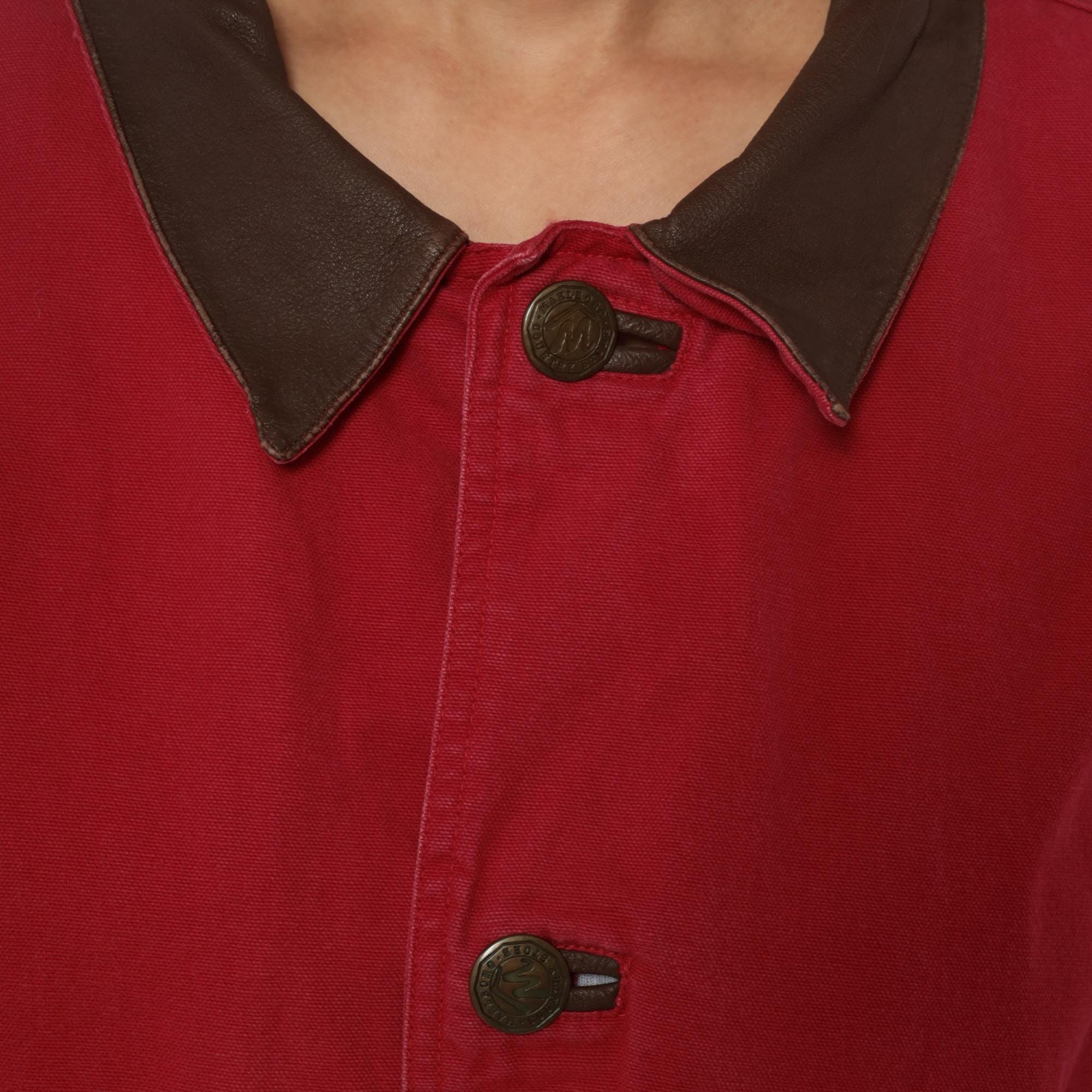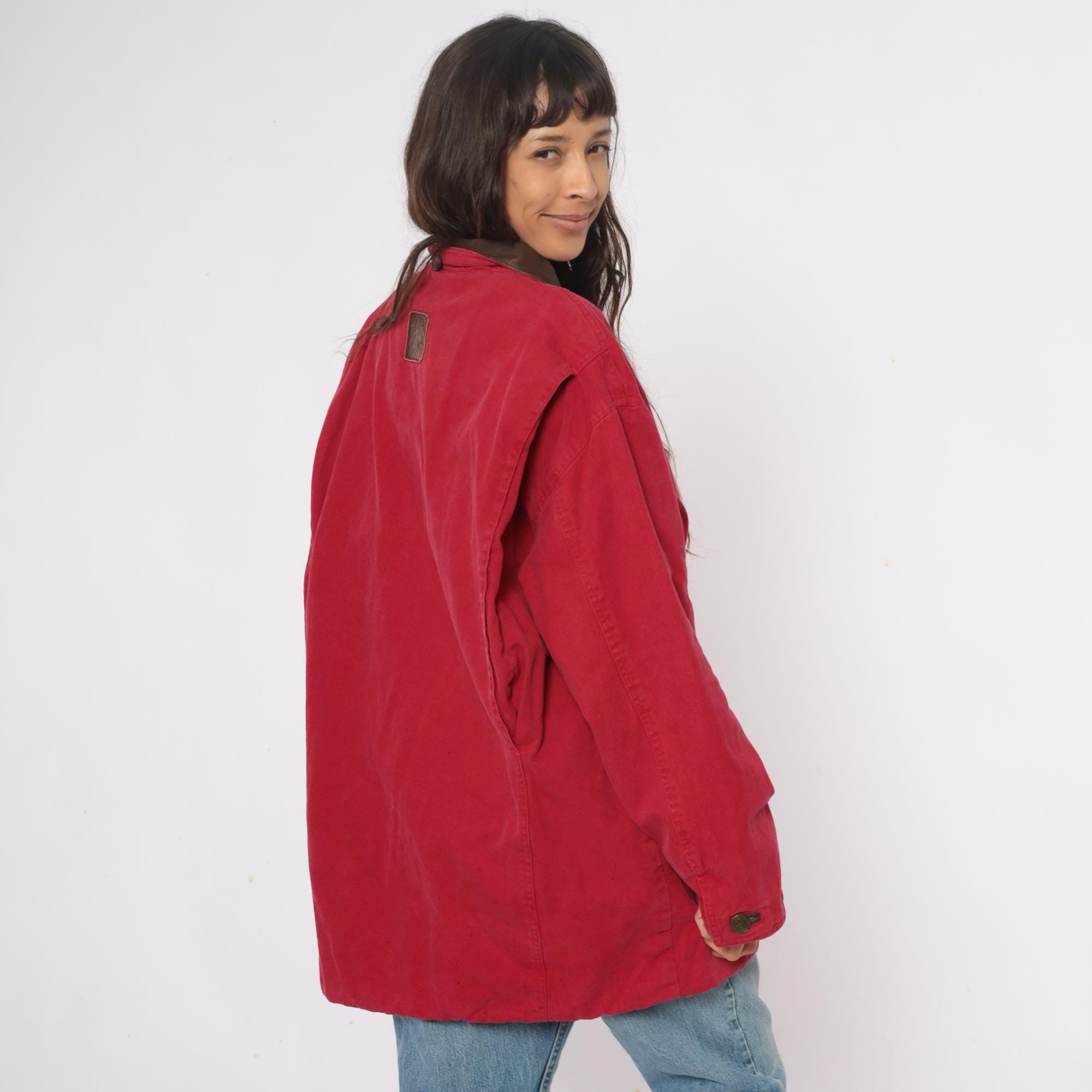 90s red barn jacket from Marlboro with brown leather collar and trim. Button front closure with two large patch pockets at hips, long sleeves with button cuffs, leather logo patch at center back.