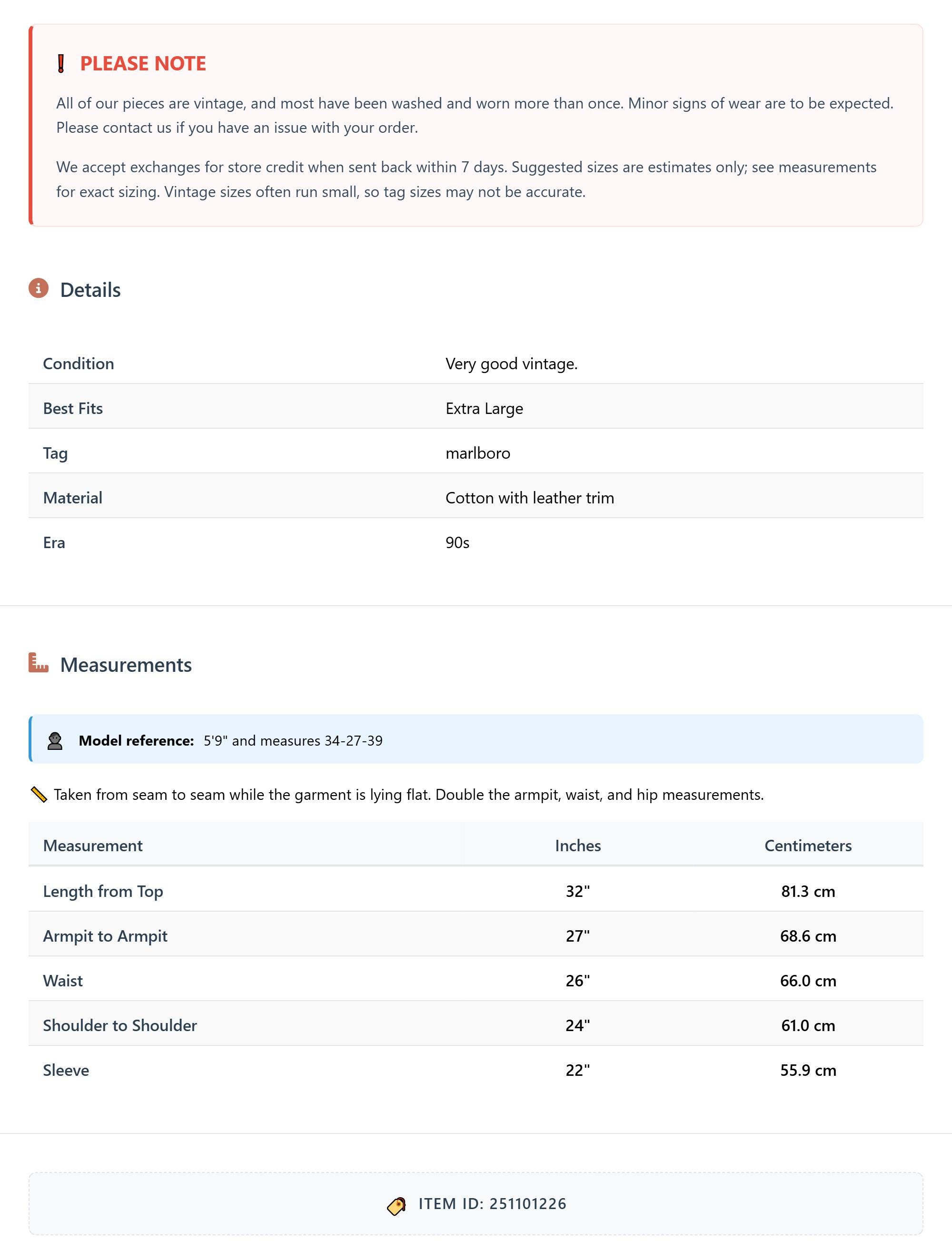 All of our pieces are vintage, and most have been washed and worn more than once. Minor signs of wear are to be expected. Please contact us if you have an issue with your order. We accept exchanges for store credit when sent back within 7 days.