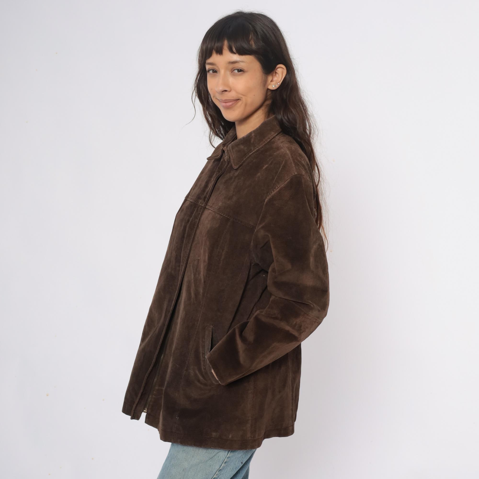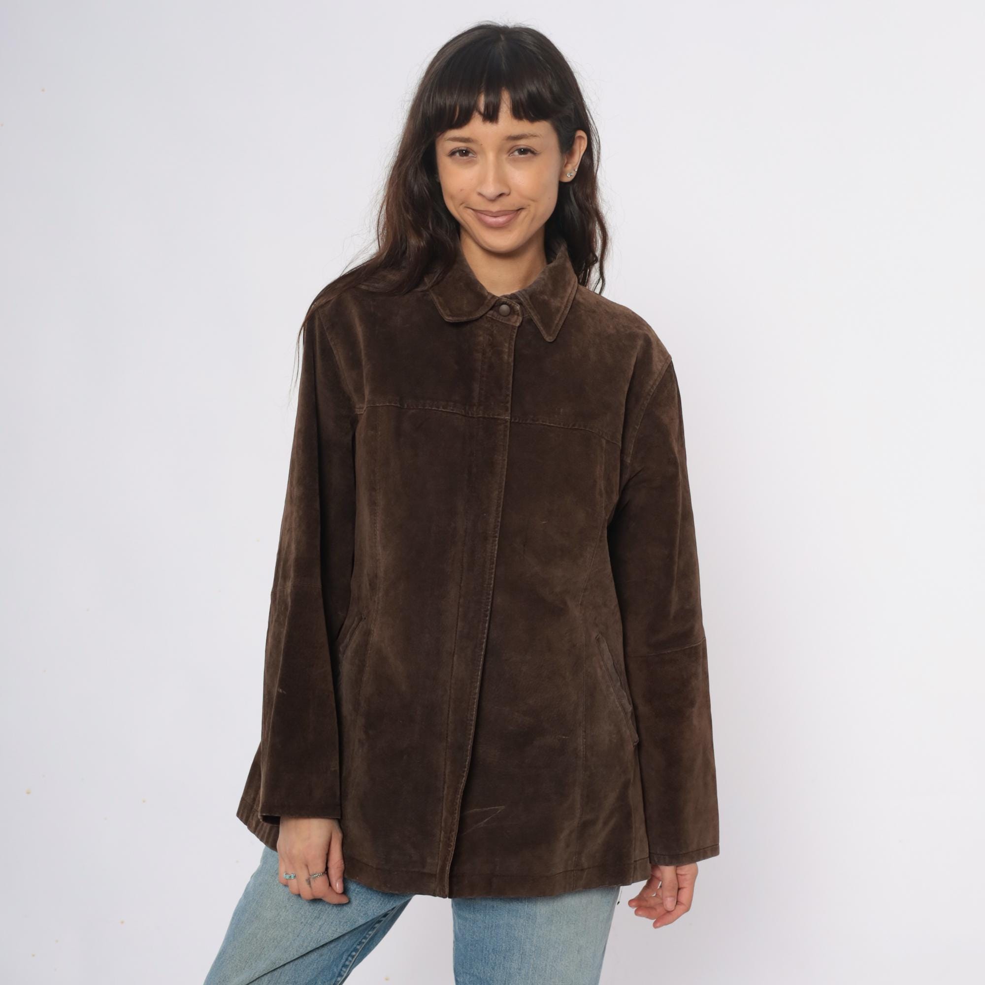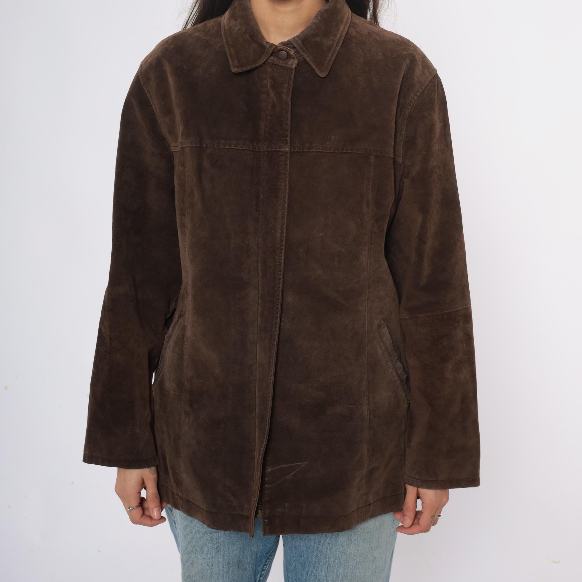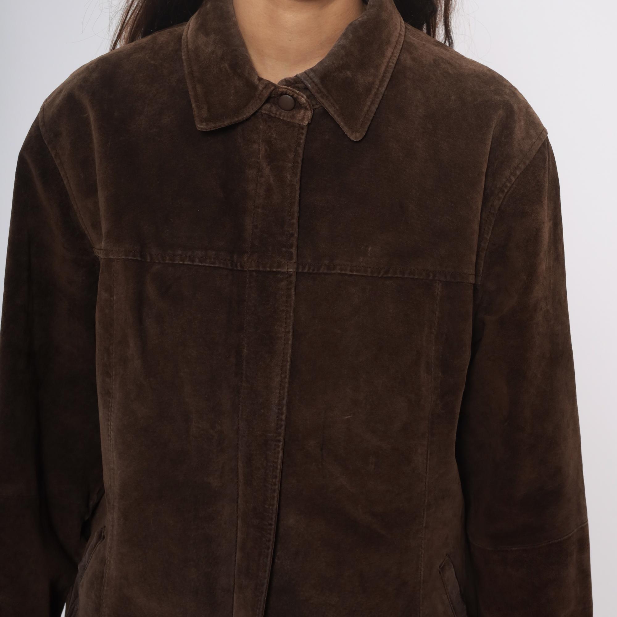 90s brown suede jacket from ami with collared neckline and full button front closure. Long sleeves, straight silhouette, two front slip pockets.