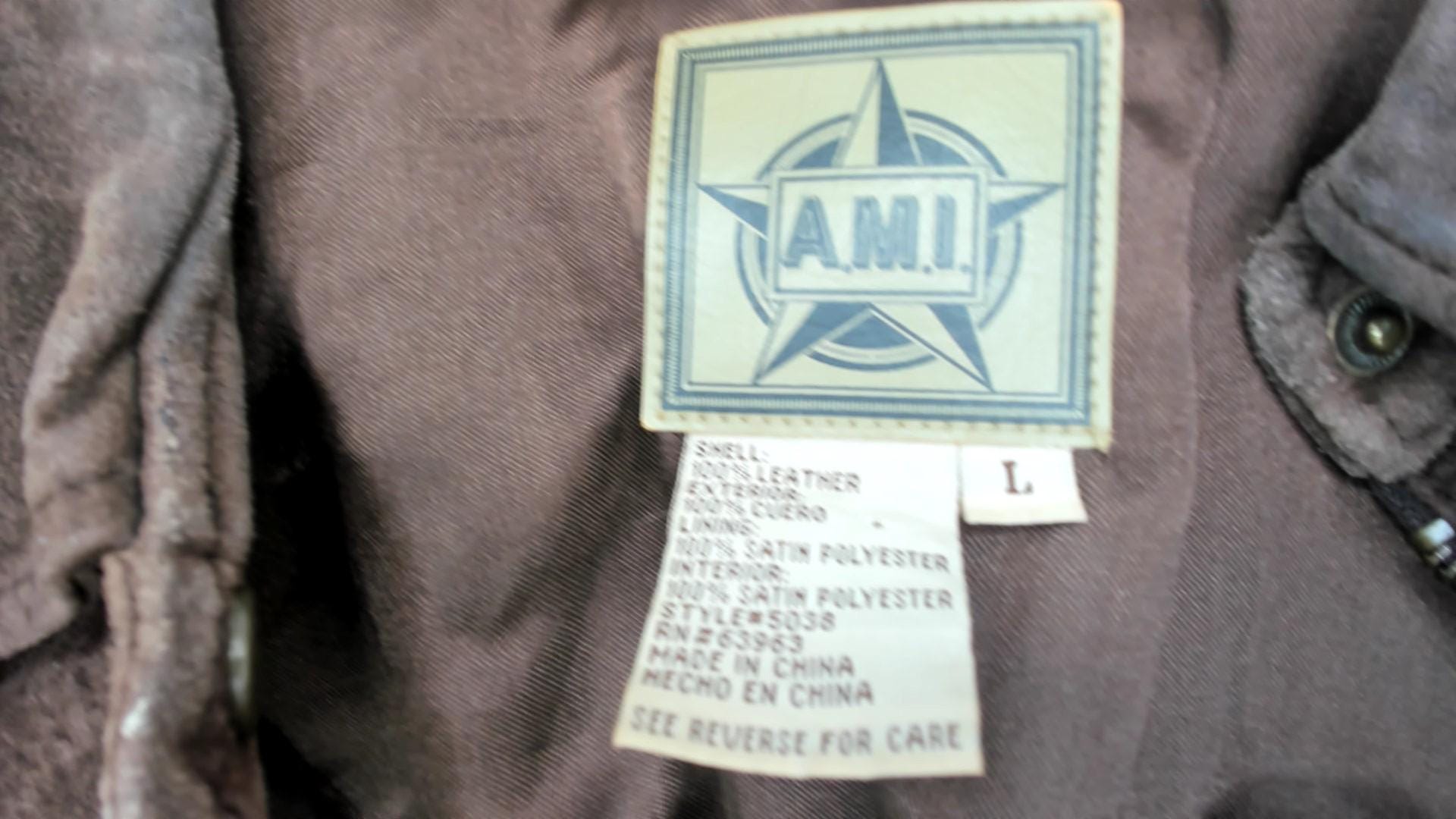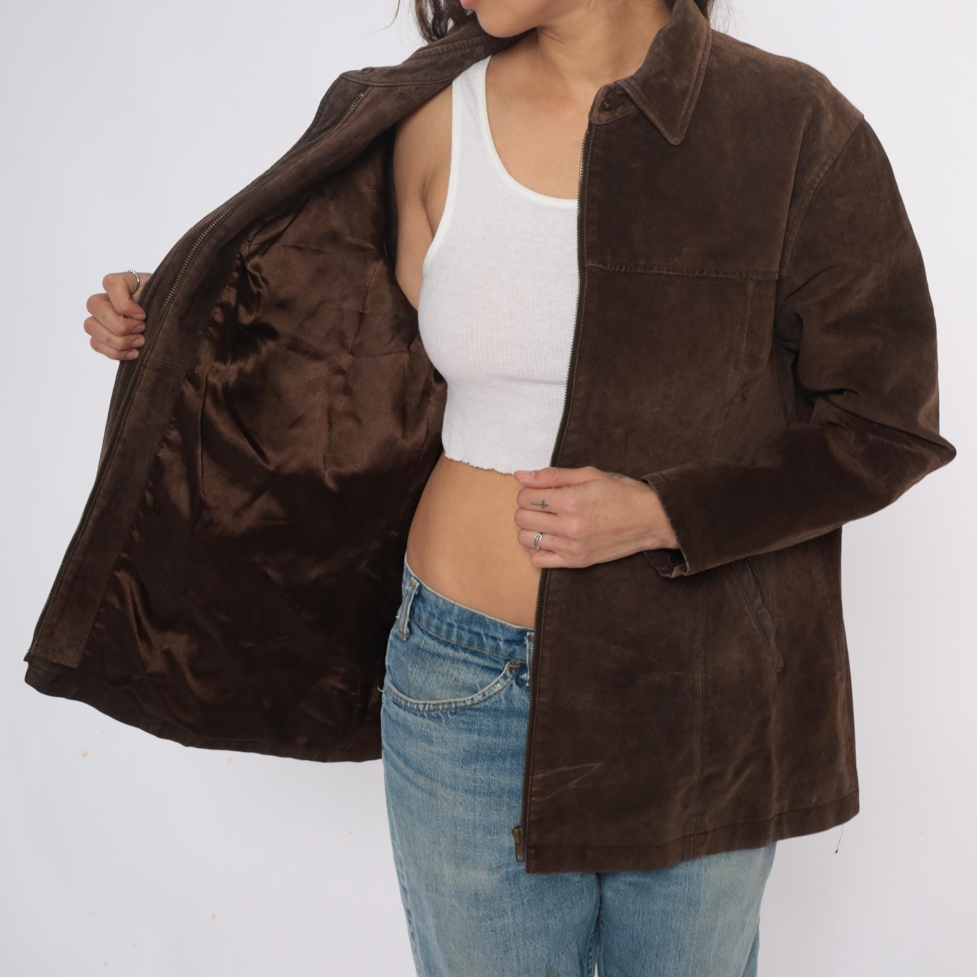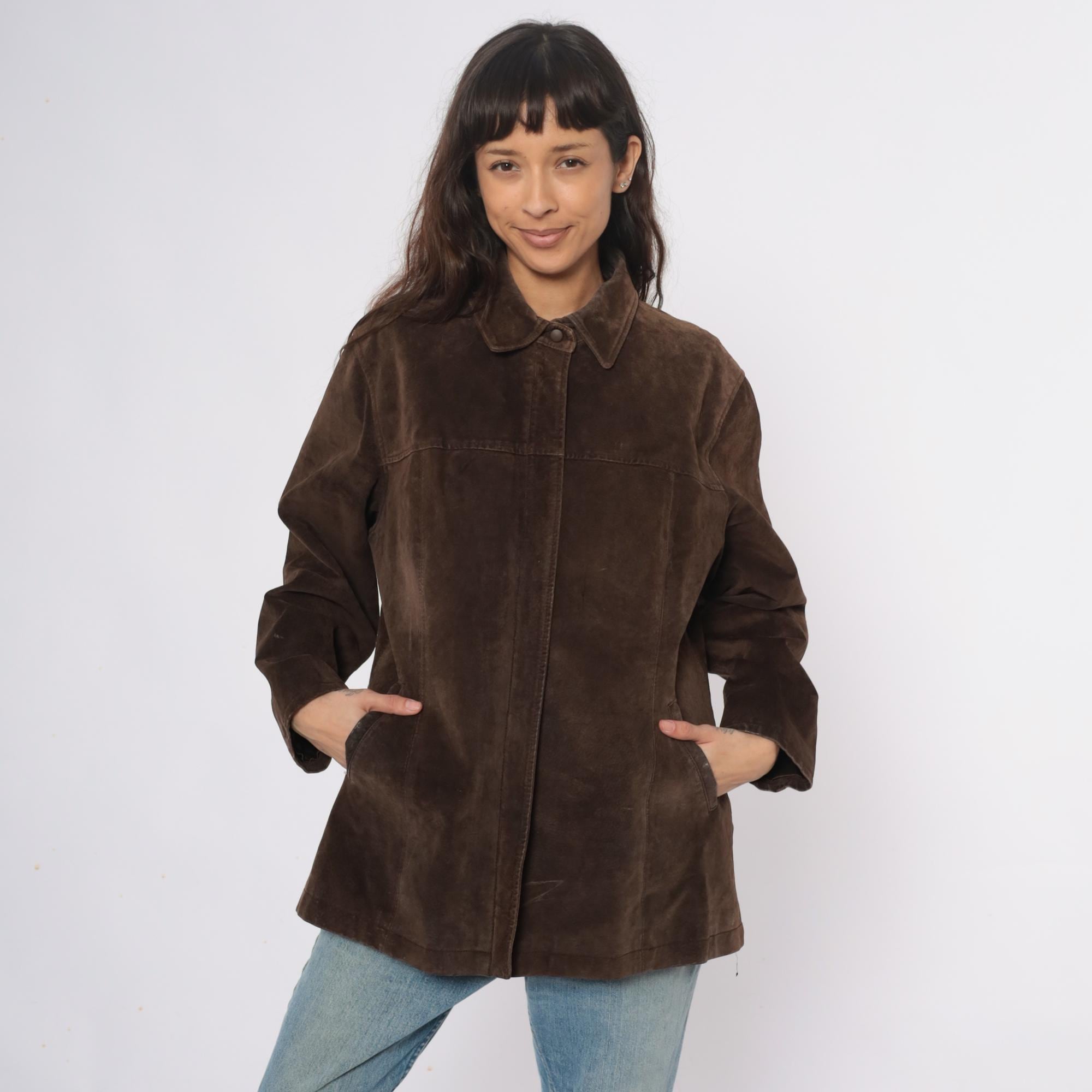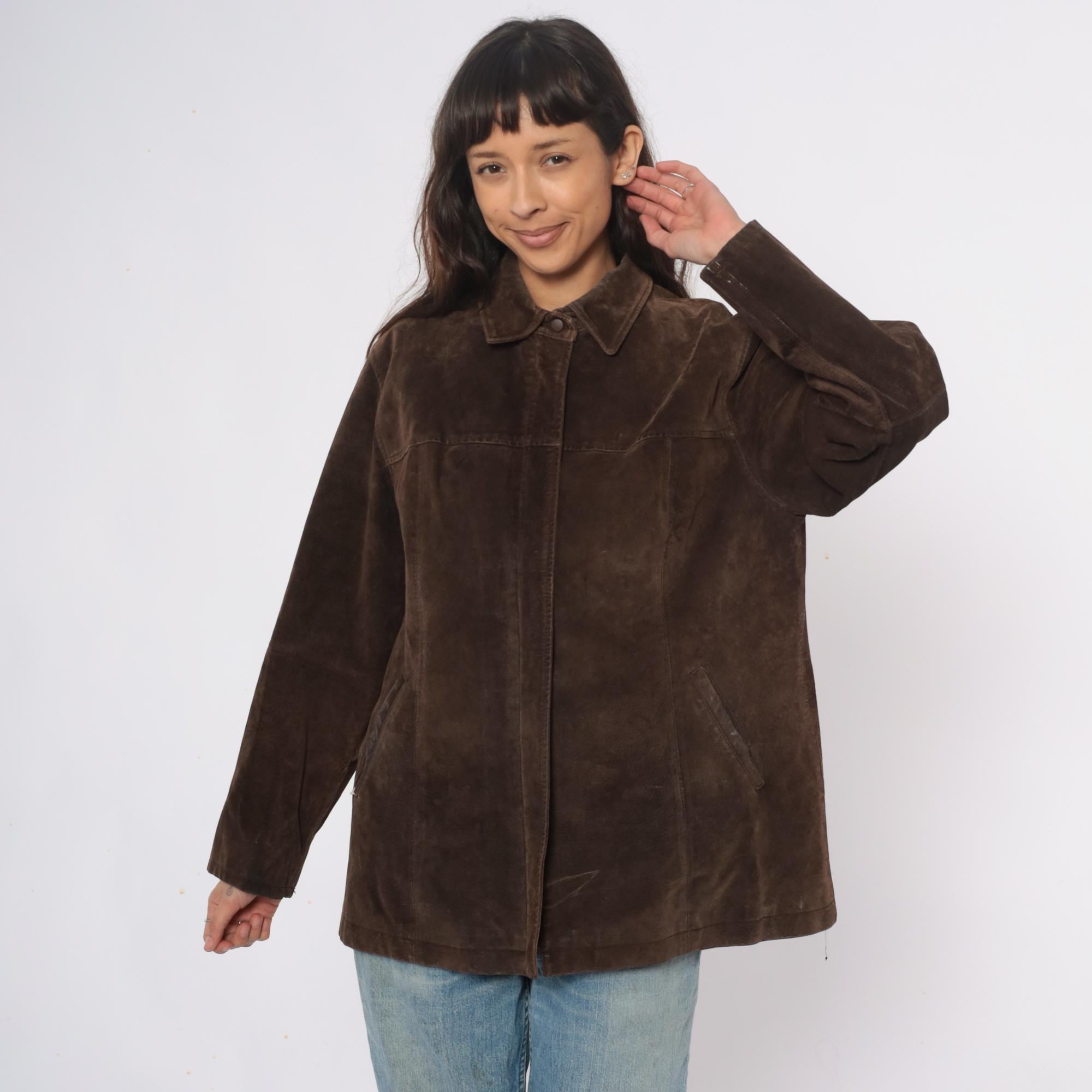 90s brown suede jacket from ami with collared neckline and full button front closure. Long sleeves, straight silhouette, two front slip pockets.