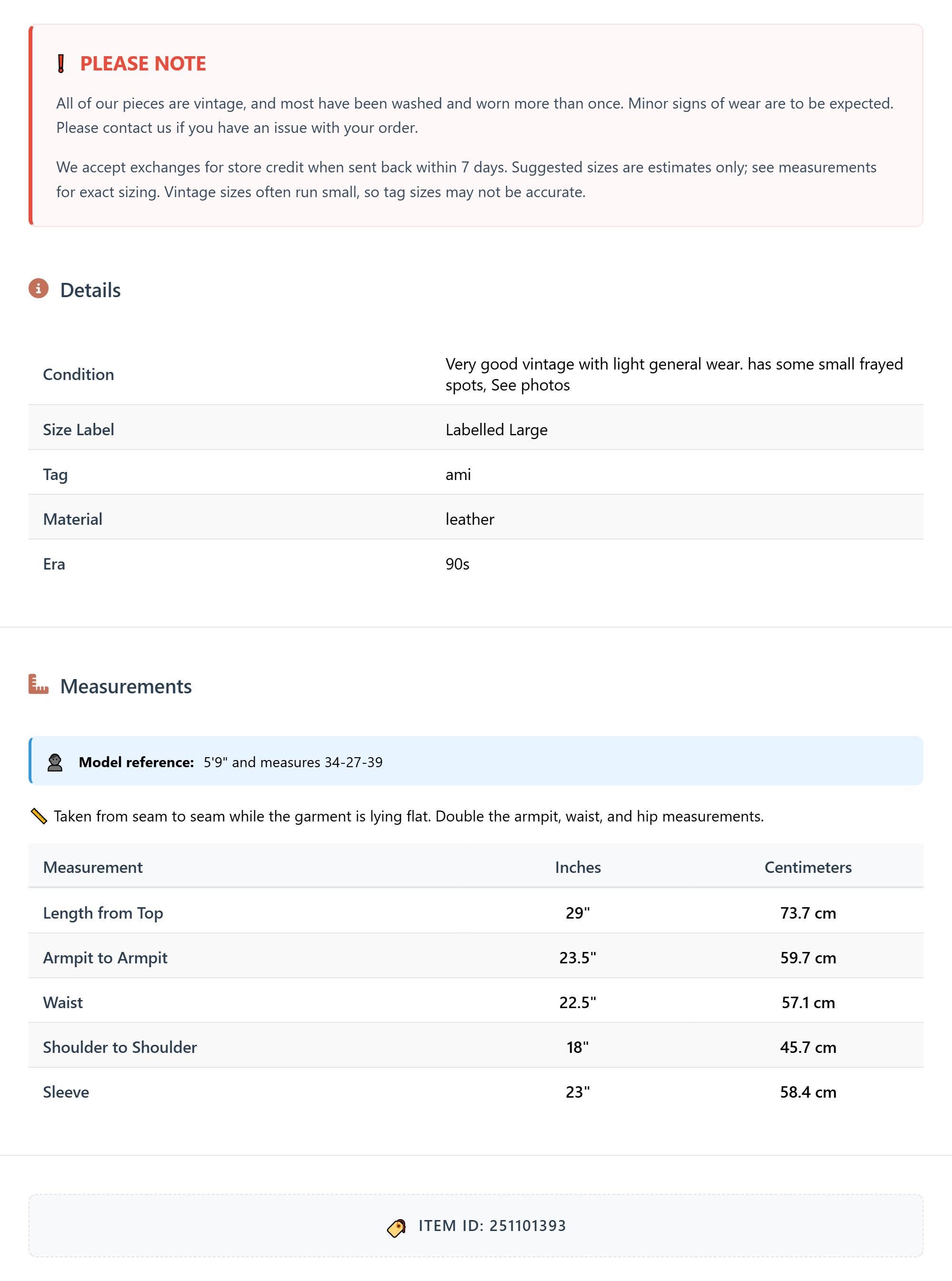 All of our pieces are vintage, and most have been washed and worn more than once. Minor signs of wear are to be expected. Please contact us if you have an issue with your order. We accept exchanges for store credit when sent back within 7 days.