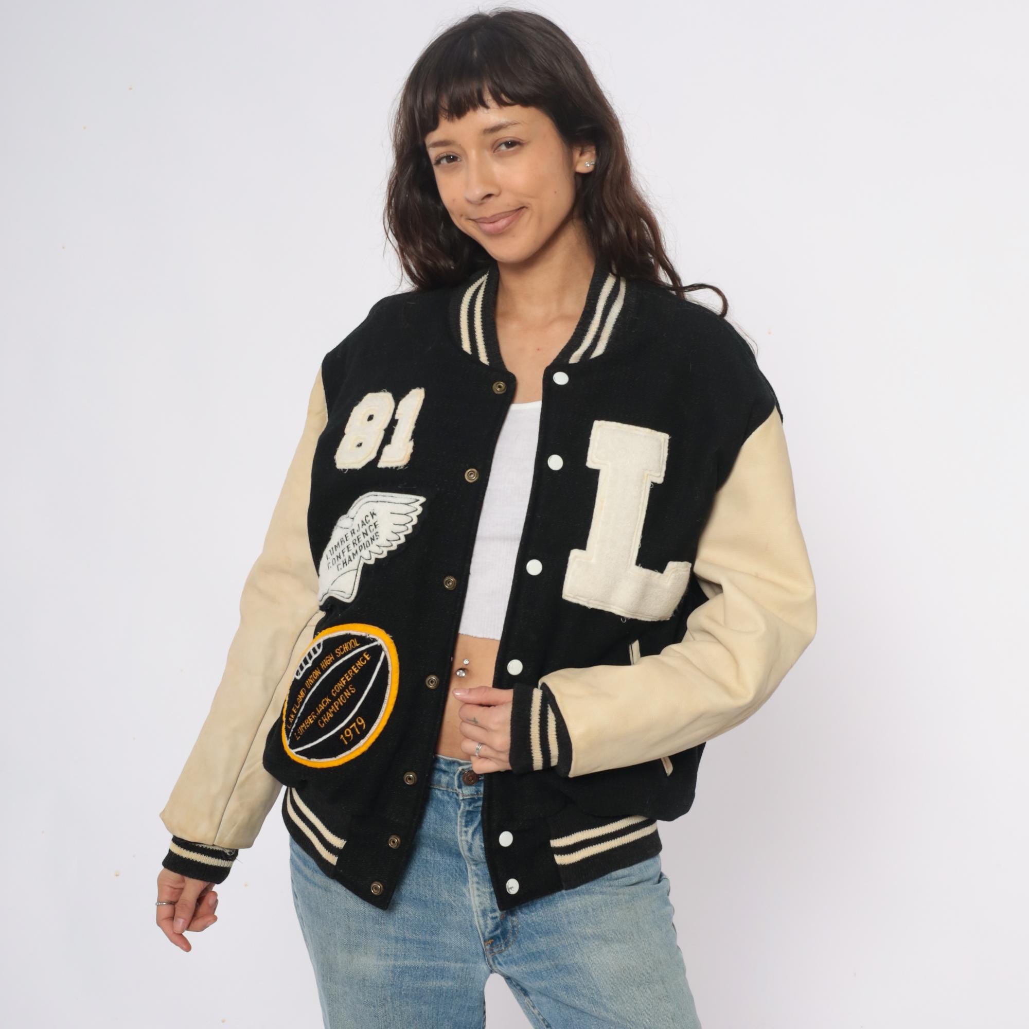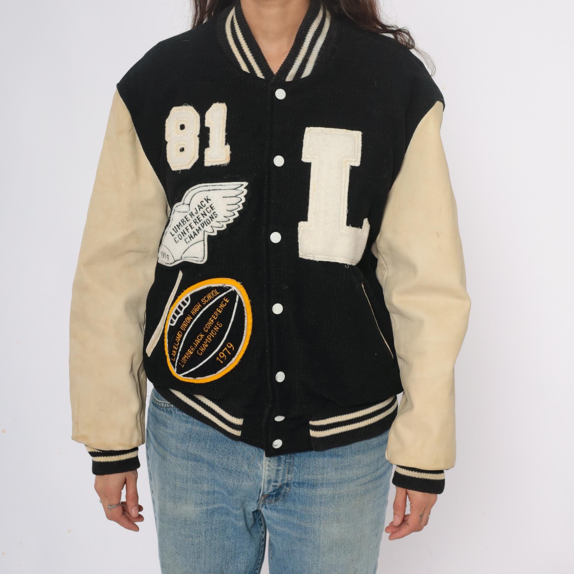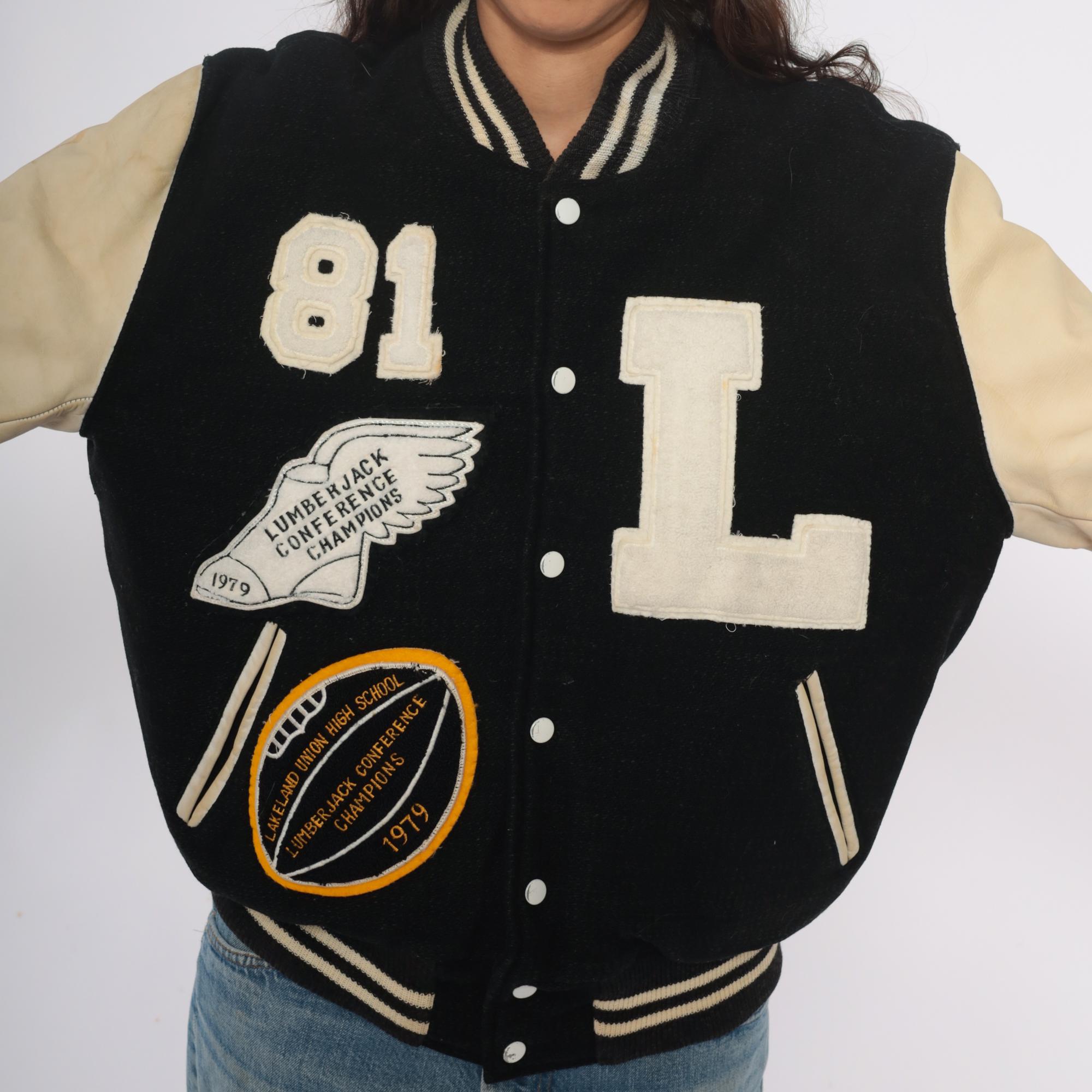 80s black and cream varsity jacket from Golden Threads Outerwear with wool body and tan leather sleeves. Collegiate patches include large chenille "L" letter, number "81", Lumberjack Conference Champions winged foot emblem dated 1979, and Oregon High School conference circular patch.