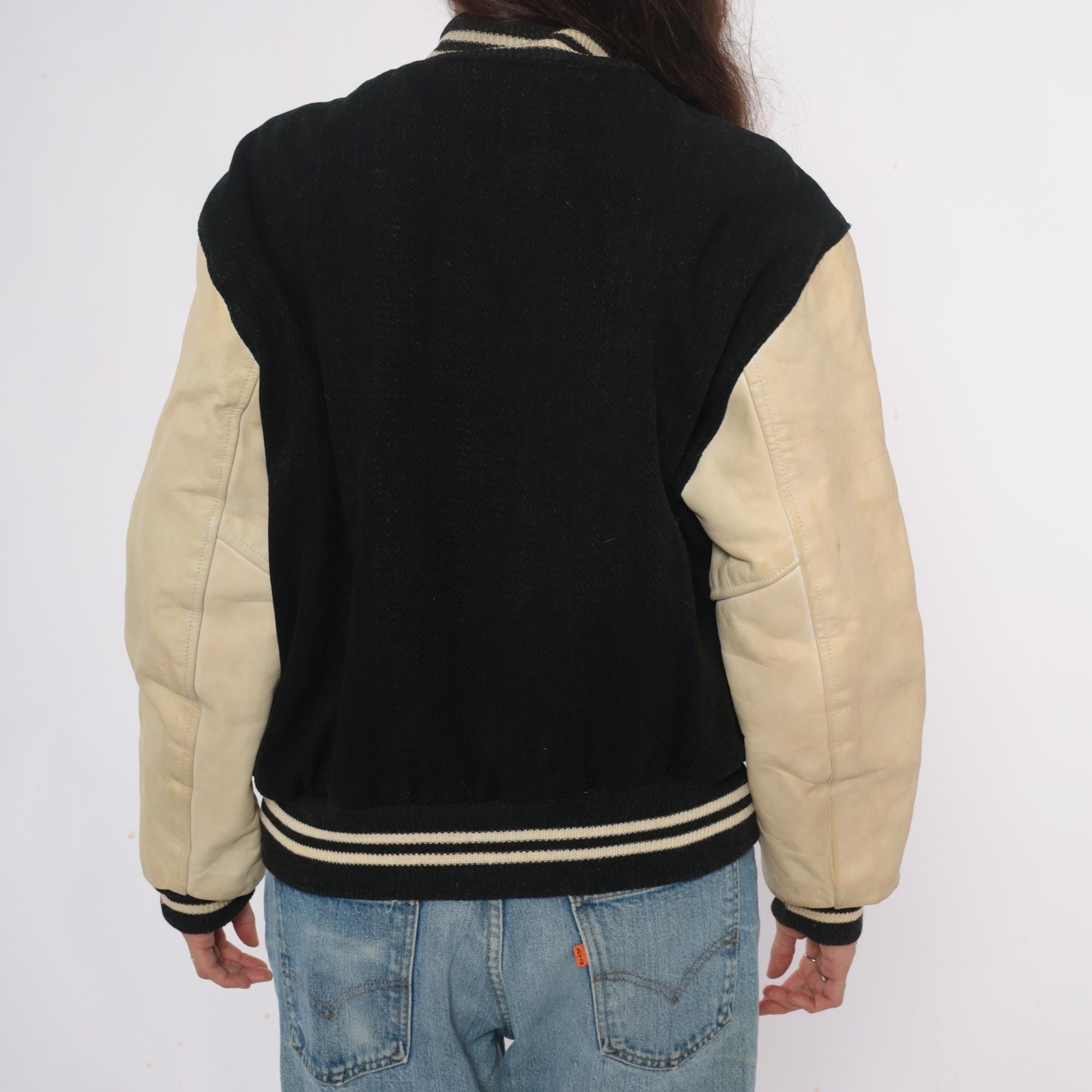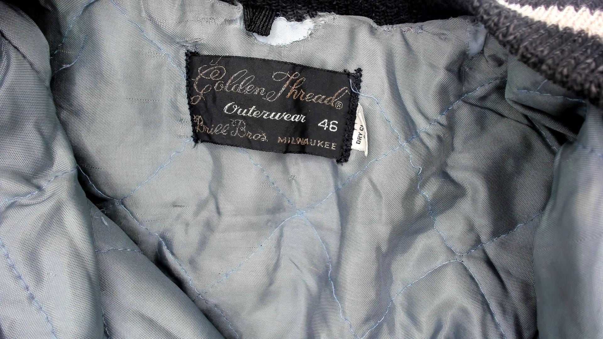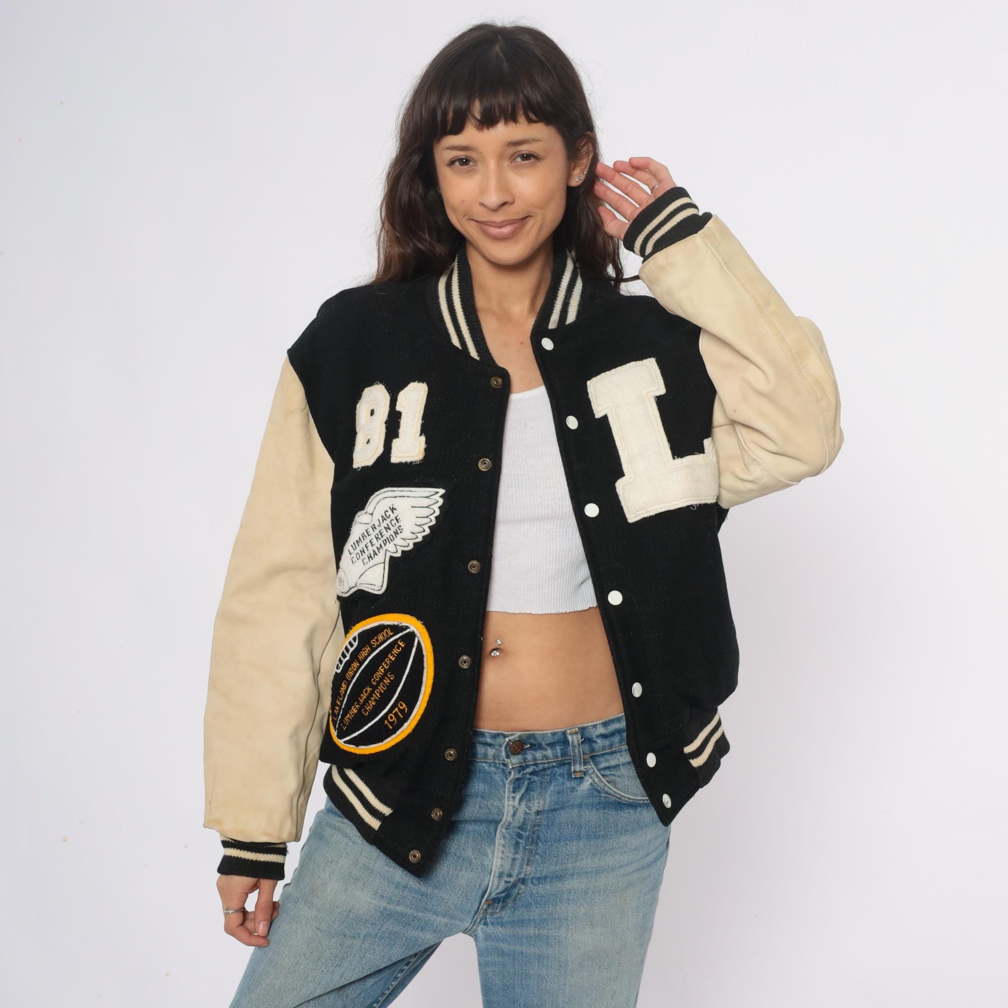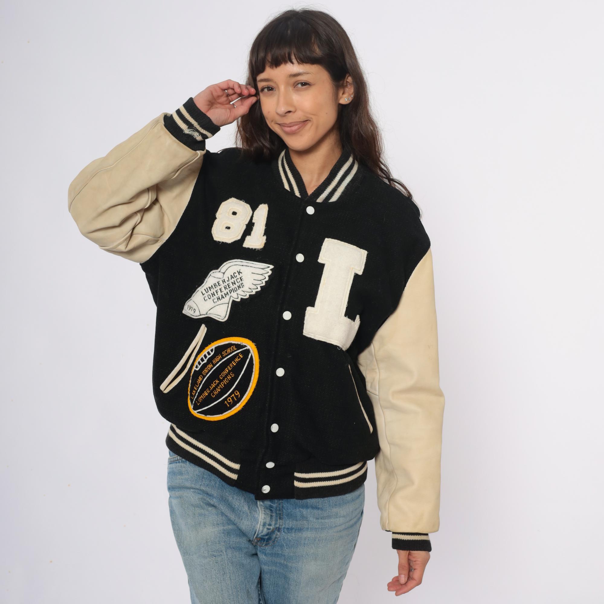 80s black and cream varsity jacket from Golden Threads Outerwear with wool body and tan leather sleeves. Collegiate patches include large chenille "L" letter, number "81", Lumberjack Conference Champions winged foot emblem dated 1979, and Oregon High School conference circular patch.
