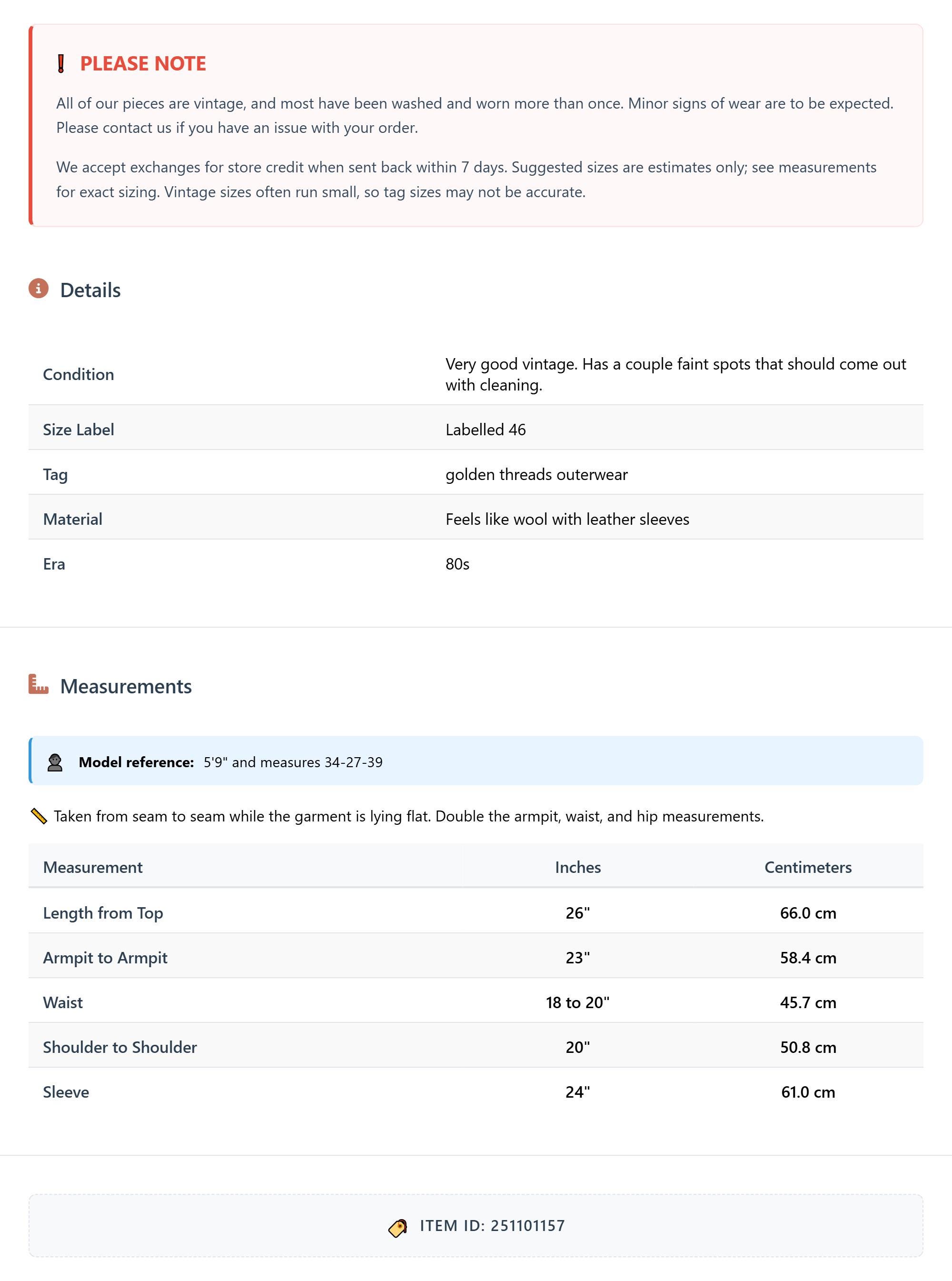Condition: Very good vintage with wear due to age. Has a couple faint spots that should come out with cleaning and has some wear on sleeve cuffs See photos
