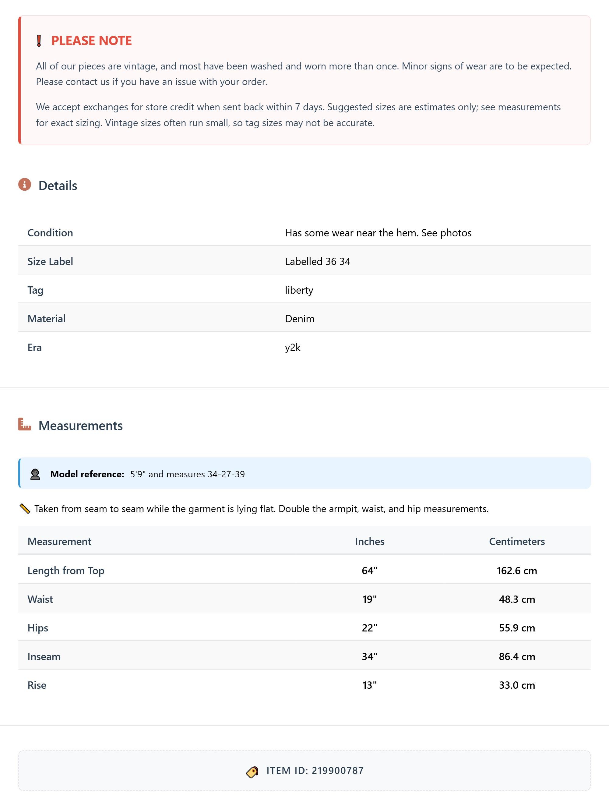 Vintage denim was usually made without any stretch, unlike modern jeans. Check the measurements to ensure proper fit, and remember to give yourself a little wiggle room in the waist and hips, depending on your preferred fit.
