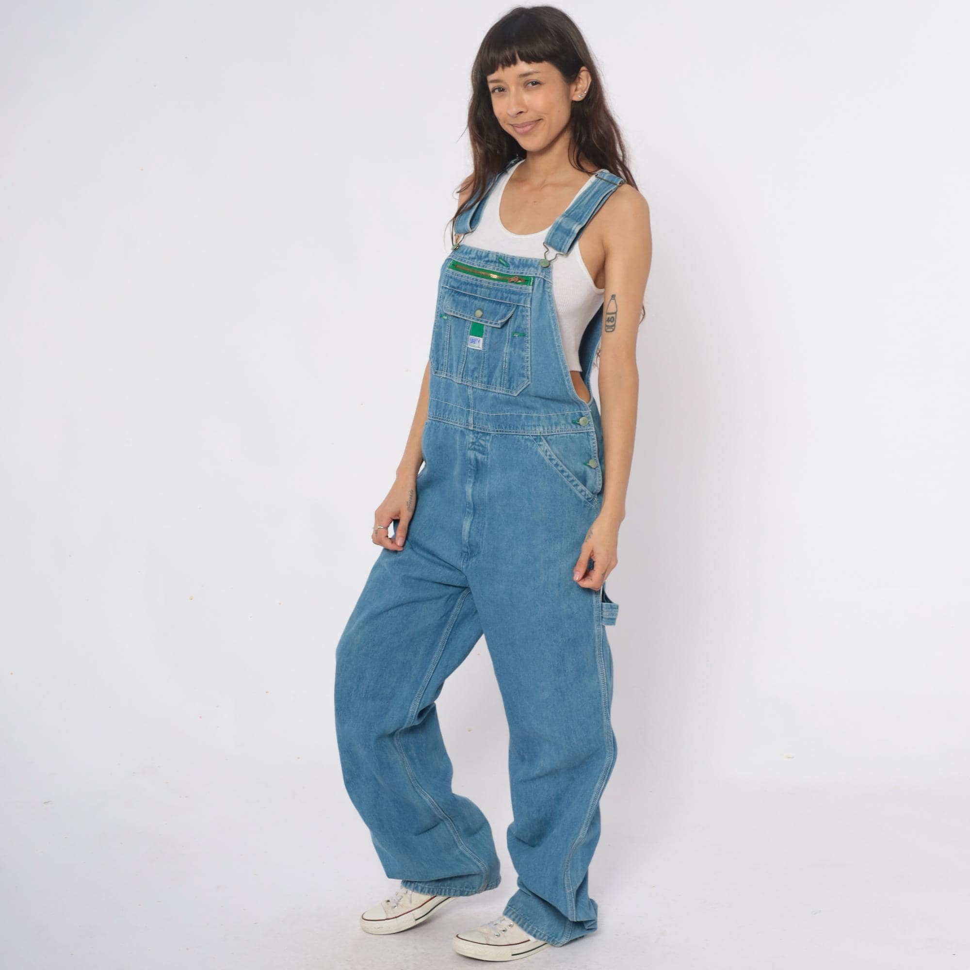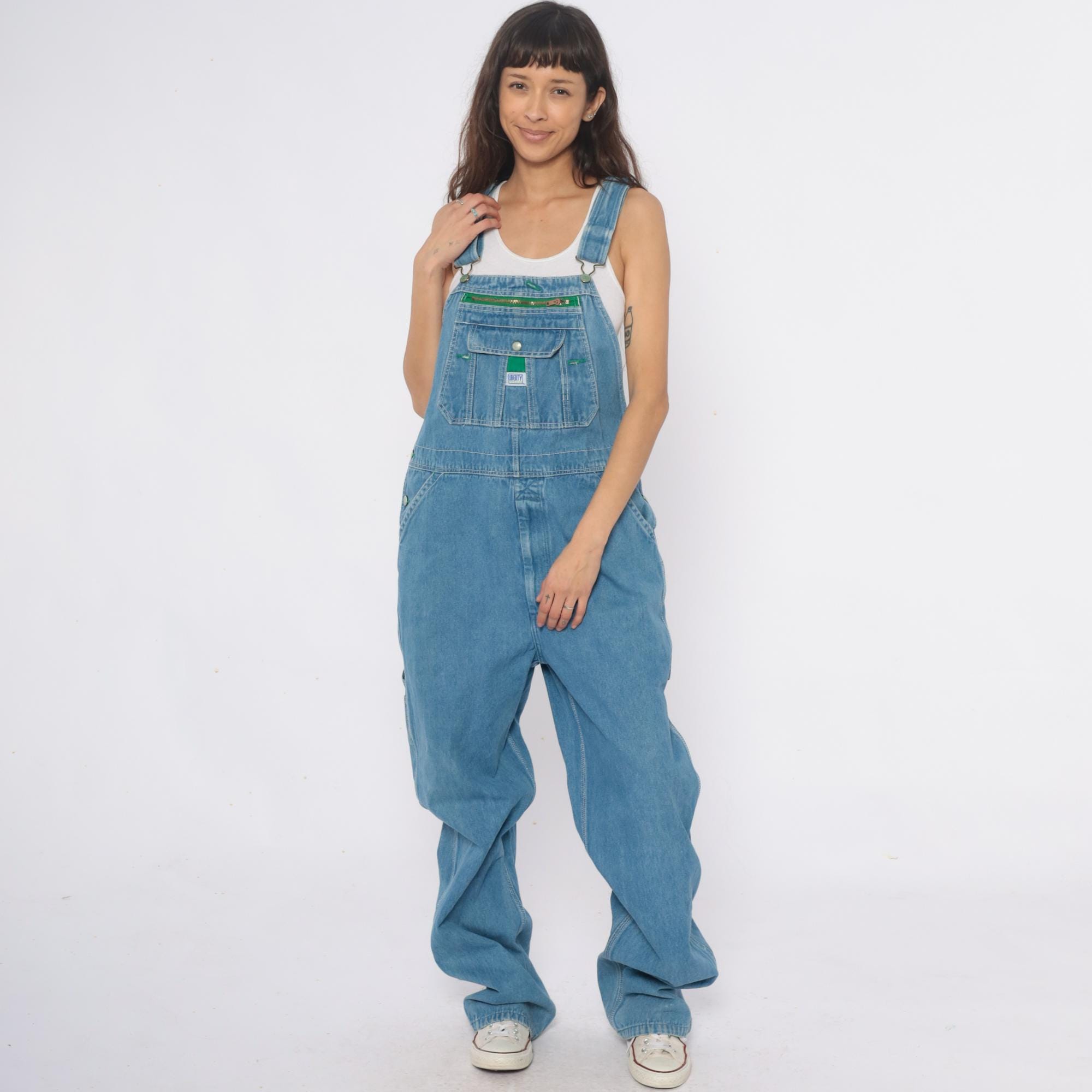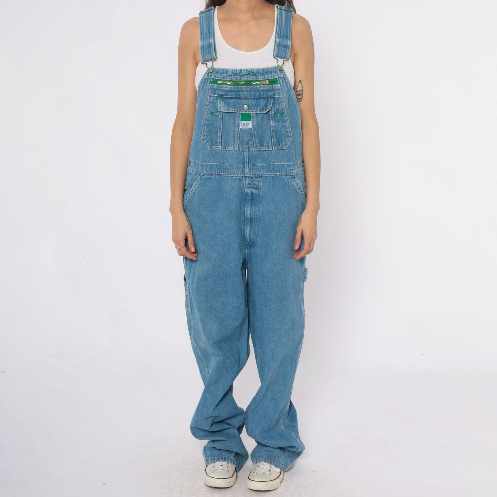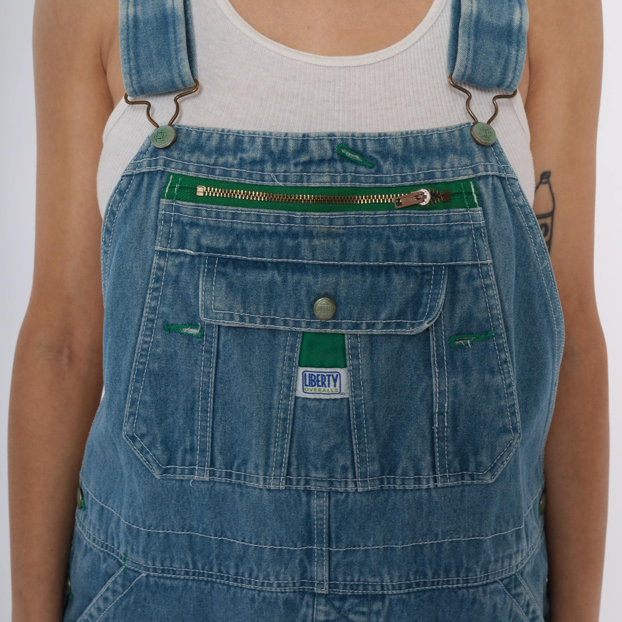Y2K light blue denim overalls from Liberty with green contrast stitching throughout. Front chest pocket with snap closure and zippered detail, adjustable shoulder straps with metal hardware, carpenter-style utility pockets on legs.