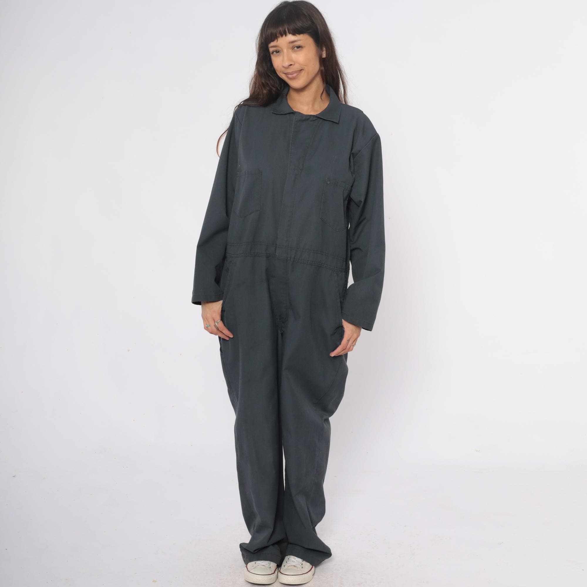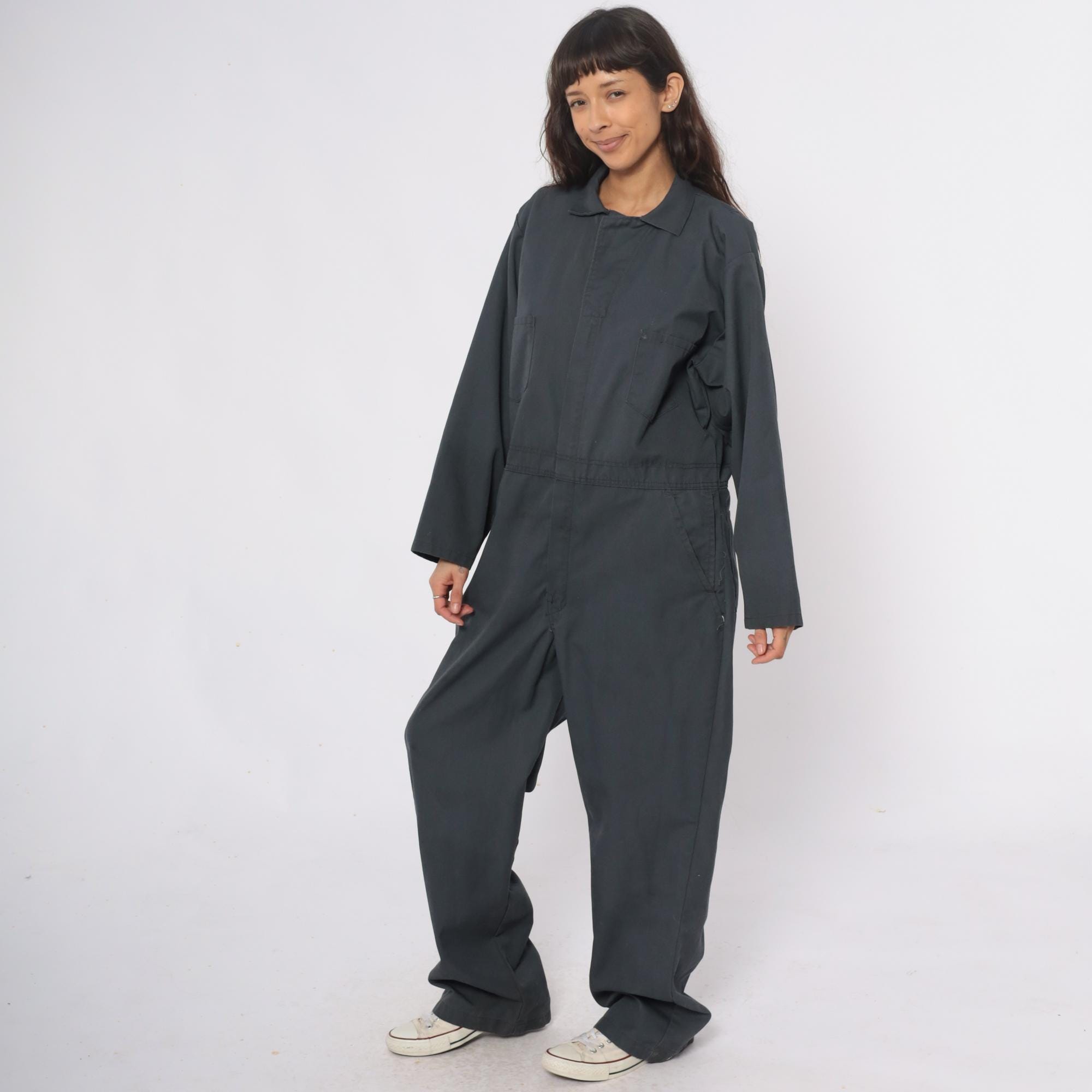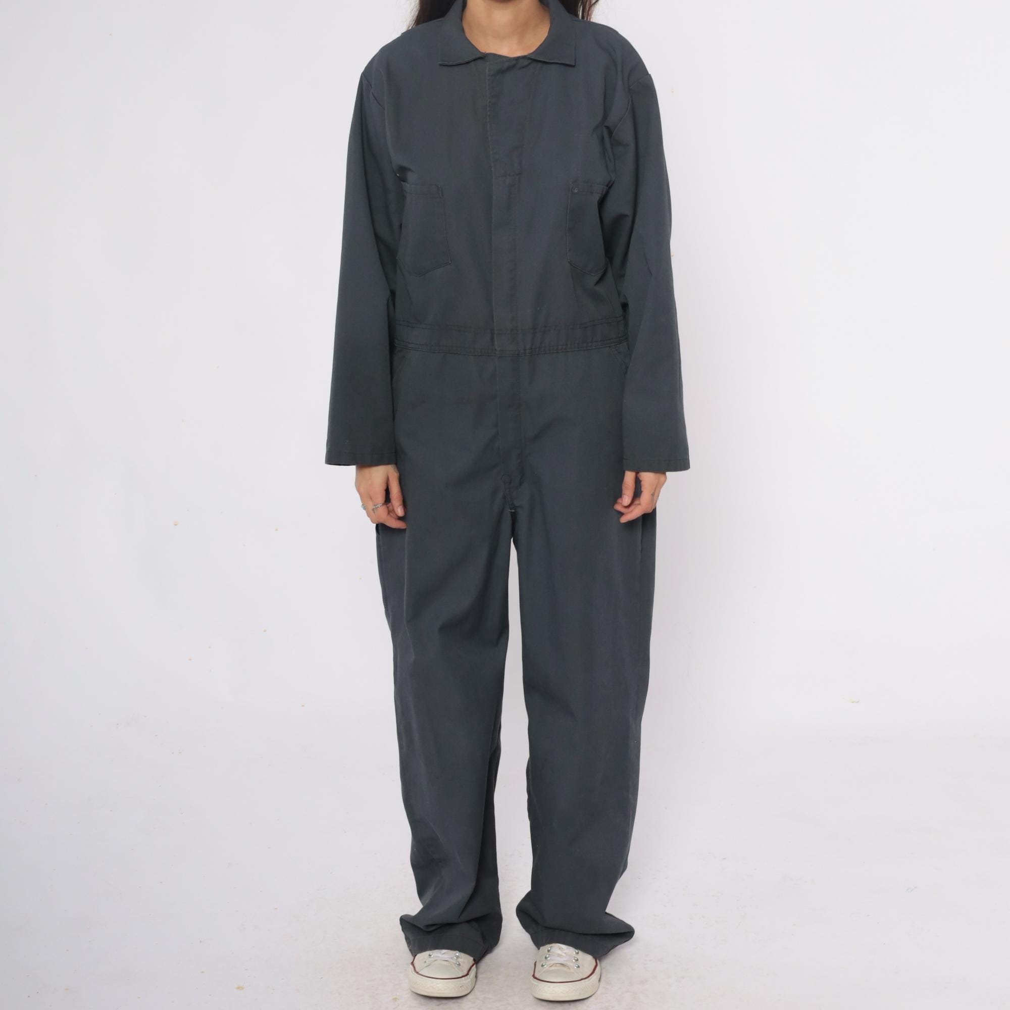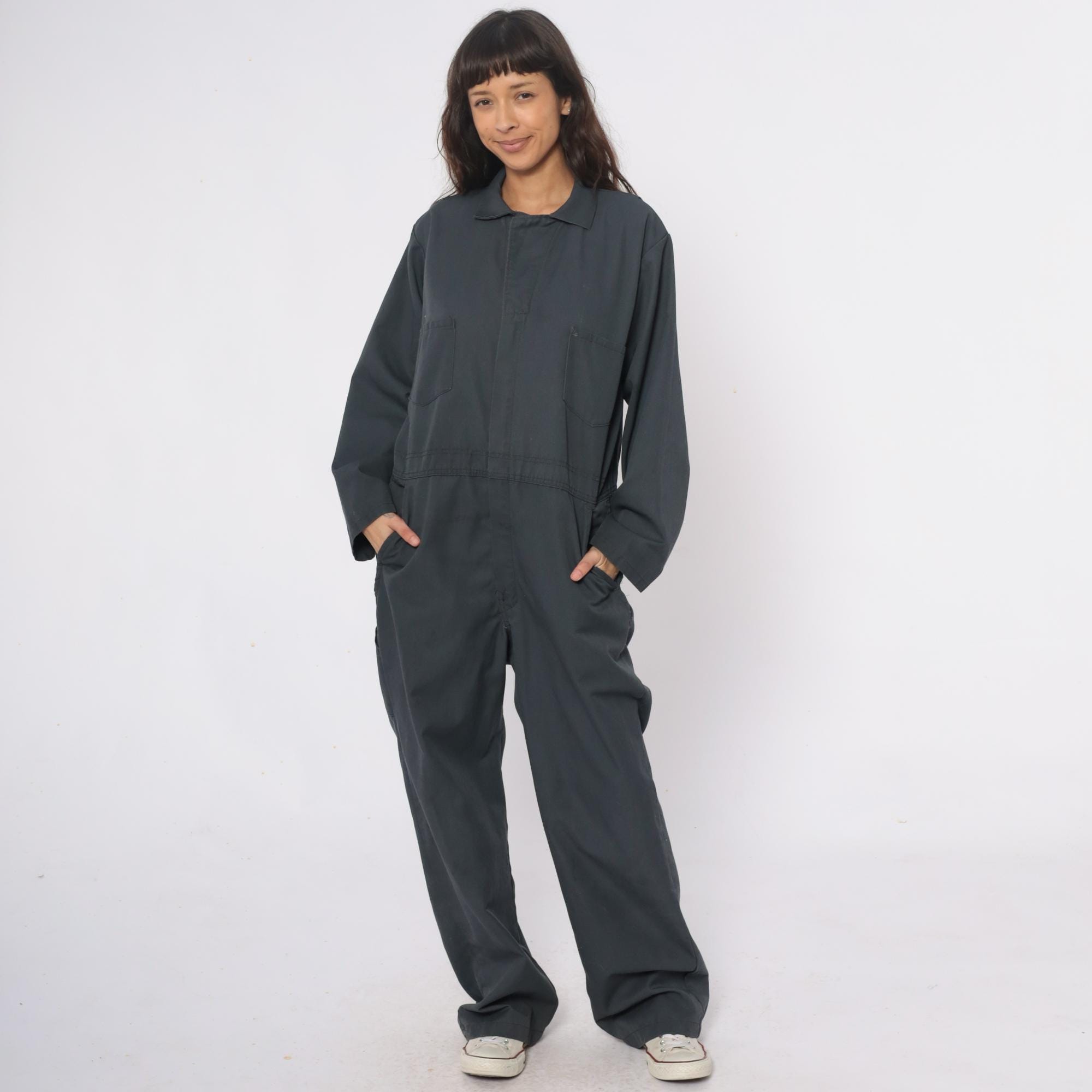 Y2K gray coveralls from Wearguard with collared neckline, zip up closure, and long sleeves. Two chest pockets, back pockets, and functional workwear styling.