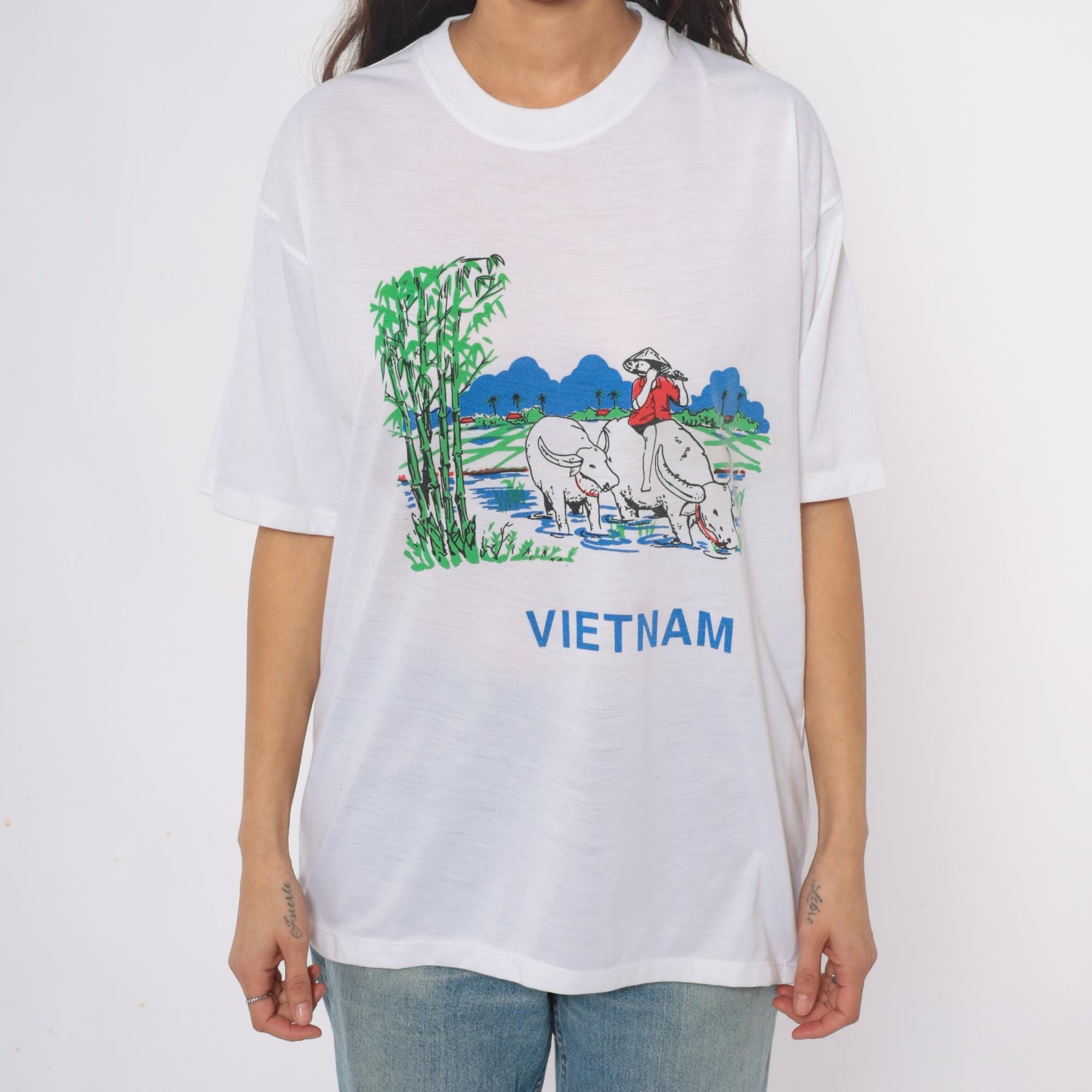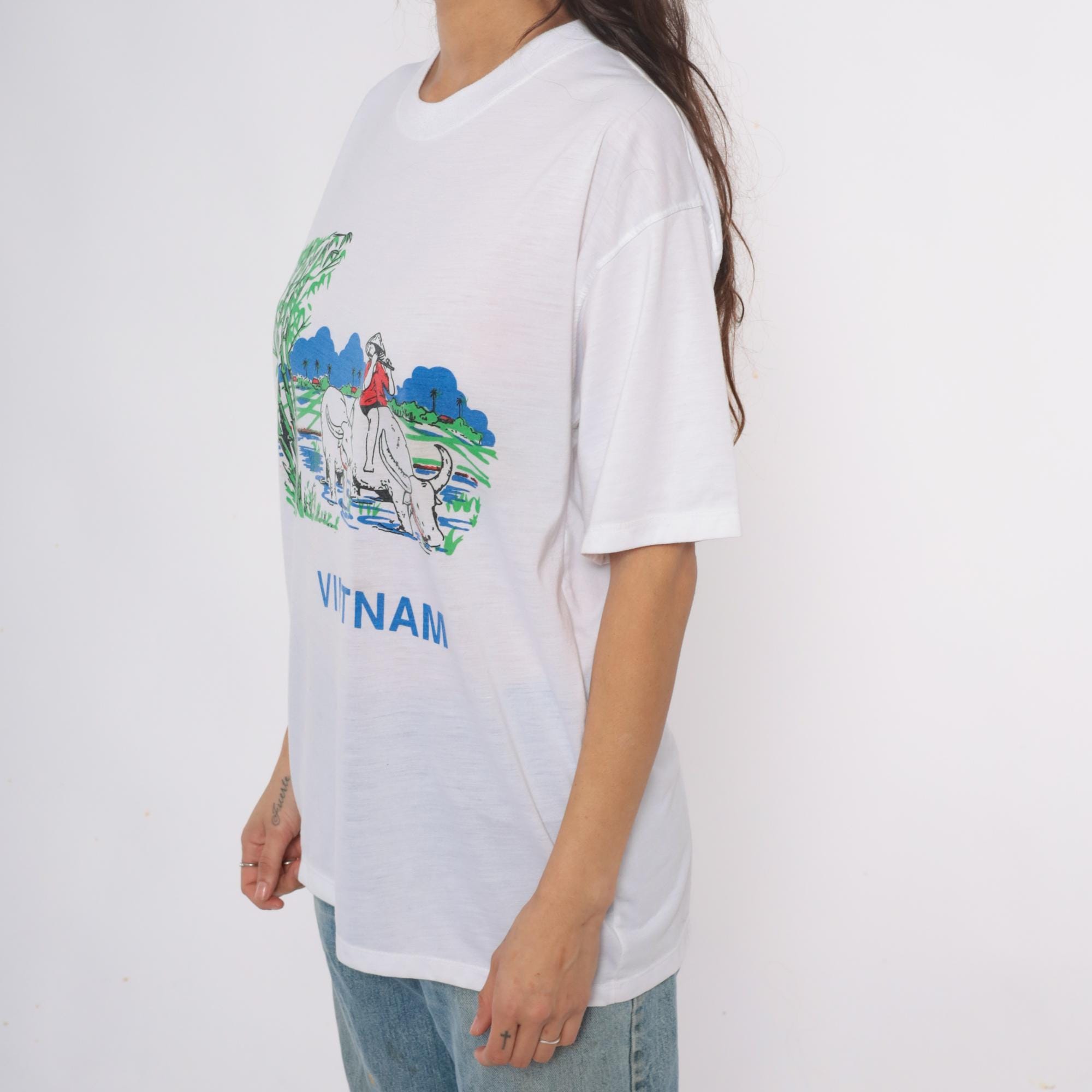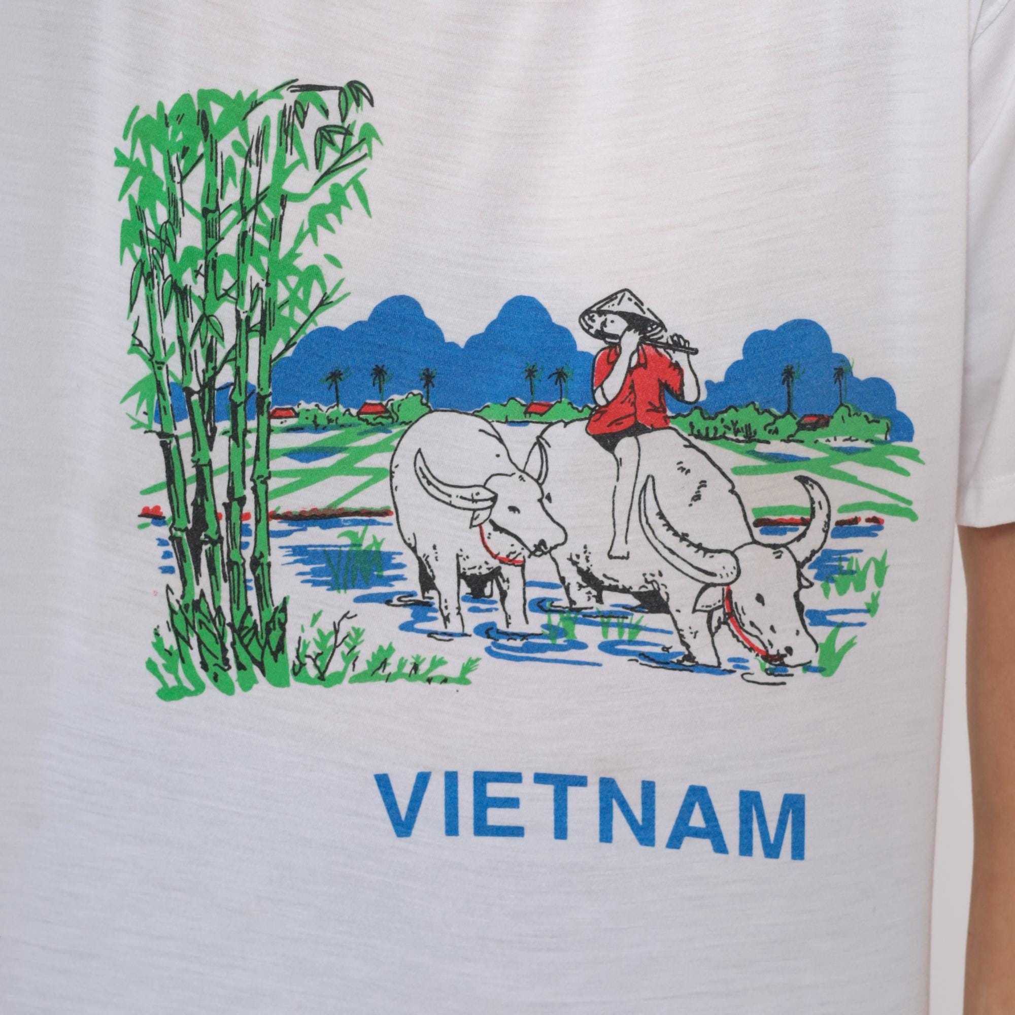 Y2K white Vietnam souvenir t-shirt with graphic print of farmer on water buffalo in rice paddy, bamboo stalks on left side, blue mountain landscape in background, and "VIETNAM" text in blue below the scene.