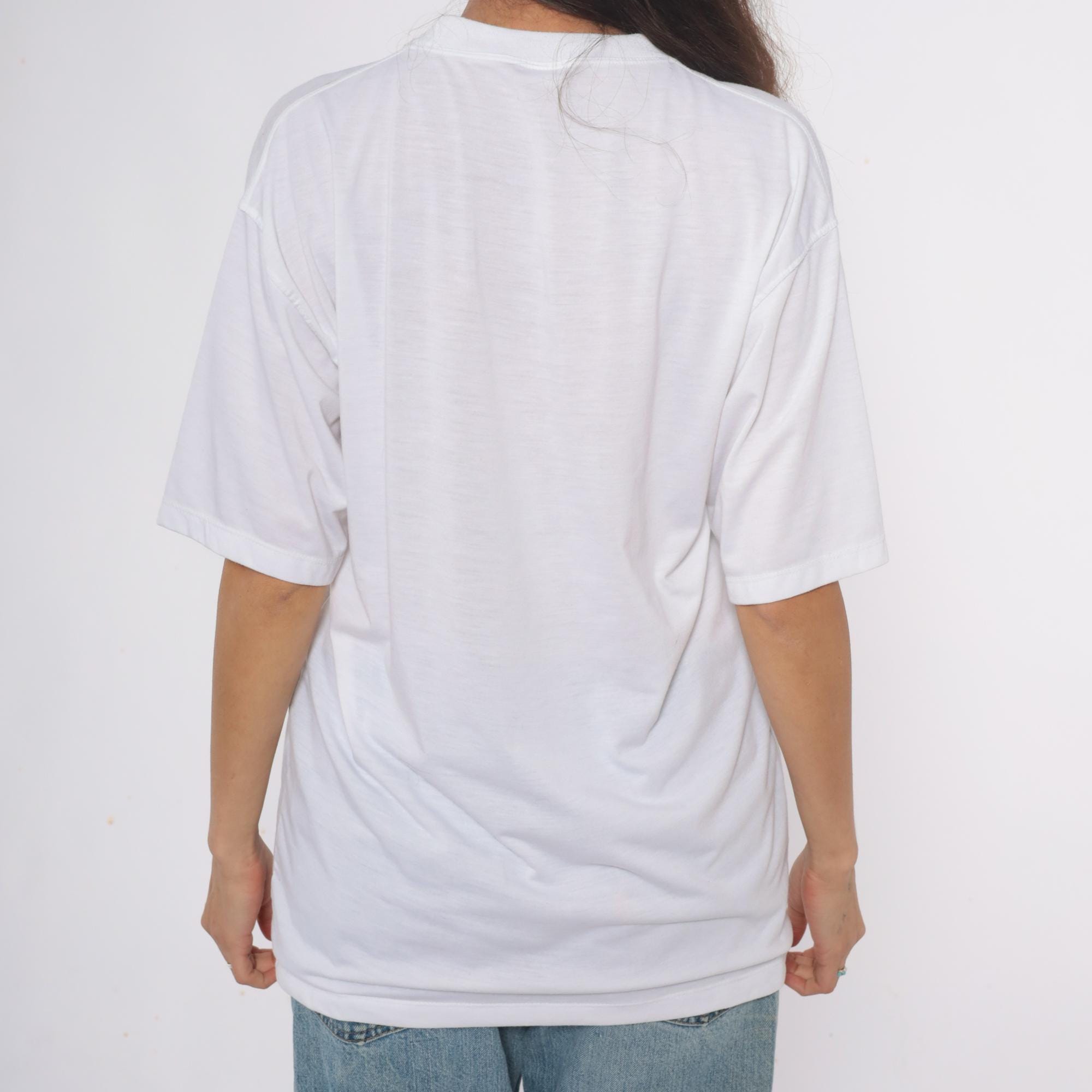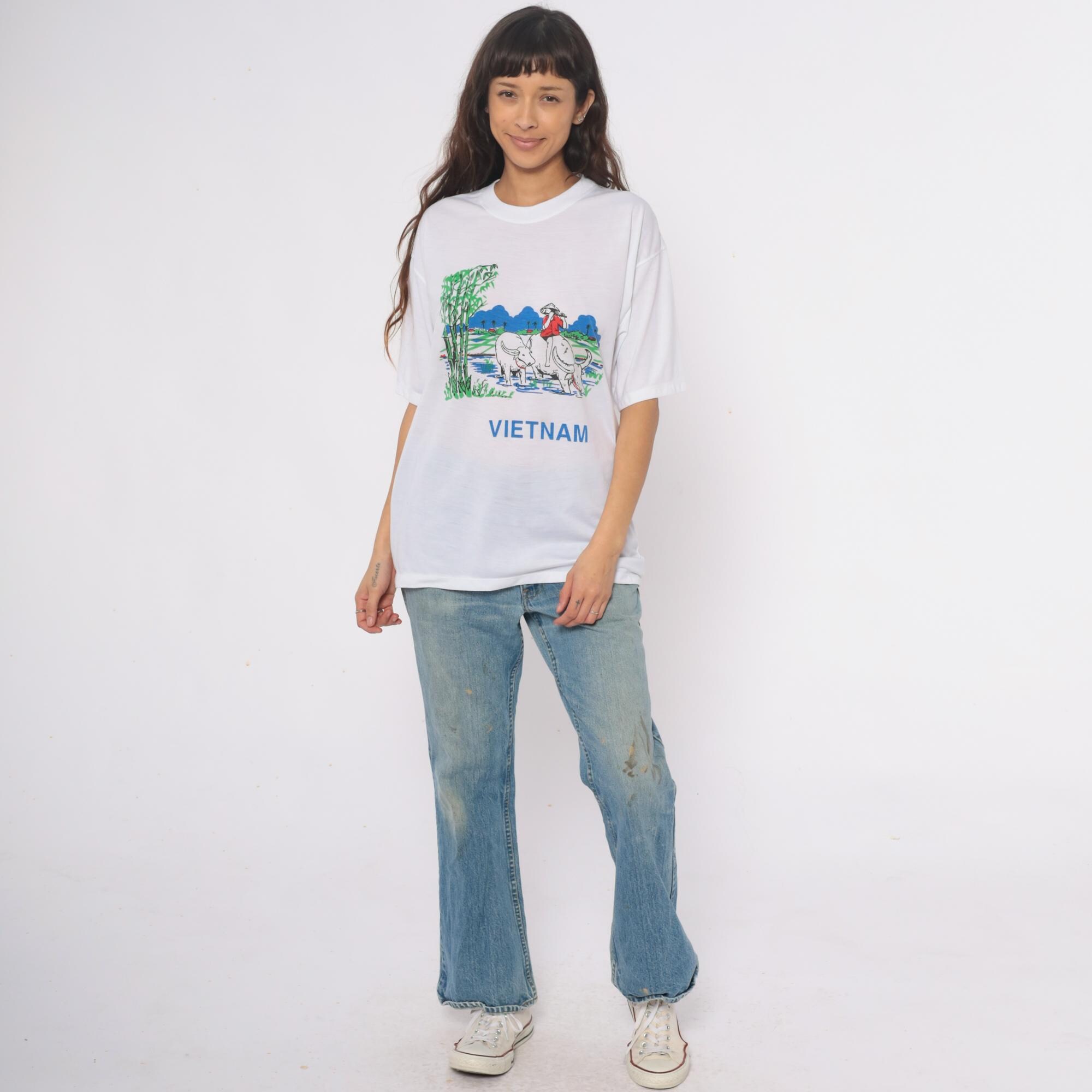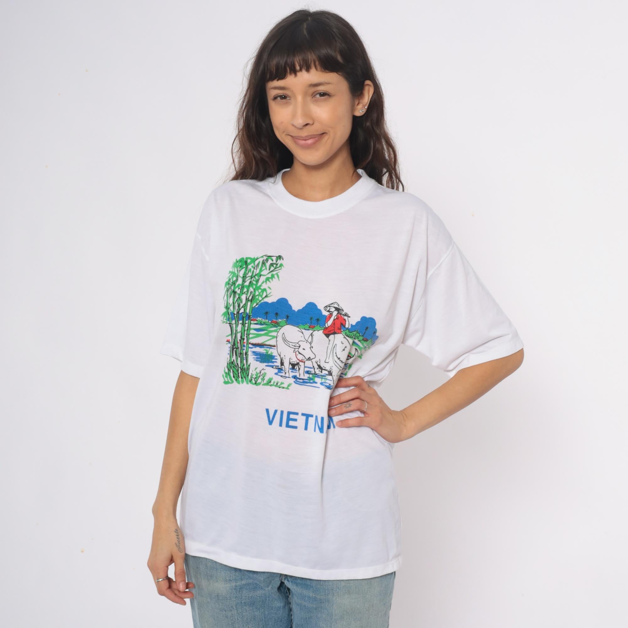 Y2K white Vietnam souvenir t-shirt with graphic print of farmer on water buffalo in rice paddy, bamboo stalks on left side, blue mountain landscape in background, and "VIETNAM" text in blue below the scene.