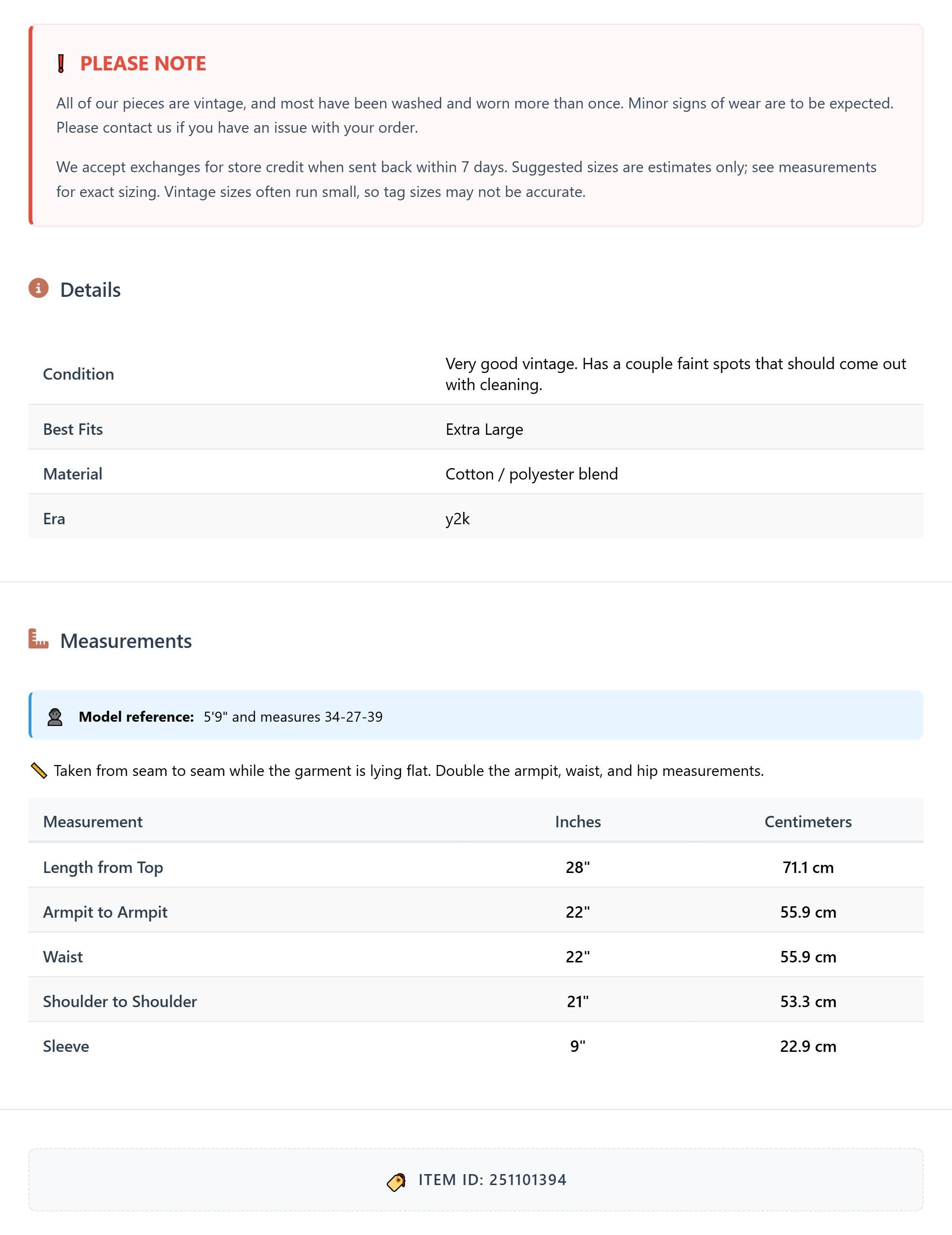 All of our pieces are vintage, and most have been washed and worn more than once. Minor signs of wear are to be expected. Please contact us if you have an issue with your order. We accept exchanges for store credit when sent back within 7 days.