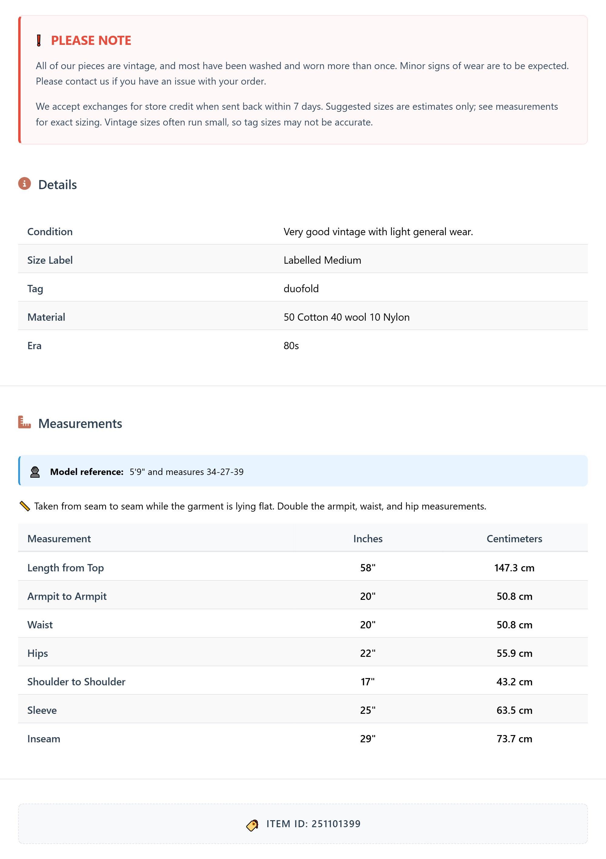 All of our pieces are vintage, and most have been washed and worn more than once. Minor signs of wear are to be expected. Please contact us if you have an issue with your order. We accept exchanges for store credit when sent back within 7 days.