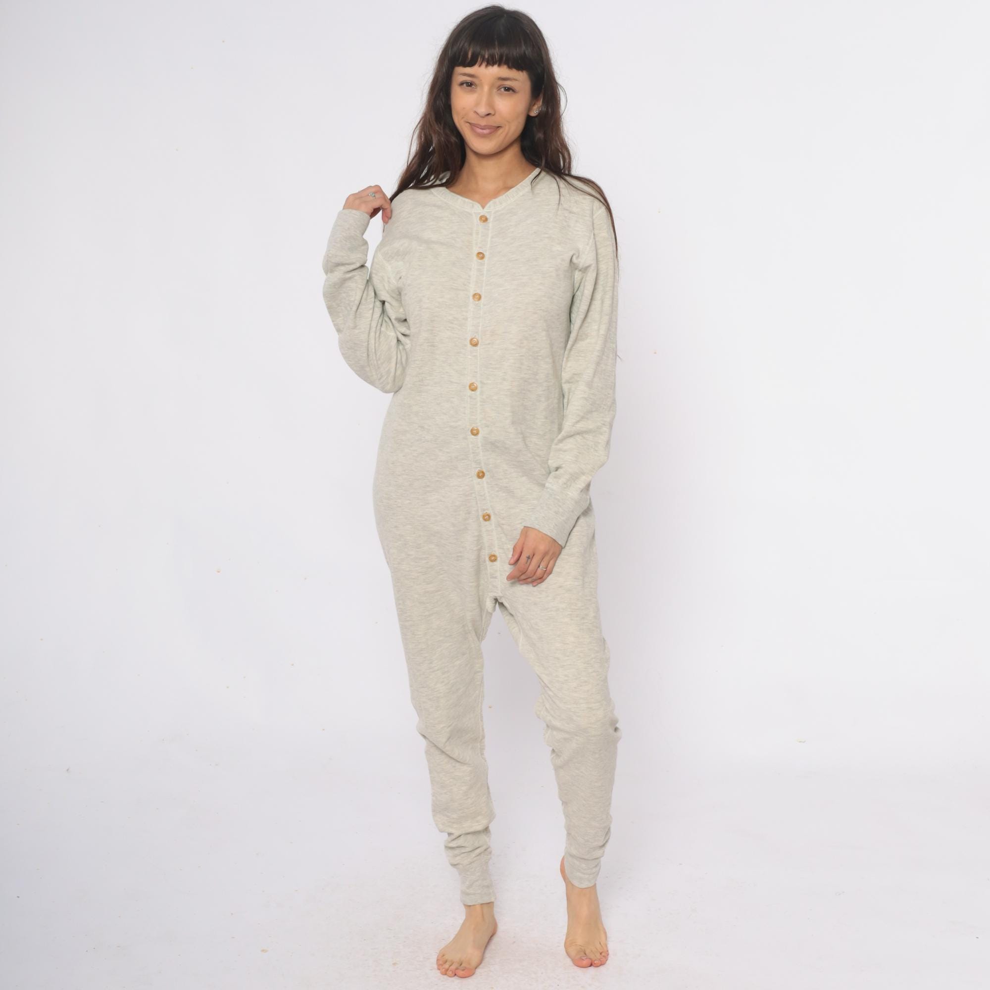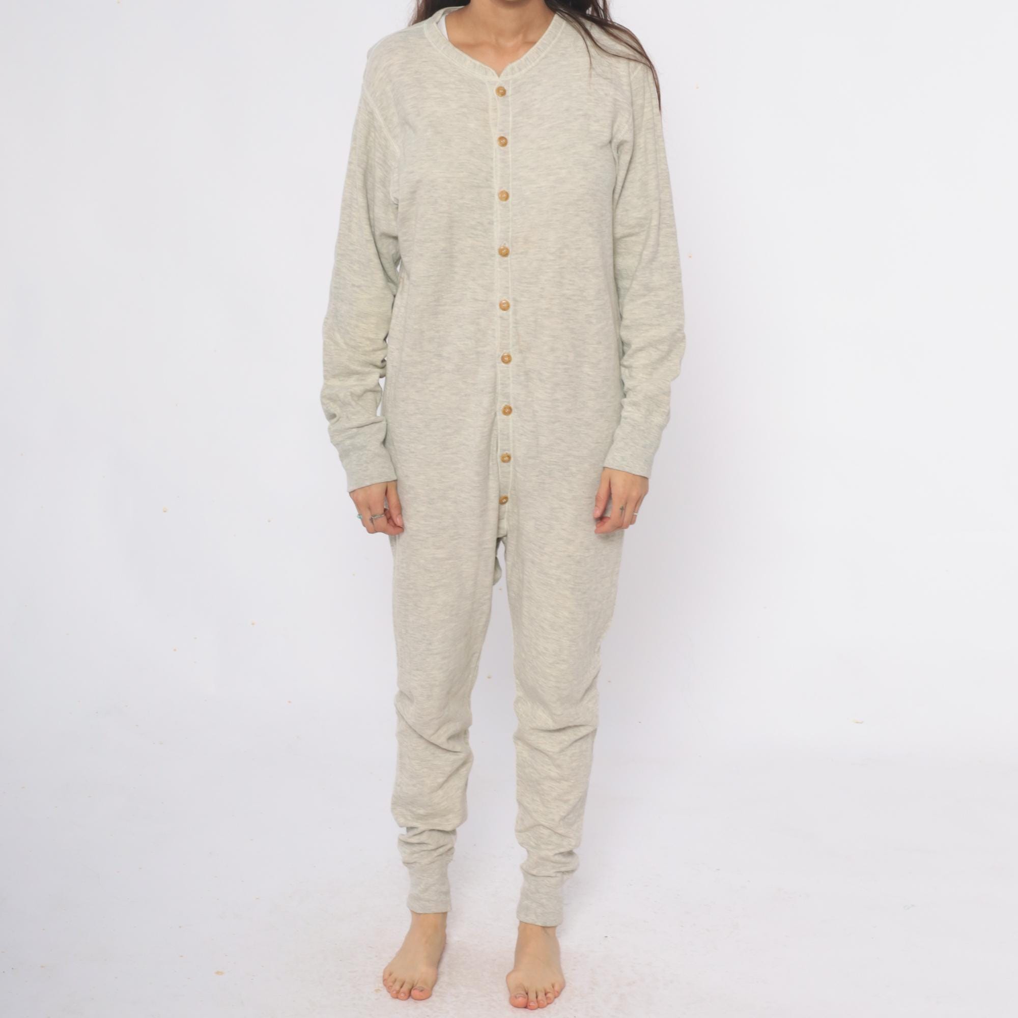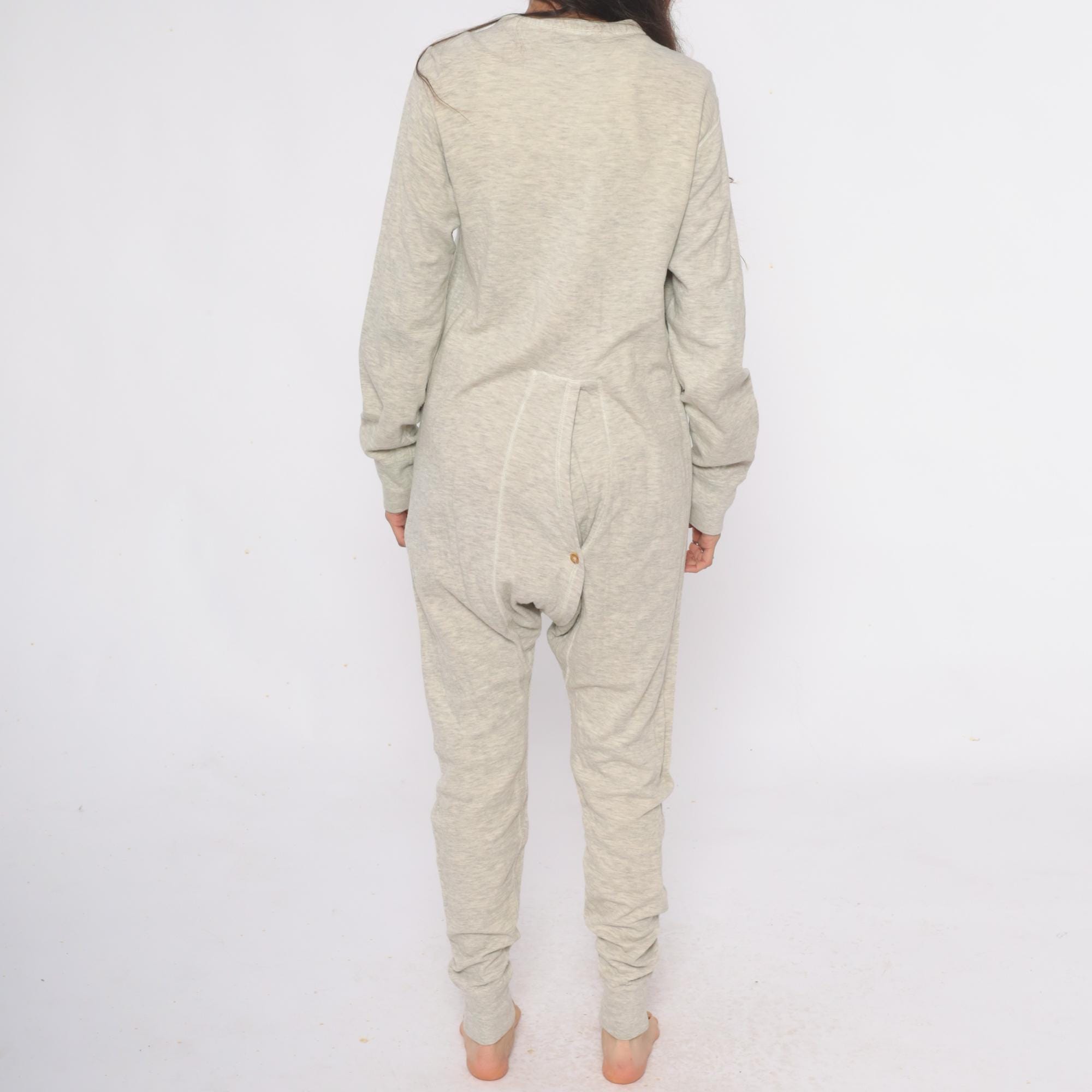 80s oatmeal heather knit union suit from duofold with button front closure, V-neck with ribbed trim, and long sleeves. Full length legs with ribbed cuffs at ankles and wrists.