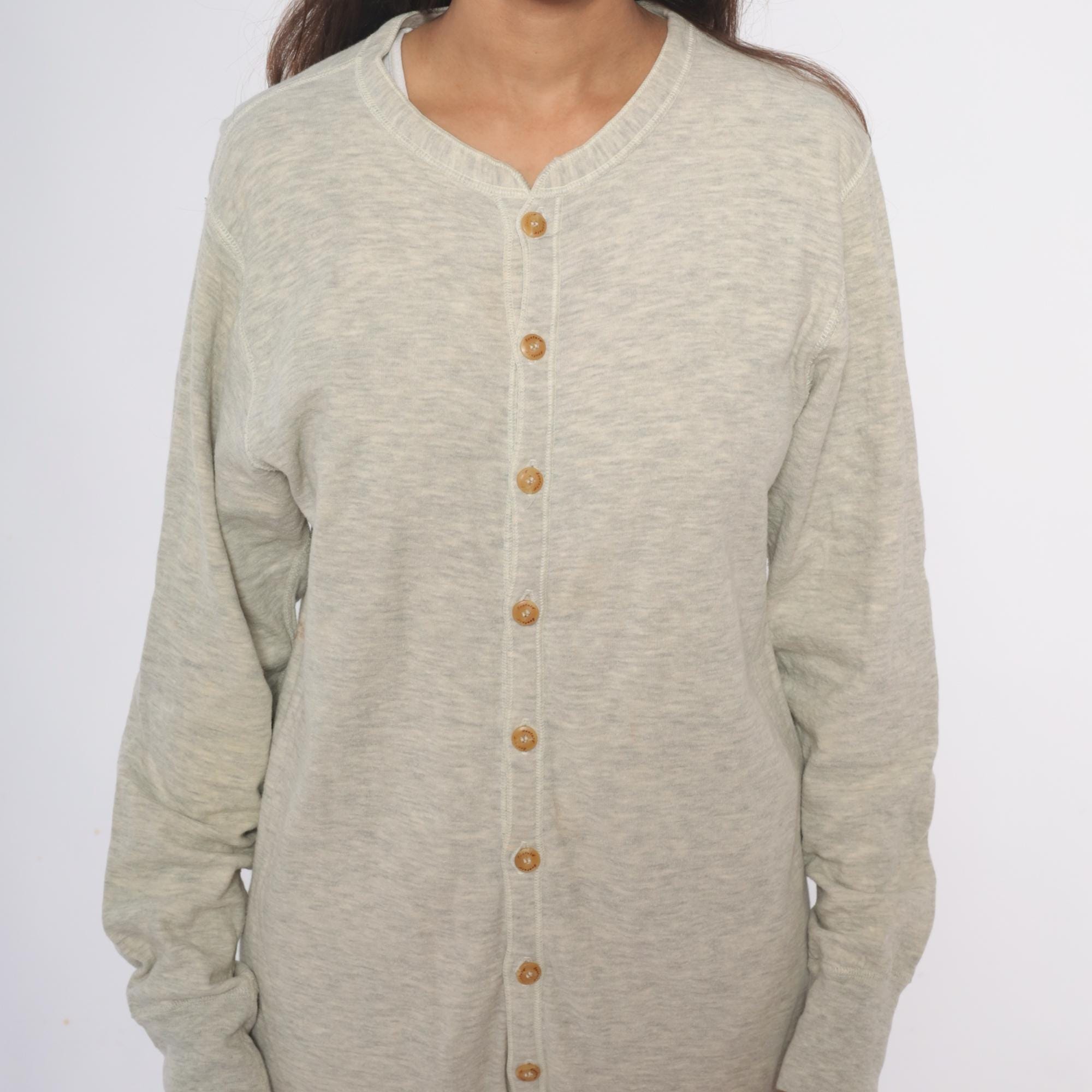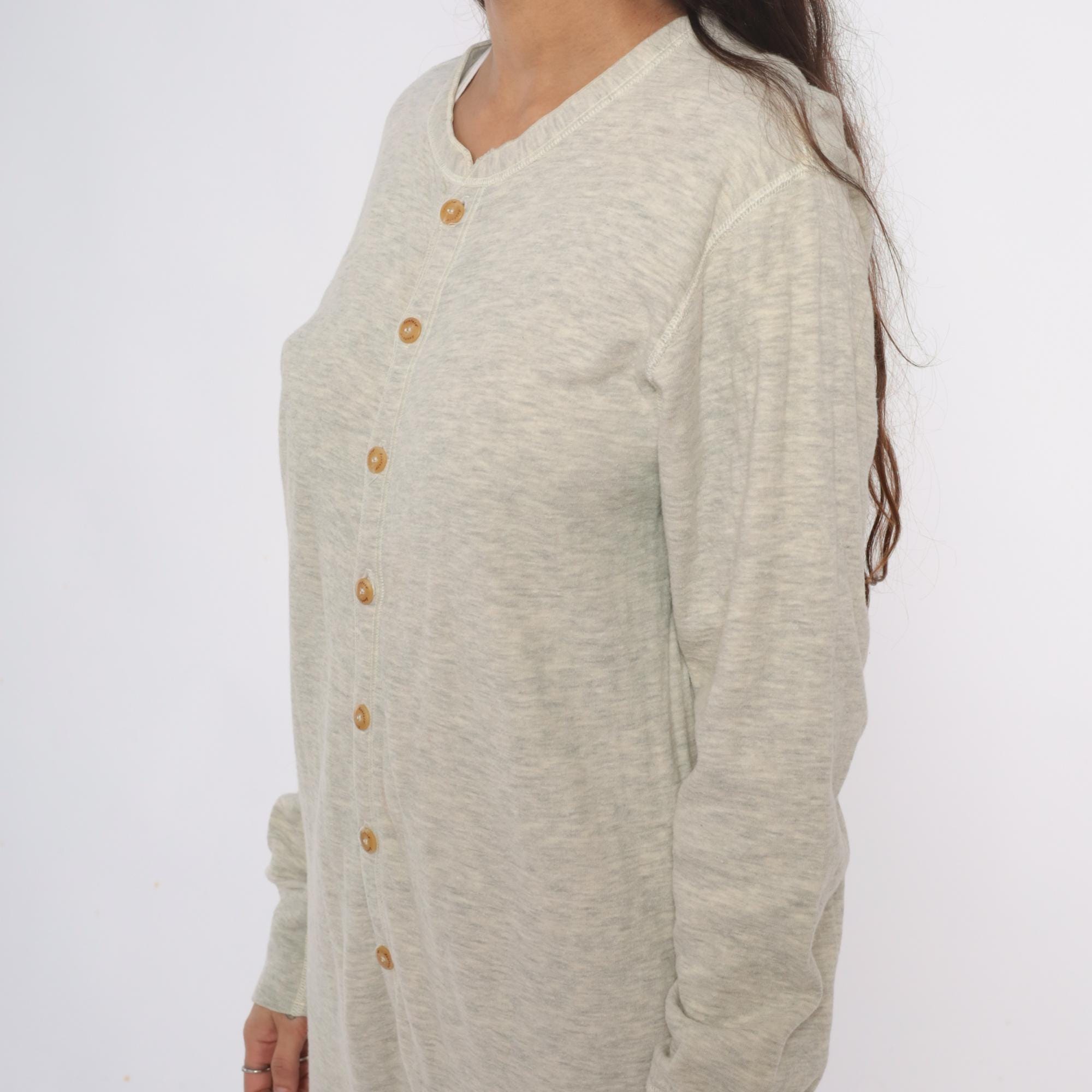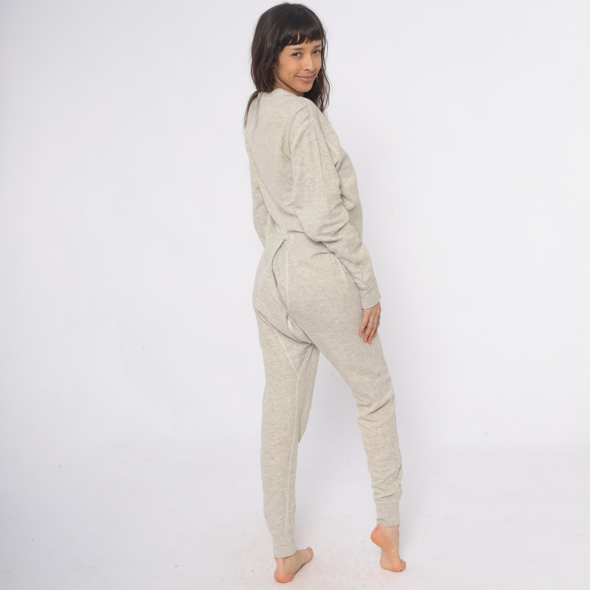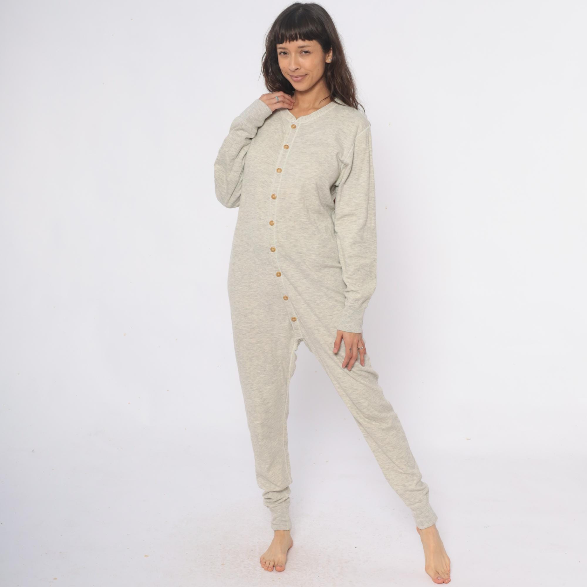 80s oatmeal heather knit union suit from duofold with button front closure, V-neck with ribbed trim, and long sleeves. Full length legs with ribbed cuffs at ankles and wrists.