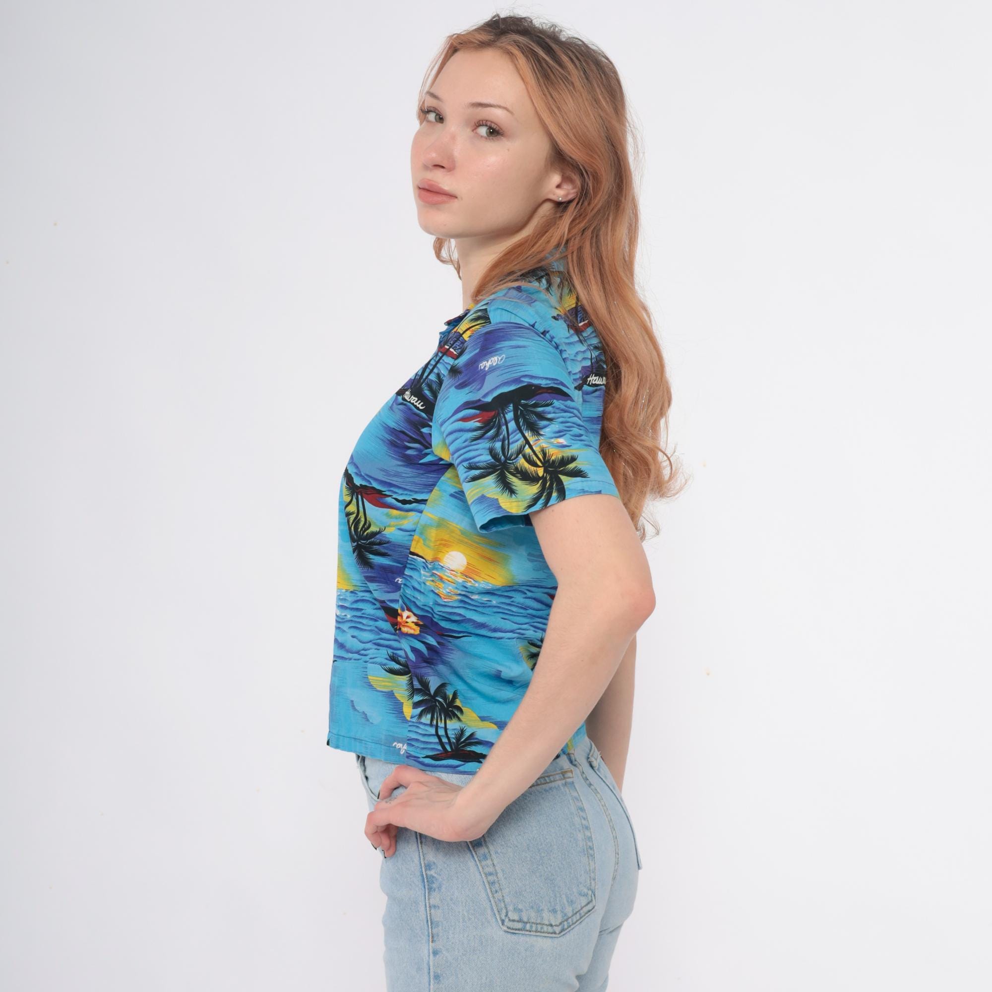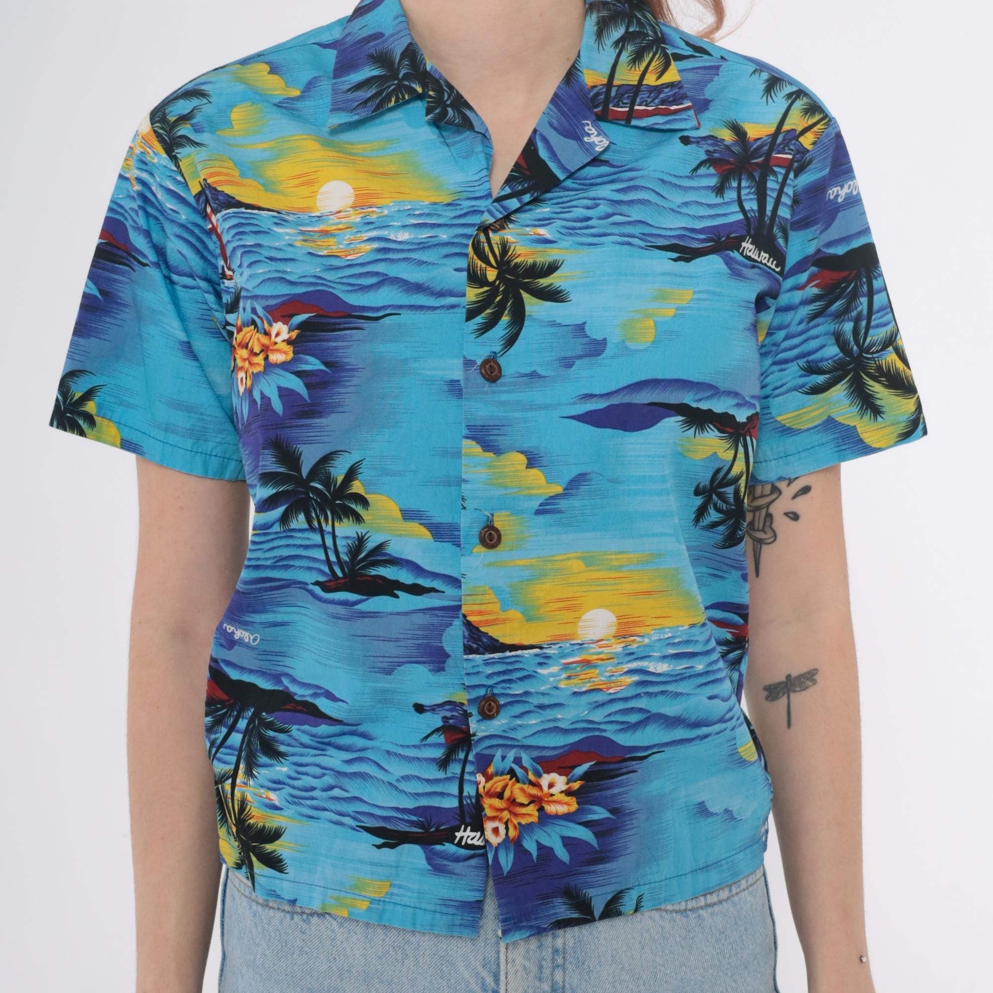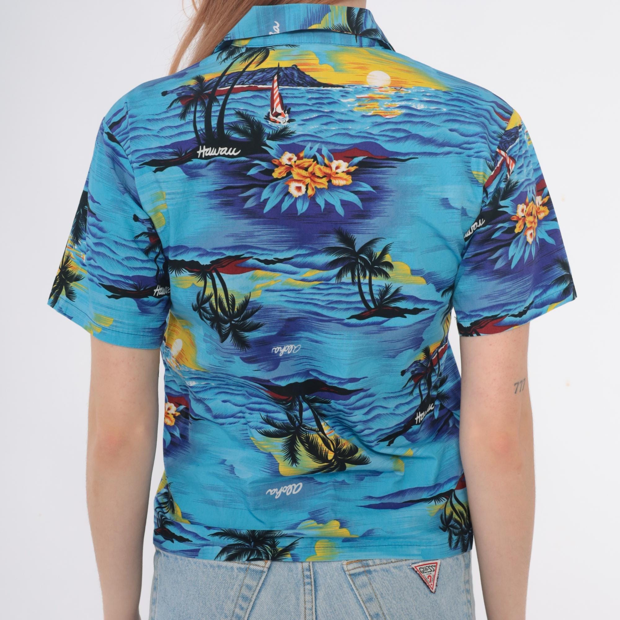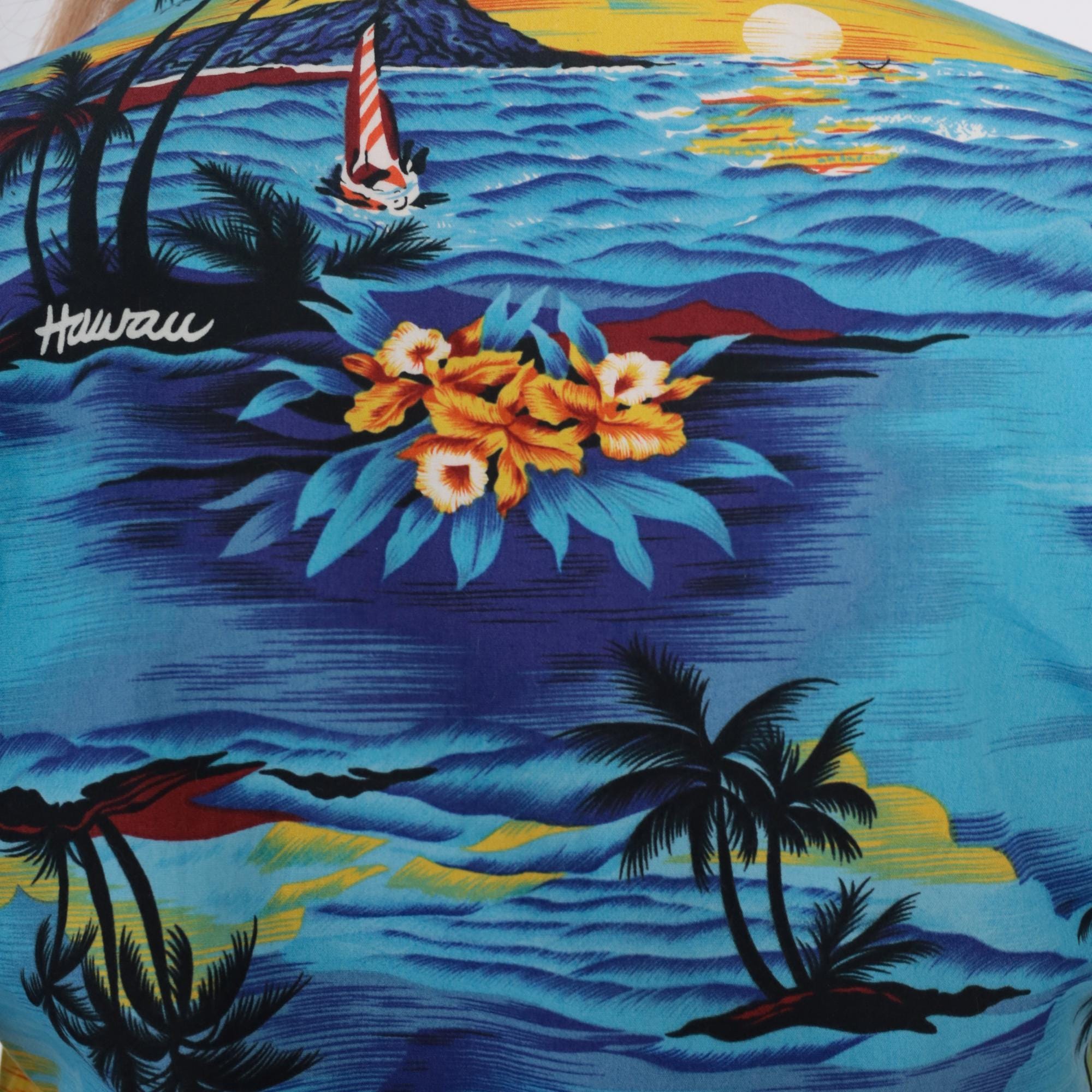 90s turquoise Hawaiian shirt from Royal Hawaiian Creations with tropical scenic print of palm trees, ocean waves, sunset scenes, sailboats, and hibiscus flowers across the fabric. Button front with collar, short sleeves, and chest pocket.