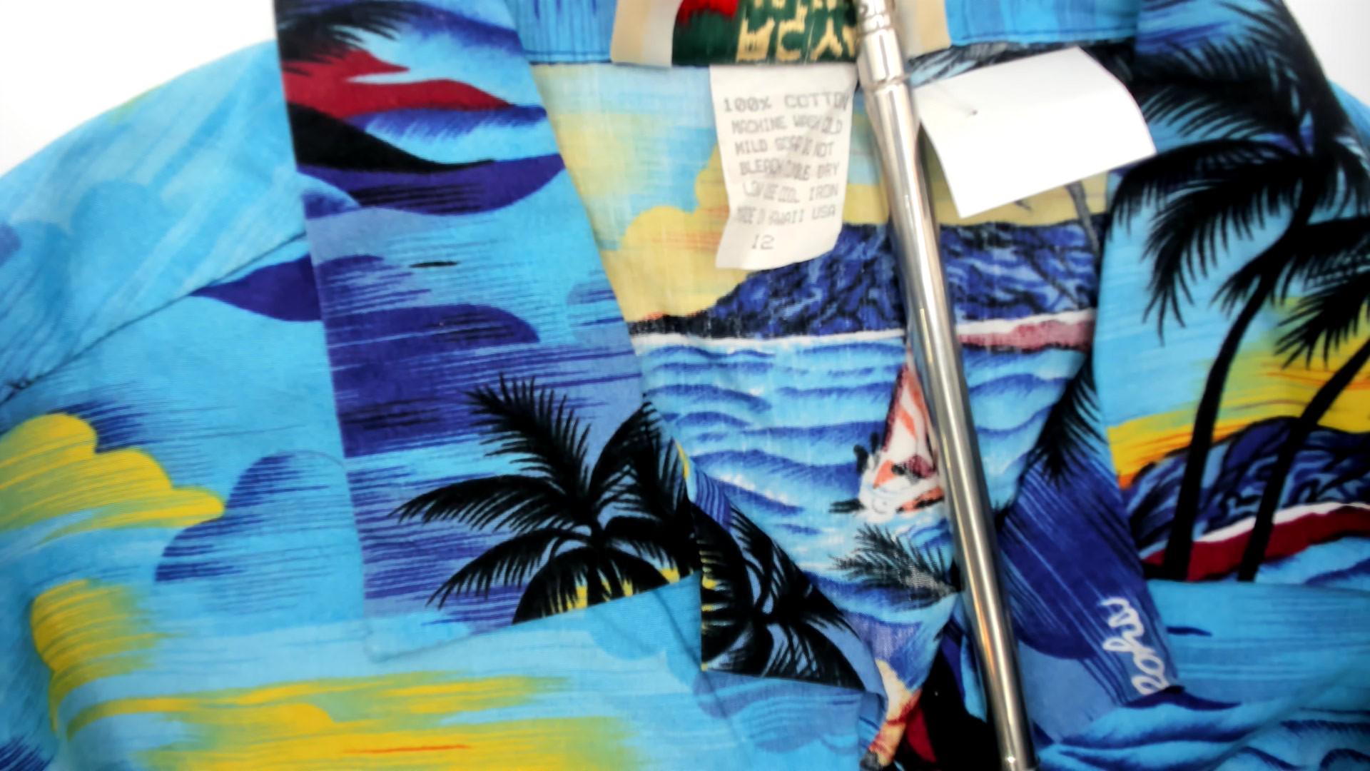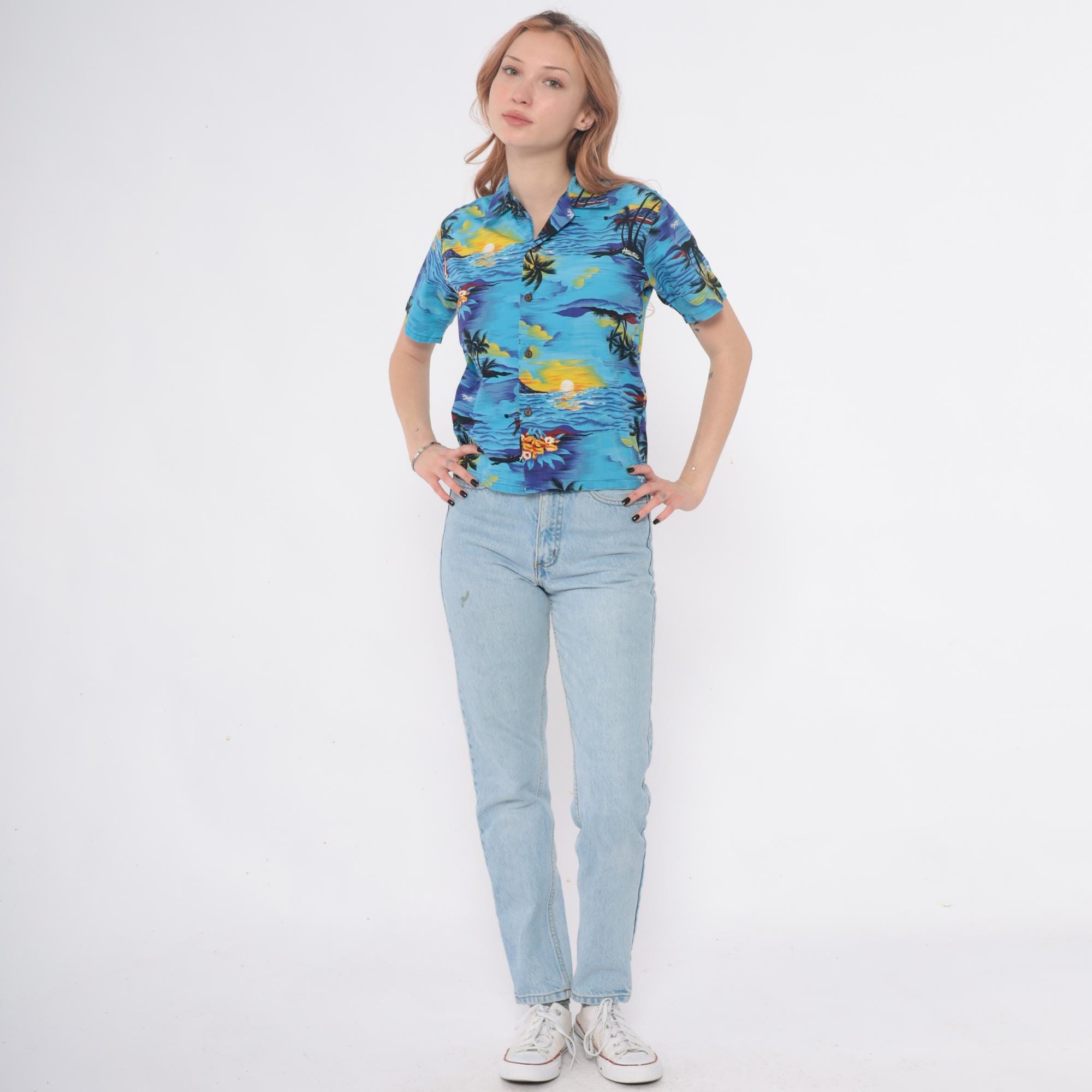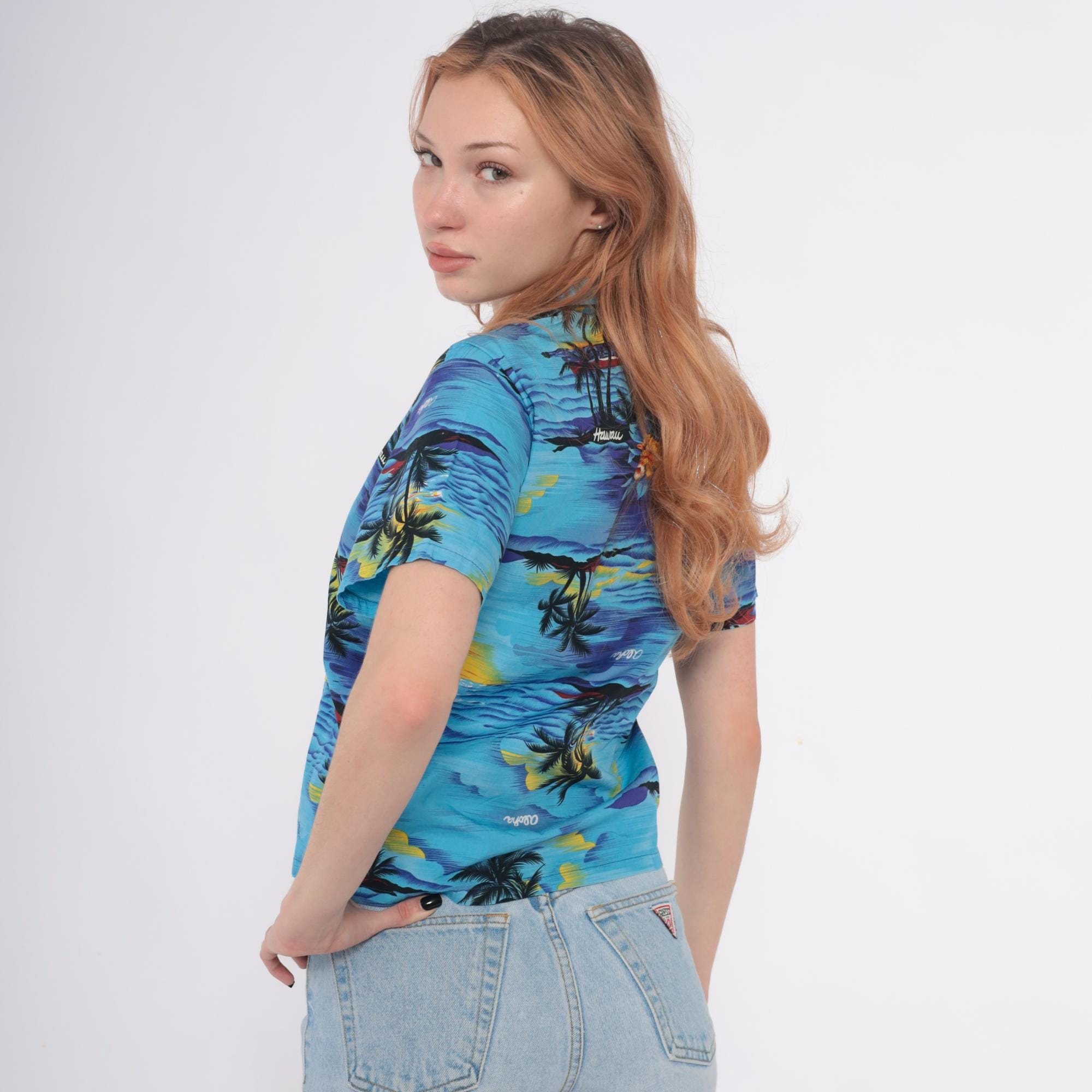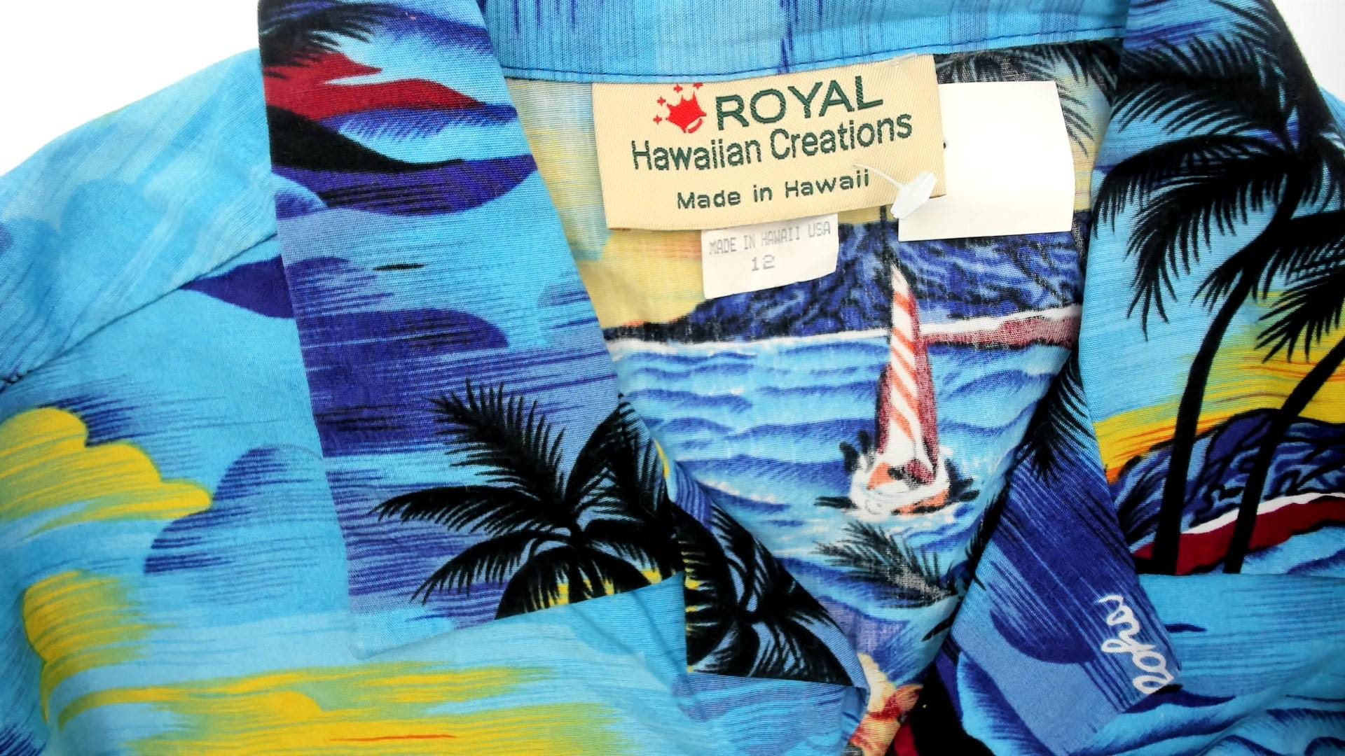 90s turquoise Hawaiian shirt from Royal Hawaiian Creations with tropical scenic print of palm trees, ocean waves, sunset scenes, sailboats, and hibiscus flowers across the fabric. Button front with collar, short sleeves, and chest pocket.
